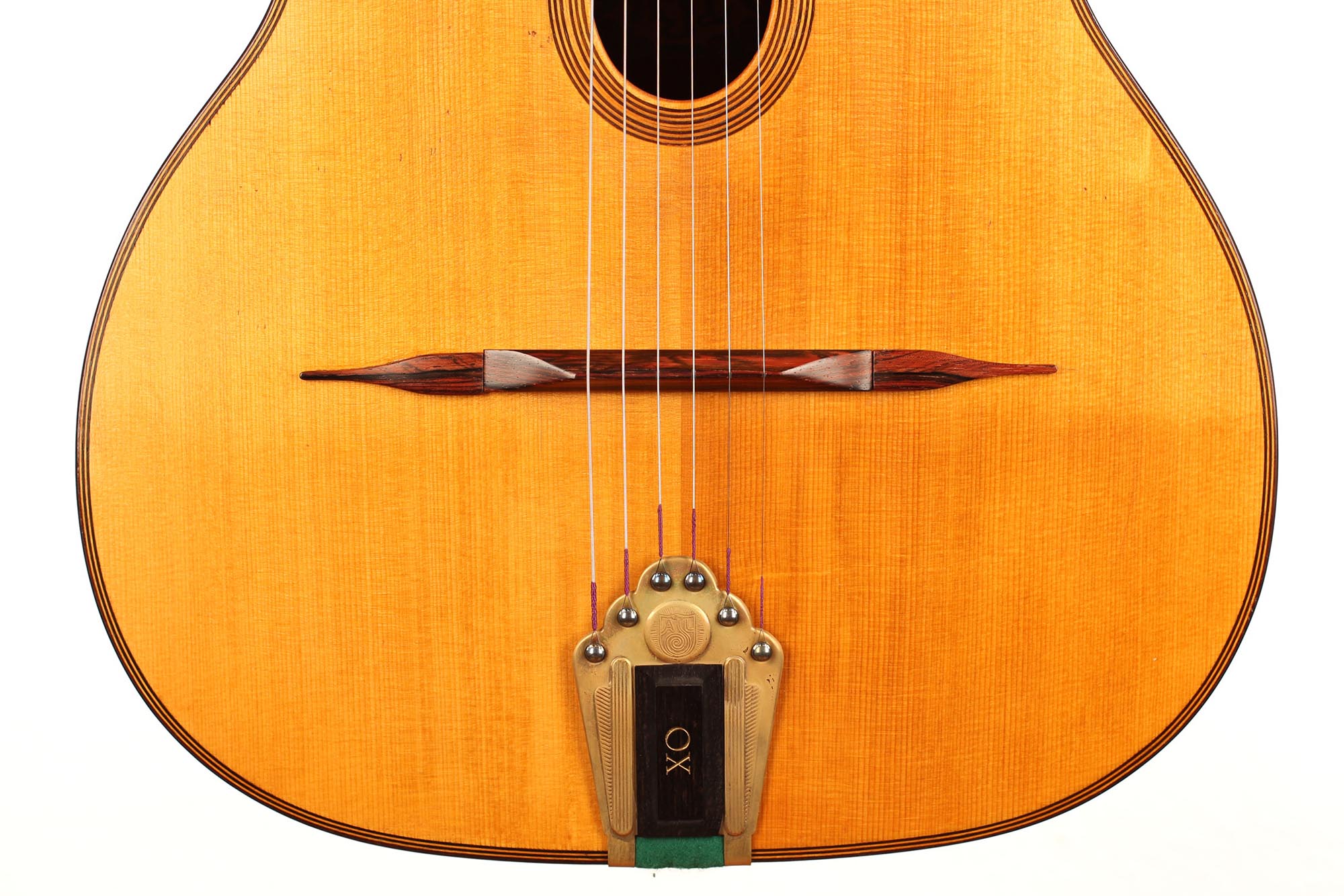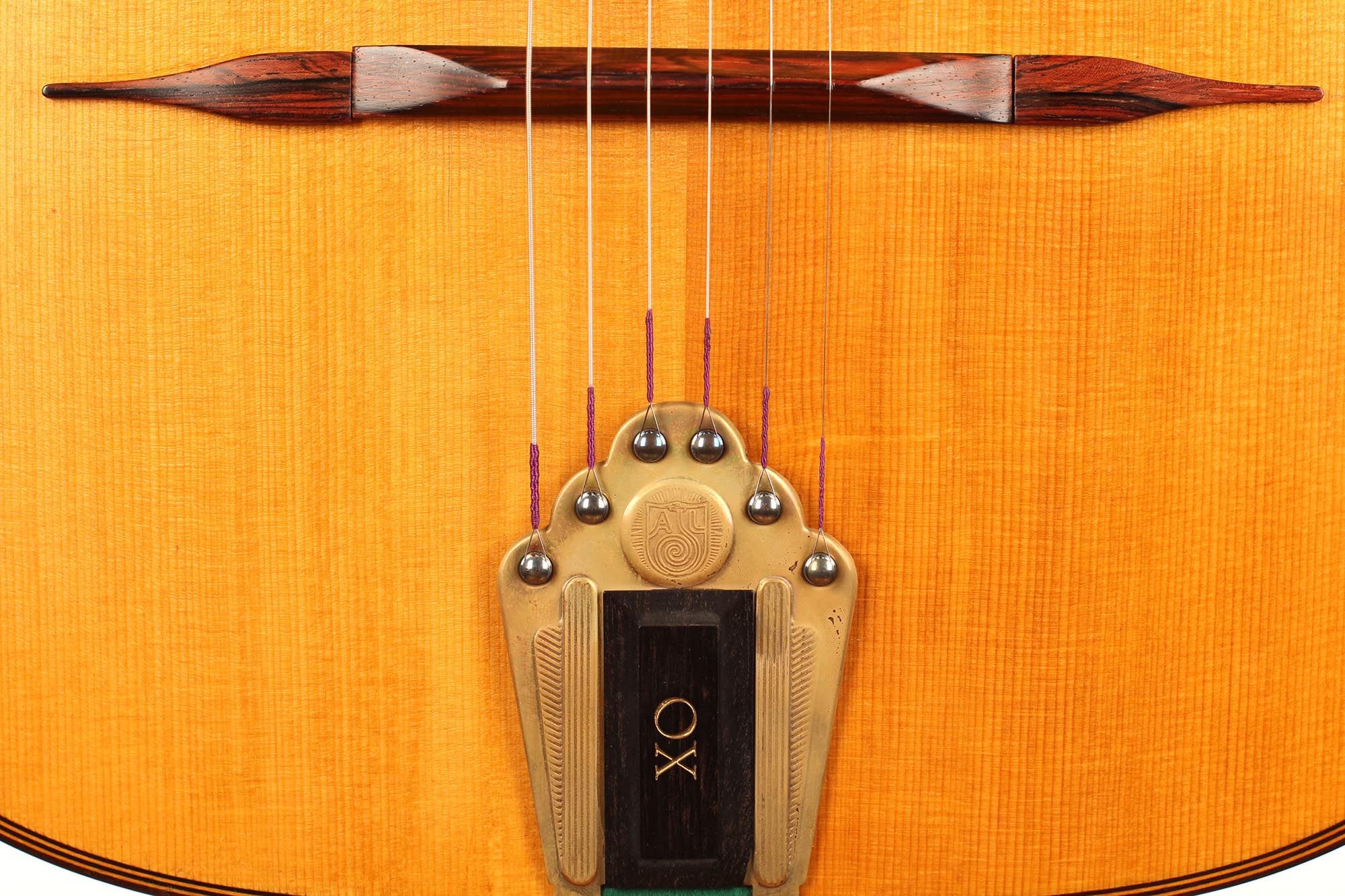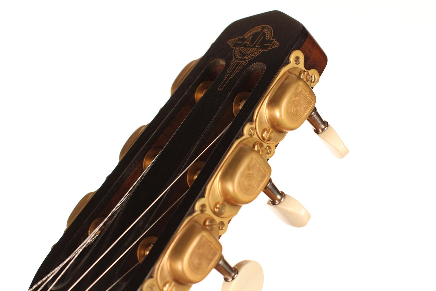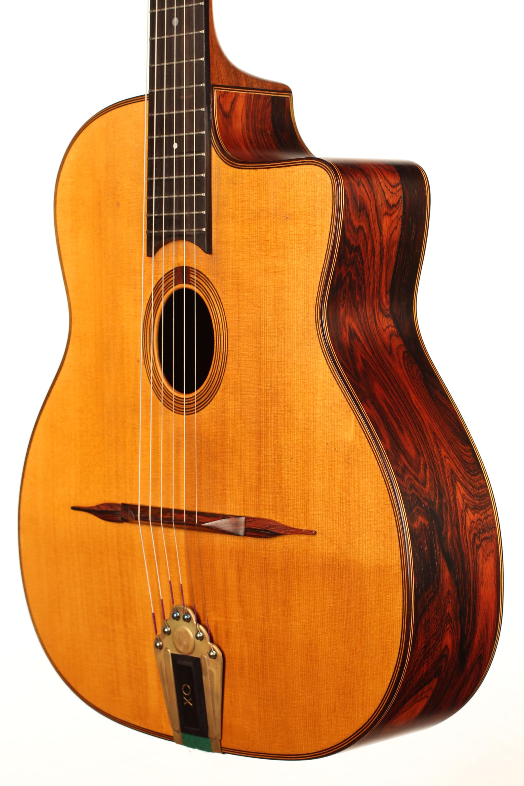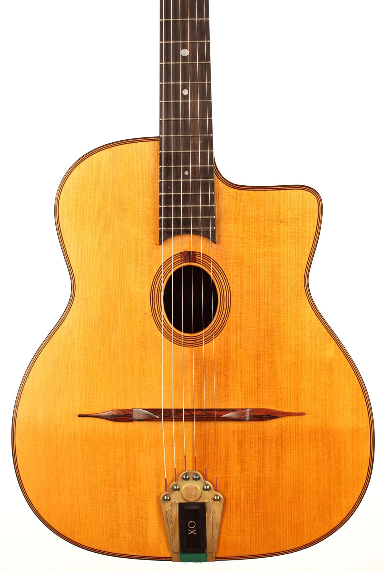 Dieses wunderschöne AJL "XO" Modell gehört zu den schönsten und besser klingenden Zigeunergitarren, die wir je sehen und hören durften. Der finnische Gitarrenbauer ist ein echter Gitarrenliebhaber, der sowohl ein begeisterter Gitarrenbauer als auch ein erfolgreicher professioneller Gitarrist ist. Auf seinen vielen Reisen nach Paris hatte er die Möglichkeit, den Selmer-Geist zu studieren und entwickelte dann in seiner Werkstatt dieses authentische Manouche-Gitarrenmodell.