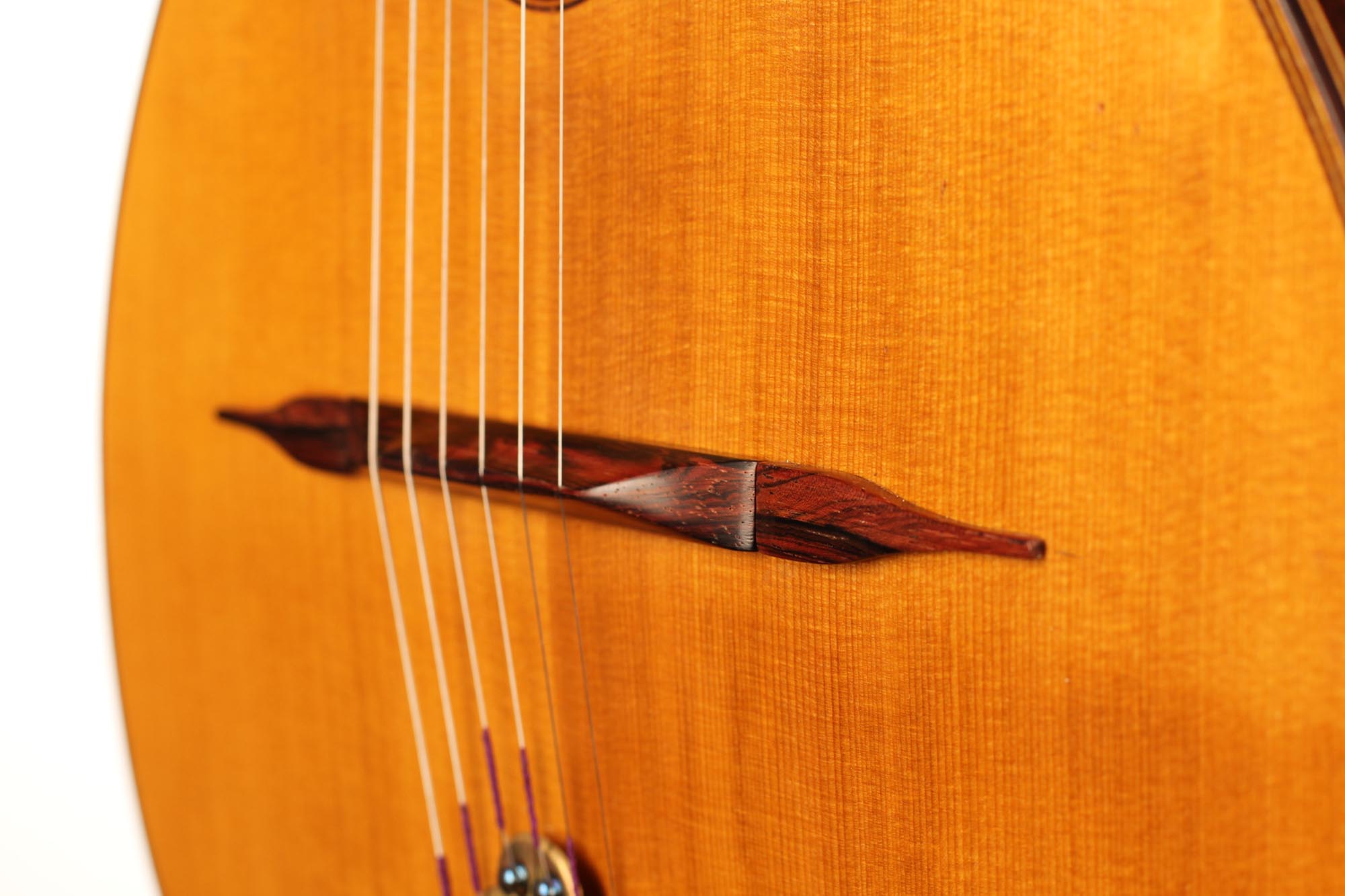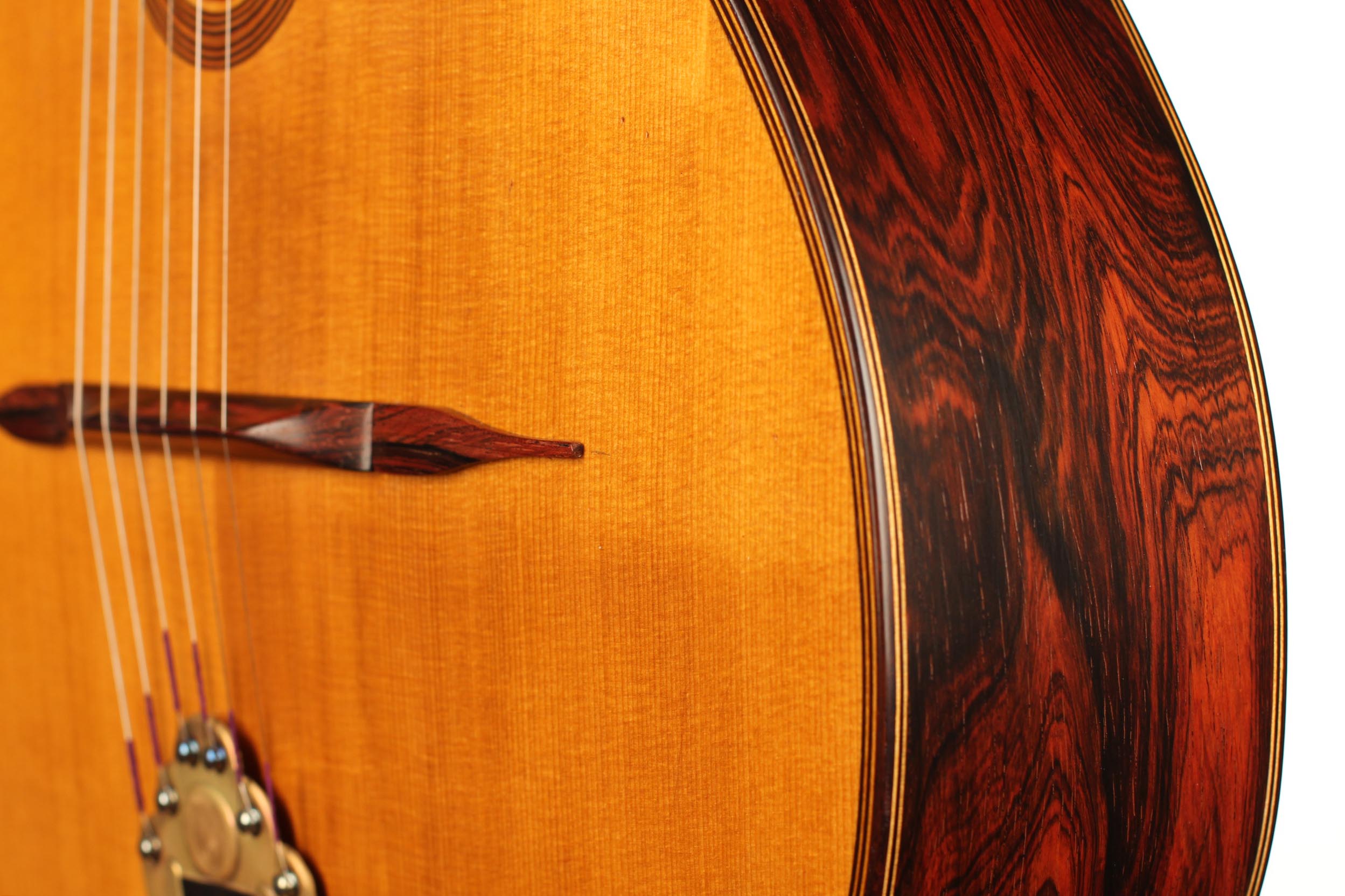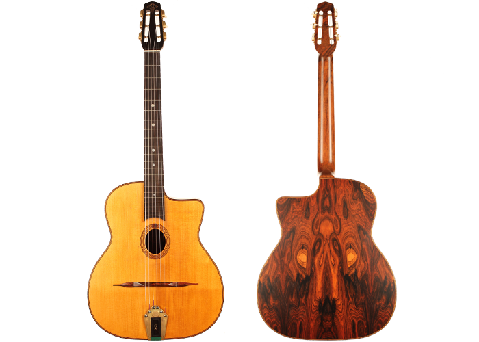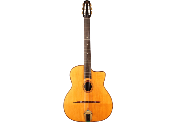 Seine Hingabe für die Suche nach dem perfekten Klang führte zu dieser voll klingenden und singenden Gitarre, die wunderbar vibriert und einen satten und bunten Klang hervorbringt. Die wunderschöne gealterte Fichtendecke und der atemberaubende Boden, aus CITES zertifizierte brasilianische Palisander, sind aller erste Wahl. Die leichte Bespielbarkeit, die erstklassigen Hölzer und der Vintage-Look machen sie zu einer der feinsten Manouche-Style Gitarren.