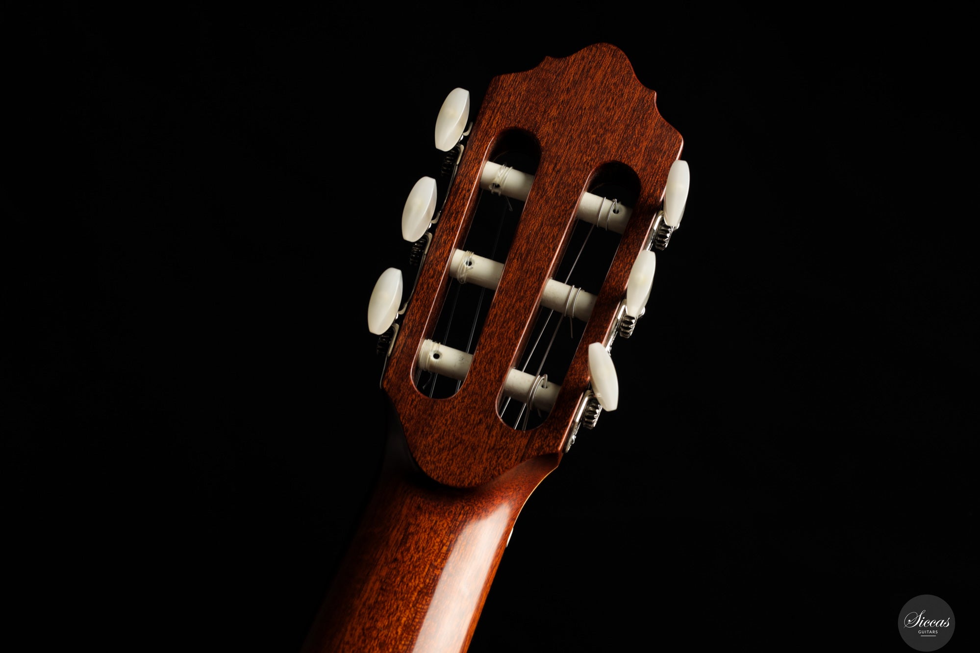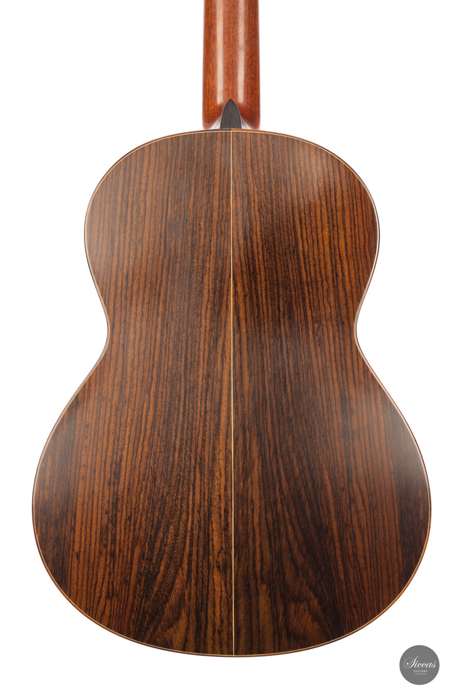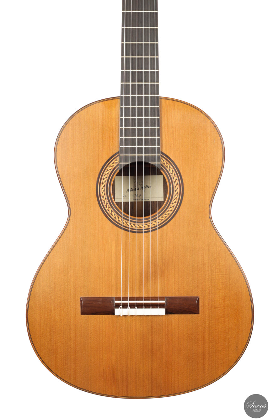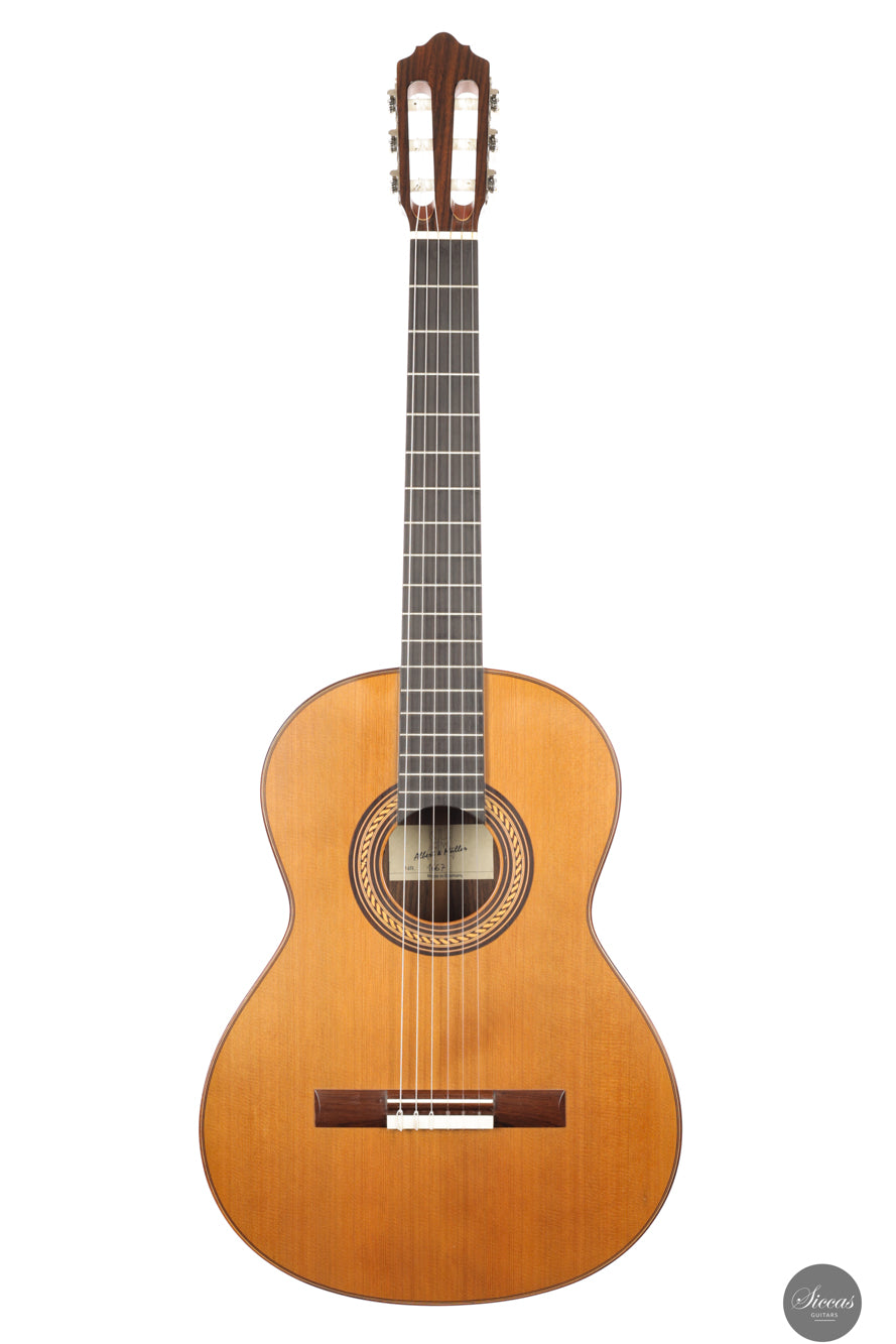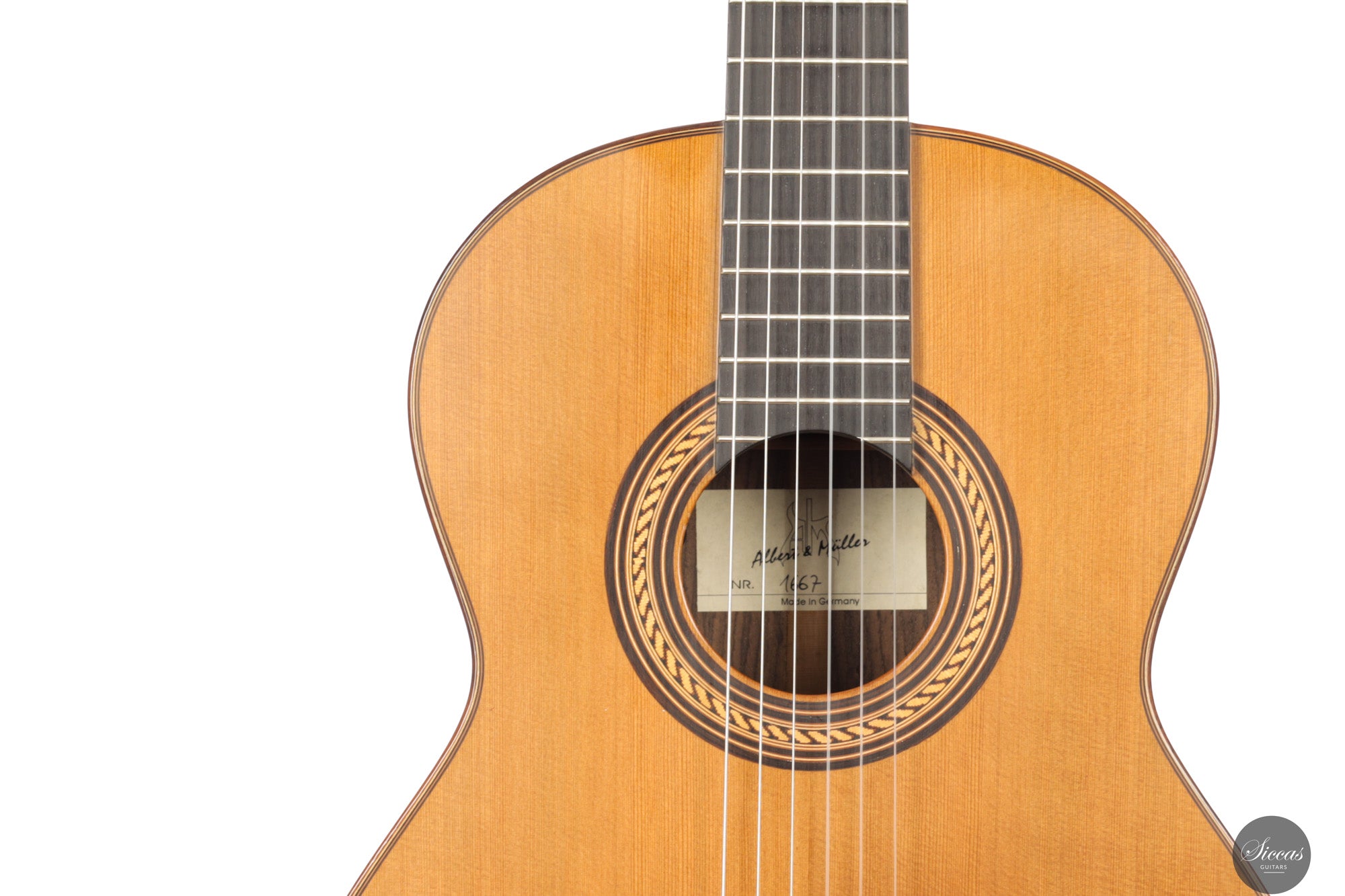 Dieses CL1-Modell von 1999 ist ein klanglich ausgereiftes Beispiel für den traditionellen Konzertgitarrenbau von Albert & Müller. Die Decke aus Zeder in Kombination mit Boden und Zargen aus indischem Palisander ergibt ein organisches, natürliches Klangbild mit einem Eigenresonanzbereich zwischen Gis und A. Die Ansprache ist unmittelbar, die klangliche Balance fein abgestimmt. Die Höhen klingen hell und zugleich intim, ohne je scharf zu wirken. Die Bässe sind rund und kontrolliert, das Mittenspektrum farbig und tragfähig. Auffällig ist das leicht verwundene Halsprofil, das gezielt für eine entspanntere Greifhandposition konstruiert wurde und die Spielbarkeit deutlich verbessert. Ein unauffällig integriertes B-Band-Tonabnehmersystem ermöglicht zudem eine flexible Nutzung auf der Bühne oder im Studio.