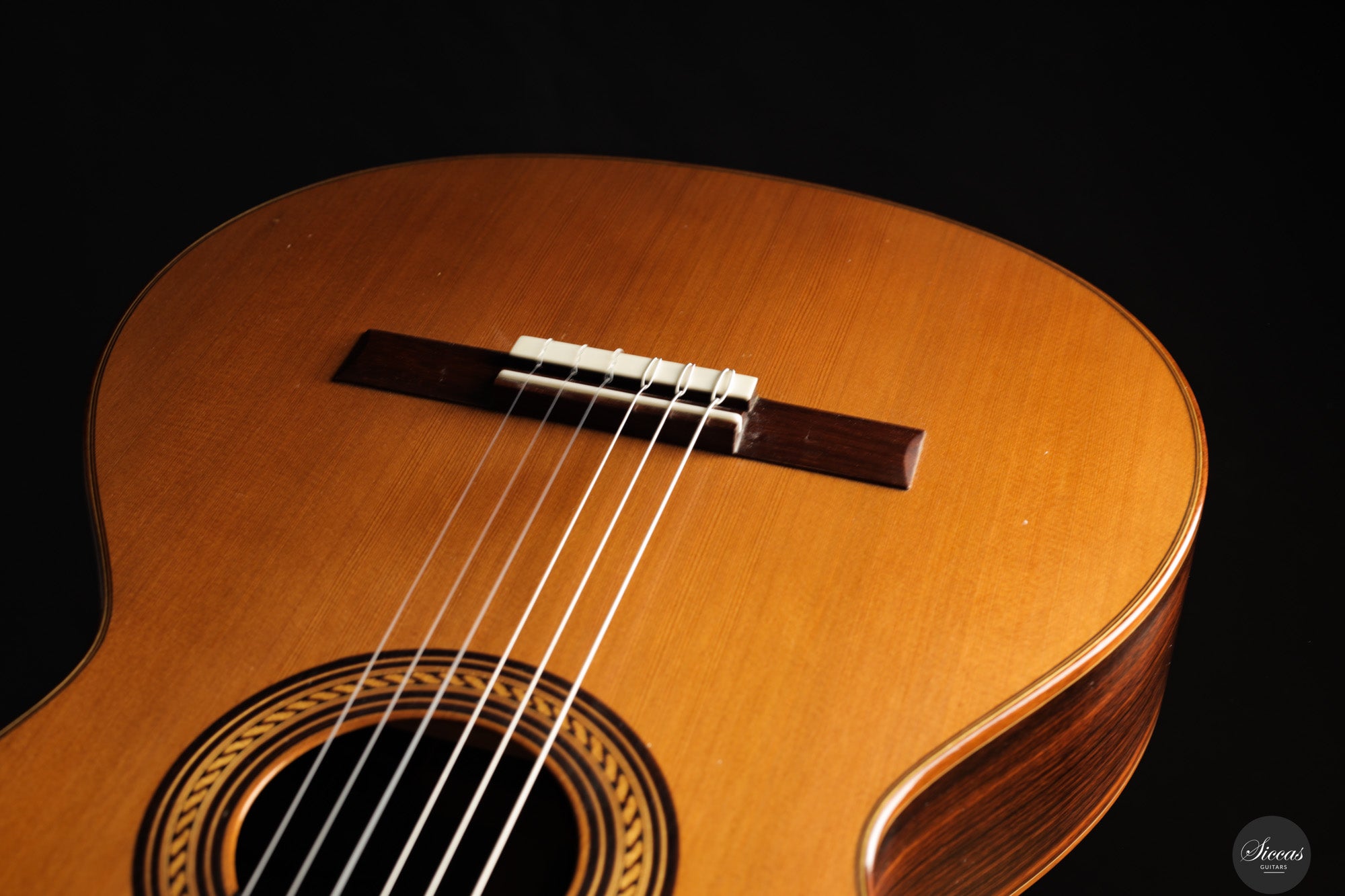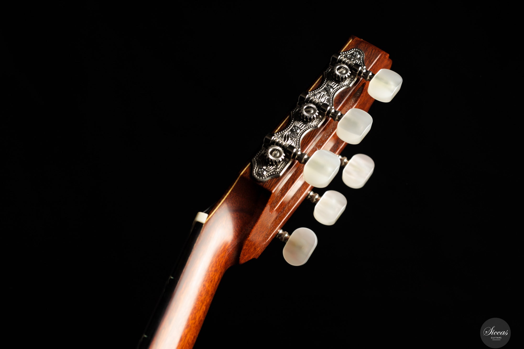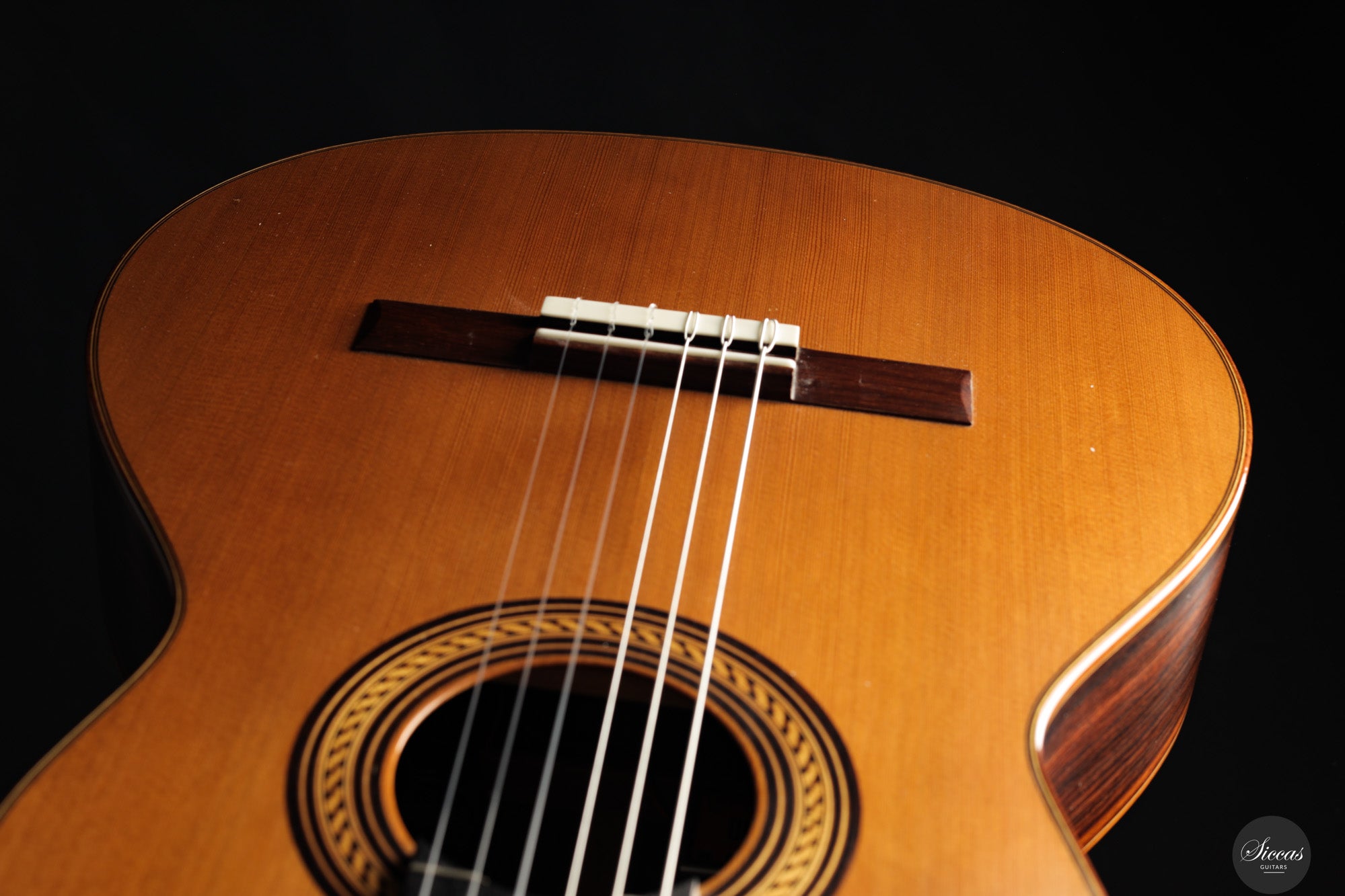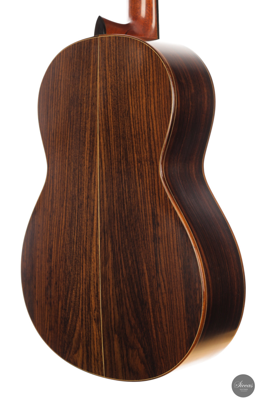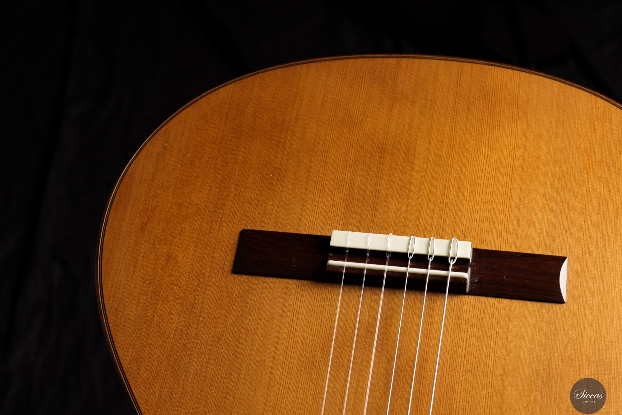 Dieses CL1-Modell von 1999 ist ein klanglich ausgereiftes Beispiel für den traditionellen Konzertgitarrenbau von Albert & Müller. Die Decke aus Zeder in Kombination mit Boden und Zargen aus indischem Palisander ergibt ein organisches, natürliches Klangbild mit einem Eigenresonanzbereich zwischen Gis und A. Die Ansprache ist unmittelbar, die klangliche Balance fein abgestimmt. Die Höhen klingen hell und zugleich intim, ohne je scharf zu wirken. Die Bässe sind rund und kontrolliert, das Mittenspektrum farbig und tragfähig. Auffällig ist das leicht verwundene Halsprofil, das gezielt für eine entspanntere Greifhandposition konstruiert wurde und die Spielbarkeit deutlich verbessert. Ein unauffällig integriertes B-Band-Tonabnehmersystem ermöglicht zudem eine flexible Nutzung auf der Bühne oder im Studio.