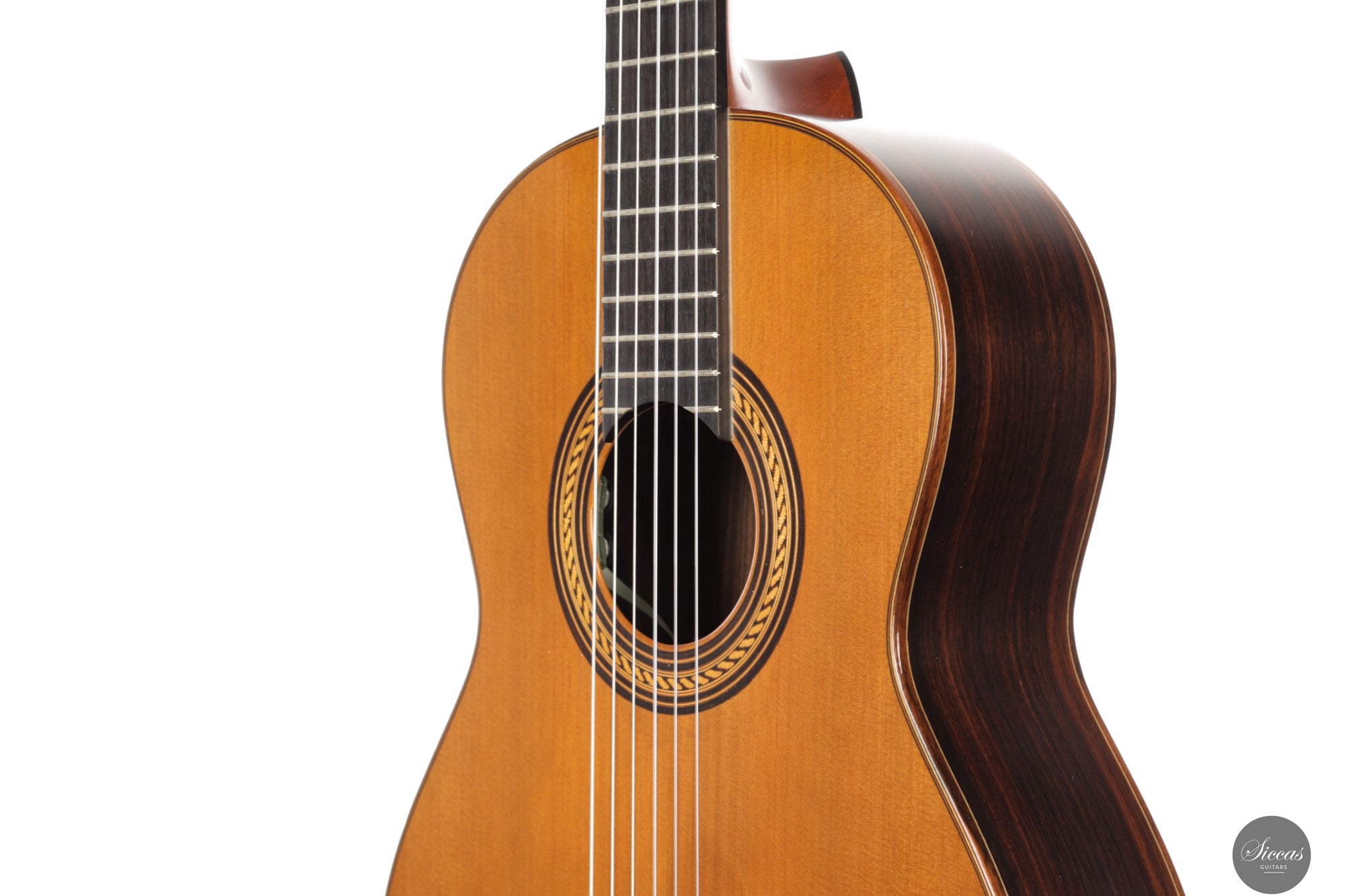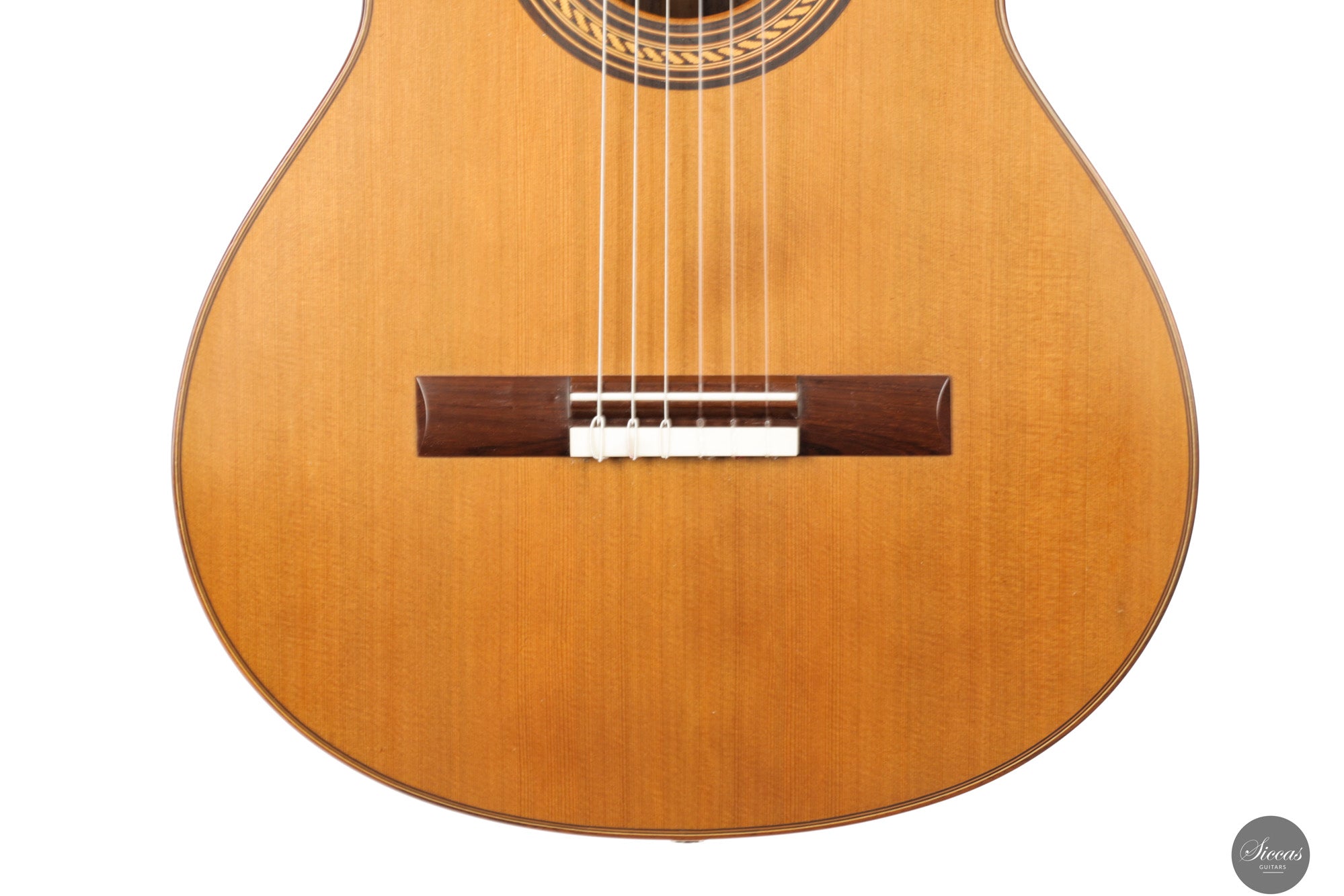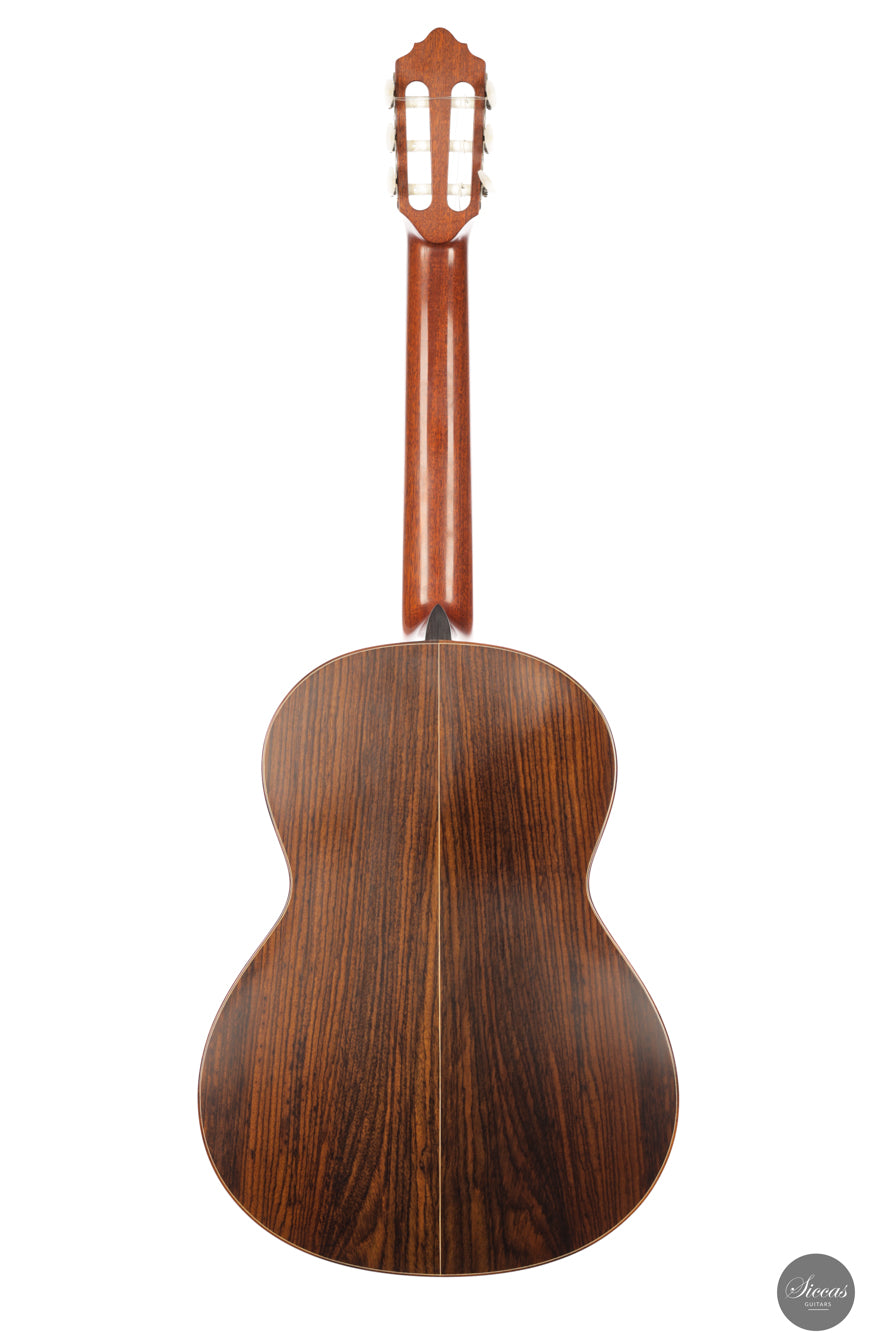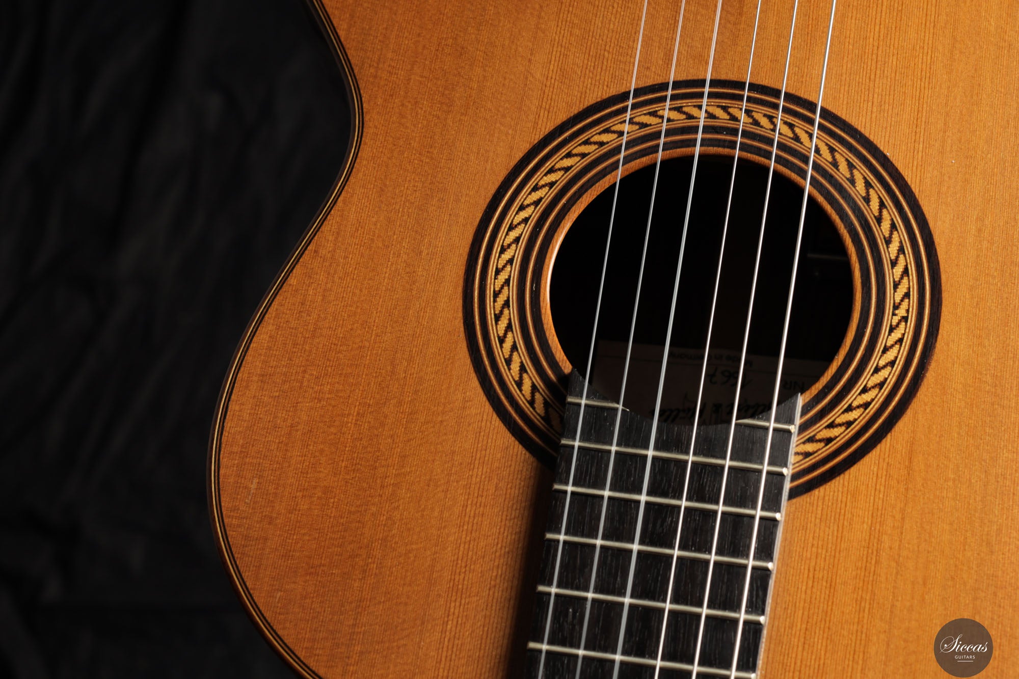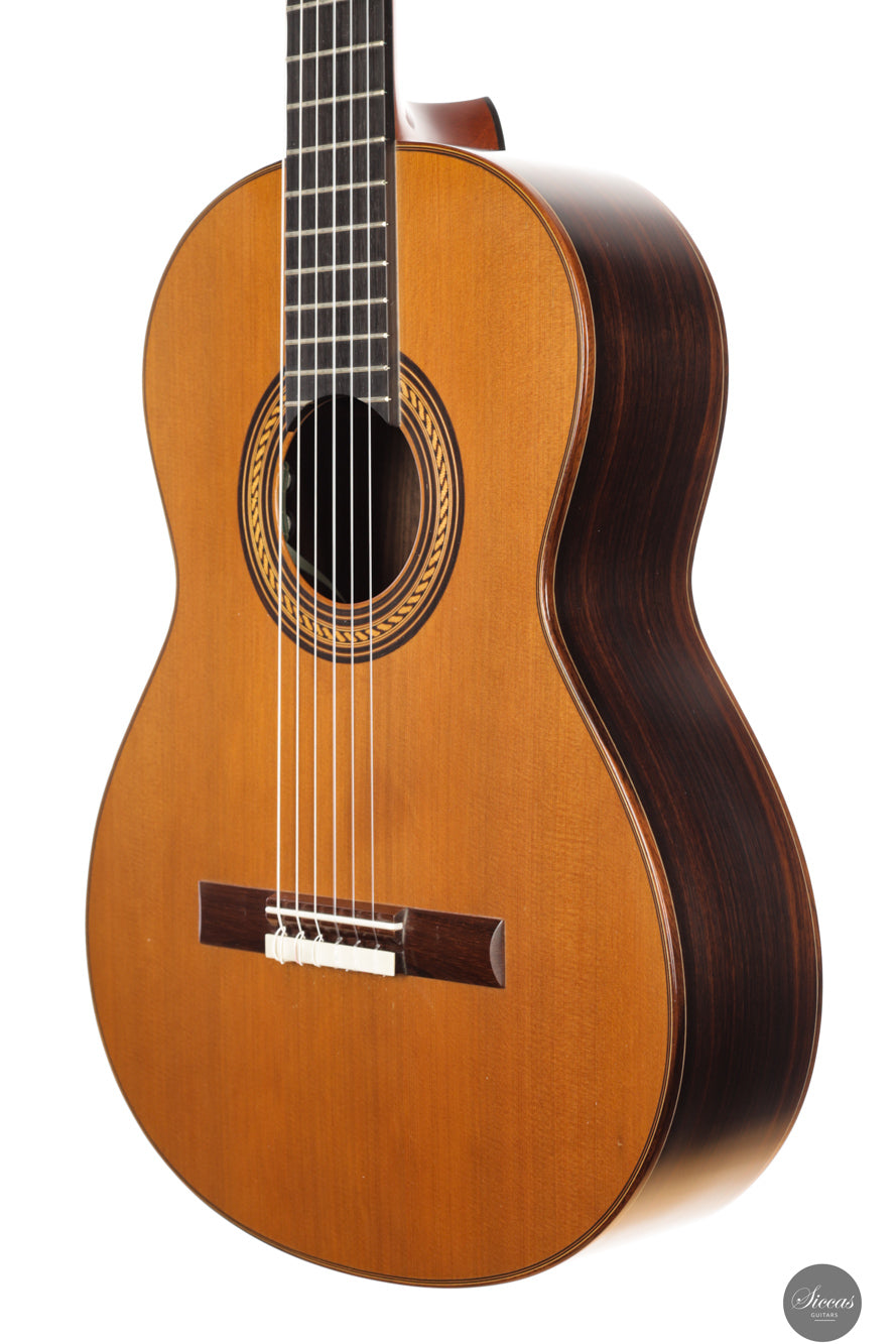 Dieses CL1-Modell von 1999 ist ein klanglich ausgereiftes Beispiel für den traditionellen Konzertgitarrenbau von Albert & Müller. Die Decke aus Zeder in Kombination mit Boden und Zargen aus indischem Palisander ergibt ein organisches, natürliches Klangbild mit einem Eigenresonanzbereich zwischen Gis und A. Die Ansprache ist unmittelbar, die klangliche Balance fein abgestimmt. Die Höhen klingen hell und zugleich intim, ohne je scharf zu wirken. Die Bässe sind rund und kontrolliert, das Mittenspektrum farbig und tragfähig. Auffällig ist das leicht verwundene Halsprofil, das gezielt für eine entspanntere Greifhandposition konstruiert wurde und die Spielbarkeit deutlich verbessert. Ein unauffällig integriertes B-Band-Tonabnehmersystem ermöglicht zudem eine flexible Nutzung auf der Bühne oder im Studio.