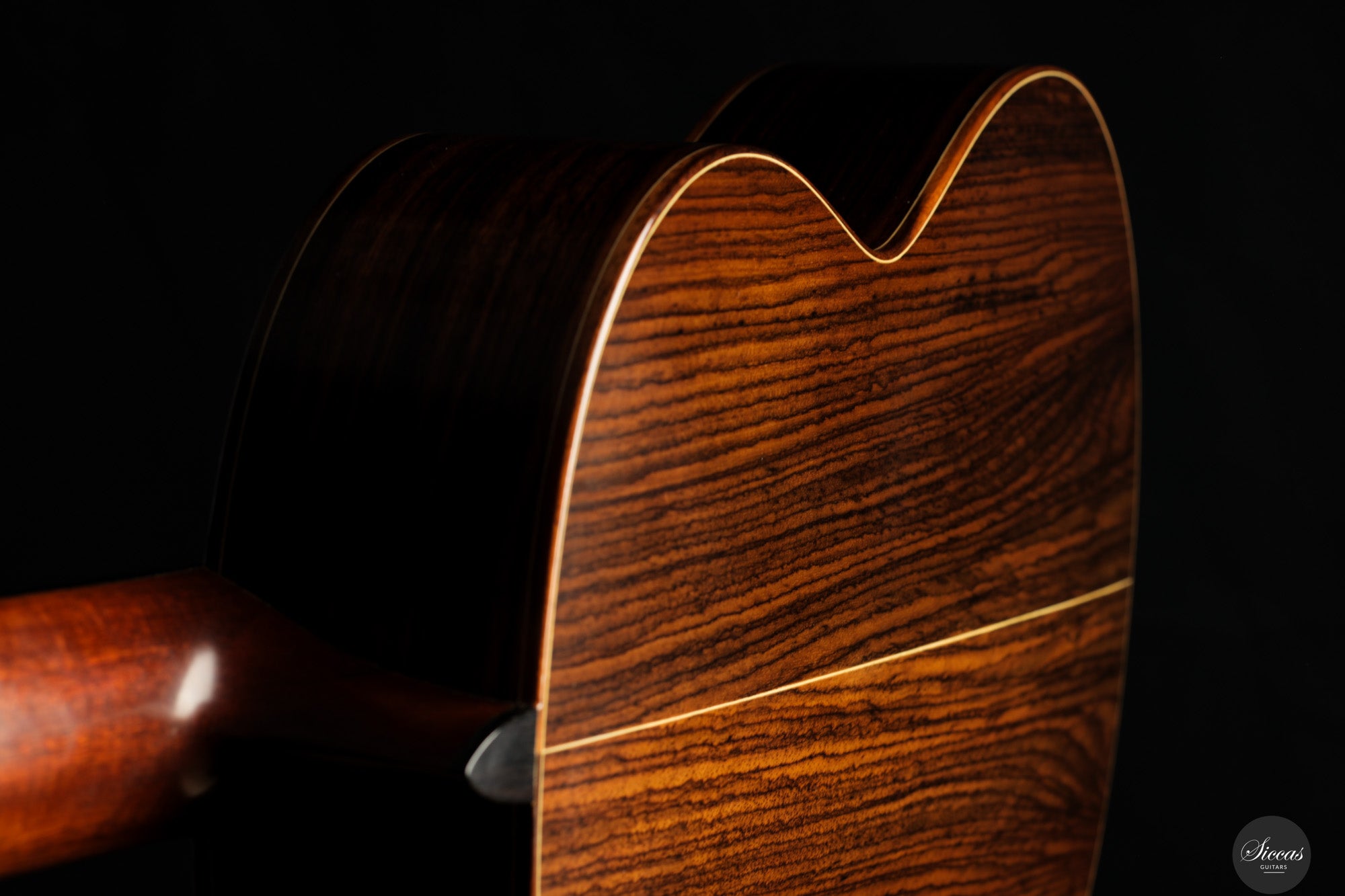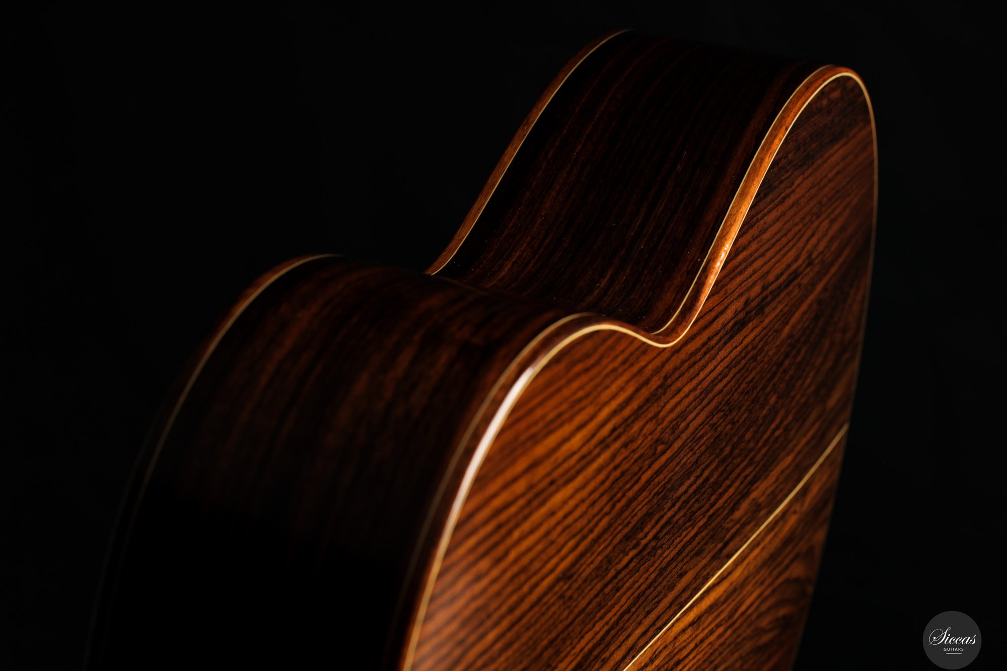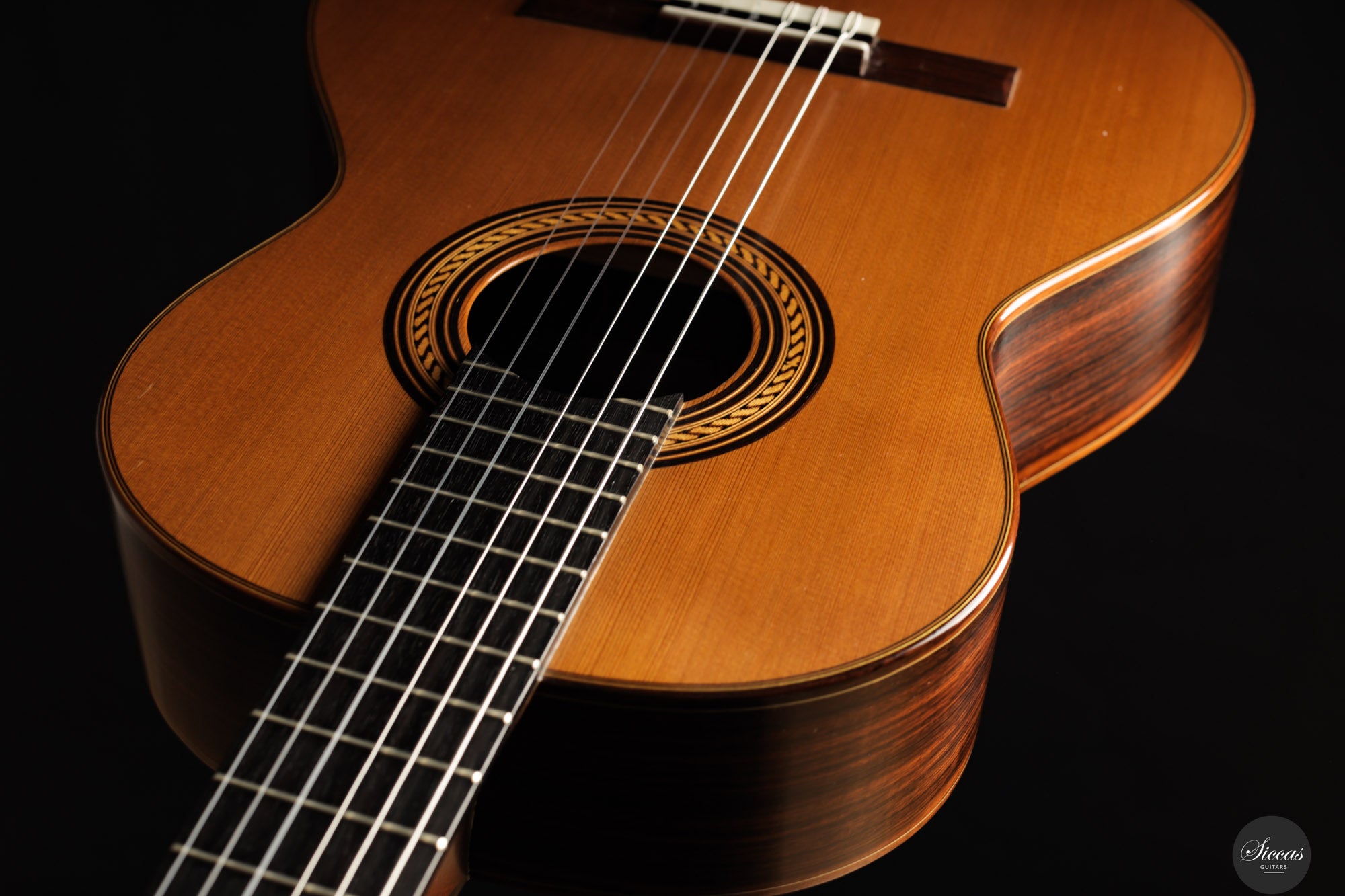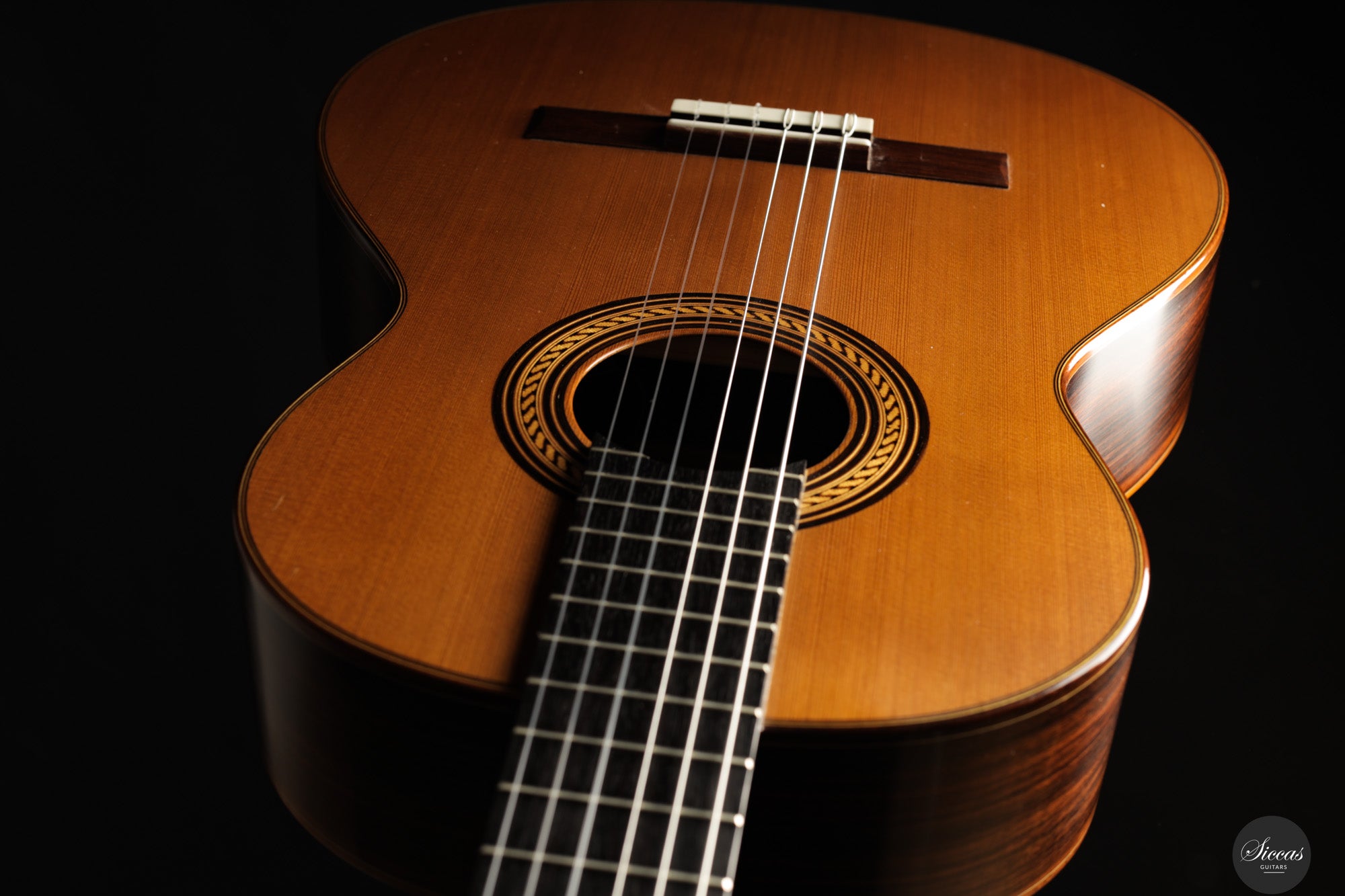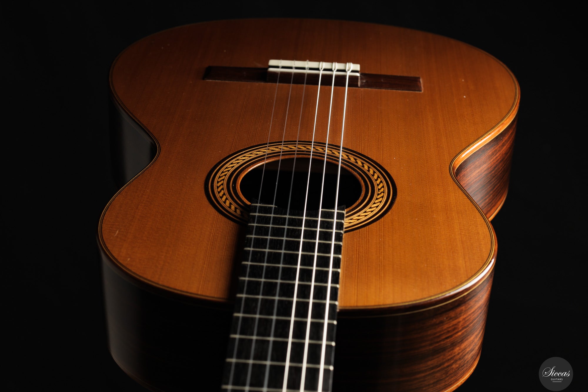 Dieses CL1-Modell von 1999 ist ein klanglich ausgereiftes Beispiel für den traditionellen Konzertgitarrenbau von Albert & Müller. Die Decke aus Zeder in Kombination mit Boden und Zargen aus indischem Palisander ergibt ein organisches, natürliches Klangbild mit einem Eigenresonanzbereich zwischen Gis und A. Die Ansprache ist unmittelbar, die klangliche Balance fein abgestimmt. Die Höhen klingen hell und zugleich intim, ohne je scharf zu wirken. Die Bässe sind rund und kontrolliert, das Mittenspektrum farbig und tragfähig. Auffällig ist das leicht verwundene Halsprofil, das gezielt für eine entspanntere Greifhandposition konstruiert wurde und die Spielbarkeit deutlich verbessert. Ein unauffällig integriertes B-Band-Tonabnehmersystem ermöglicht zudem eine flexible Nutzung auf der Bühne oder im Studio.