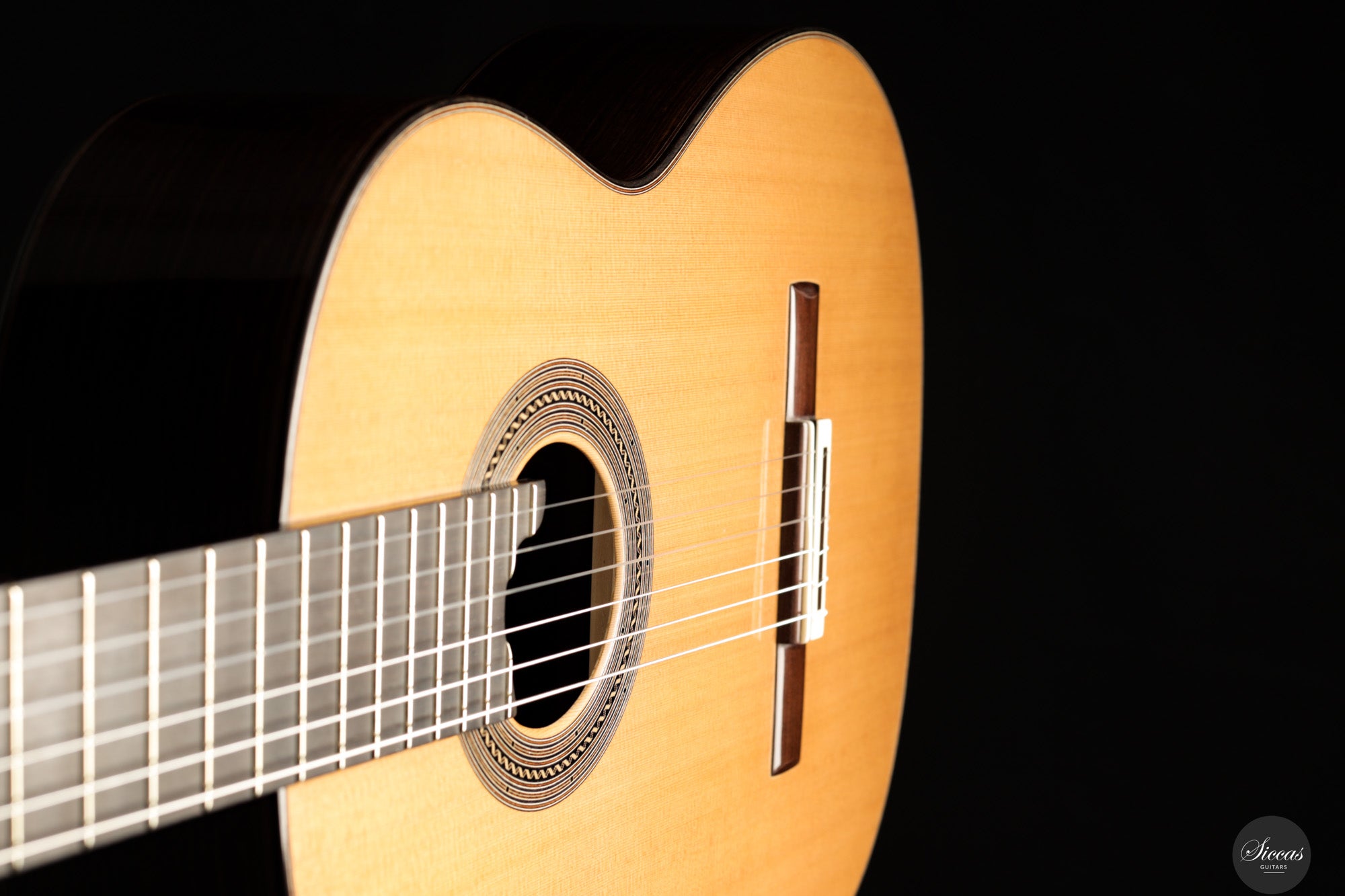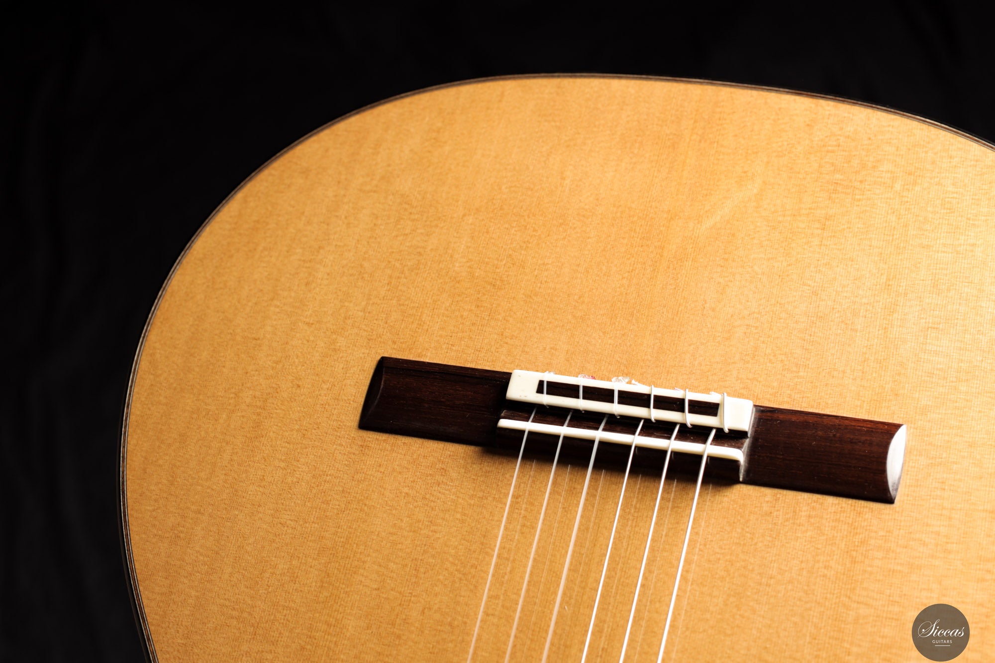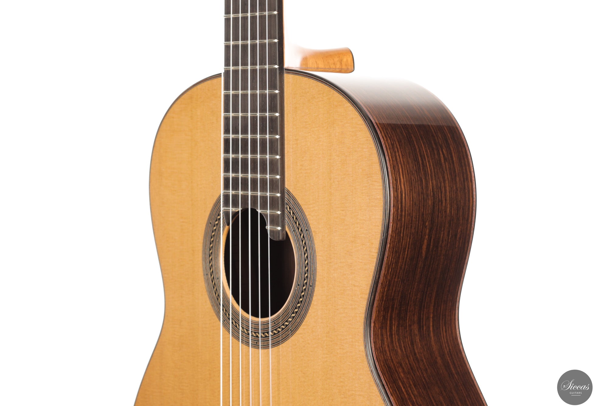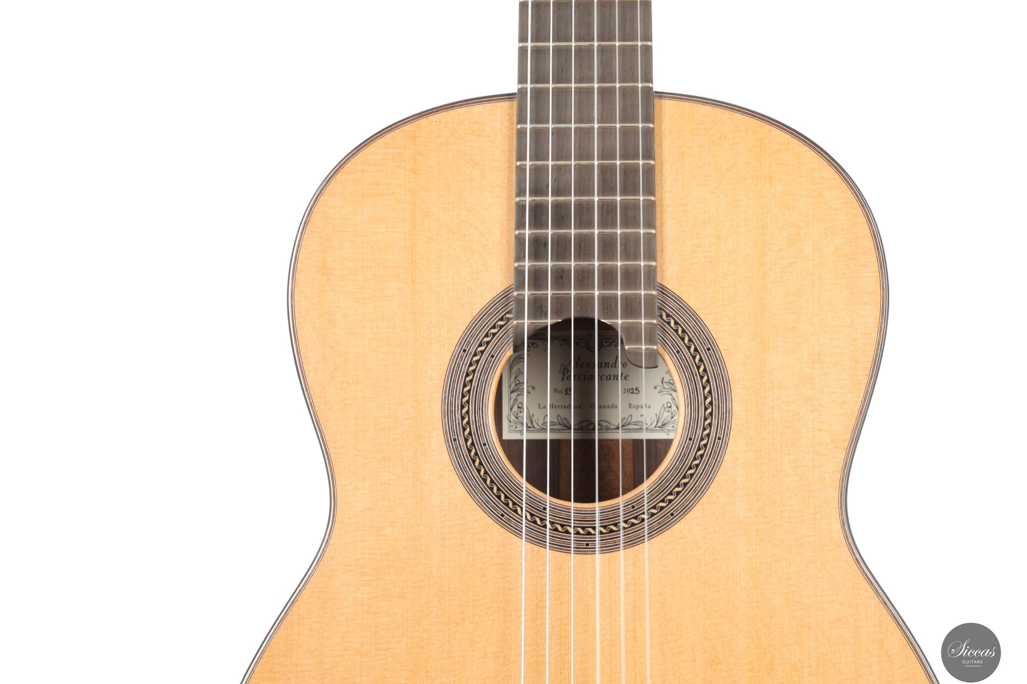 Die 2025er Konzertgitarre mit der Seriennummer 19 ist ein Ausdruck von Alessandro Perciaccantes tiefem Verständnis für den spanischen Gitarrenbau. Mit Zedernholzdecke, indischem Palisander für Boden und Zargen sowie traditioneller Fächerbeleistung verbindet sie klassische Bauweise mit modernen klanglichen Ansprüchen.