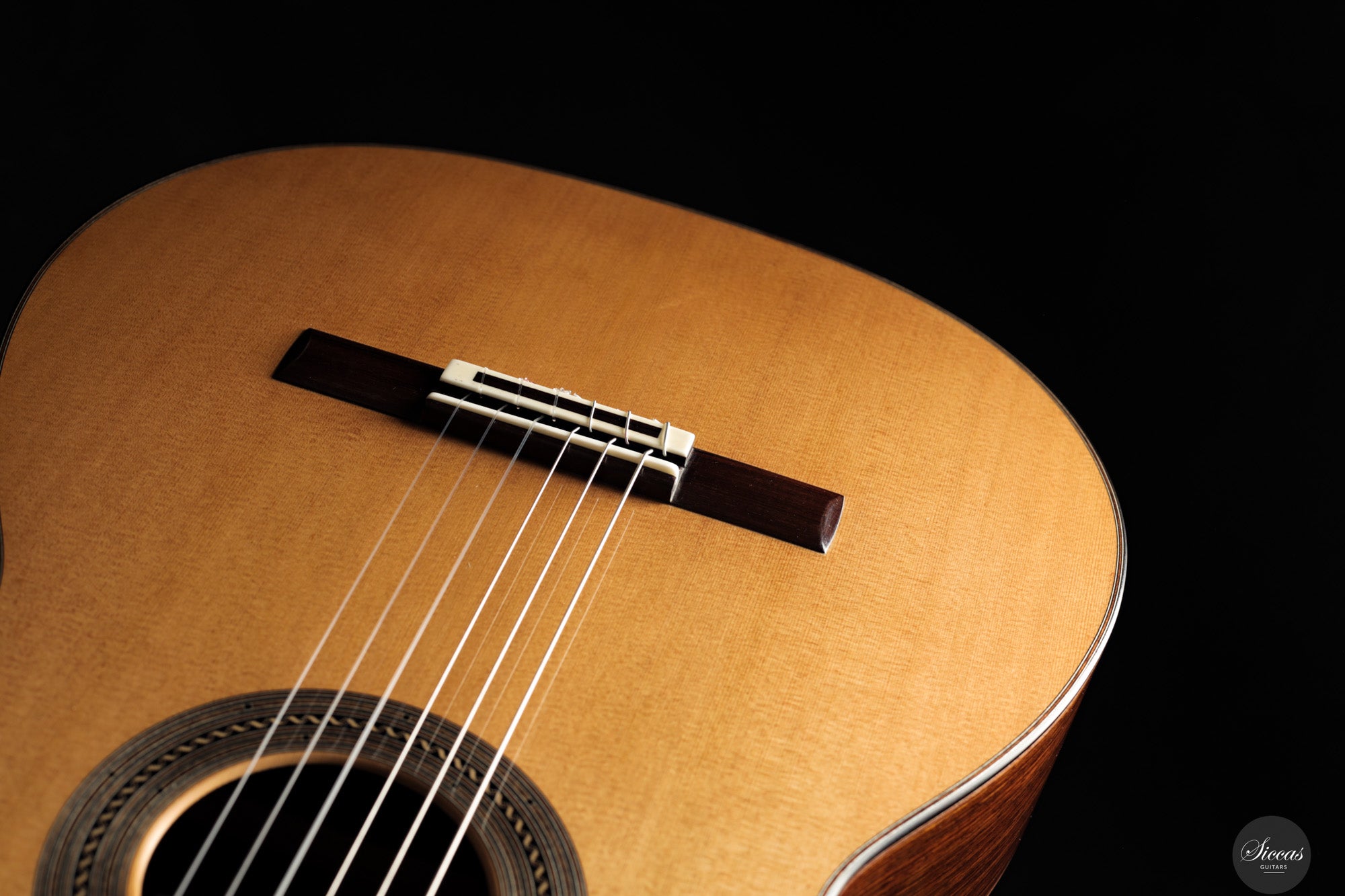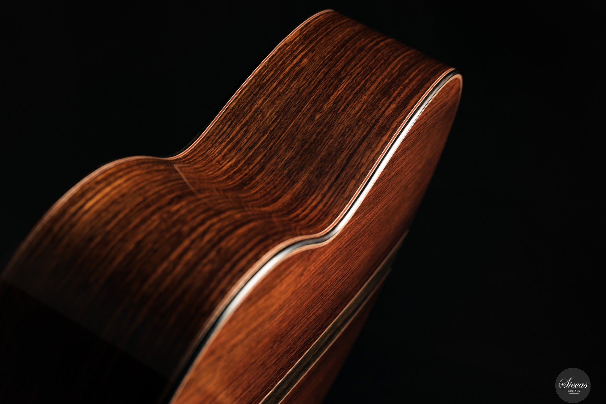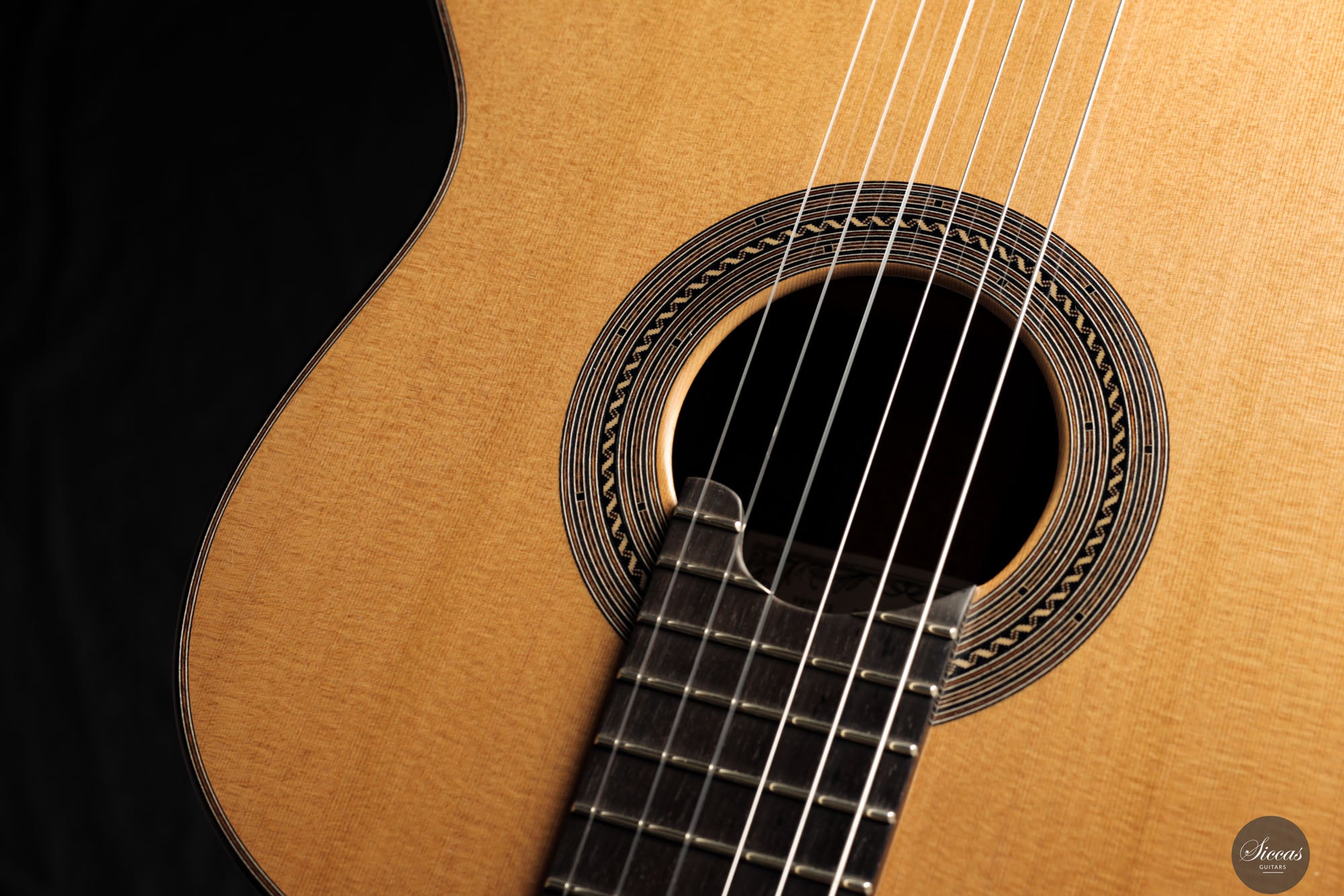 Das Instrument ist überaus resonant. Das Griffbrett über die 650 mm Mensur hinweg spielt sich entspannt, unterstützt von einem komfortabel gestalteten Halsprofil. Die transparente Schellackpolitur verleiht der Gitarre eine klassische Eleganz, bei der die Materialien und das handwerkliche Können voll zur Geltung kommen.