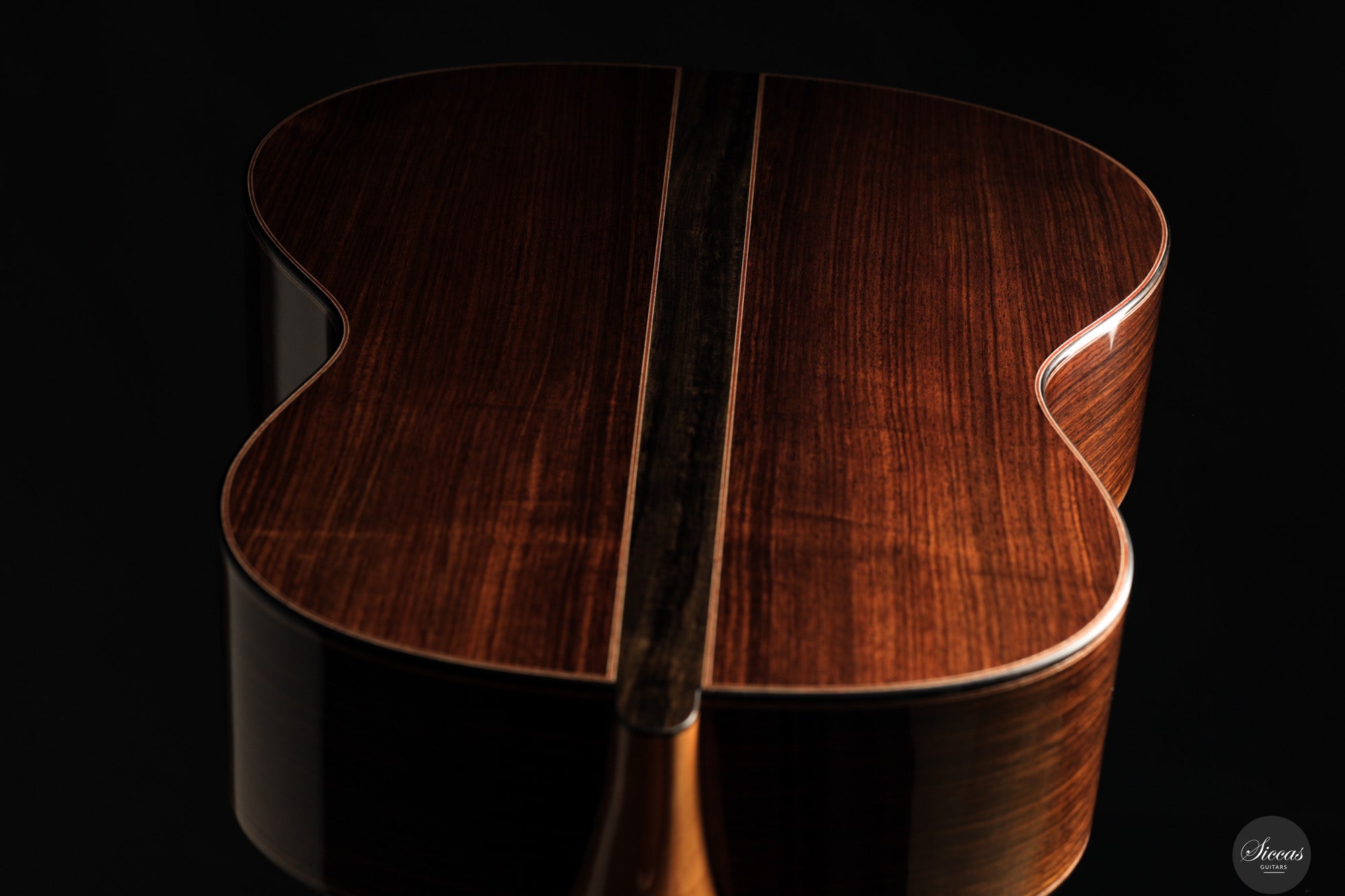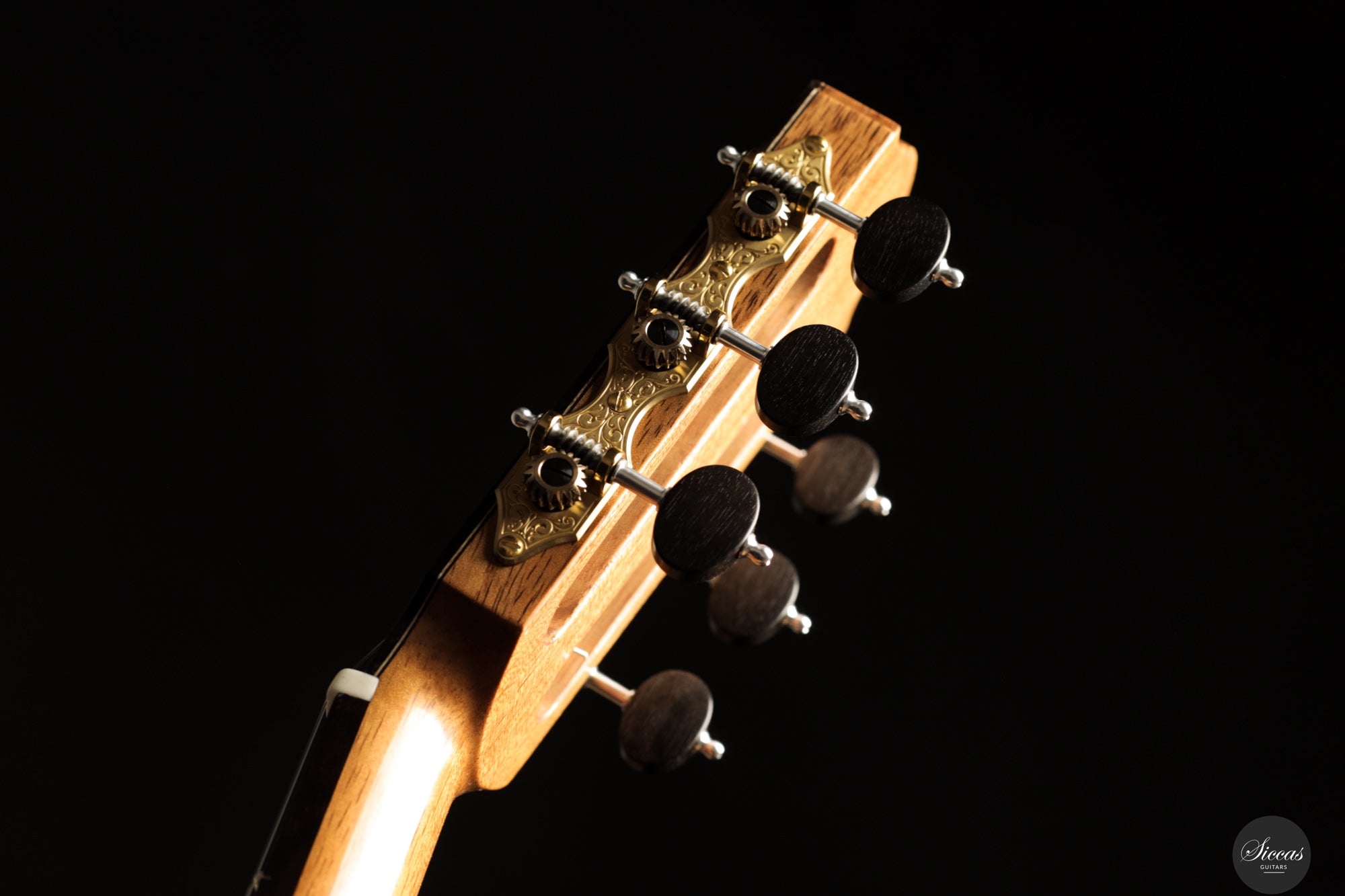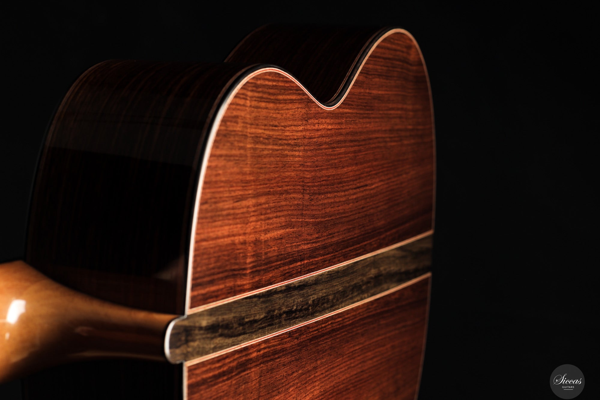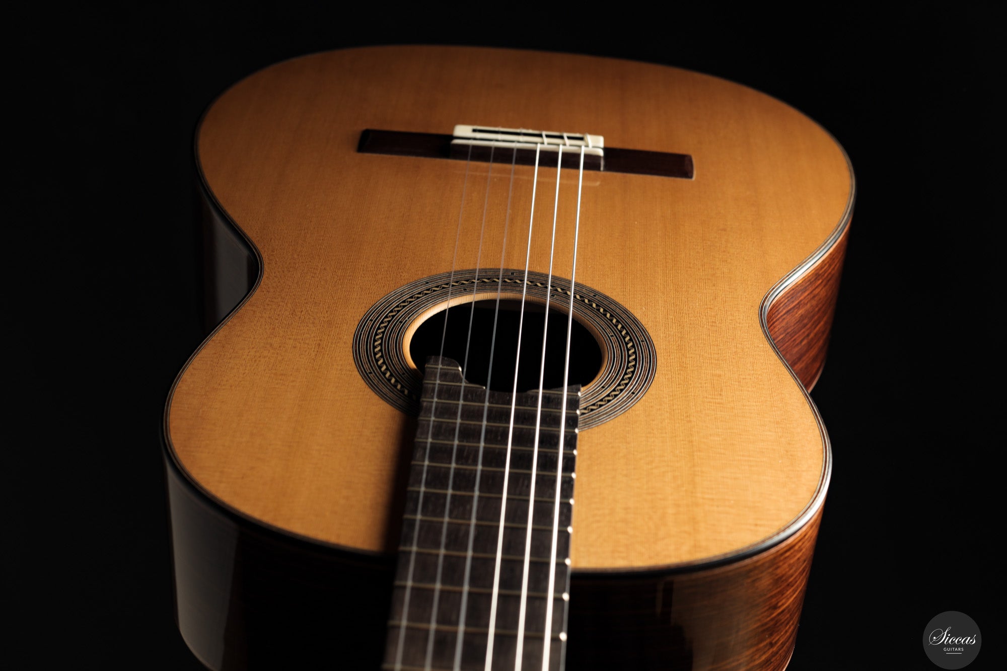 Das Instrument ist überaus resonant. Das Griffbrett über die 650 mm Mensur hinweg spielt sich entspannt, unterstützt von einem komfortabel gestalteten Halsprofil. Die transparente Schellackpolitur verleiht der Gitarre eine klassische Eleganz, bei der die Materialien und das handwerkliche Können voll zur Geltung kommen.