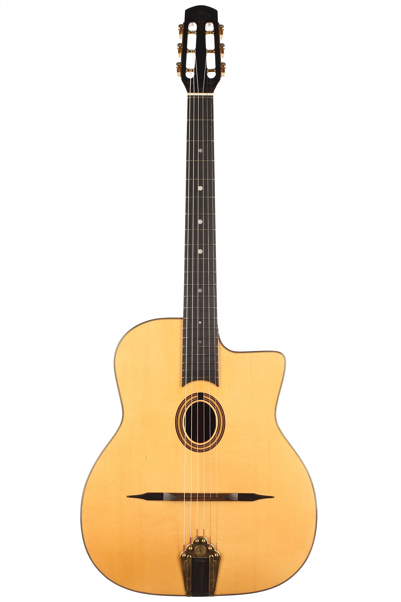 Das "M" steht für die Initialen des legendären Gitarrenbauers Mario Maccaferri, der diese Art Gitarre entwickelte und die in Zusammenarbeit mit dem französischen Hersteller Selmer von 1932 bis etwa 1952 gebaut wurde. Obwohl Maccaferris Zusammenarbeit mit Selmer 1934 endete, stellte die Firma noch bis 1952 mehrere Modelle dieser Gitarre her. Es war Django Reinhard, der die Selmer-Maccaferri-Gitarren mit ihrem typischen perkussiven Ton und seiner Spielweise populär gemacht hat. Somit ist das Selmer Maccaferri-Modell mit seinem relativ großen Korpus und dem entweder ovalen "Petite Bouche"- oder D-förmigen "Grande Bouche"-Schallloch ein unverzichtbares Element für jeden Gitarristen, der das inspirierende und faszinierende Repertoire des Gypsy Jazz erkunden möchte.