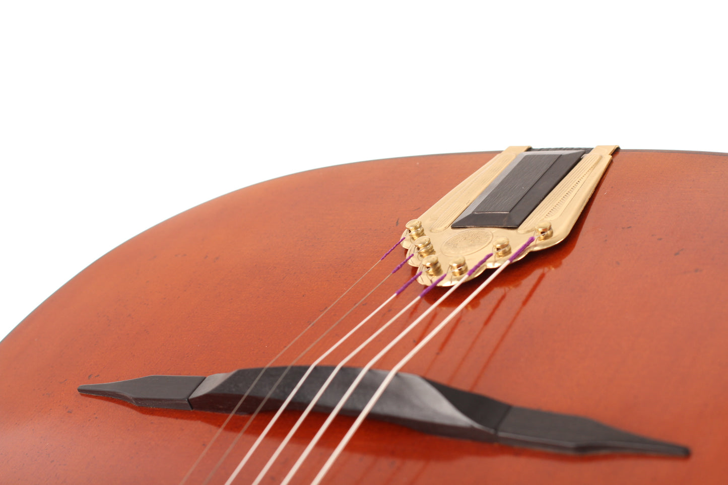 The "M" stands for the initials of the legendary guitar maker Mario Maccaferri, who developed this type of guitar and built it in collaboration with the French manufacturer Selmer from 1932 to about 1952. Although Maccaferri's collaboration with Selmer ended in 1934, the company continued to produce several models of this guitar until 1952. It was Django Reinhard who made the Selmer Maccaferri guitars popular and his playing style. Thus, the Selmer Maccaferri model with its relatively large body and either oval "Petite Bouche" or D-shaped "Grande Bouche" sound hole is an indispensable element for any guitarist who wants to explore the inspiring and fascinating repertoire of Gypsy Jazz.