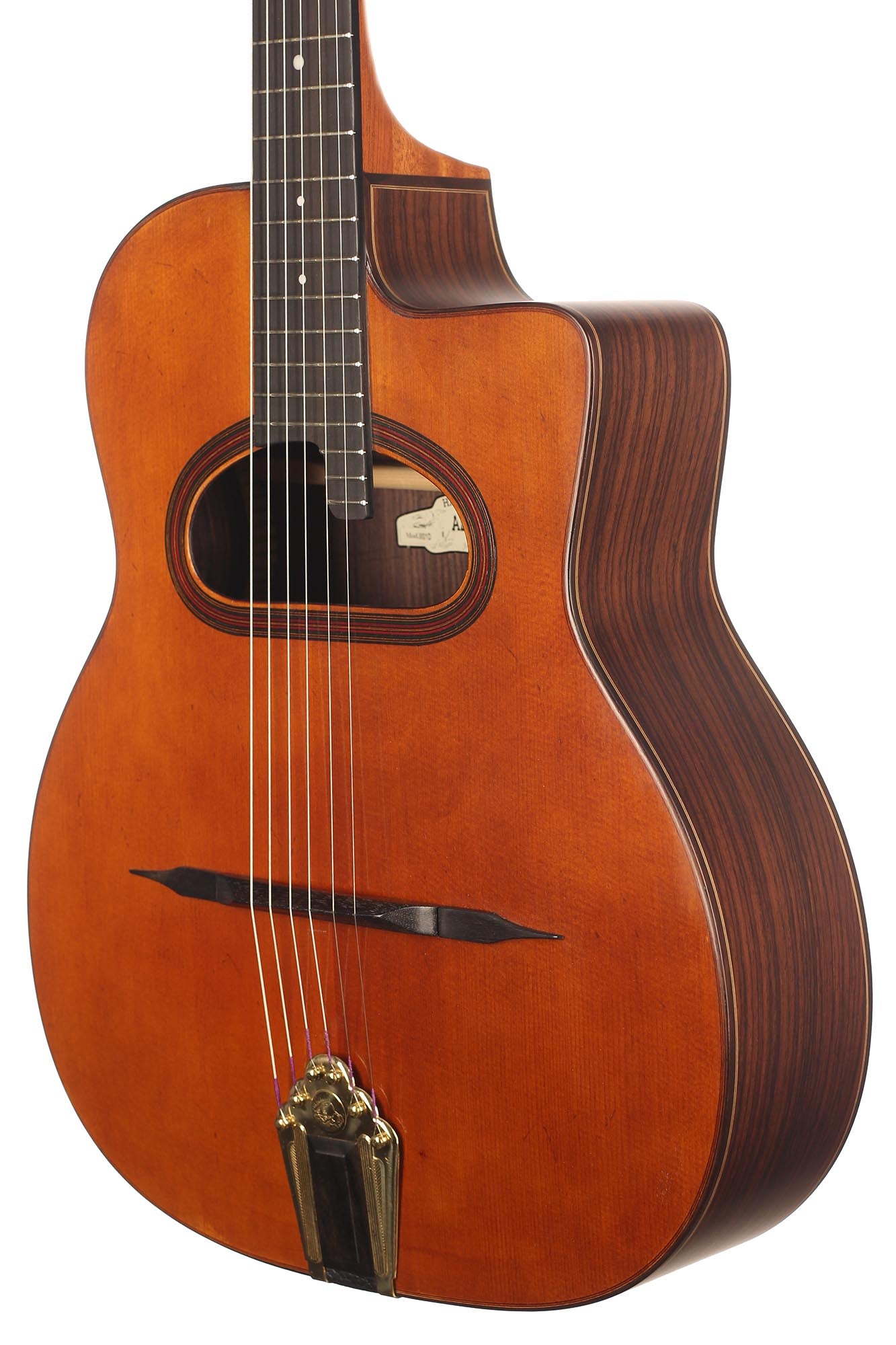 Das "M" steht für die Initialen des legendären Gitarrenbauers Mario Maccaferri, der diese Art Gitarre entwickelte und die in Zusammenarbeit mit dem französischen Hersteller Selmer von 1932 bis etwa 1952 gebaut wurde. Obwohl Maccaferris Zusammenarbeit mit Selmer 1934 endete, stellte die Firma noch bis 1952 mehrere Modelle dieser Gitarre her. Es war Django Reinhard, der die Selmer-Maccaferri-Gitarren mit ihrem typischen perkussiven Ton und seiner Spielweise populär gemacht hat. Somit ist das Selmer Maccaferri-Modell mit seinem relativ großen Korpus und dem entweder ovalen "Petite Bouche"- oder D-förmigen "Grande Bouche"-Schallloch ein unverzichtbares Element für jeden Gitarristen, der das inspirierende und faszinierende Repertoire des Gypsy Jazz erkunden möchte.