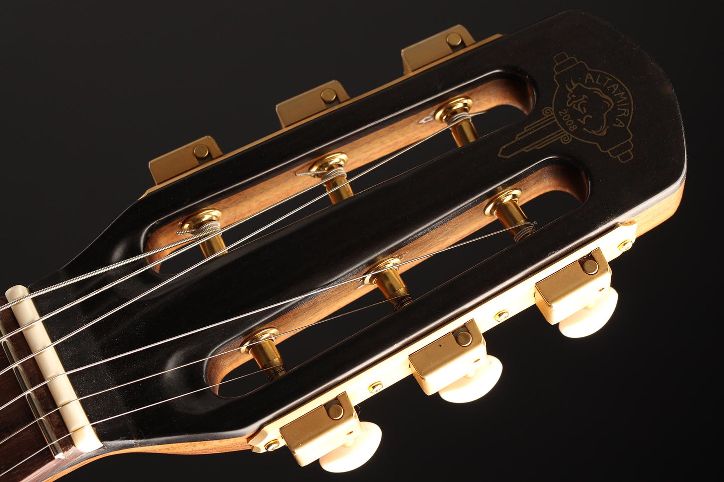 This M01D Antique Maccaferri style D-hole gypsy jazz guitar built by Altamira has a solid spruce top with an antique finish. It is very fine guitar that sounds outstandingly good, with a nice old fashionned look and a great value for money. Beautiful woods were choosen to make this guitar: the finest German Spruce top and very fine laminated Indian rosewood back and sides. Hardshell case is included.