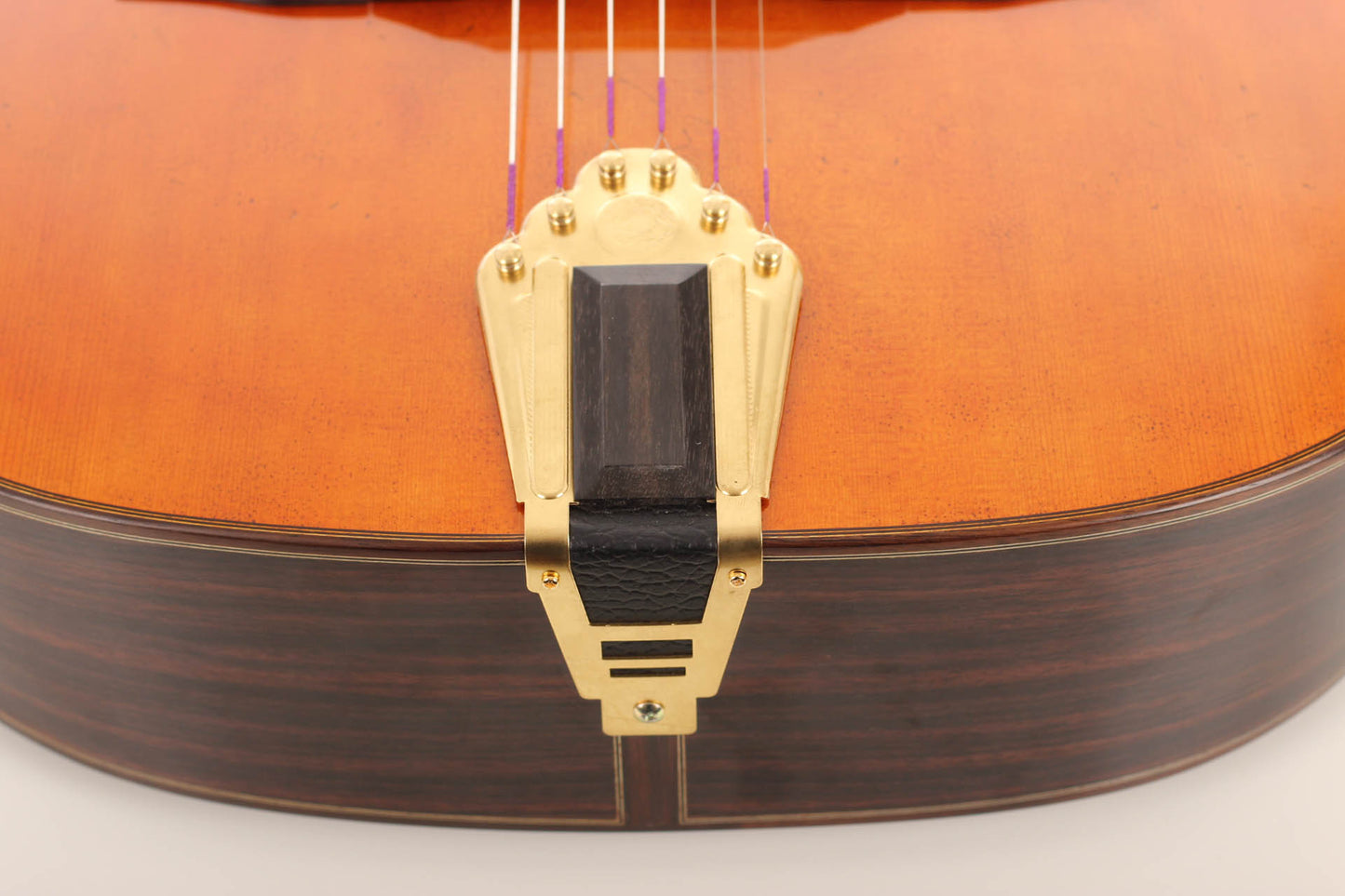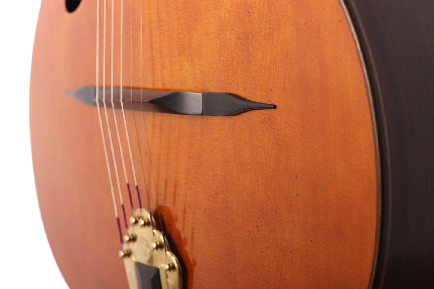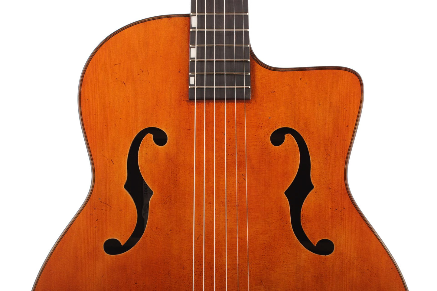 Das "M" steht für die Initialen des legendären Gitarrenbauers Mario Maccaferri, der diese Art Gitarre entwickelte und die in Zusammenarbeit mit dem französischen Hersteller Selmer von 1932 bis etwa 1952 gebaut wurde. Obwohl Maccaferris Zusammenarbeit mit Selmer 1934 endete, stellte die Firma noch bis 1952 mehrere Modelle dieser Gitarre her. Es war Django Reinhard, der die Selmer-Maccaferri-Gitarren mit ihrem typischen perkussiven Ton und seiner Spielweise populär gemacht hat. Somit ist das Selmer Maccaferri-Modell mit seinem relativ großen Korpus und dem entweder ovalen "Petite Bouche"- oder D-förmigen "Grande Bouche"-Schallloch ein unverzichtbares Element für jeden Gitarristen, der das inspirierende und faszinierende Repertoire des Gypsy Jazz erkunden möchte.