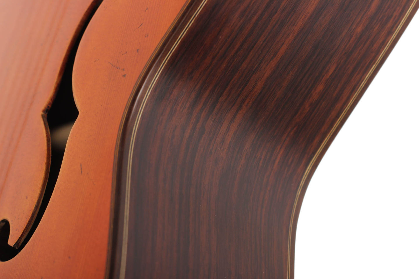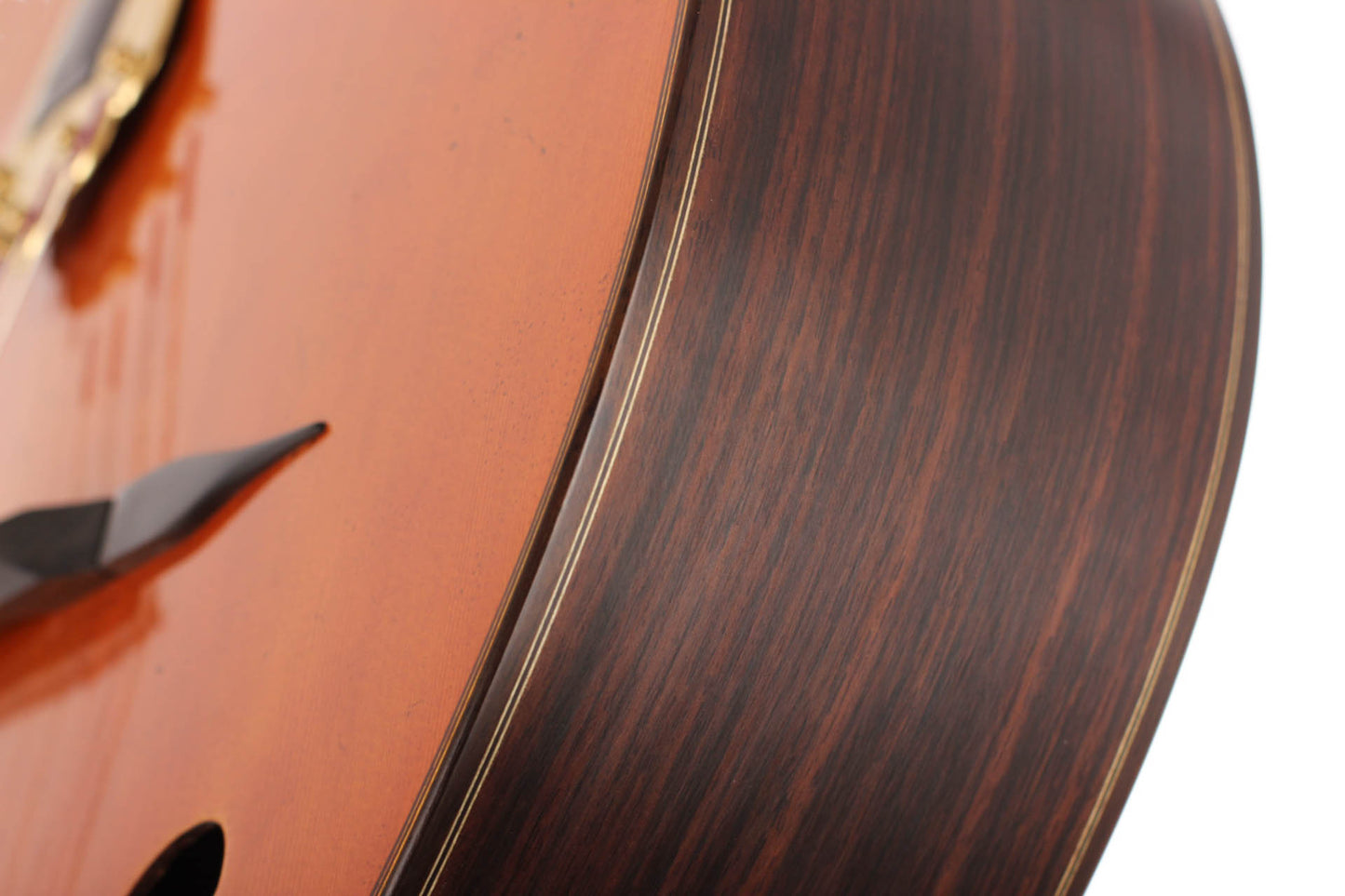 Die M01 ist mit ovalem Schallloch (Petite Bouche), D-förmigem Schallloch (Grande Bouche) und F-Löchern, ähnlich denen einer Violine, erhältlich. Dieses Modell hat einen sehr authentischen perkussiven Klang und bietet ein unschlagbares Preis-Leistungs-Verhältnis. Mit seiner massiven Fichtendecke und laminiertem Palisanderboden und -zargen ist es in einer Hochglanzlackierung oder Antik-Finish-Ausführung erhältlich, wobei letzteres diesem fantastischen Modell einen schönen Vintage-Charakter verleiht. Für den optimalen Schutz des Instruments ist ein passender Hartschalenkoffer im Preis inbegriffen.