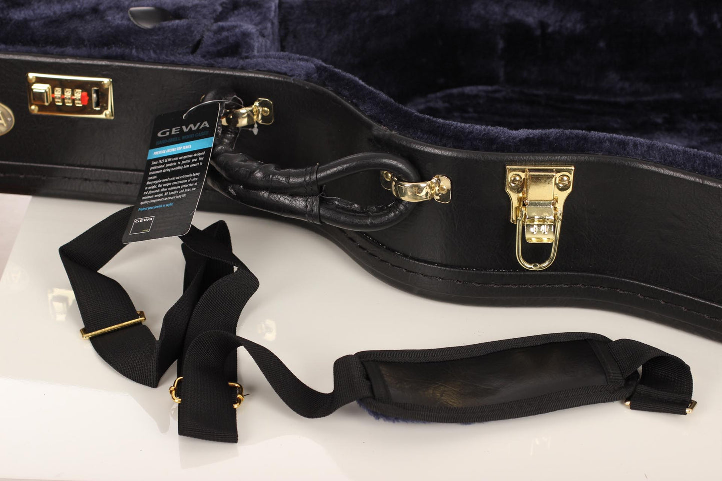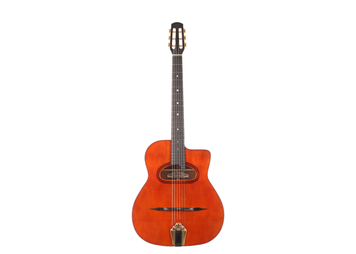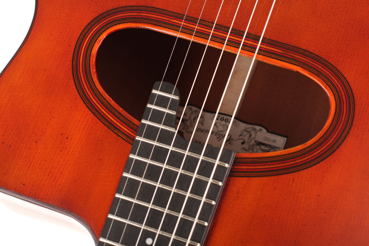 This is a M10D Maccaferri style D-hole gypsy jazz guitar by Altamira with solid spruce top and solid mahogany back and sides, in antique finish. A very fine guitar that sounds so great. Only the best wood were choosen to make this guitar: Finest German Spruce and very fine Mahogany. A guitar hard case is included. A Gewa Prestige hardshell case is included.