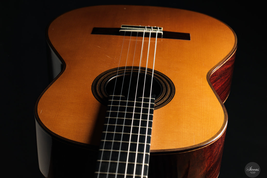 This 1994 Andrea Tacchi Coclea is an early and beautifully preserved example of the Florentine master’s celebrated model. Already at this stage, Tacchi had established his refined style, evident in the guitar’s balance, projection and tonal elegance. With age, the instrument has matured into a responsive and vibrant voice, opening quickly under the right hand and offering clear, consistent trebles with a velvety character. Doubled sides with inner cypress enhance projection and depth, giving the guitar impressive presence in performance. Owned by a single person since new, it has been carefully maintained and remains in very good condition without structural issues.