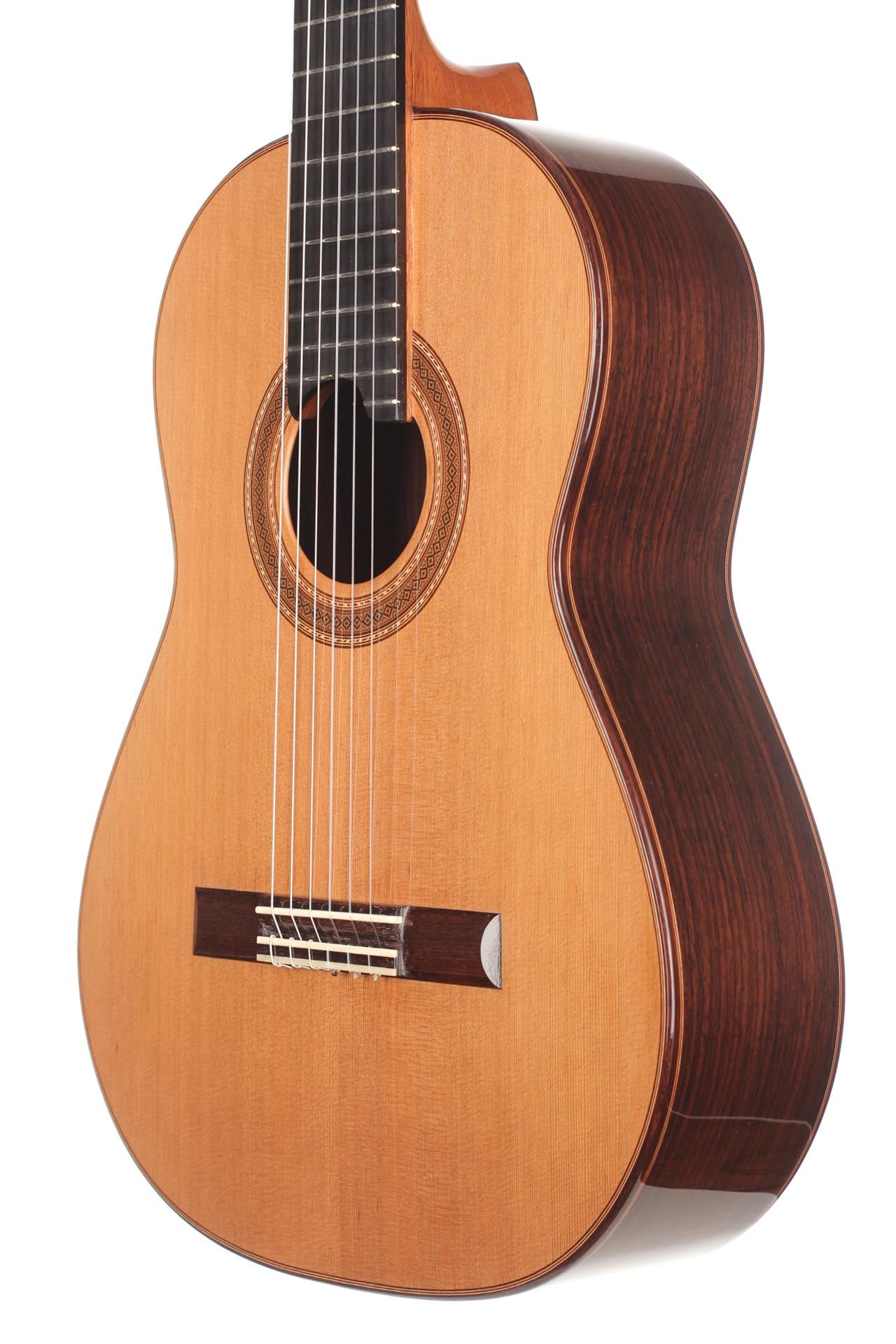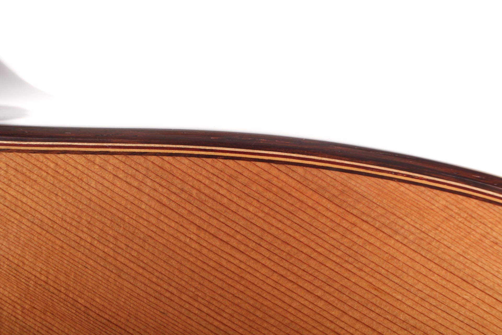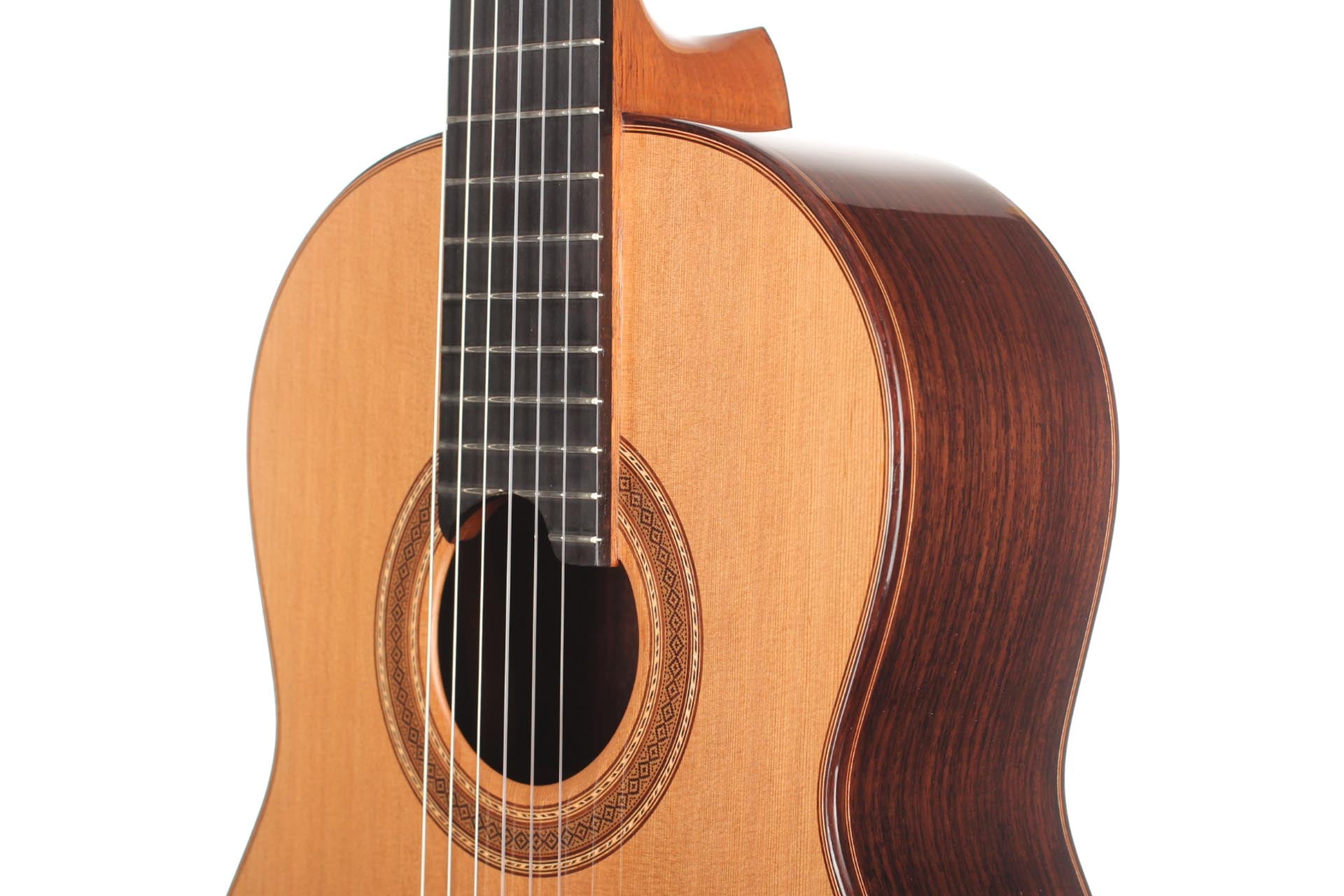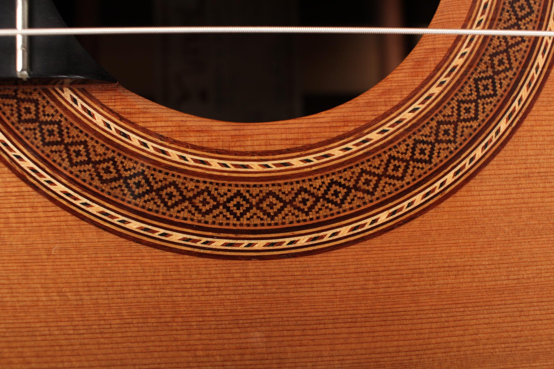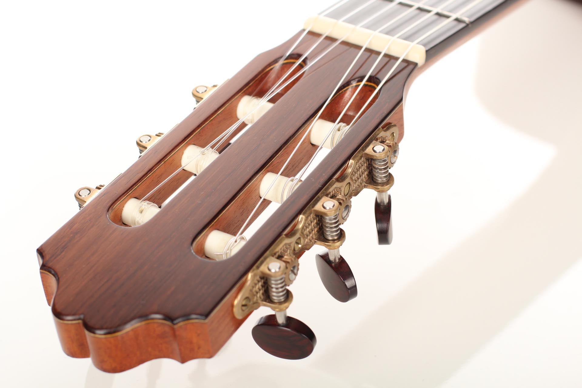 This model from 2010 was built traditionally, and shows a timeless design with beautifully harmonic color transitions. The top is made of cedar, the back and sides are made of rosewood. The sound is powerful and direct. A terrifically forceful bass underlines the warm mids and clear trebles.The guitar is in excellent condition. The tuners are made by Sloane. A Hiscox hard-shell case is included.