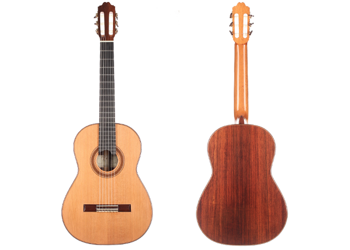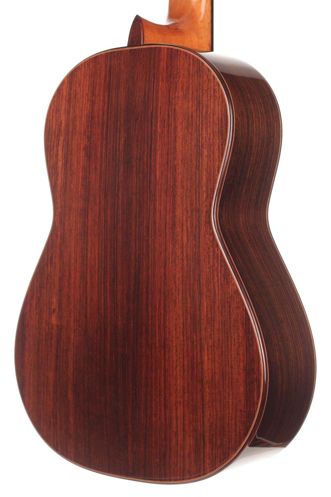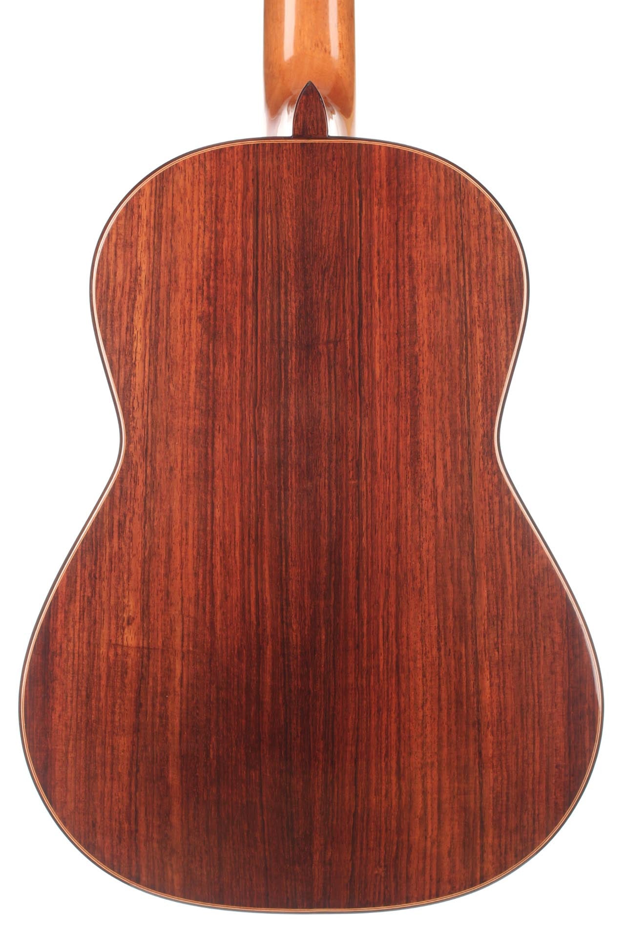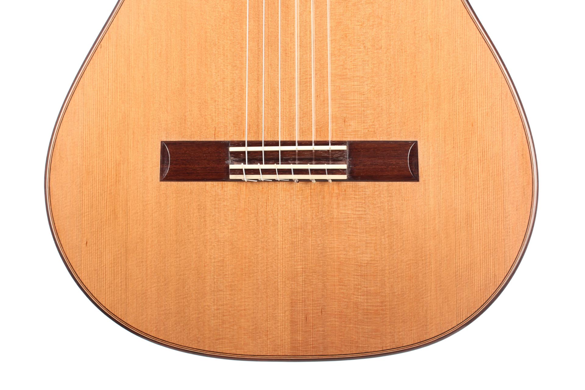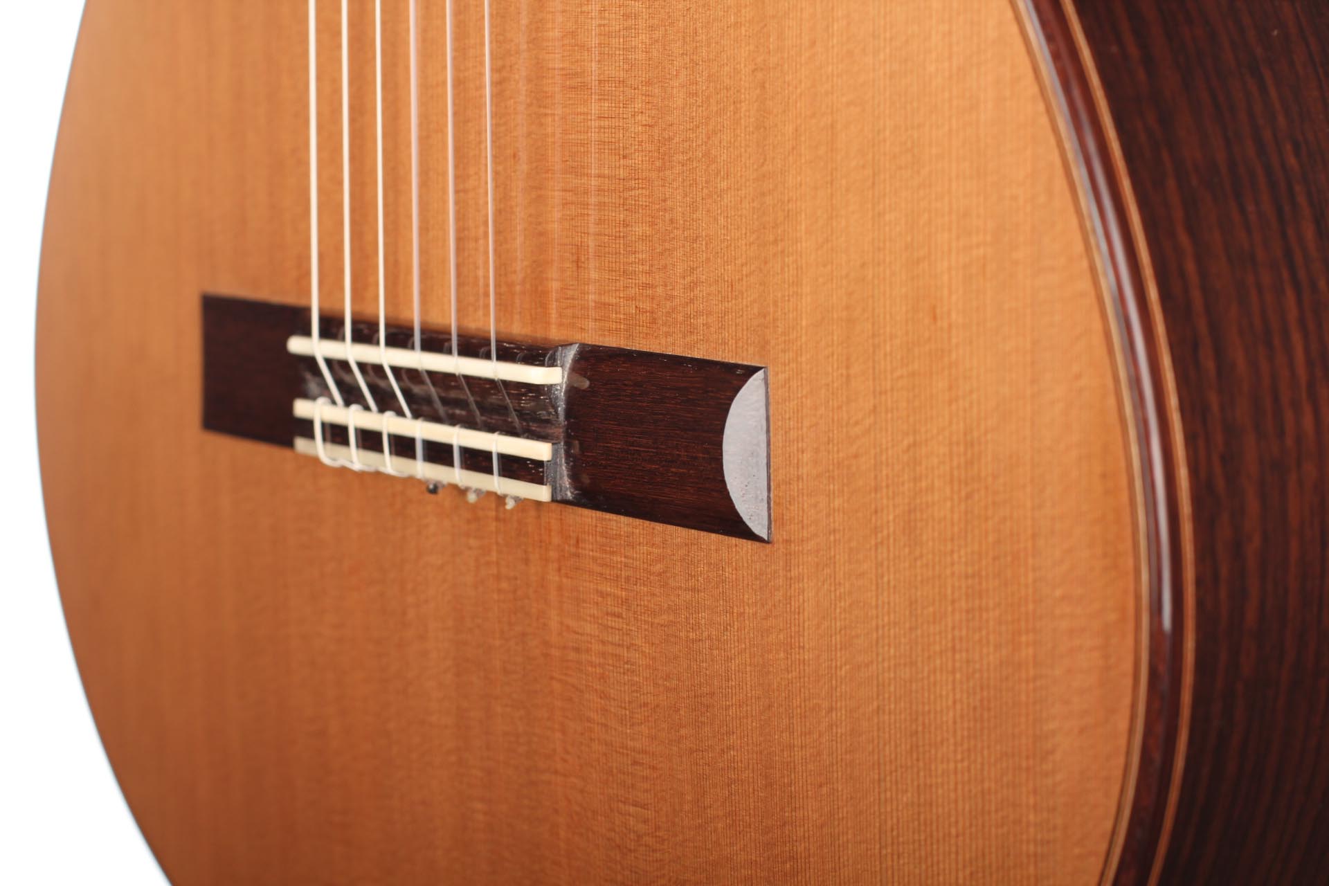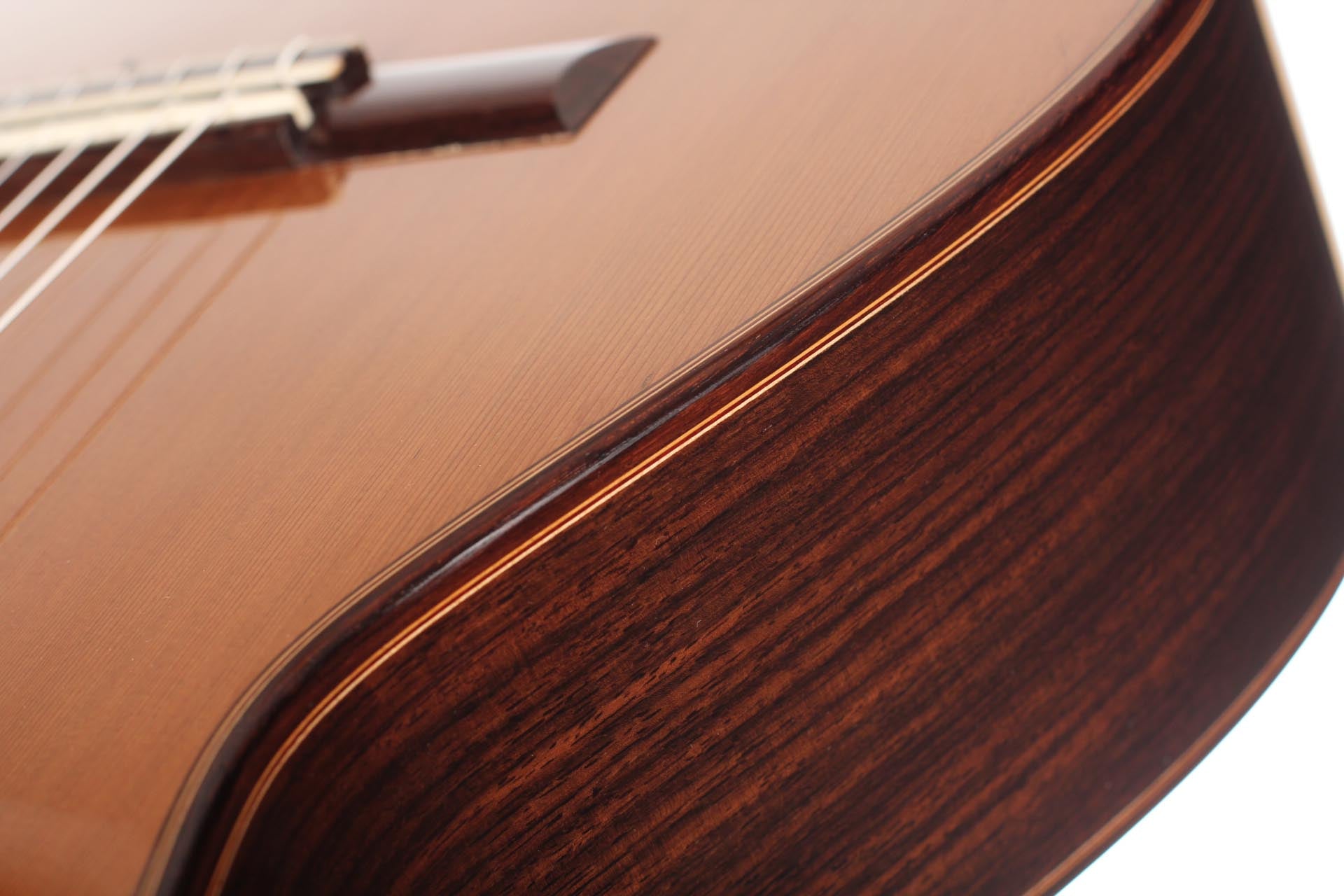 This model from 2010 was built traditionally, and shows a timeless design with beautifully harmonic color transitions. The top is made of cedar, the back and sides are made of rosewood. The sound is powerful and direct. A terrifically forceful bass underlines the warm mids and clear trebles.The guitar is in excellent condition. The tuners are made by Sloane. A Hiscox hard-shell case is included.