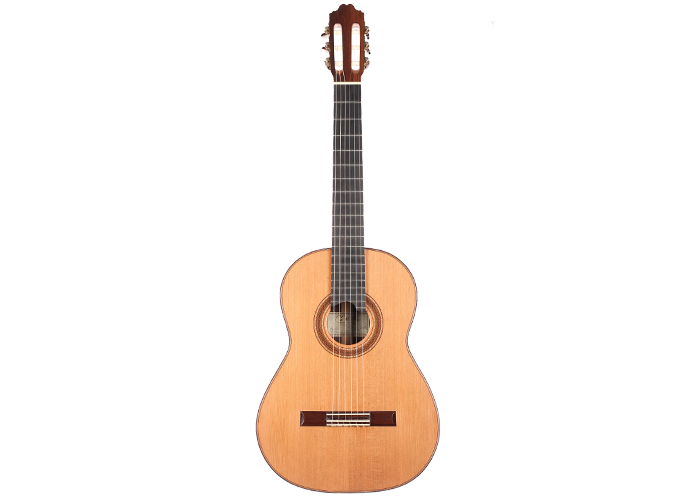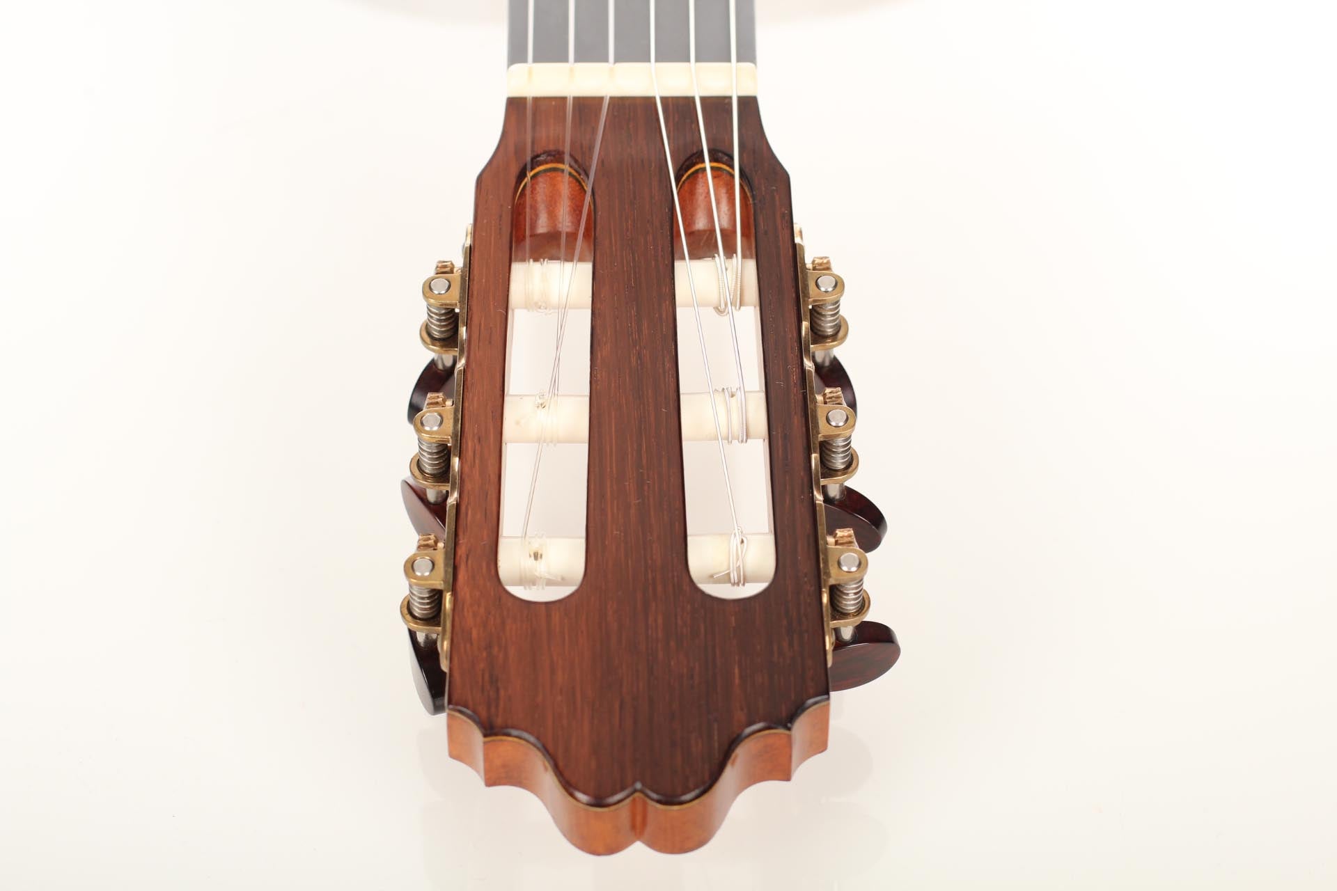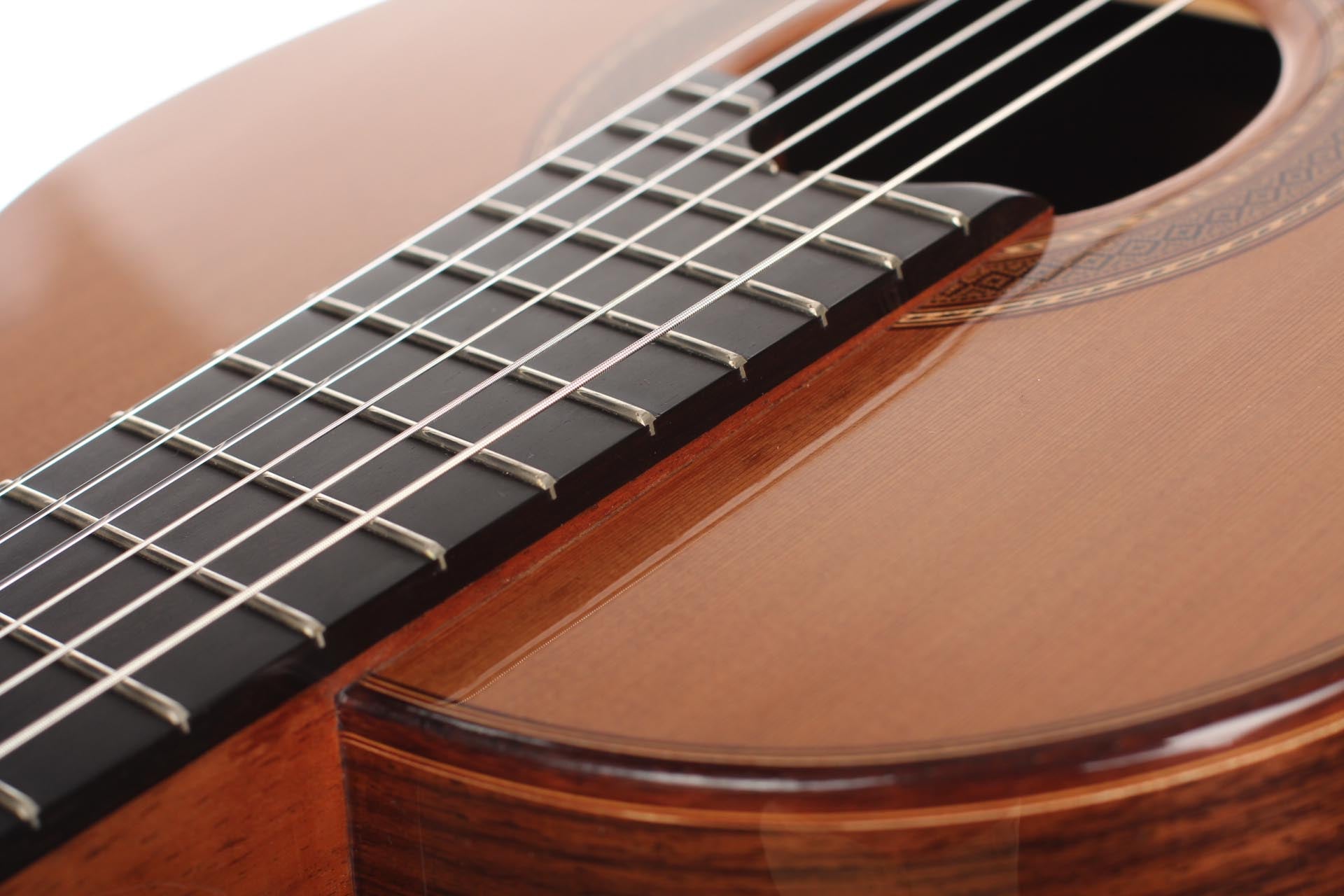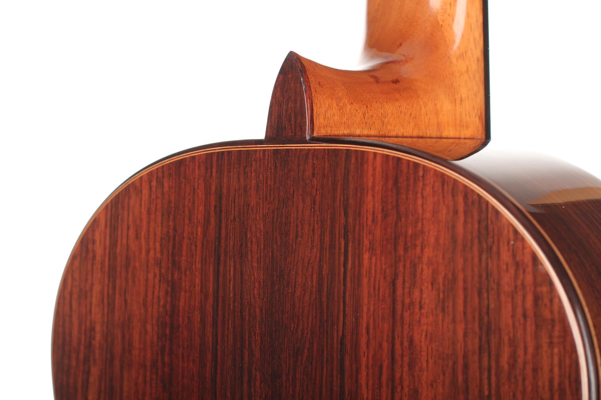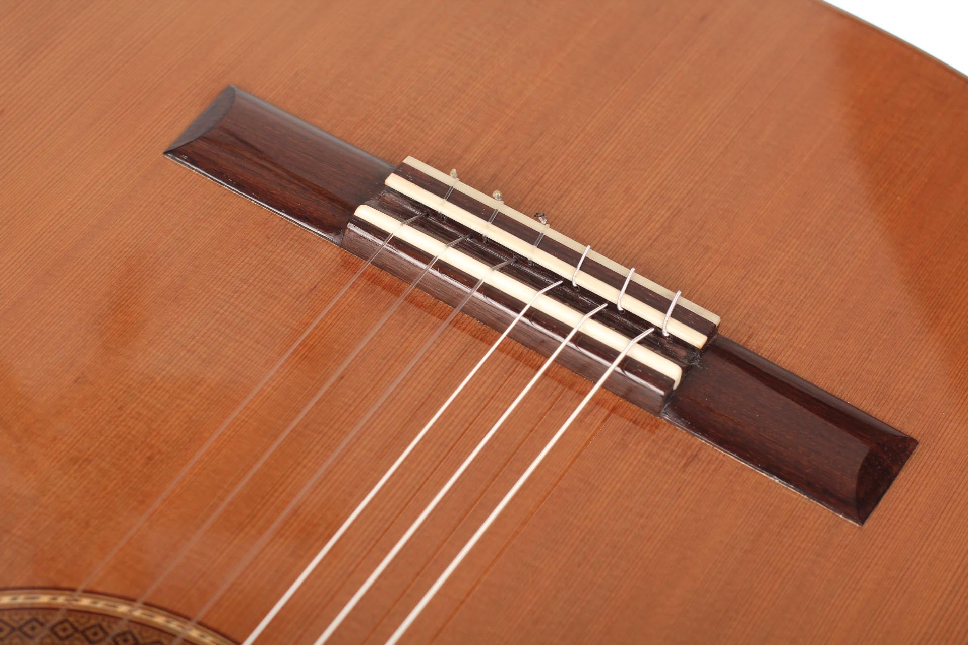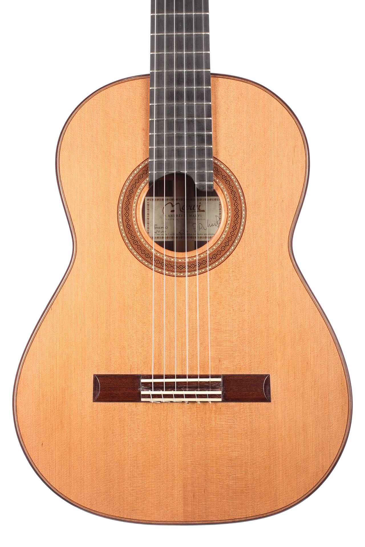 This model from 2010 was built traditionally, and shows a timeless design with beautifully harmonic color transitions. The top is made of cedar, the back and sides are made of rosewood. The sound is powerful and direct. A terrifically forceful bass underlines the warm mids and clear trebles.The guitar is in excellent condition. The tuners are made by Sloane. A Hiscox hard-shell case is included.