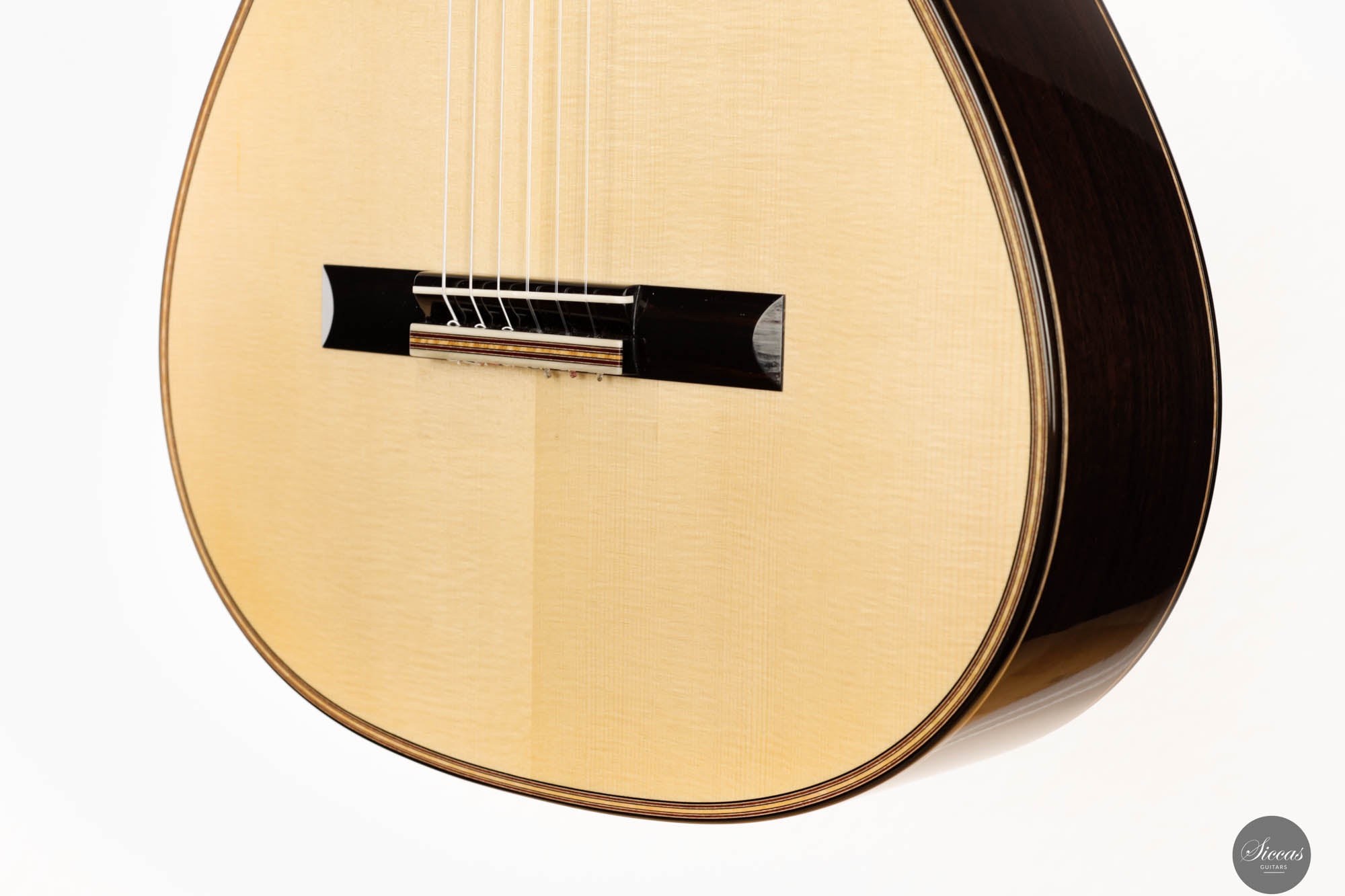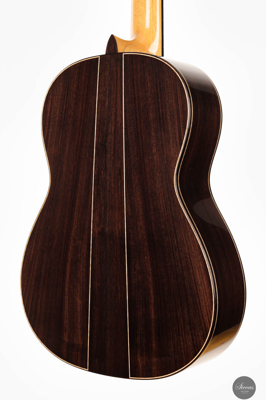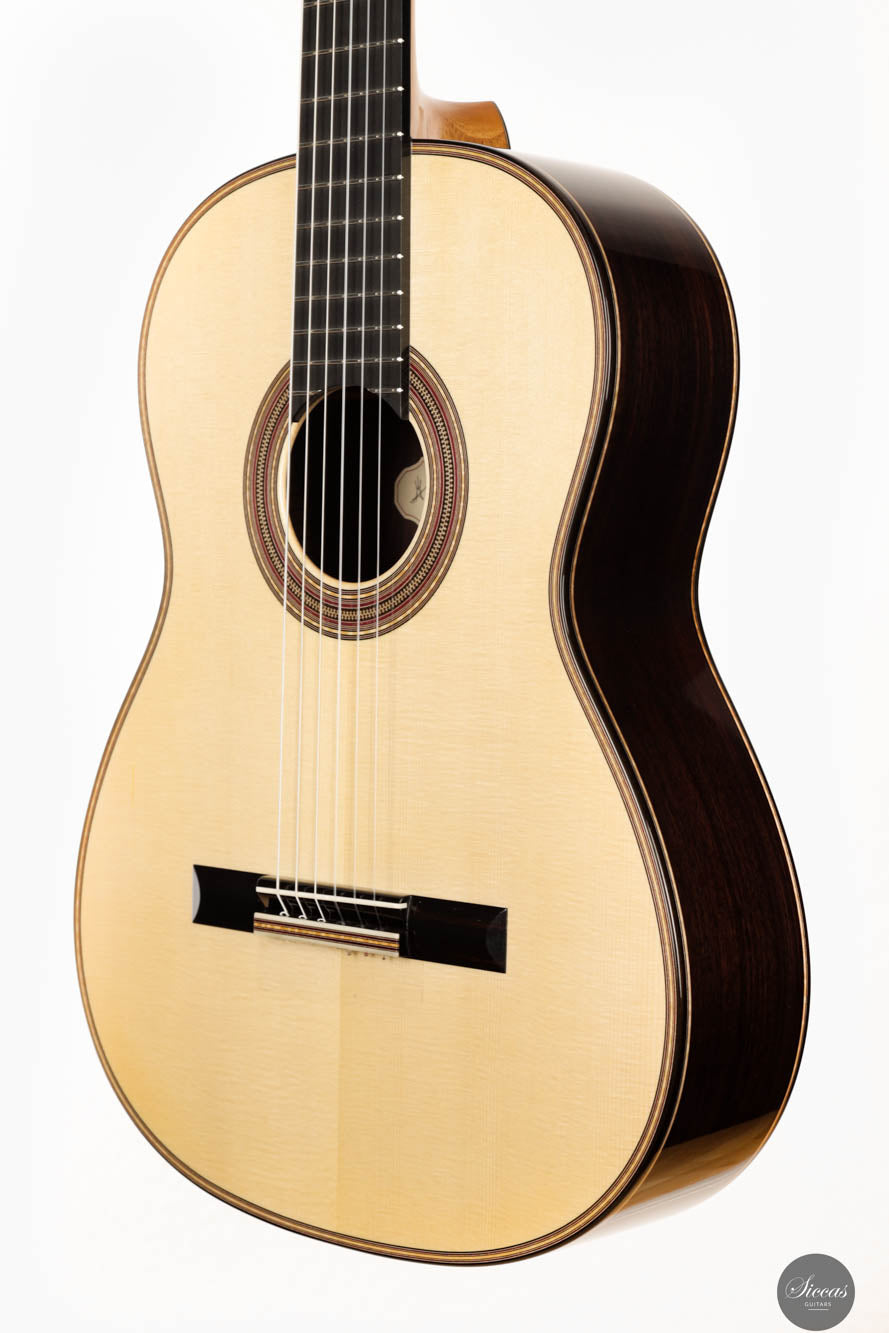 Mit einem traditionellen 7-Fächer-Bracing-Design konzipiert, ist die Antonio Marchese Gitarre Nr. 106 darauf ausgelegt, Marcheses Ideal akustischer Perfektion zu erreichen, mit einer Hauptresonanz im F/F#-Bereich. Diese Designwahl resultiert in einer reichen Mischung aus tiefen, dunklen Bassklängen und klaren, melodischen Höhen, die ein ausgewogenes und ausdrucksstarkes Klangspektrum bieten. Diese Gitarre ist darauf ausgelegt, den nuancierten Anforderungen verschiedener Spielstile gerecht zu werden und bietet ein vielseitiges Werkzeug für Musiker, die ein reiches und dynamisches Hörerlebnis suchen. Die Kombination aus außergewöhnlicher Bauqualität, innovativem Design und überlegener tonaler Balance macht die Antonio Marchese Gitarre Nr. 106 zu einer ausgezeichneten Wahl für Gitarristen, die ihren musikalischen Ausdruck bereichern möchten, und verstärkt Antonio Marcheses Ruf als eine führende Figur in der Kunst des Gitarrenbaus.