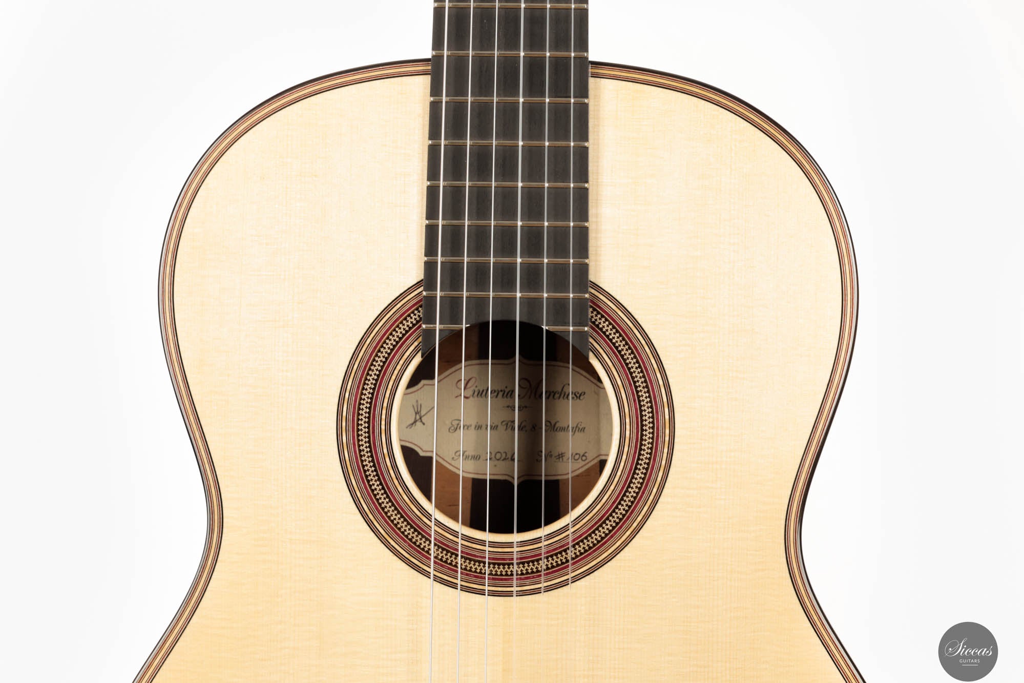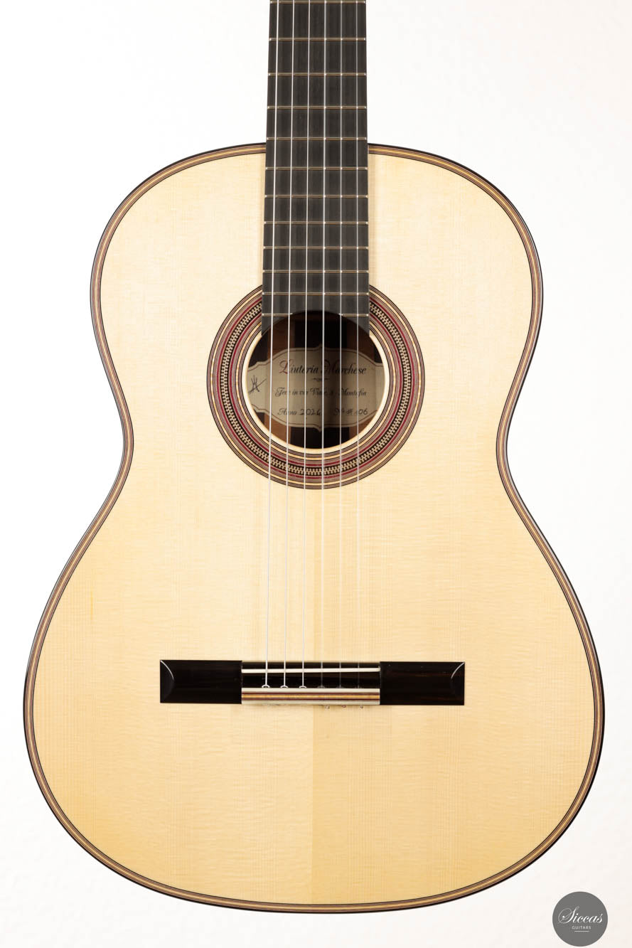 Die Antonio Marchese Gitarre Nr. 106 aus dem Jahr 2024 ist eine Fusion aus traditionellem Handwerk und fortschrittlicher akustischer Technik. Gebaut vom talentierten Gitarrenbauer Antonio Marchese, ist dieses Instrument ein Schaufenster sorgfältiger Konstruktion und ästhetischer Schönheit. Sie verfügt über eine hochwertige Fichtendecke und indisches Palisander für Rücken und Seiten, was ein Instrument schafft, das sowohl visuell ansprechend als auch klanglich robust ist. Der außergewöhnliche französische Polier des Instruments, ein Zeugnis für Marcheses Fähigkeiten in den Veredelungstechniken, erhöht seine visuelle Anziehungskraft mit einem makellosen Glanz. Dieses Maß an Detailgenauigkeit unterstreicht nicht nur Marcheses Hingabe an sein Handwerk, sondern trägt auch zur Gesamtresonanz und Klangprojektion der Gitarre bei.