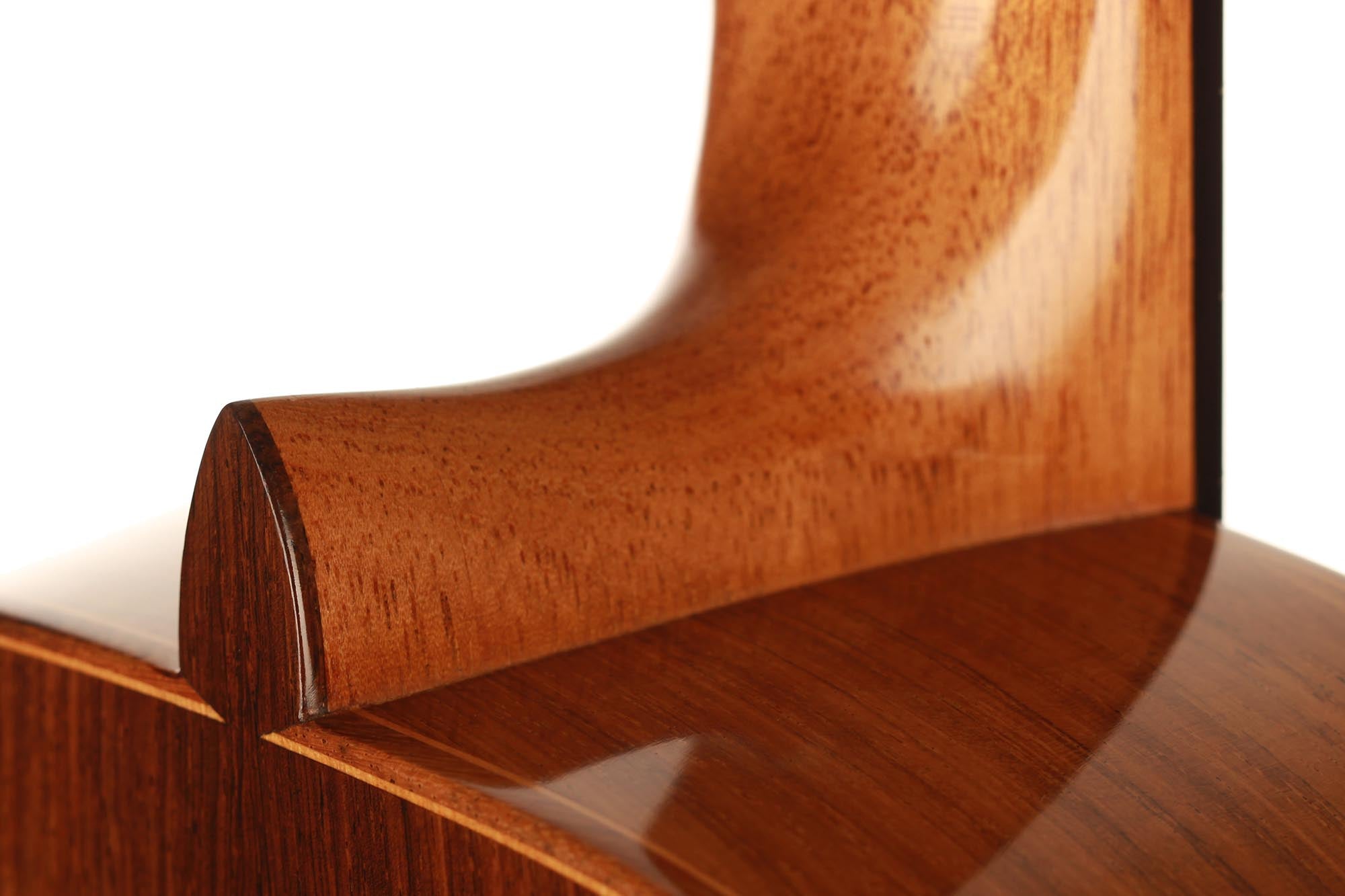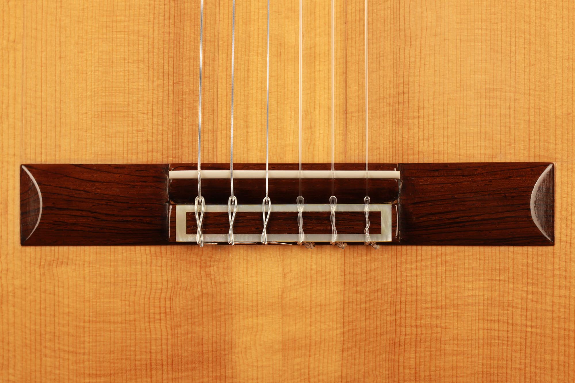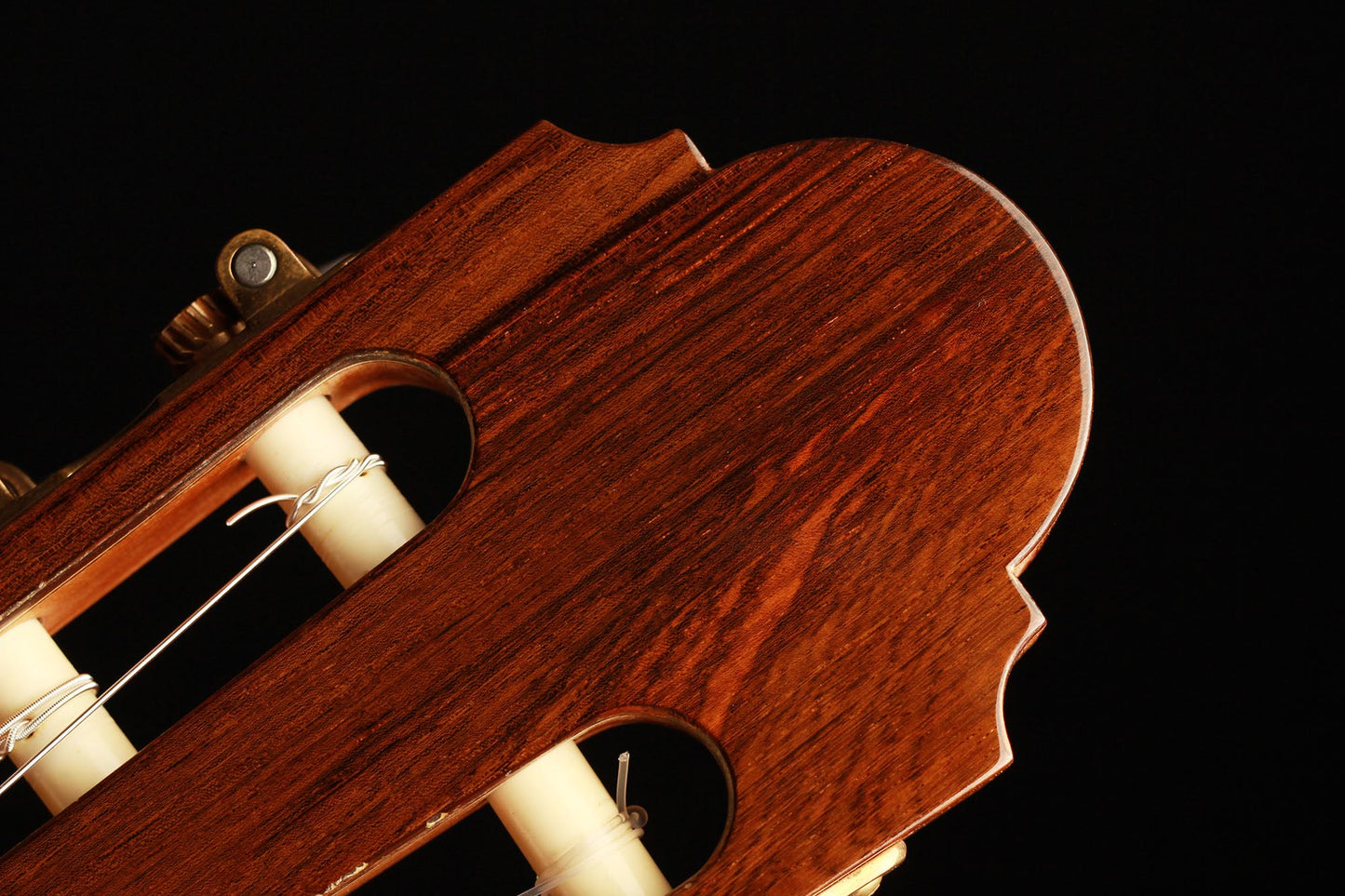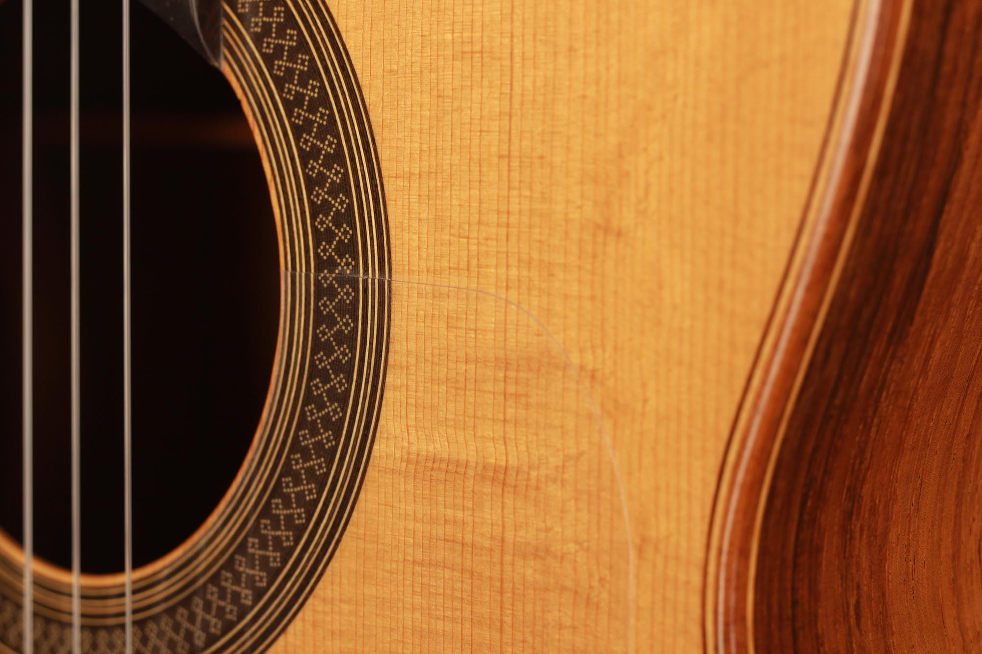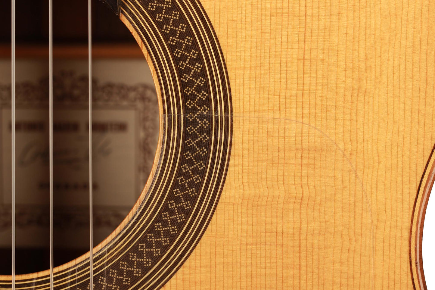 This sublime Robert Bouchet model guitar is one of the most aesthetic guitars we have ever seen from Antonio Marin Montero. One of the most interesting details is the bear-claw spruce top. This type of wood was only used on rare occasions by the Spanish master. In addition, back and sides are made of Amazon rosewood with a very straight and close grain. The balance of colours and the perfection of the craftsmanship is remarkable. This guitar is in very good condition with only very few playing marks and two tiny cracks on the soundboard, that were repaired by A. M. Montero himself.