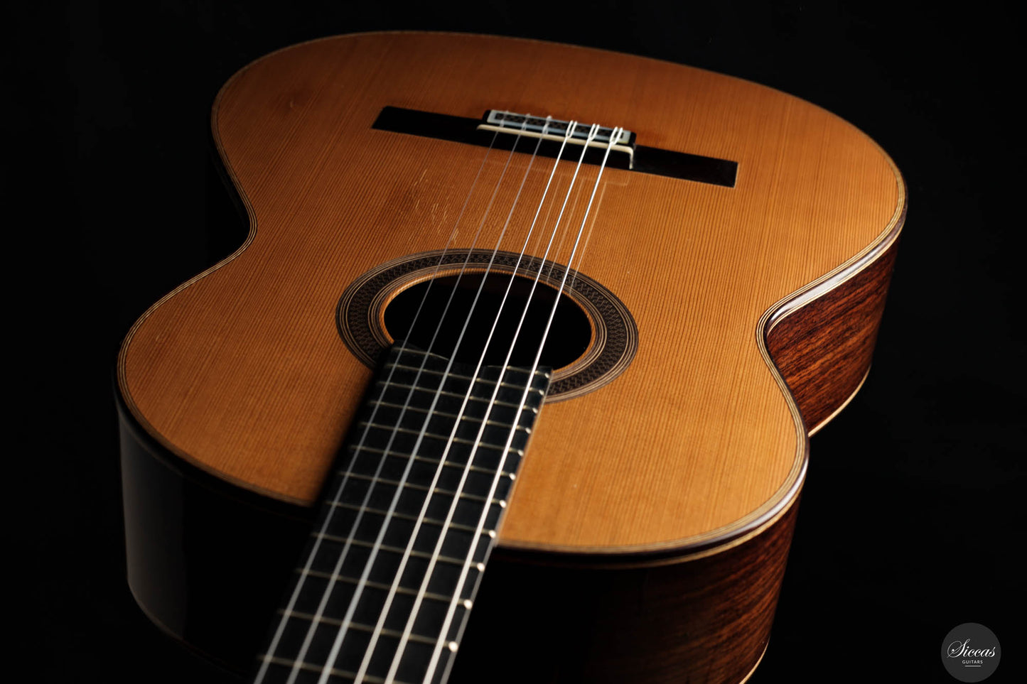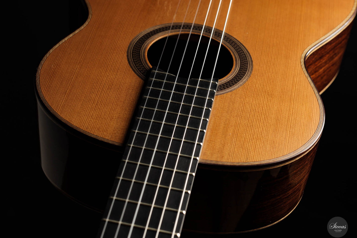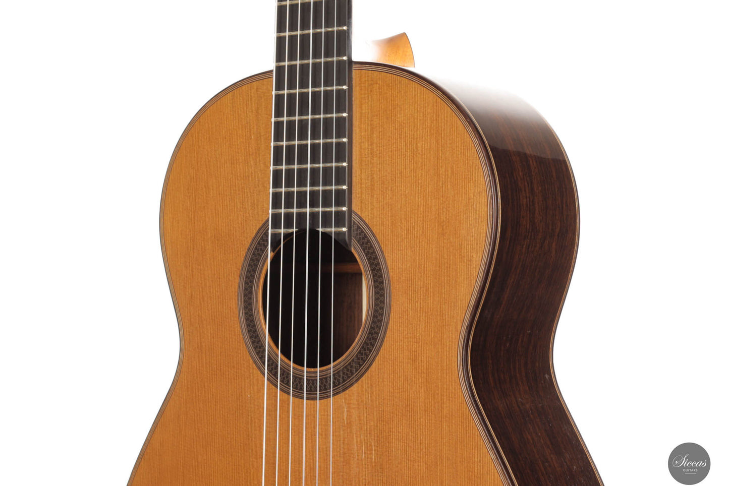 Diese atemberaubende Gitarre aus dem Jahr 2012, die die Nummer 1196 trägt, ist ein fesselndes Instrument mit einem traditionellen 5-Fächer-Beleistungssystem. Dieses Design unterstützt ihre massive Zederndecke, ergänzt durch Rücken und Seiten aus exquisitem indischen Rosenholz. Die Kombination führt zu einer sehr ansprechbaren Gitarre, die einen strahlenden Ton ausstrahlt, voll von fesselnden Obertönen und Sustain. Bekannt für den reichen und warmen Klang von Montero, ist auch die Ästhetik der Gitarre bemerkenswert. Obwohl diese bereits geliebte Gitarre normale Gebrauchsspuren aufweist, befindet sie sich in einem ausgezeichneten Zustand. Es ist auch erwähnenswert, dass es nicht viele Antonio Marin Montero Gitarren mit einer Zederndecke gibt, was dieses Instrument noch einzigartiger und kollektiver macht.