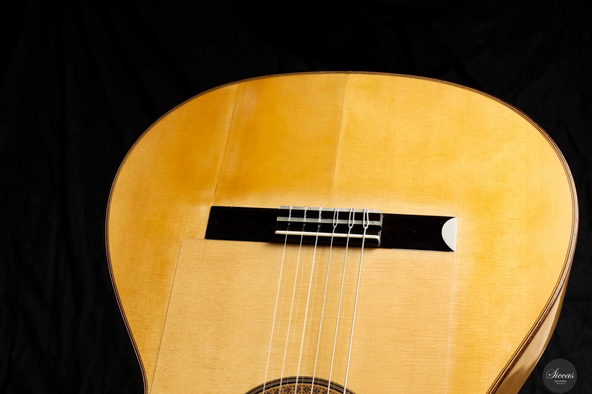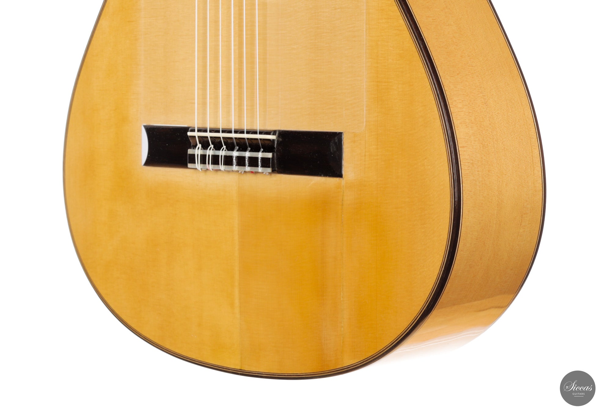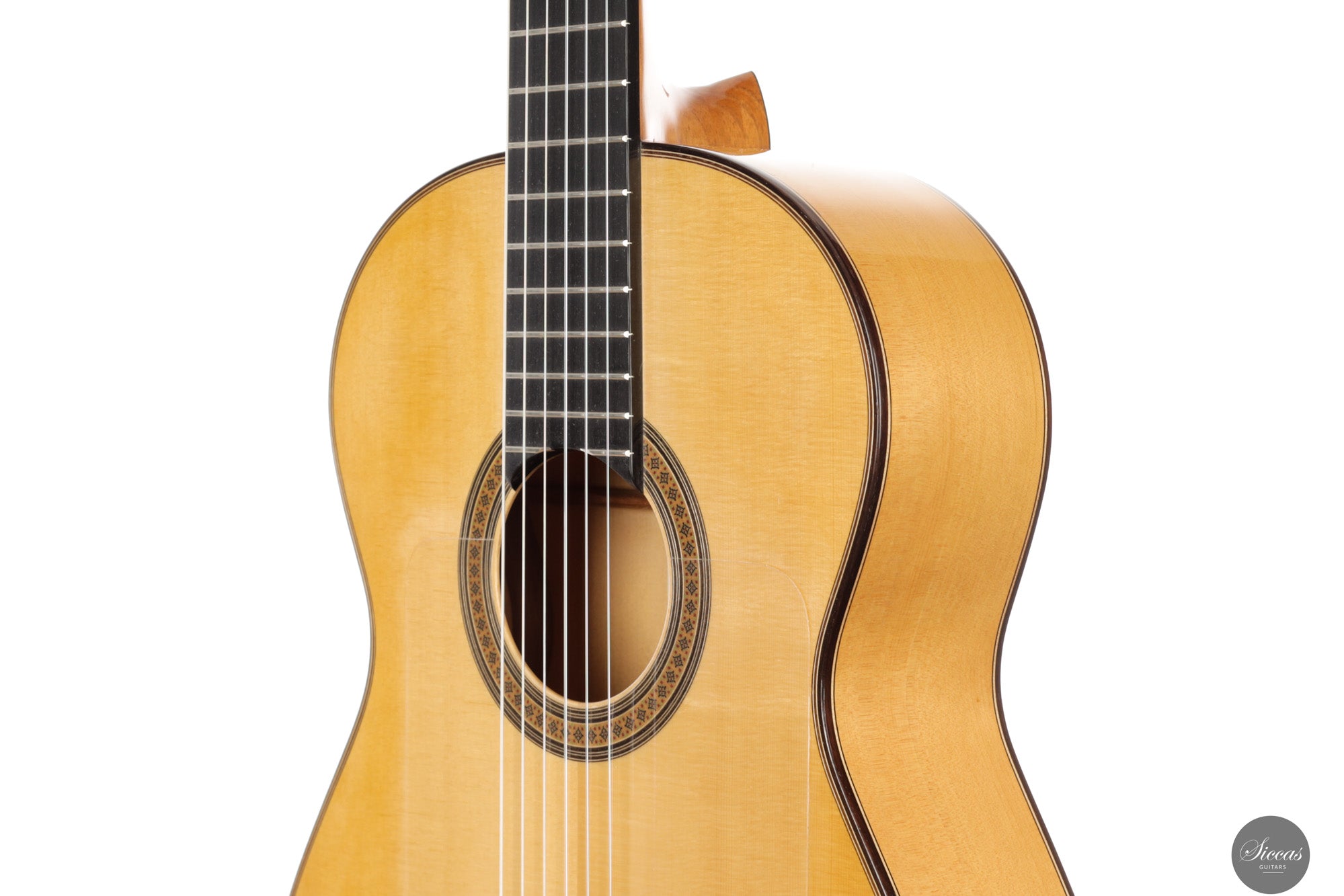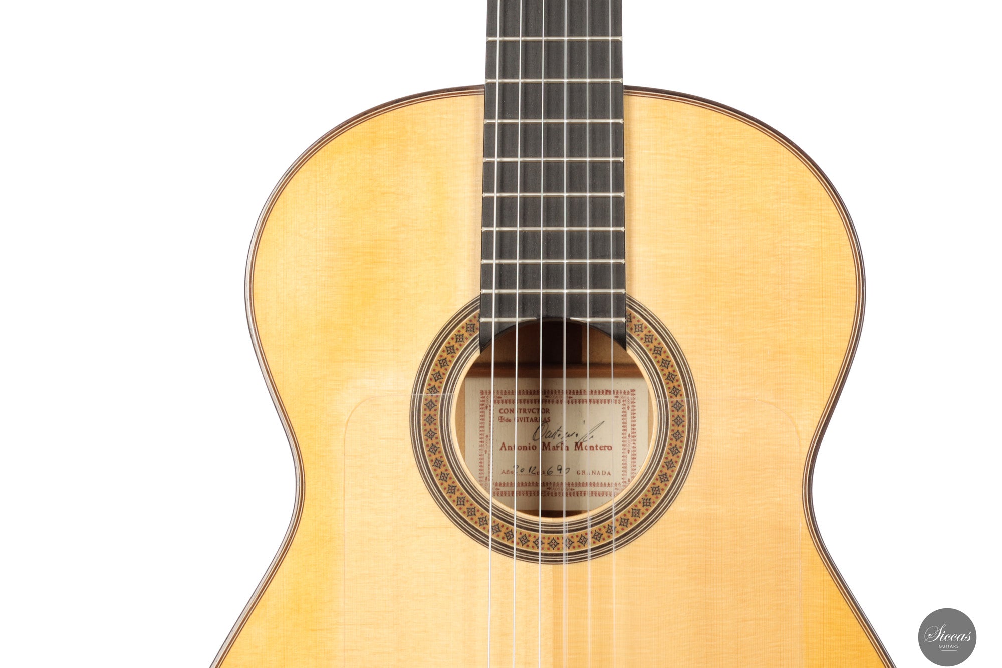 Diese 2012 gebaute Gitarre von Antonio Marín Montero verbindet Elemente der klassischen und der Flamenco-Tradition. Zwar als Flamenca Blanca konzipiert, zeichnet sie sich durch eine ungewöhnlich lyrische, runde Klangsprache aus. Die Fichtendecke und der Zypressenkorpus sorgen für eine schnelle Ansprache und ein trockenes, präzises Klangbild, das dennoch eine weiche Wärme und ein anhaltendes Ausschwingen aufweist – Eigenschaften, die eher klassischen Instrumenten zugeordnet werden. Diese doppelte Klangästhetik ermöglicht es der Gitarre, sich überzeugend in beiden Repertoires zu bewegen. Die Register sind flüssig miteinander verbunden, der Mittenbereich besonders geschmeidig, der Bass klar und fokussiert. Die leicht abgerundete Ansprache und die gute Tragfähigkeit verleihen der Gitarre eine klangliche Tiefe, die in Hybridmodellen selten zu finden ist.