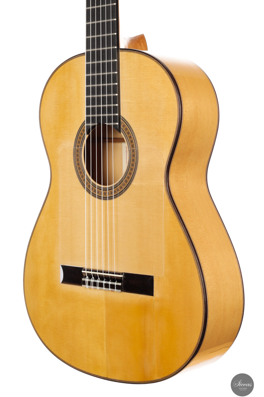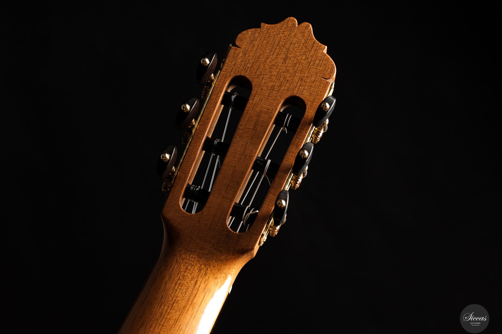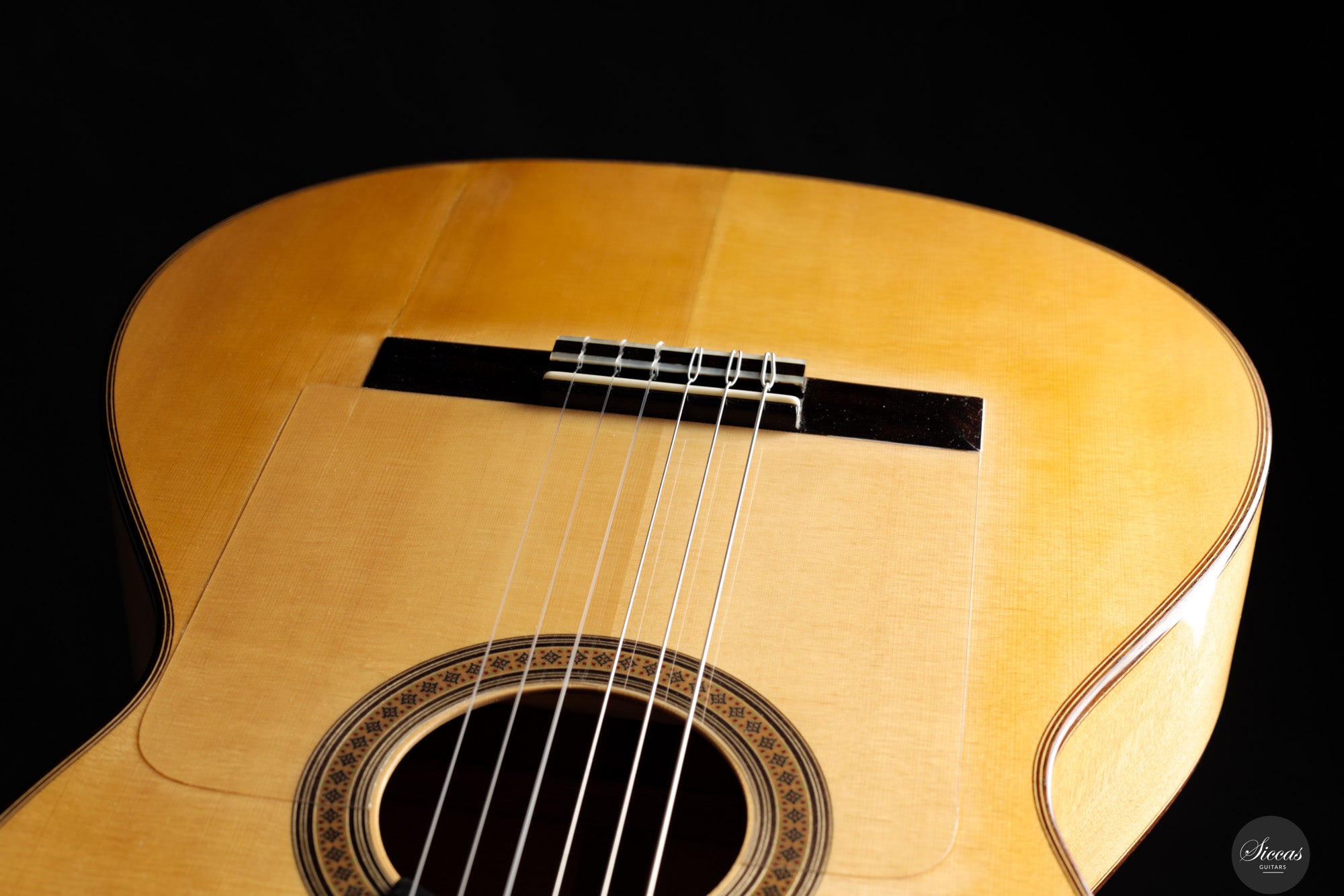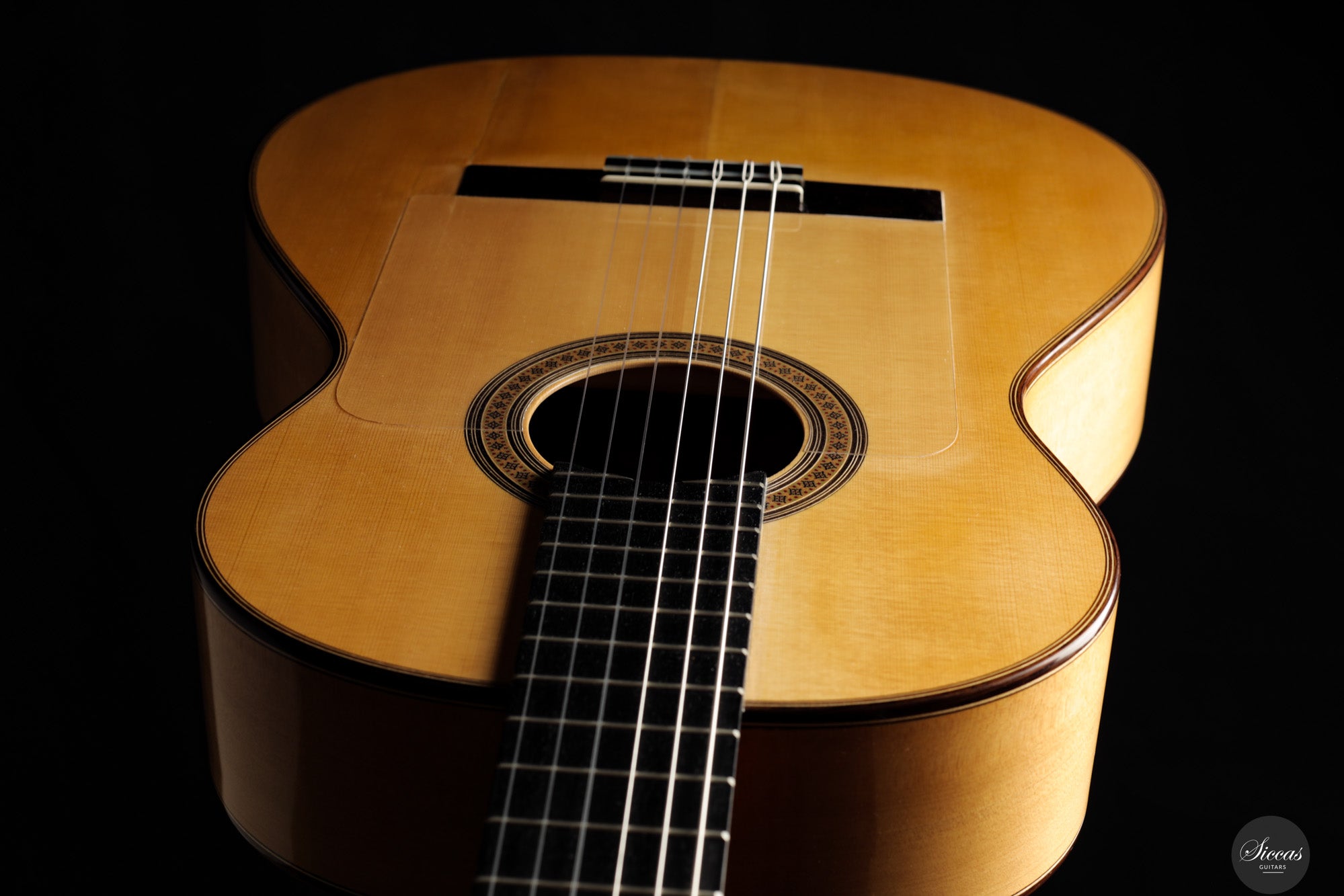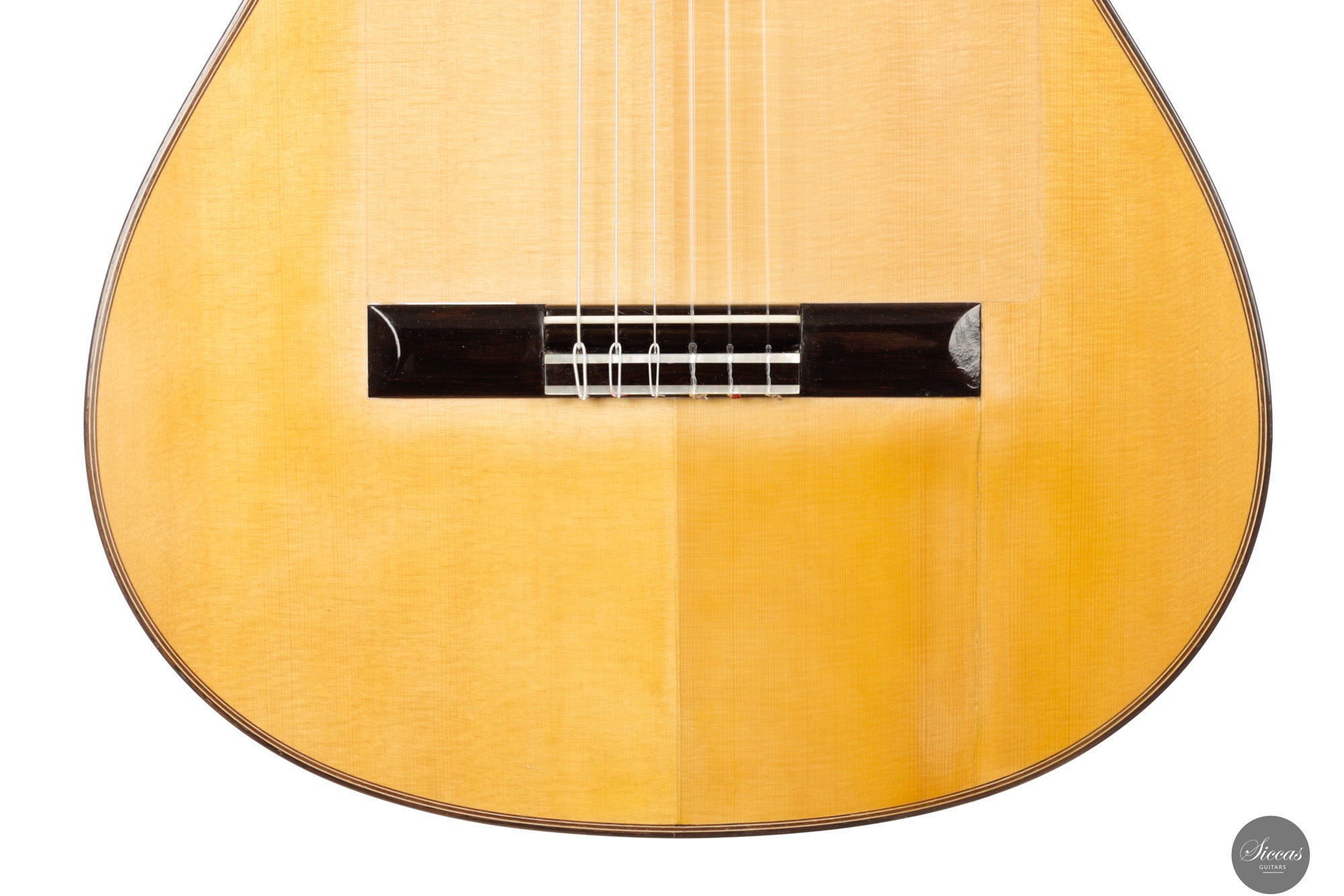 Diese 2012 gebaute Gitarre von Antonio Marín Montero verbindet Elemente der klassischen und der Flamenco-Tradition. Zwar als Flamenca Blanca konzipiert, zeichnet sie sich durch eine ungewöhnlich lyrische, runde Klangsprache aus. Die Fichtendecke und der Zypressenkorpus sorgen für eine schnelle Ansprache und ein trockenes, präzises Klangbild, das dennoch eine weiche Wärme und ein anhaltendes Ausschwingen aufweist – Eigenschaften, die eher klassischen Instrumenten zugeordnet werden. Diese doppelte Klangästhetik ermöglicht es der Gitarre, sich überzeugend in beiden Repertoires zu bewegen. Die Register sind flüssig miteinander verbunden, der Mittenbereich besonders geschmeidig, der Bass klar und fokussiert. Die leicht abgerundete Ansprache und die gute Tragfähigkeit verleihen der Gitarre eine klangliche Tiefe, die in Hybridmodellen selten zu finden ist.