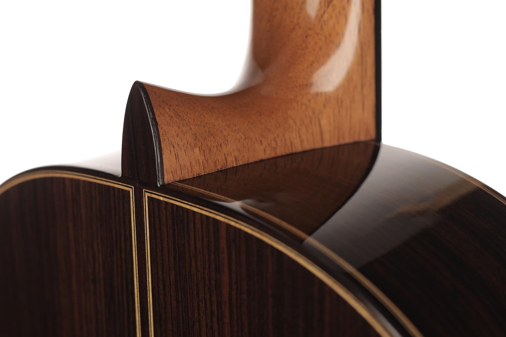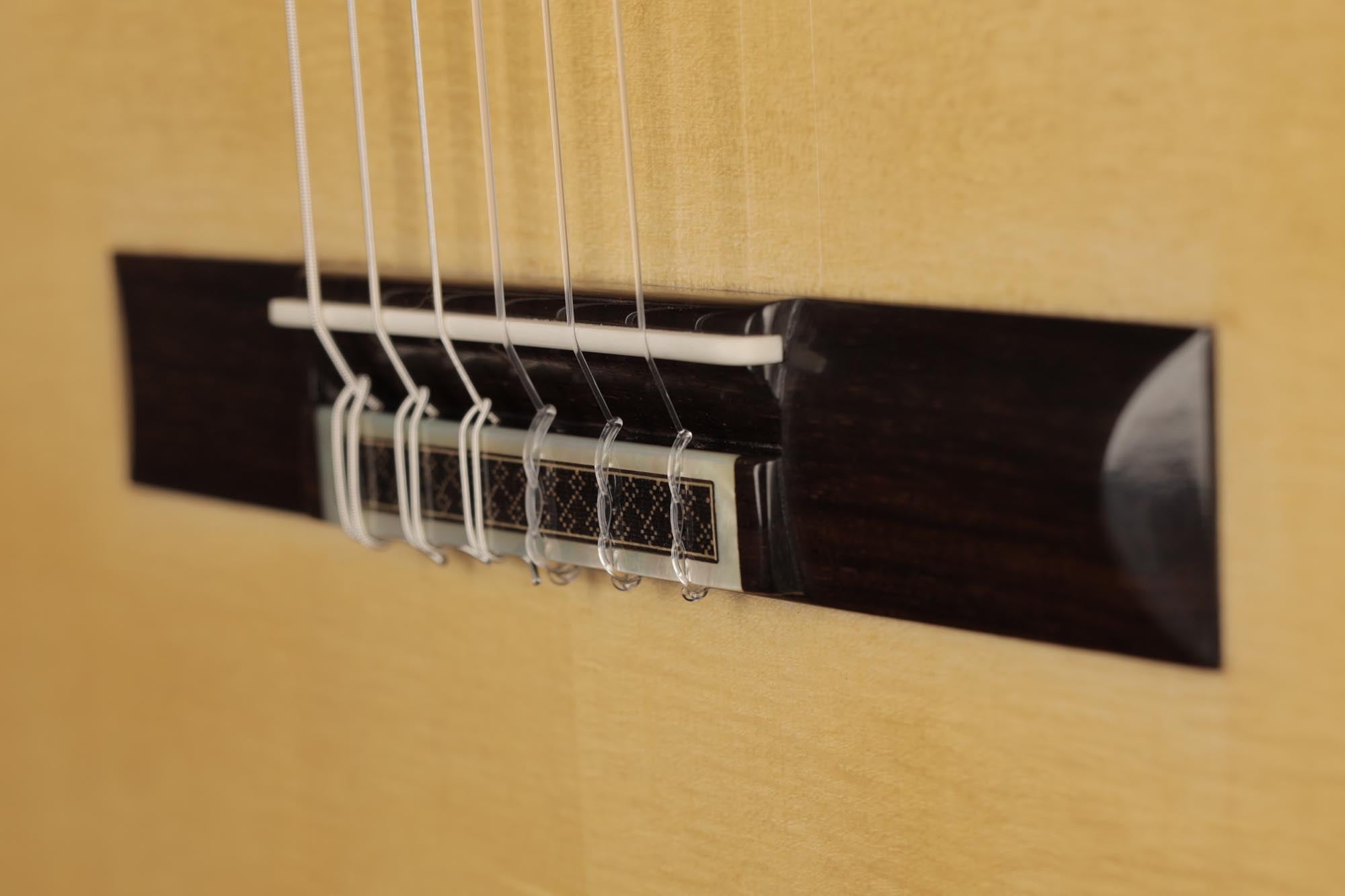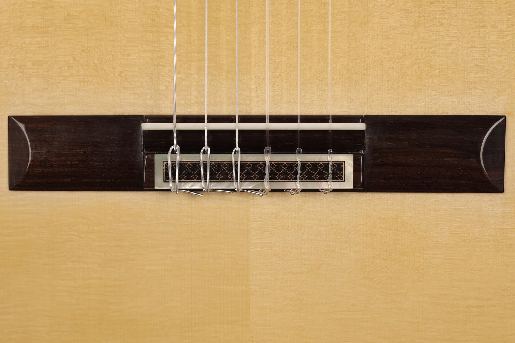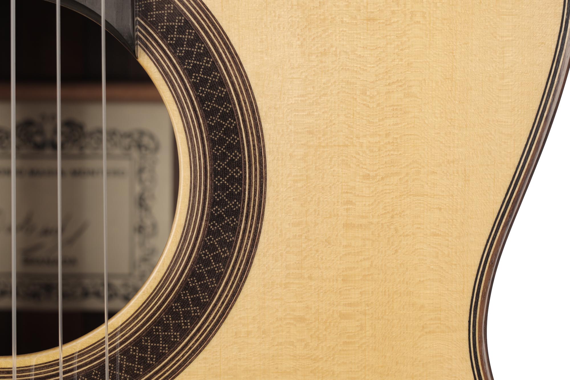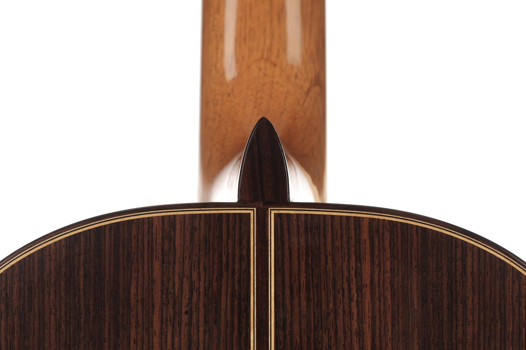 In fact, this one centimeter difference makes left-hand playing more comfortable and enables one to approach the repertoire of composers such as Agustin Barrios Mangoré, Fernando Sor, Napoleon Coste, etc. with great ease. On the other hand, this guitar is an excellent concert instrument with a spruce top and Indian rosewood back and sides. The bracing is made on the model of Robert Bouchet's, with a transversal bar added to the fan bracing, called "barre d'âme".