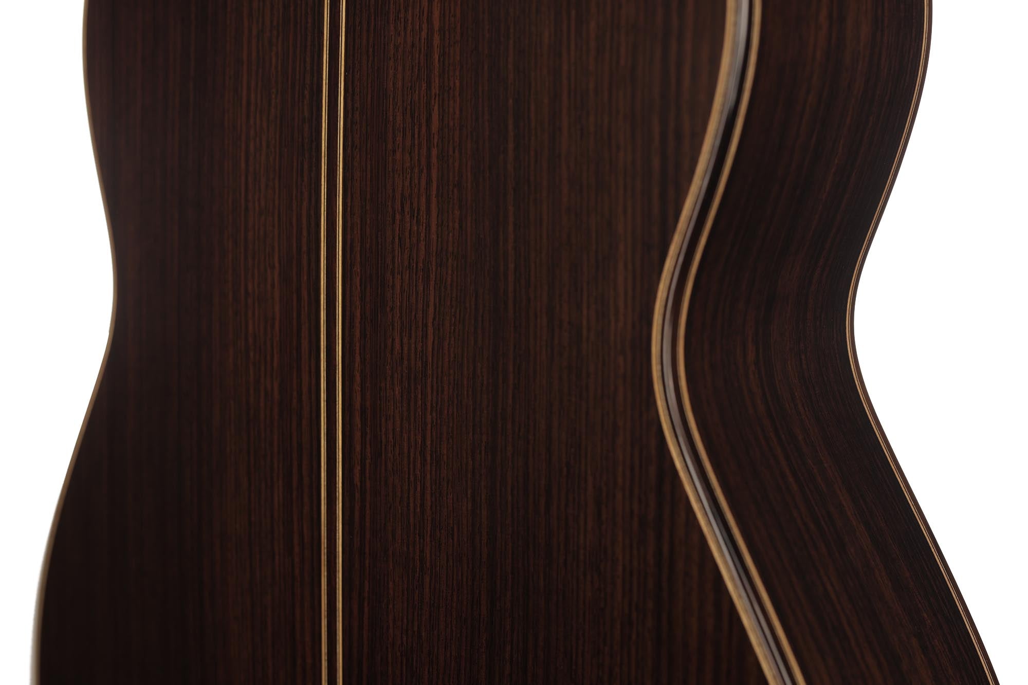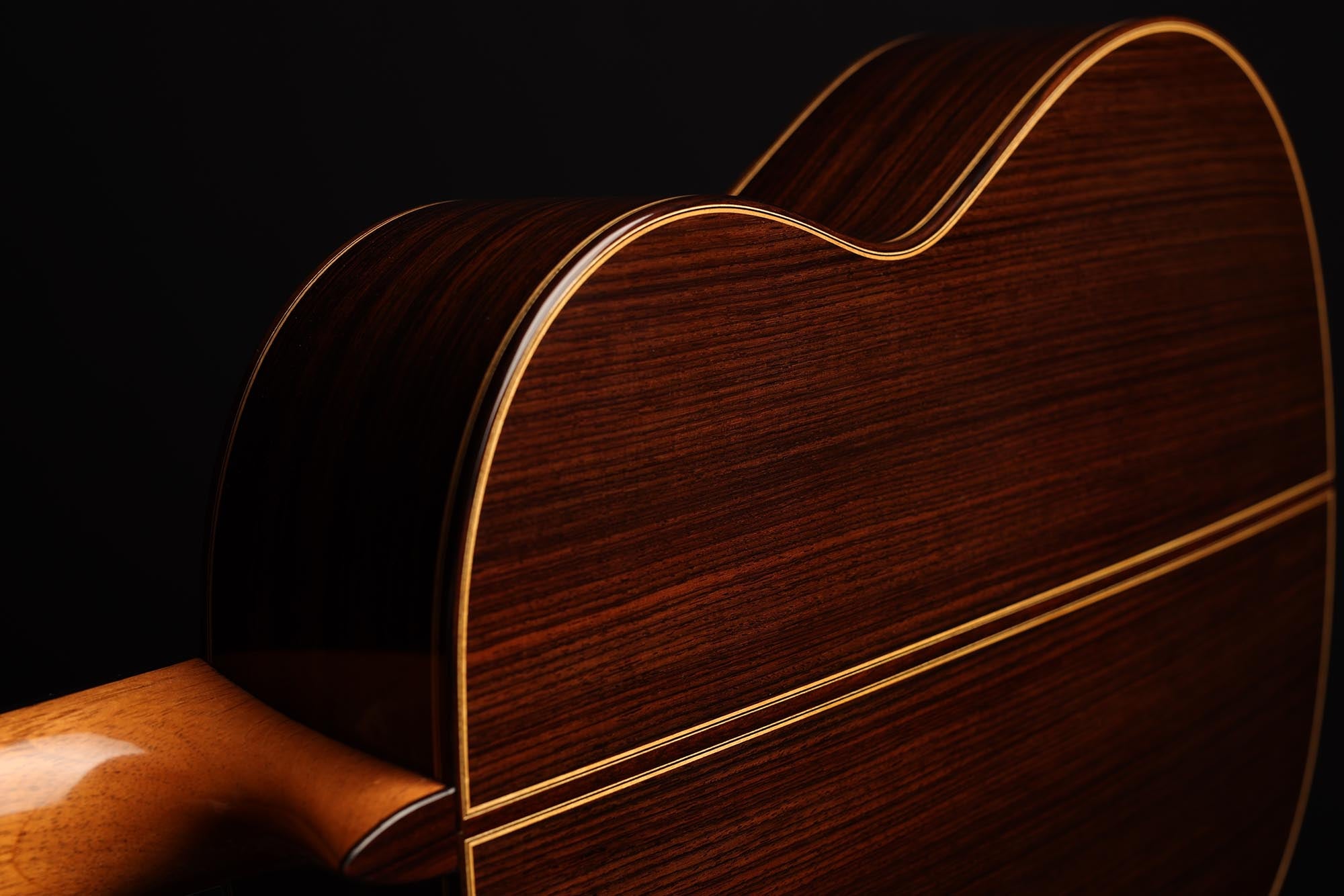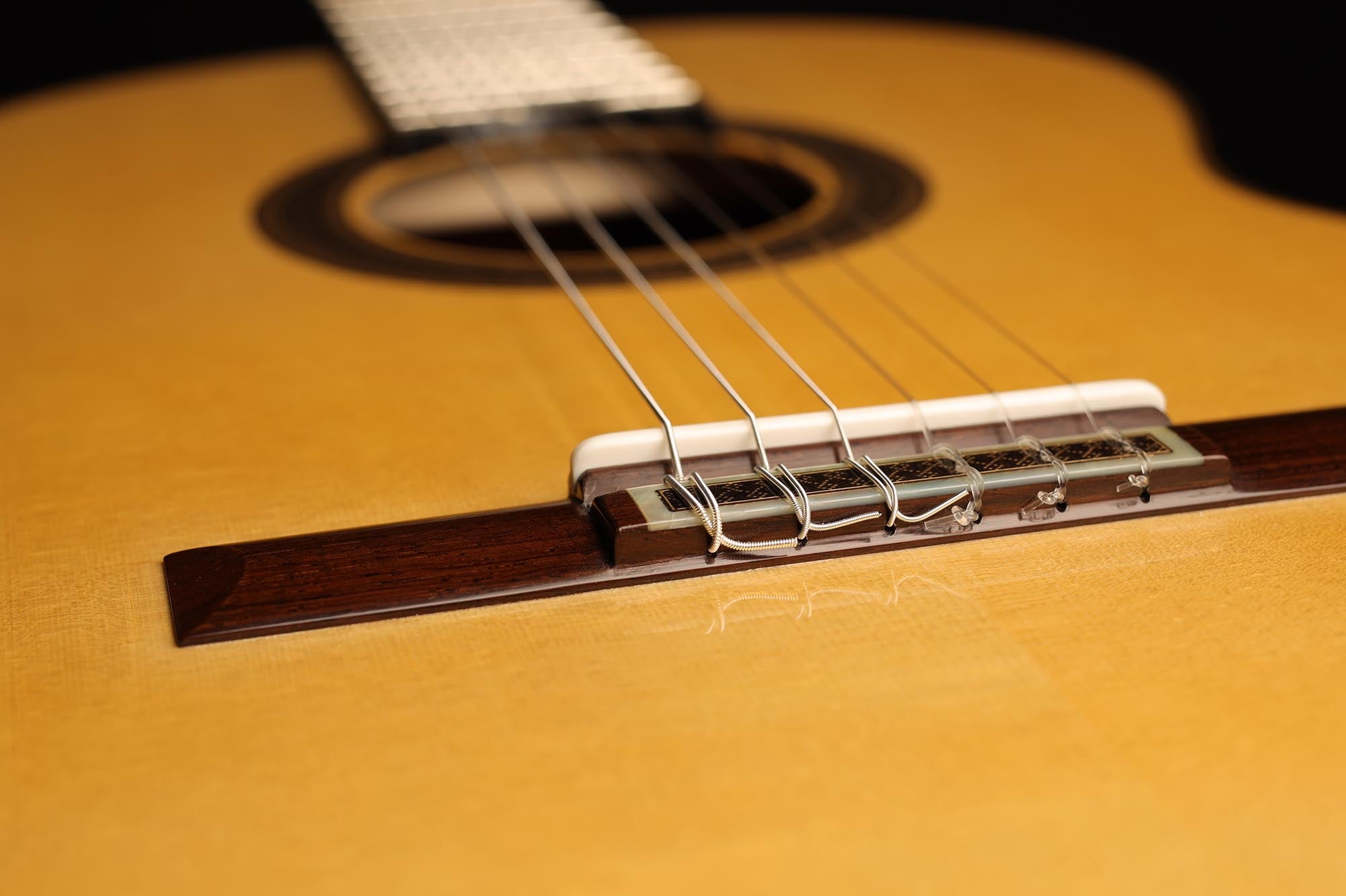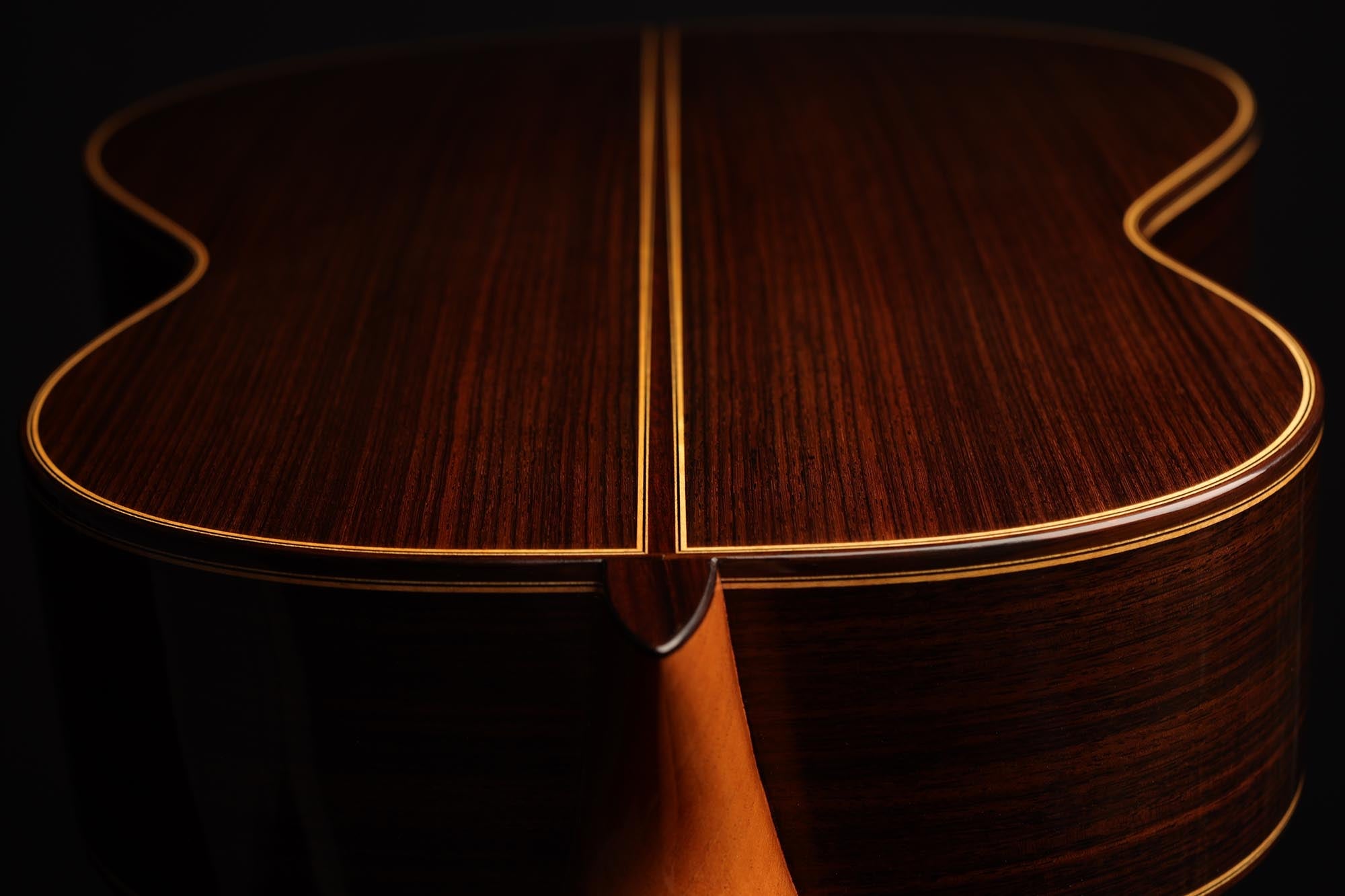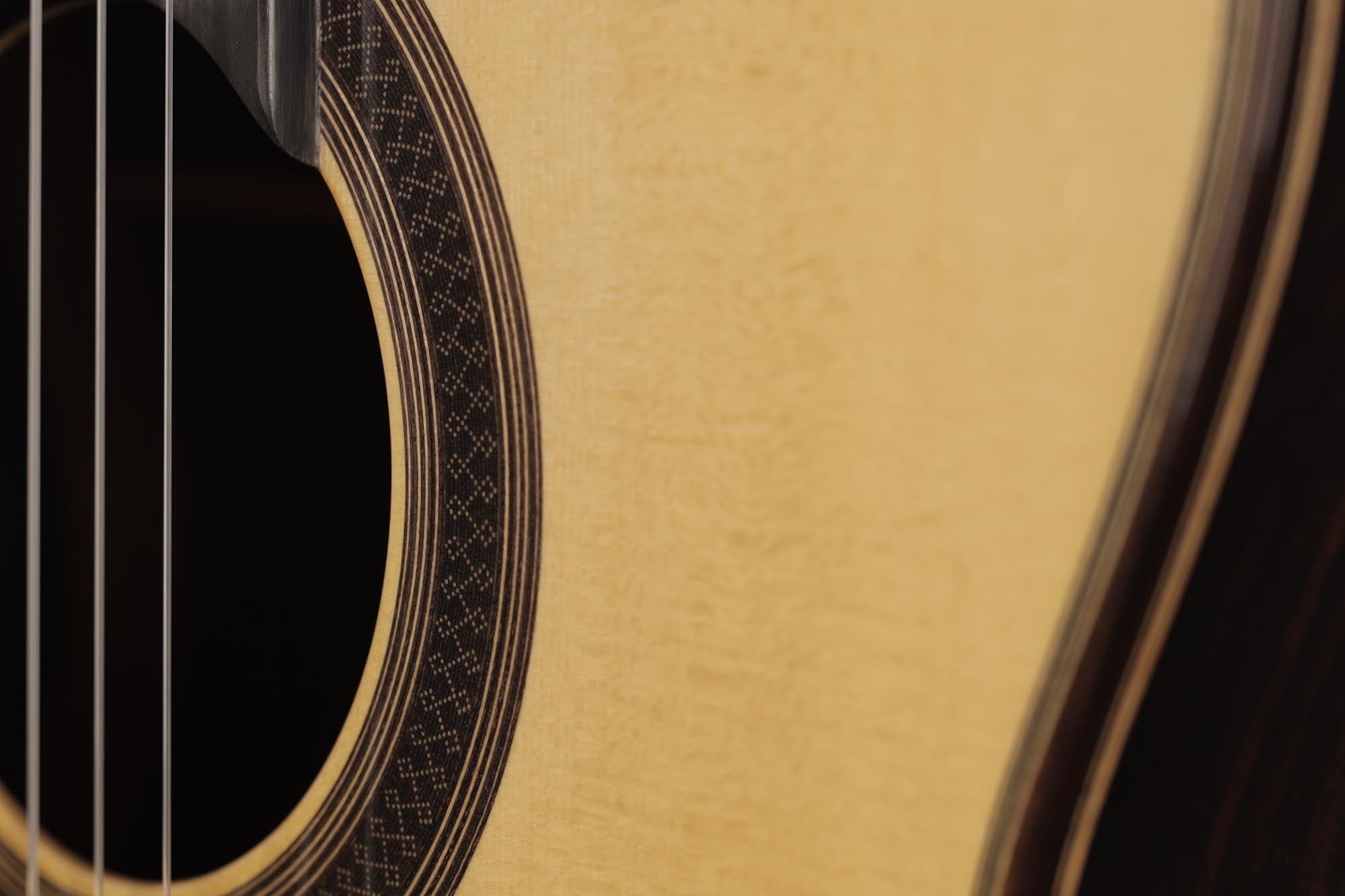 In fact, this one centimeter difference makes left-hand playing more comfortable and enables one to approach the repertoire of composers such as Agustin Barrios Mangoré, Fernando Sor, Napoleon Coste, etc. with great ease. On the other hand, this guitar is an excellent concert instrument with a spruce top and Indian rosewood back and sides. The bracing is made on the model of Robert Bouchet's, with a transversal bar added to the fan bracing, called "barre d'âme".