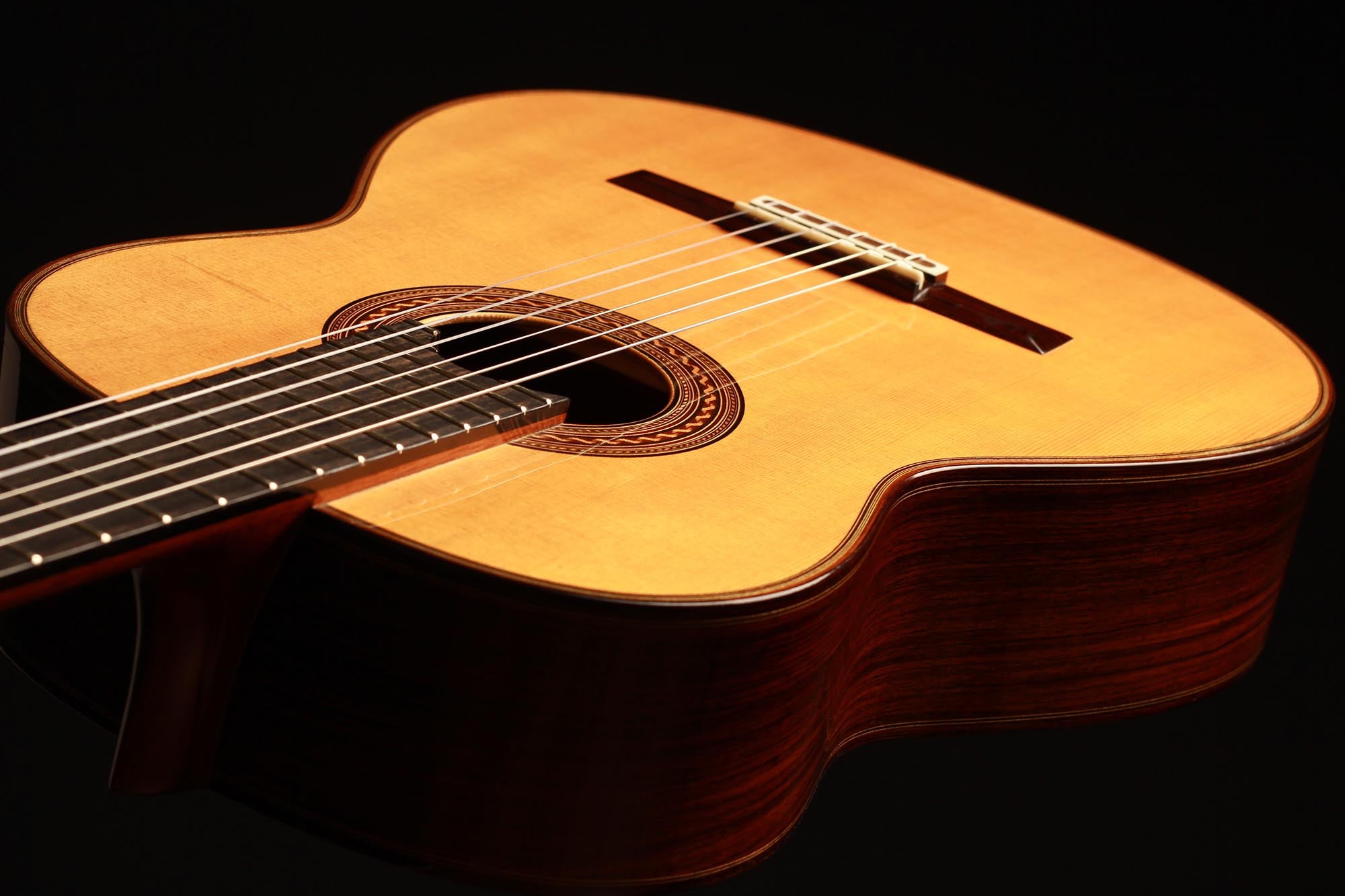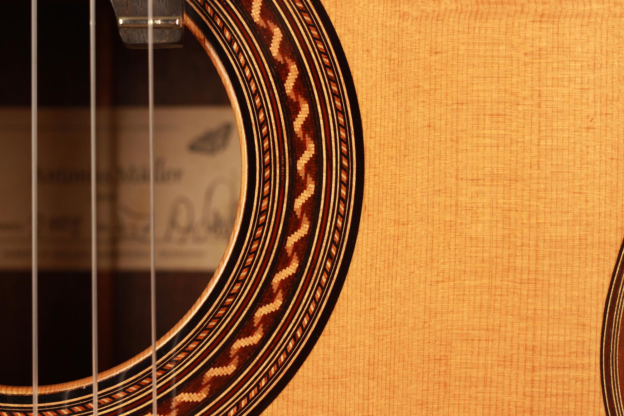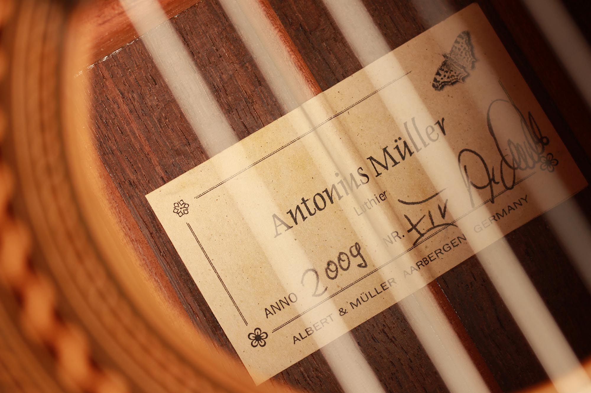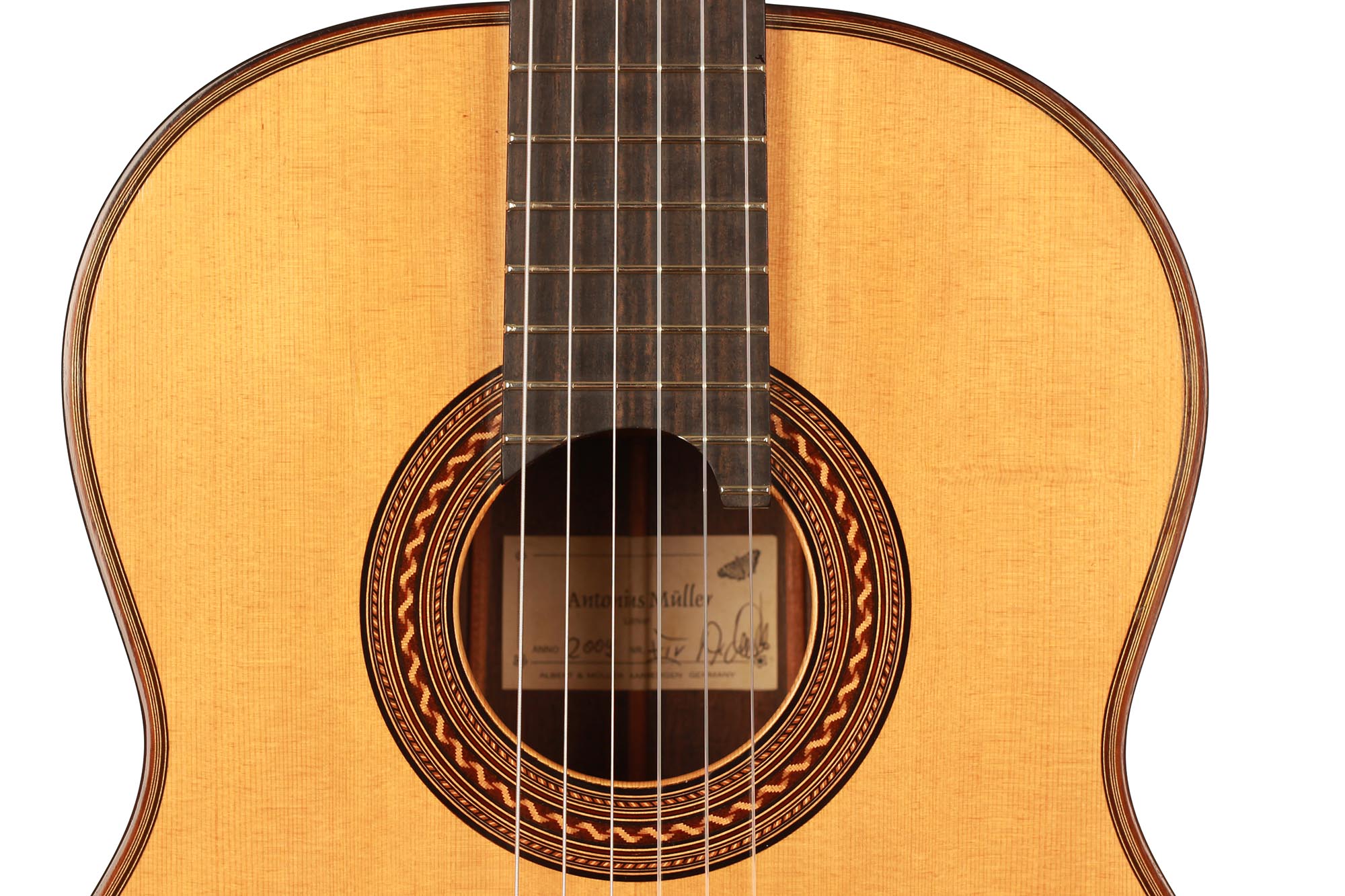 This fantastic 2009 spruce double top guitar is in very good condition. It has a perfectly repaired crack on the top, near the fingerboard, of about 1.5 cm. The rest of the guitar is intact, and only has a few superficial scratches on it. Spruce guitars built by Antonius Müller are quite rare and we must say that this one just sounds incredible. It is astonishing how little effort one needs to put into the right hand when playing this guitar, in order to produce a room-filling tone, so that the player has the feeling to be completely surrounded by the sound of this instrument. The trebles are clear, and the separation of the voices is perfect. In addition, the balance between bass and treble is also consistently even. A really wonderful and inspiring instrument that brings a lot of satisfaction and supports the player in every respect.