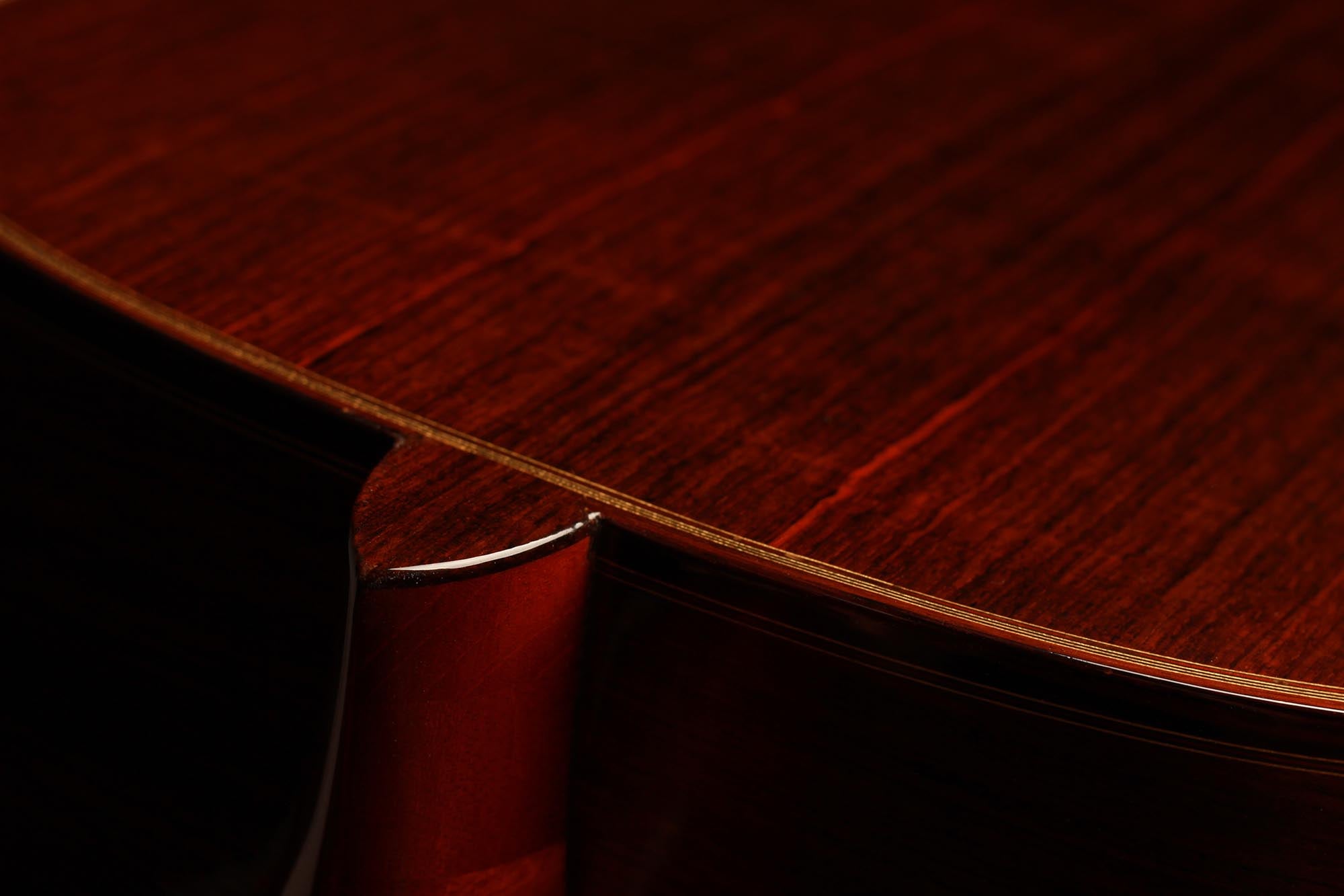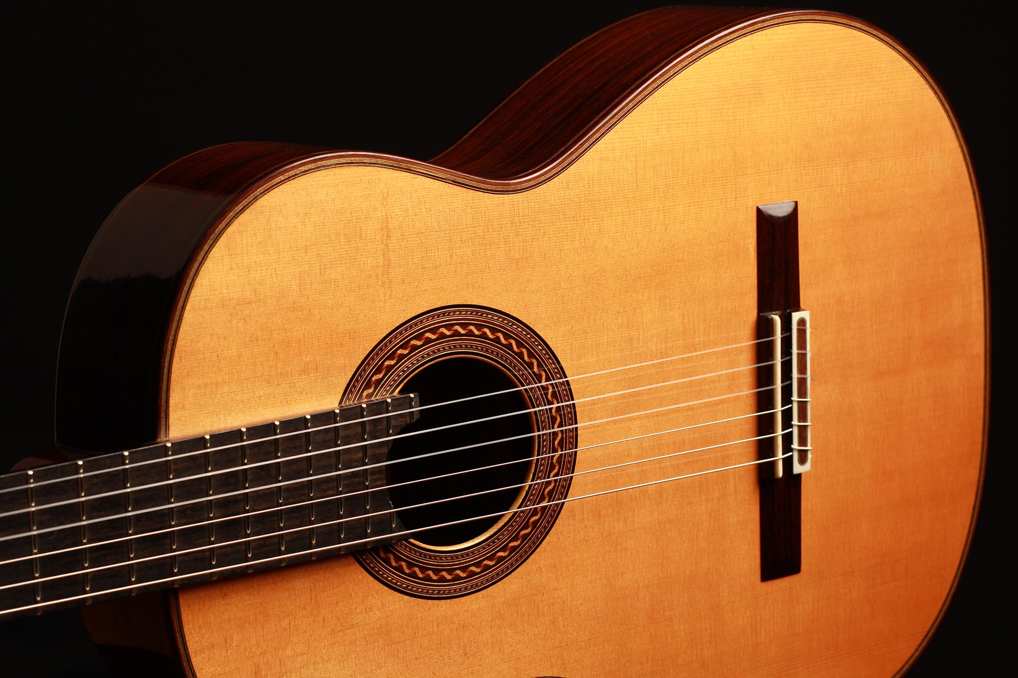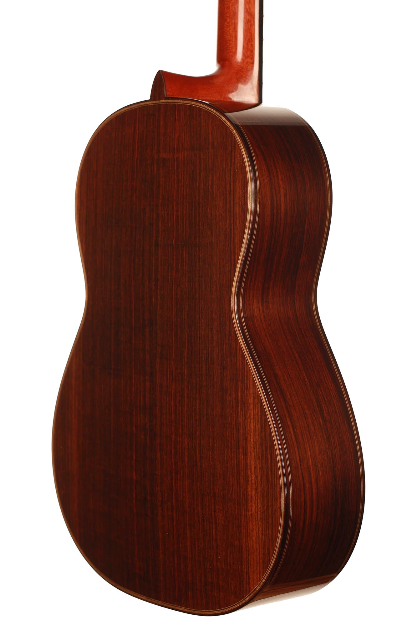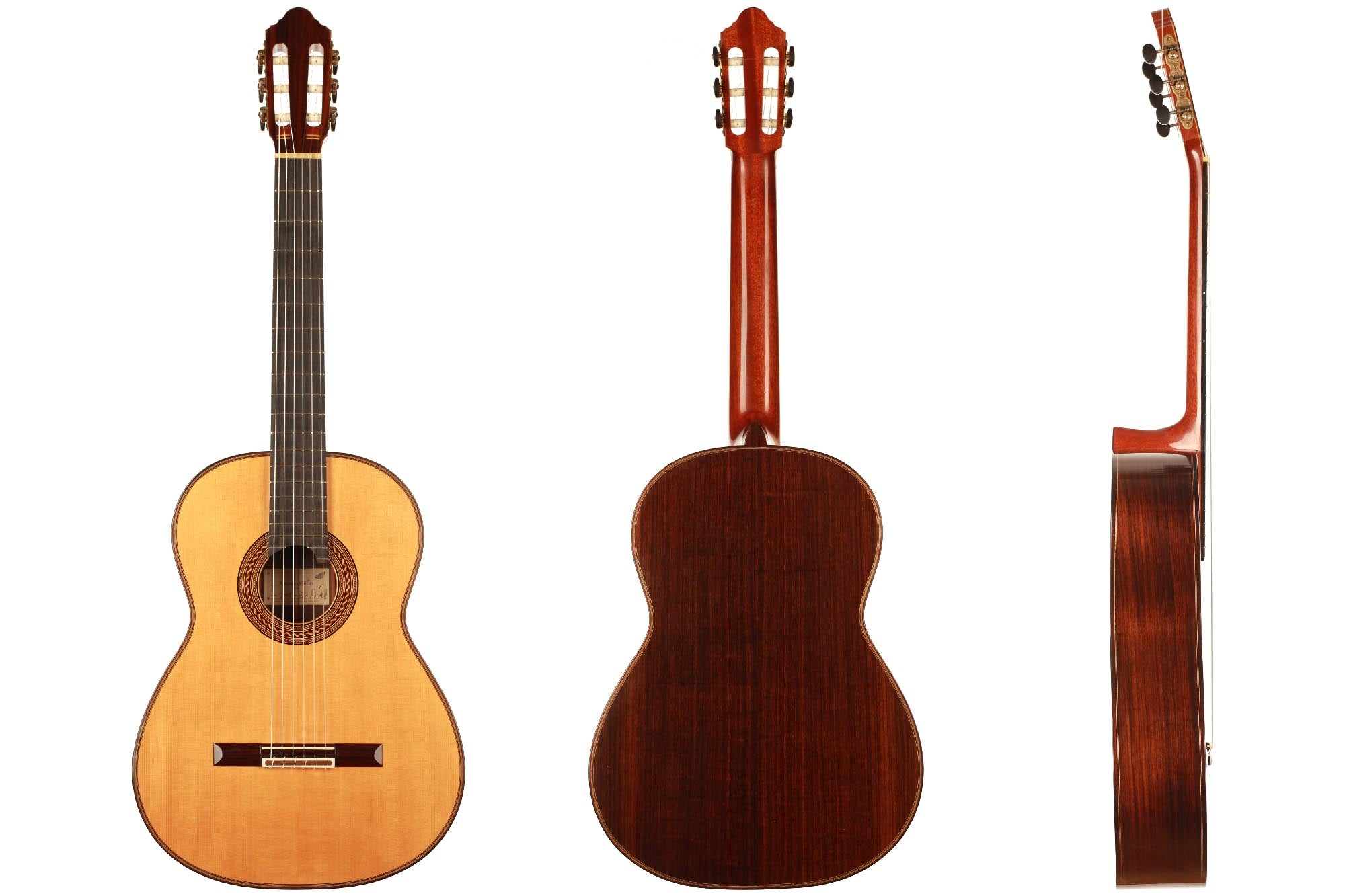 This fantastic 2009 spruce double top guitar is in very good condition. It has a perfectly repaired crack on the top, near the fingerboard, of about 1.5 cm. The rest of the guitar is intact, and only has a few superficial scratches on it. Spruce guitars built by Antonius Müller are quite rare and we must say that this one just sounds incredible. It is astonishing how little effort one needs to put into the right hand when playing this guitar, in order to produce a room-filling tone, so that the player has the feeling to be completely surrounded by the sound of this instrument. The trebles are clear, and the separation of the voices is perfect. In addition, the balance between bass and treble is also consistently even. A really wonderful and inspiring instrument that brings a lot of satisfaction and supports the player in every respect.
