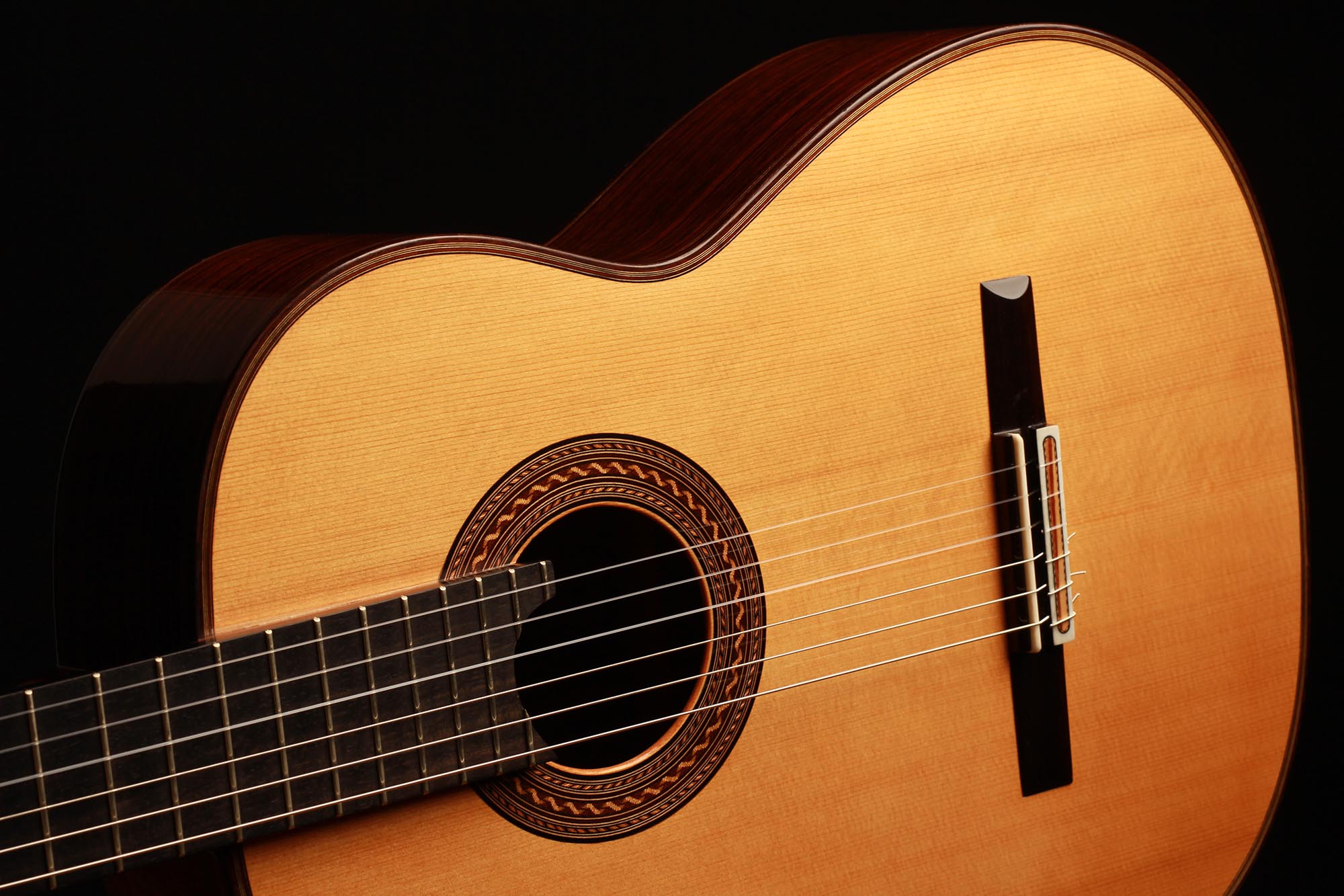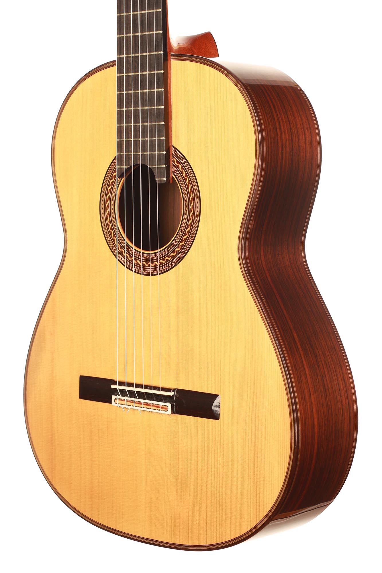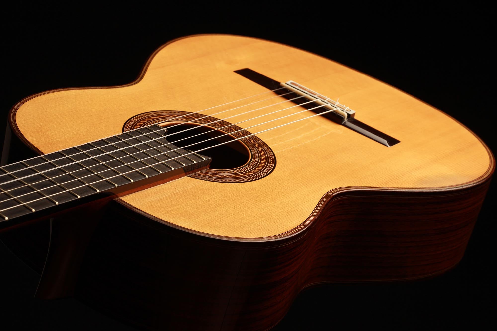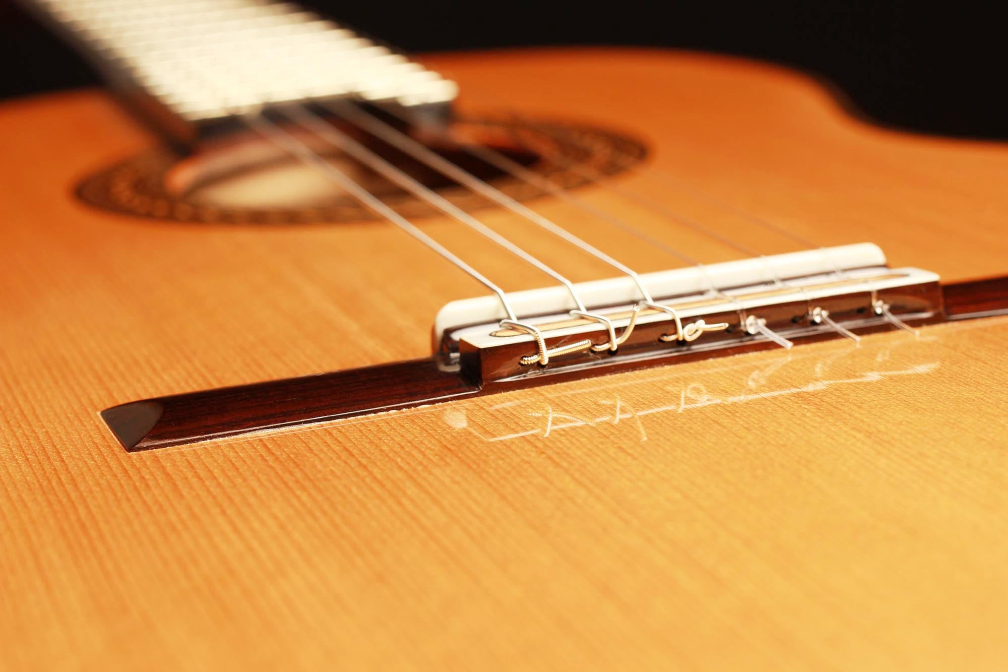 Diese fantastische 2012 Fichte Doubletop Gitarre ist in einem fantastischen Zustand. Sie ist frei von Rissen und der Lack ist unangetastet. Fichtengitarren von Antonius Müller sind recht selten und wir müssen sagen, dass diese einfach unglaublich klingt. Es ist erstaunlich, wie wenig Kraft man beim Spielen dieser Gitarre in der rechten Hand einsetzten muss, um einen raumfüllenden Ton zu erzeugen, so dass der Spieler das Gefühl hat, vollständig vom Klang dieses Instruments umgeben zu sein. Die Höhen sind klar, und die Trennung ist perfekt. Darüber hinaus ist auch die Balance zwischen Bass und Höhen konstant gleichmäßig. Ein wirklich wunderbares und inspirierendes Instrument, das viel Freude bereitet und den Spieler in jeder Hinsicht unterstützt.