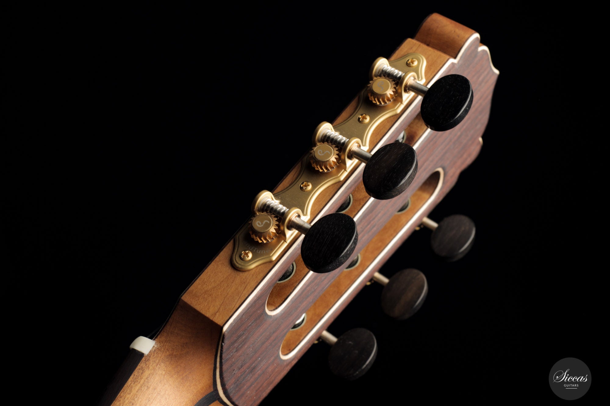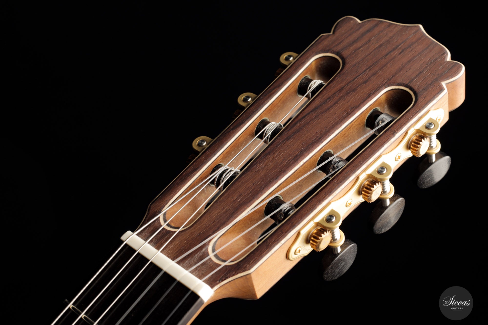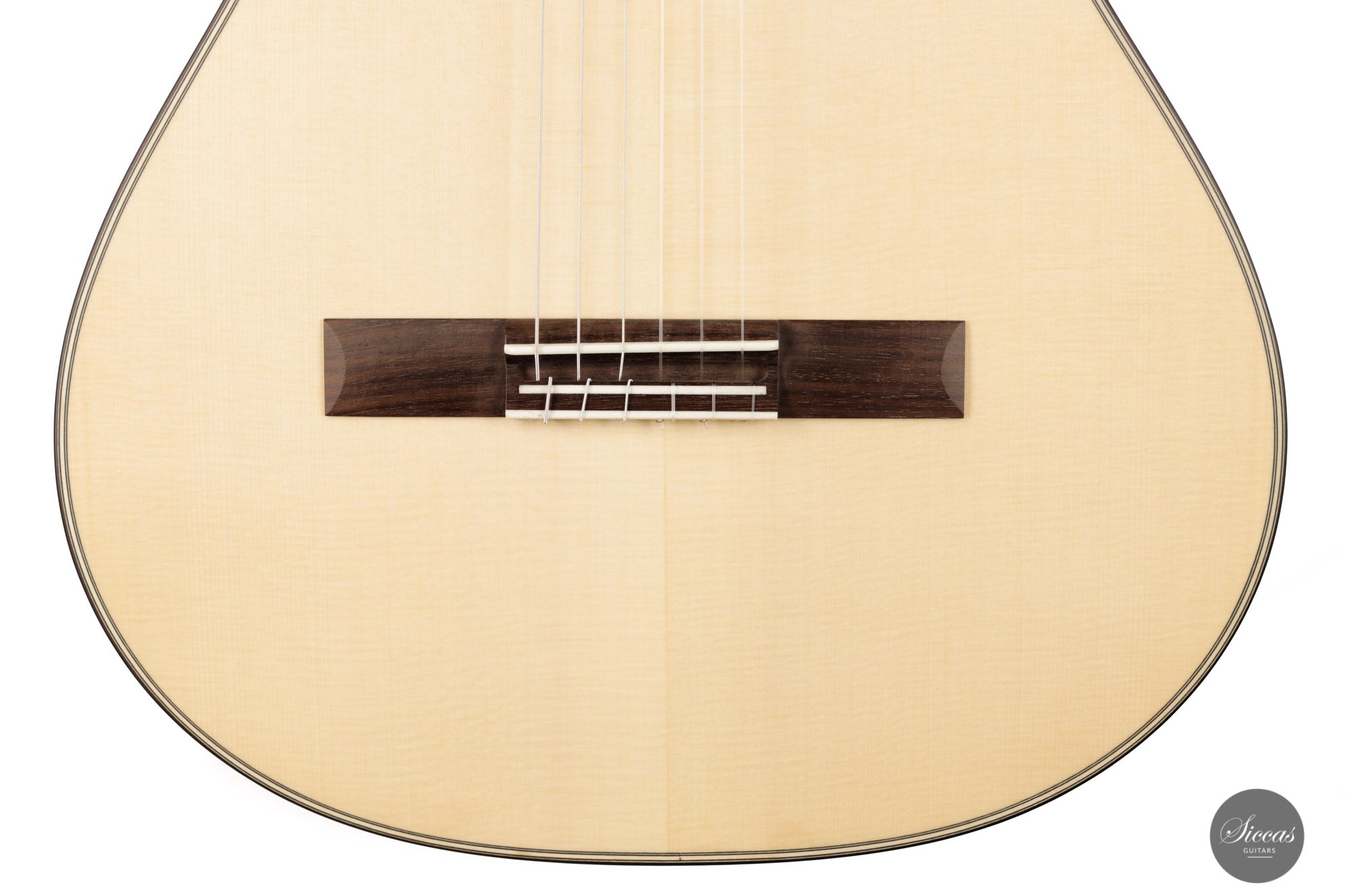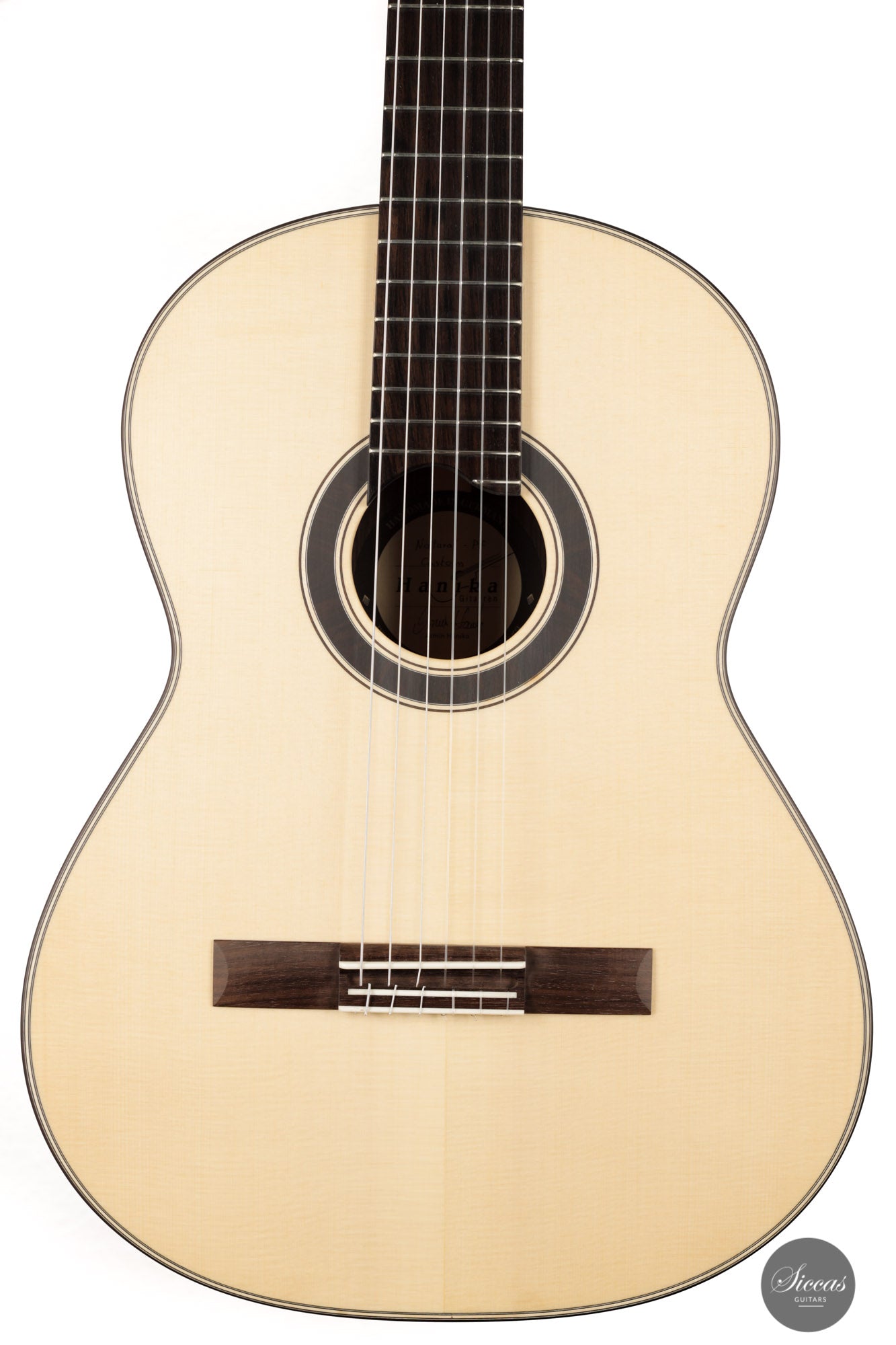 Diese "Natural PF Custom" Gitarre ist ein einzigartiges Instrument, das die Lücke zwischen der "Natural"-Linie und der "New Century"-Linie von Armin Hanika schließt. Sie wird in traditioneller Sieben-Fächer-Konstruktion mit einer Fichtendecke gebaut. Die Lackierung ist naturmatt mit offenen Poren, was die übliche Oberflächenbehandlung für Hanika-Gitarren dieser Linie ist. Allerdings hat diese Gitarre ein erhöhtes Griffbrett, was ein einzigartiges Merkmal für dieses Modell ist.