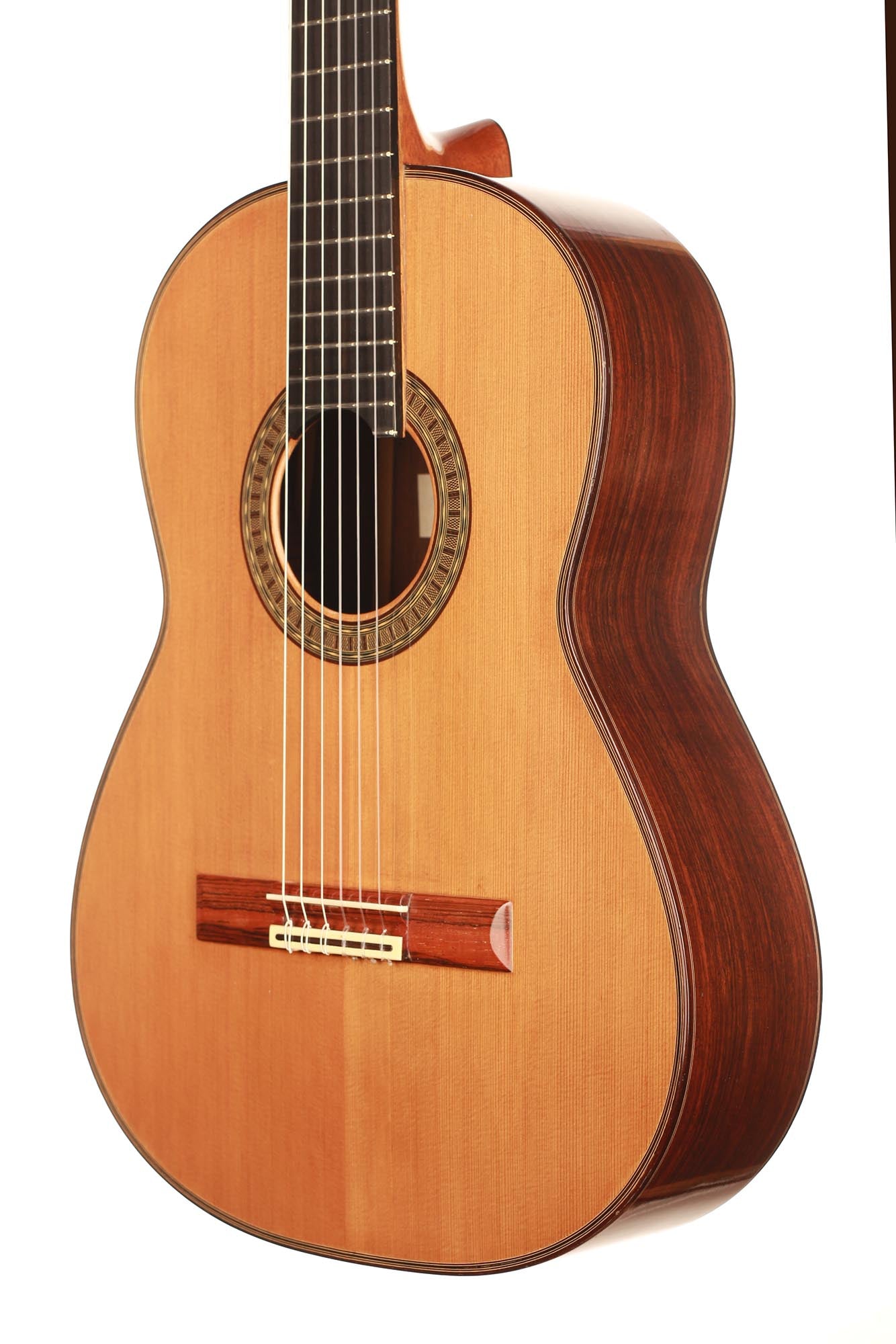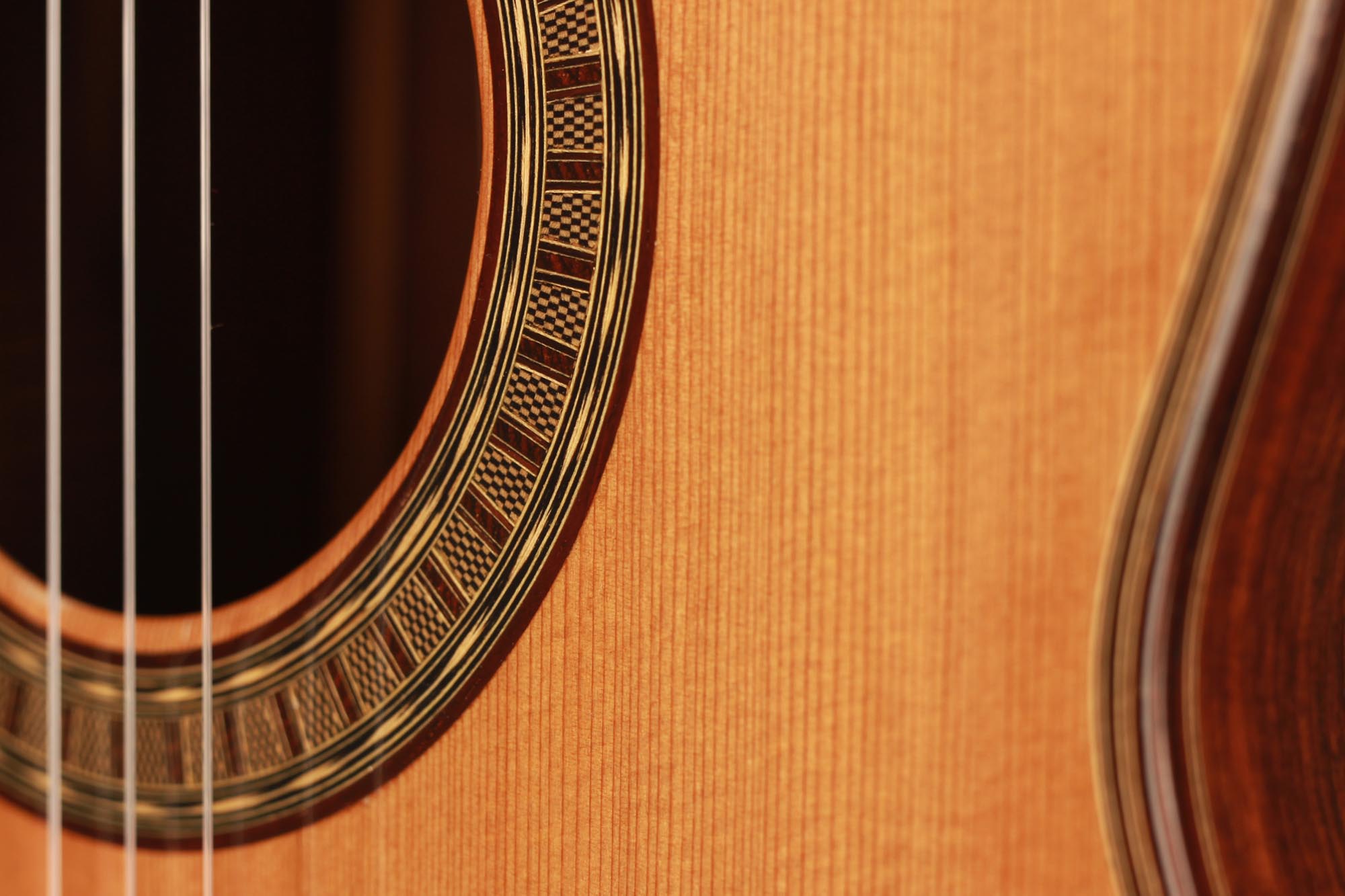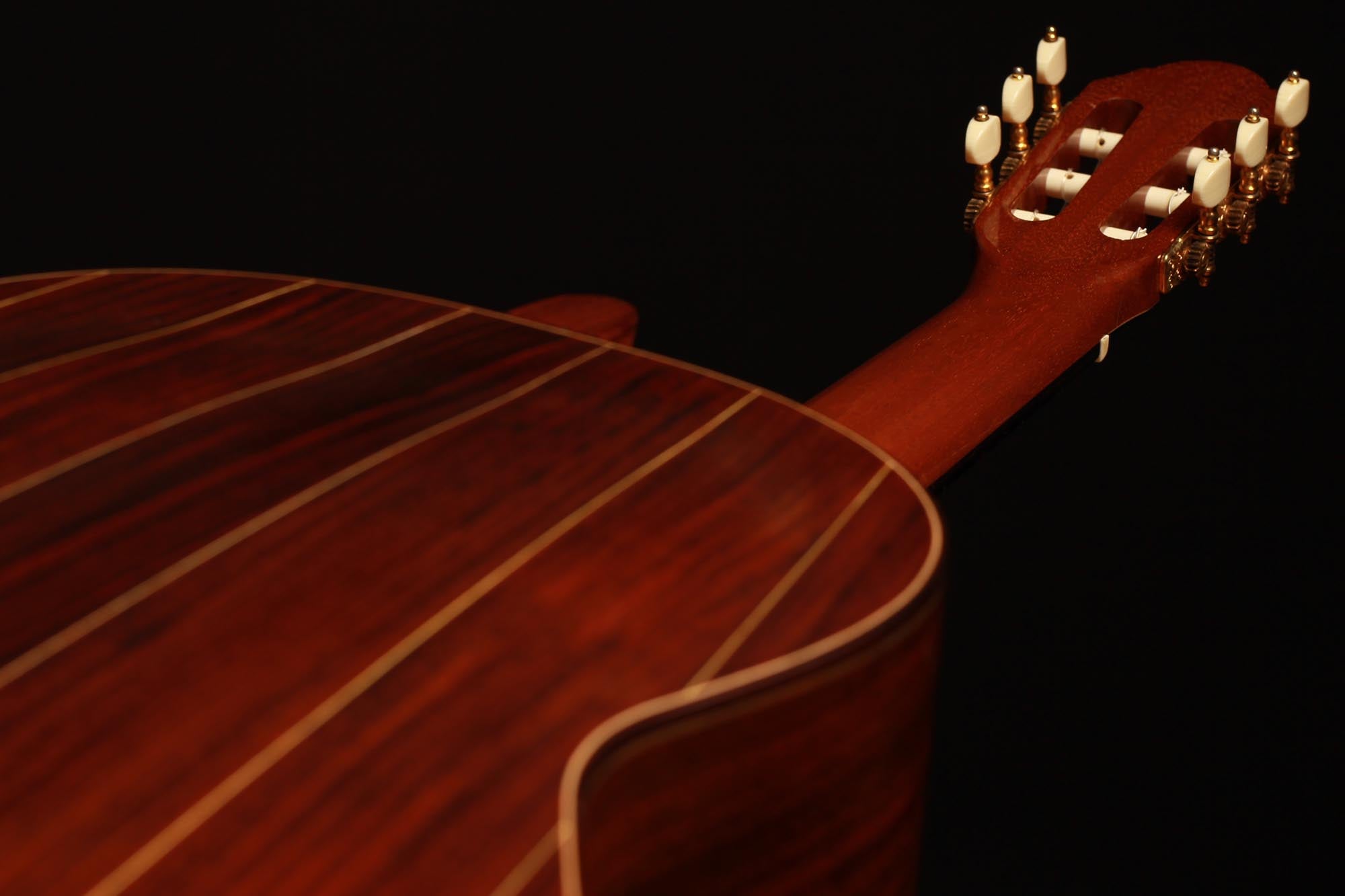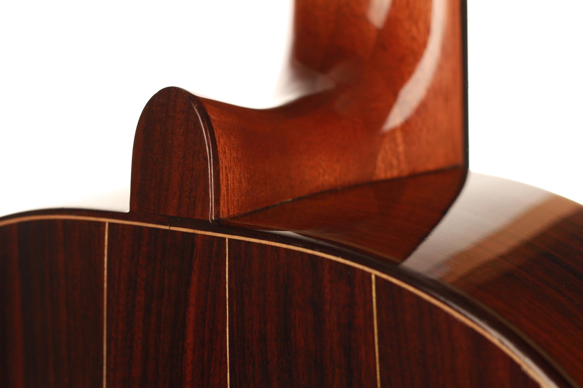 This very interesting 2005 concert model has a beautifully built seven-piece arched back in the style of a baroque guitar or a lute. This striking feature gives both a unique look to this instrument and provides some extra power and sustain. The separation of voices and the overall balance in this guitar are remarkable and the sound-character is rather nice and bright for a cedar top.