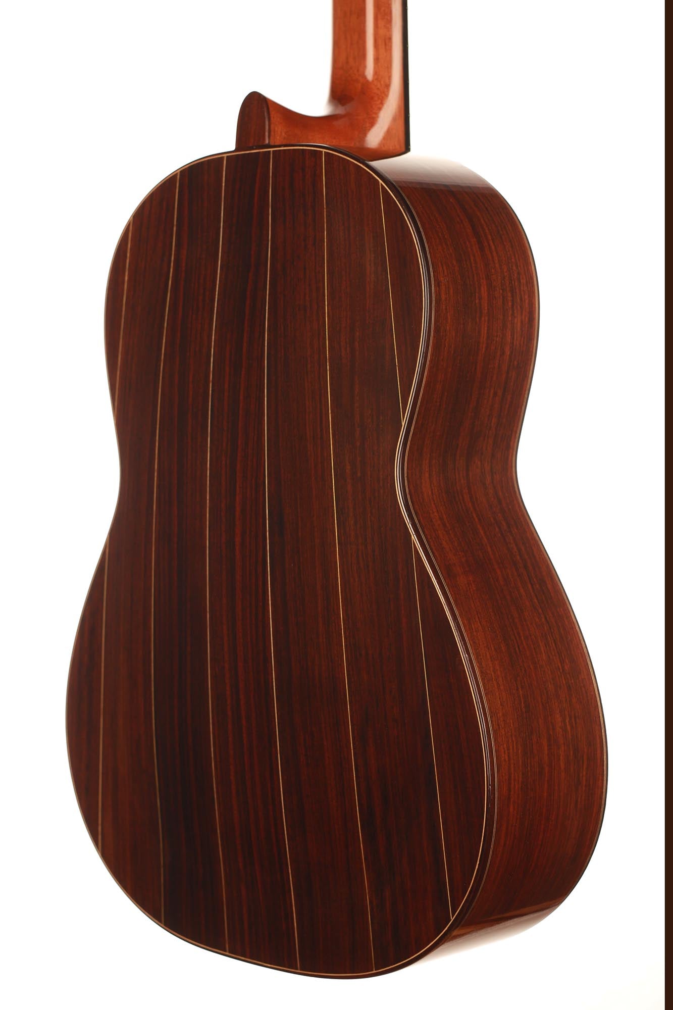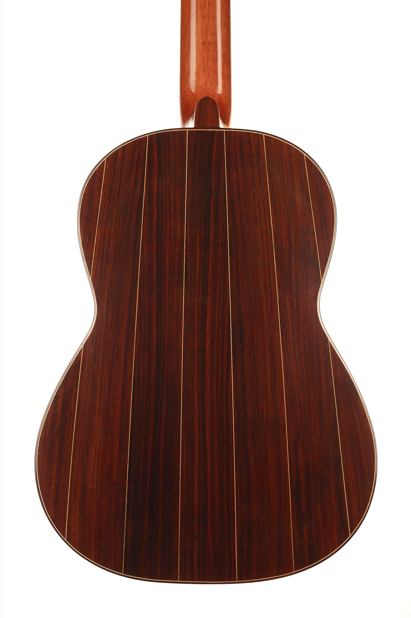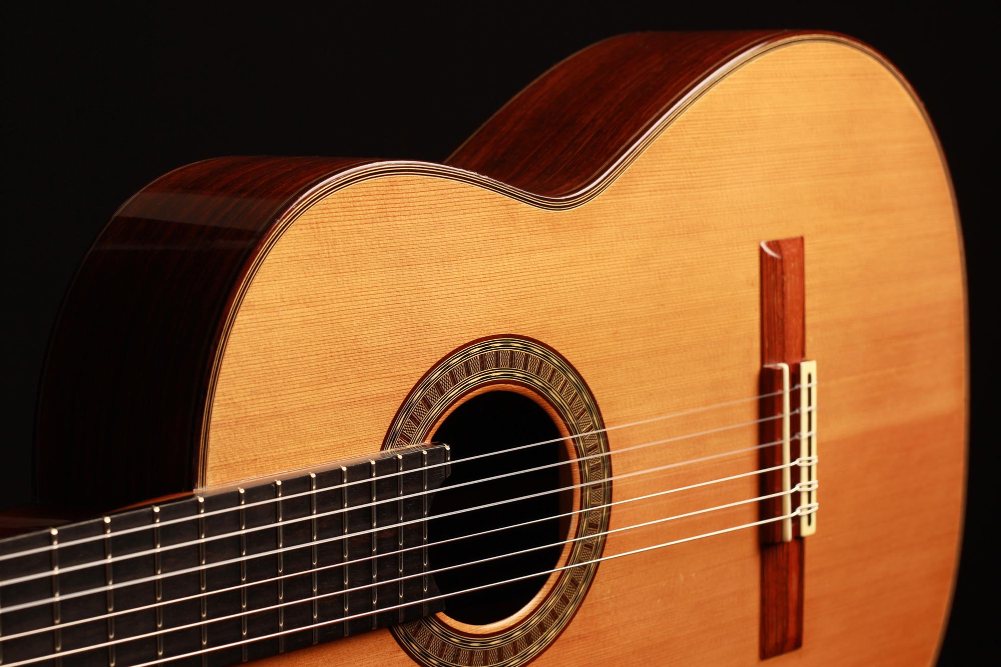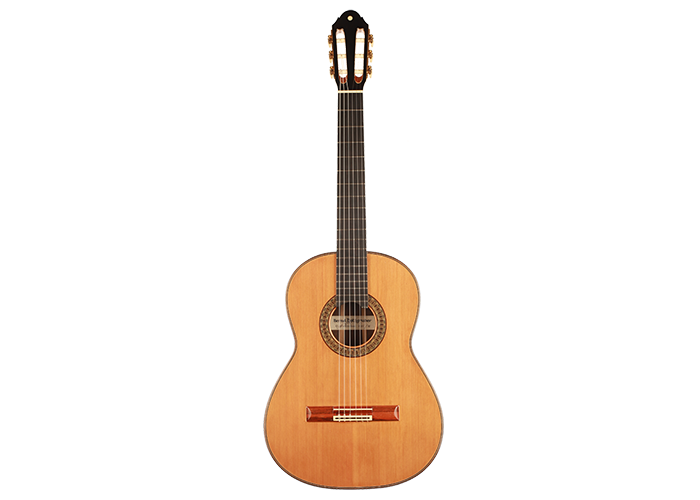 This very interesting 2005 concert model has a beautifully built seven-piece arched back in the style of a baroque guitar or a lute. This striking feature gives both a unique look to this instrument and provides some extra power and sustain. The separation of voices and the overall balance in this guitar are remarkable and the sound-character is rather nice and bright for a cedar top.
