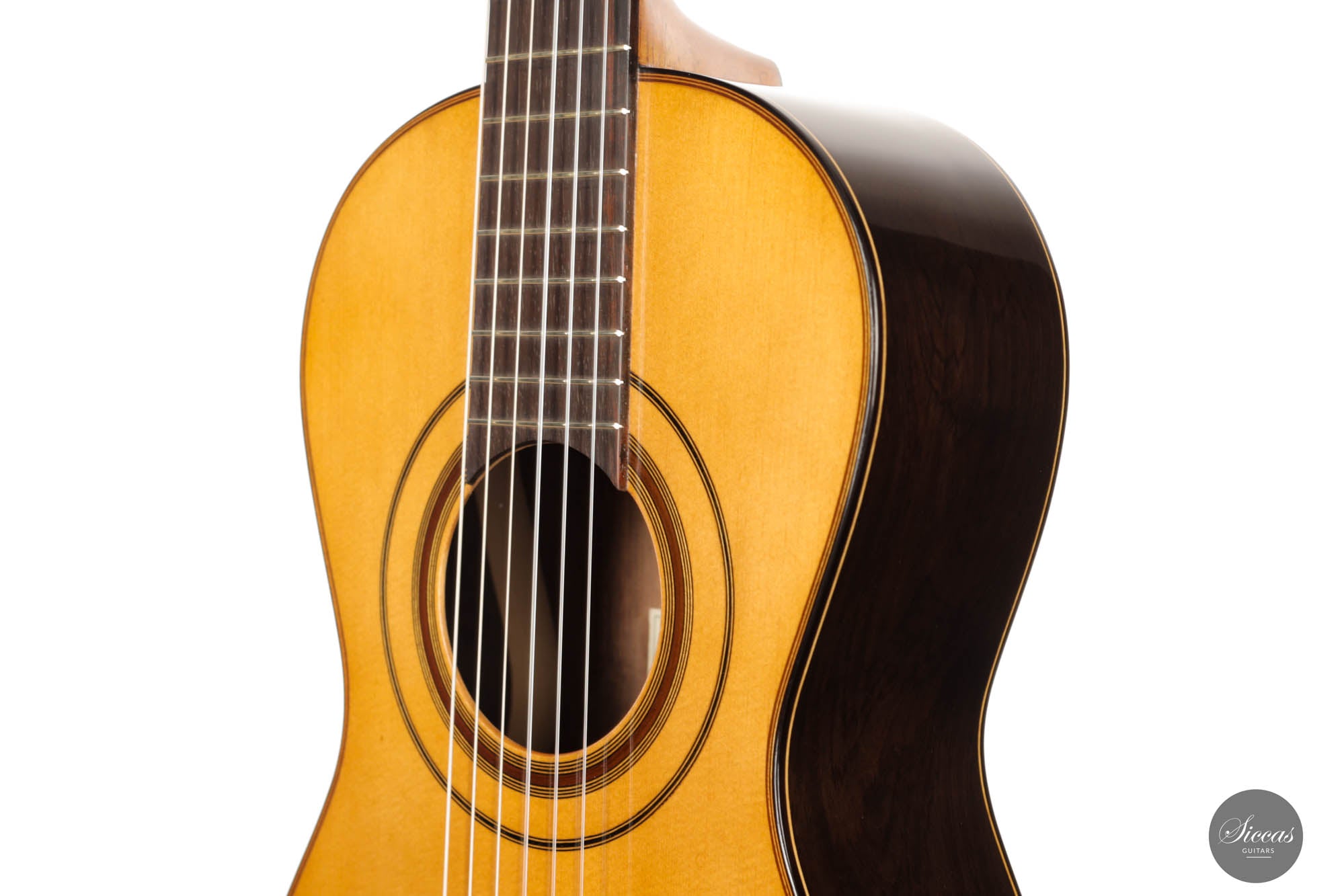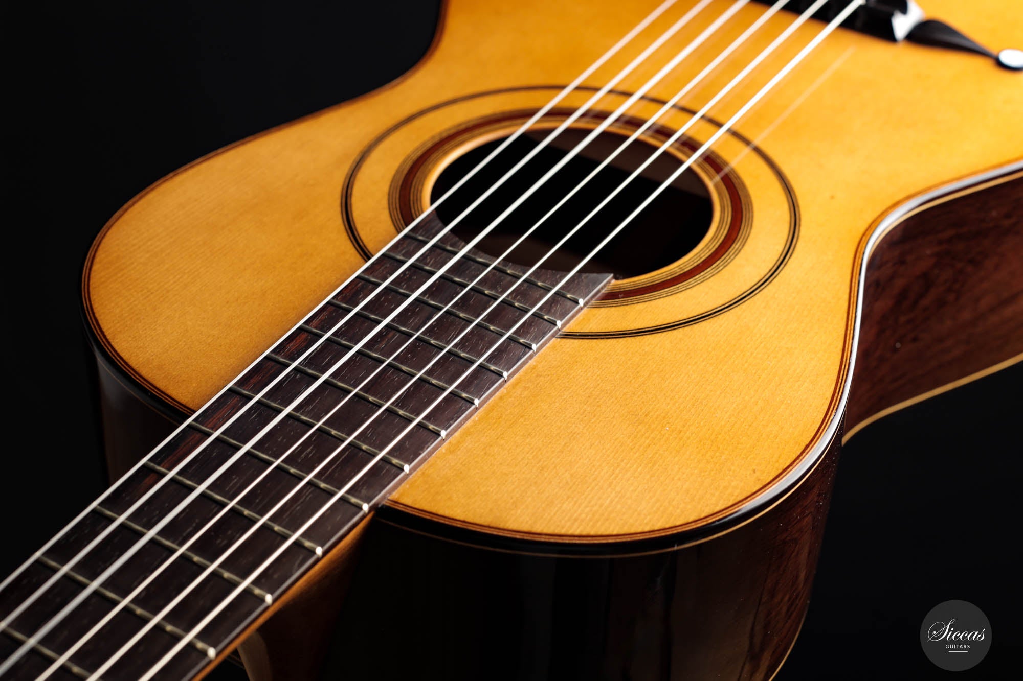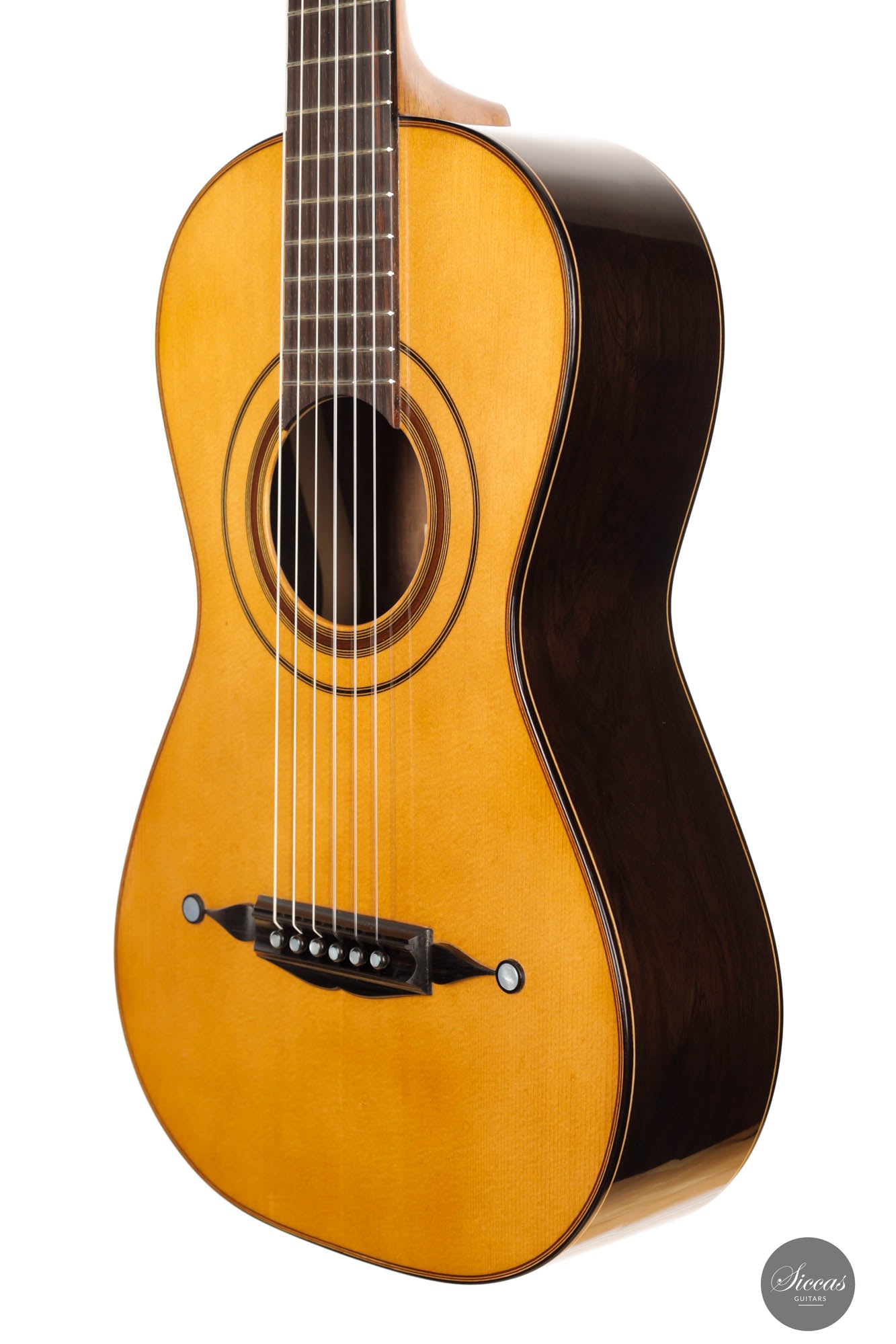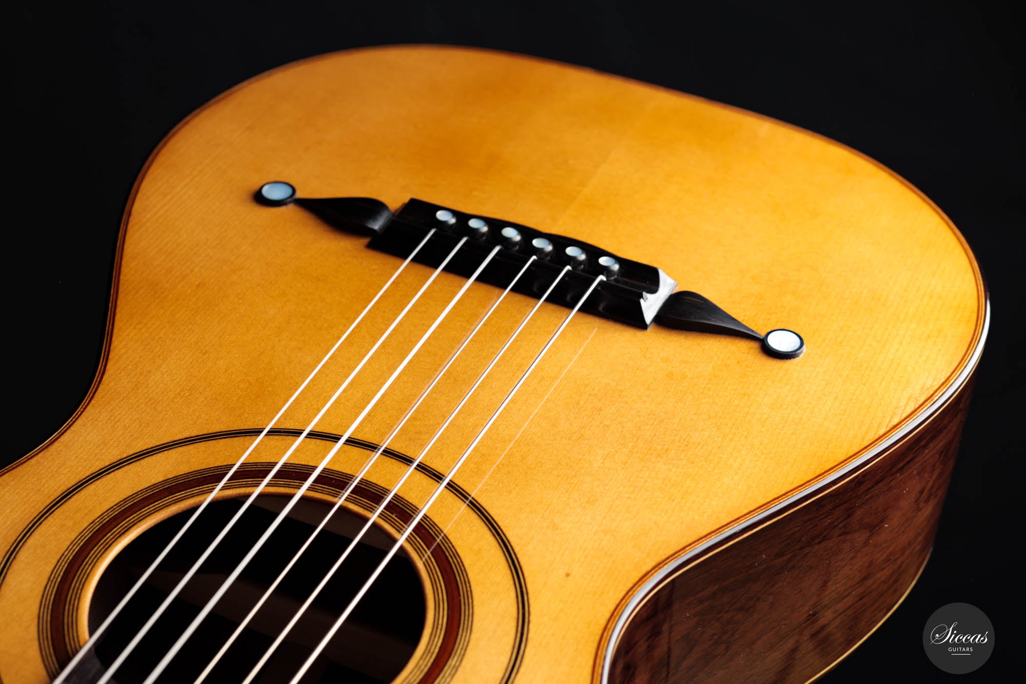 Schon beim ersten Blick wird man sofort von der glänzenden Fichtendecke gefesselt, die eine strahlende Maserung zeigt und auf die klanglichen Wunder hinweist, die sie erzeugen kann. Diese helle, feinkörnige Decke kontrastiert atemberaubend mit den tiefen, reichen Tönen des CITES-zertifizierten brasilianischen Palisanders, das für Boden und Zargen verwendet wurde. Das brasilianische Rosenholz, bekannt für seinen Resonanzklang und seine Seltenheit, verleiht dem Instrument eine zusätzliche Exklusivität und Anziehungskraft.