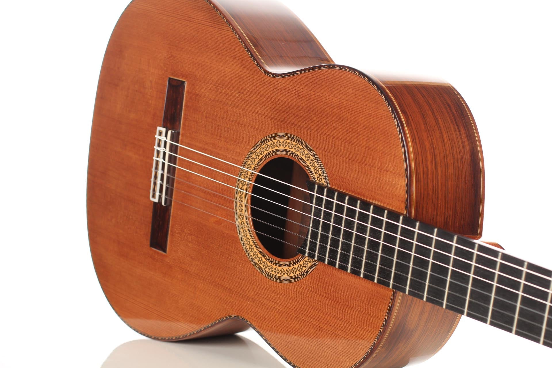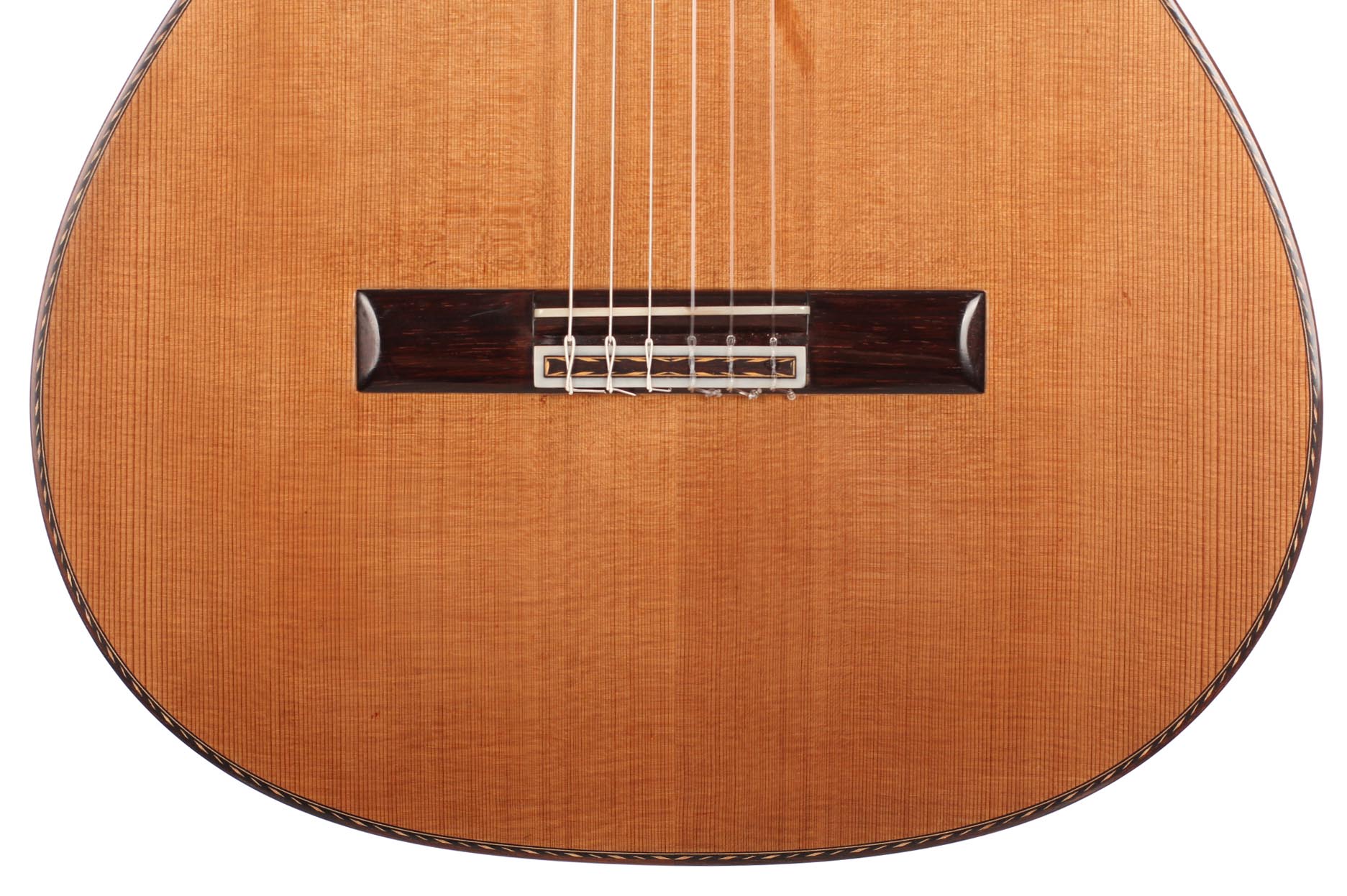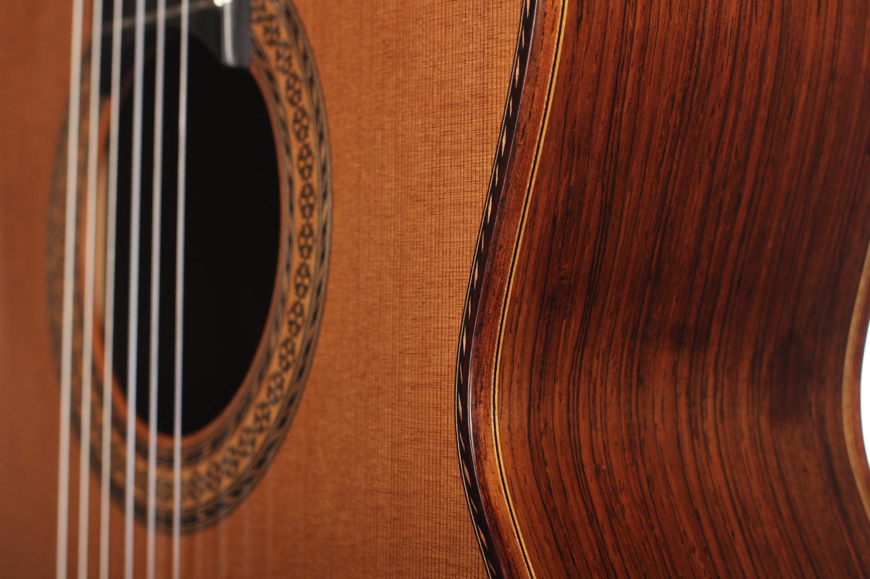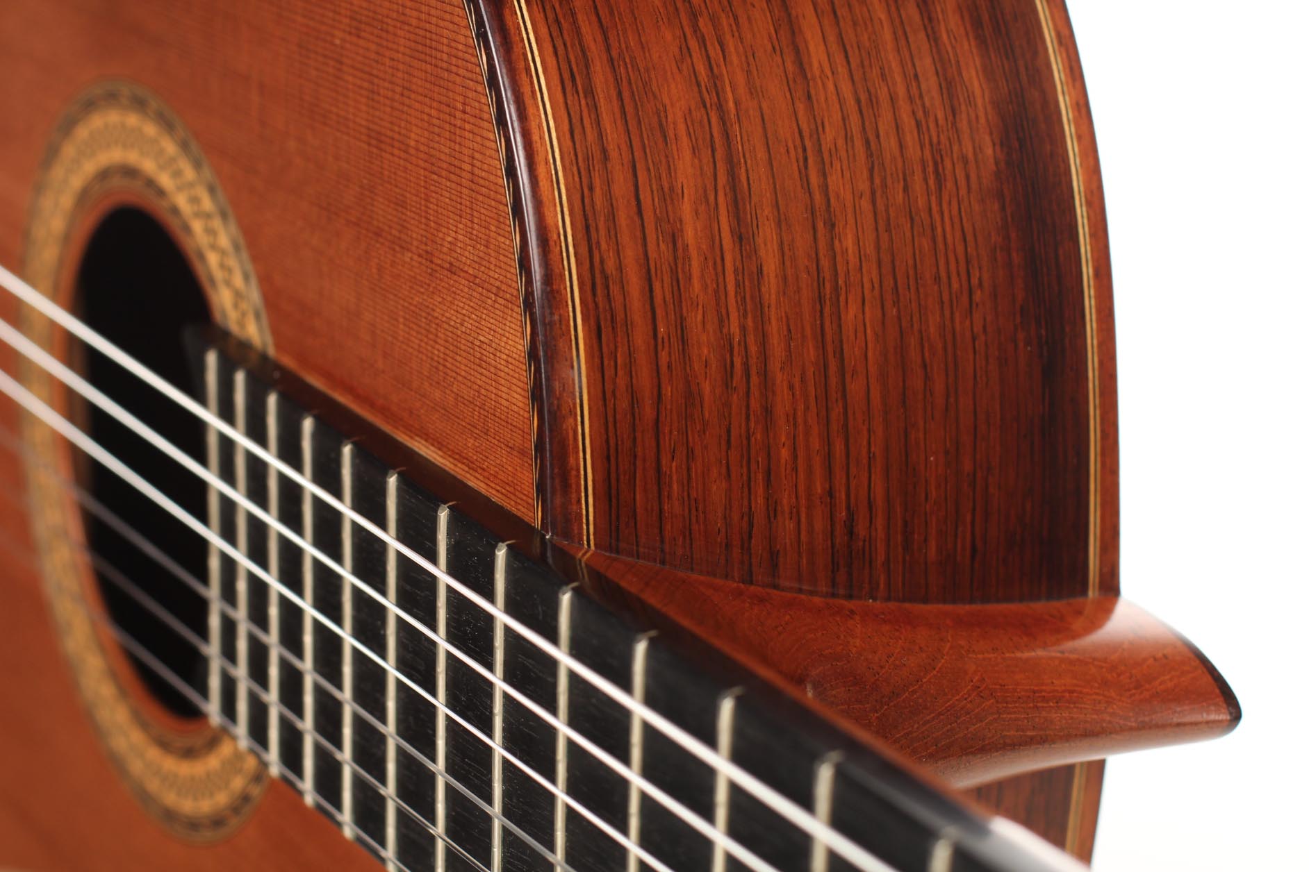 Die Jahresringe haben tiefe dreidimensionale Reflektionen und einen sehr schöne warme Farbe. Das Instrument ist in hervorragendem Zustand und sehr angenehm zu spielen. Die Ansprache ist sehr spontan, die dynamischen Möglichkeiten vielfältig und der Ton sehr formbar. Darüber hinaus besitzt die Gitarre einen kräftigen Klang und eine sehr gute Projektion.