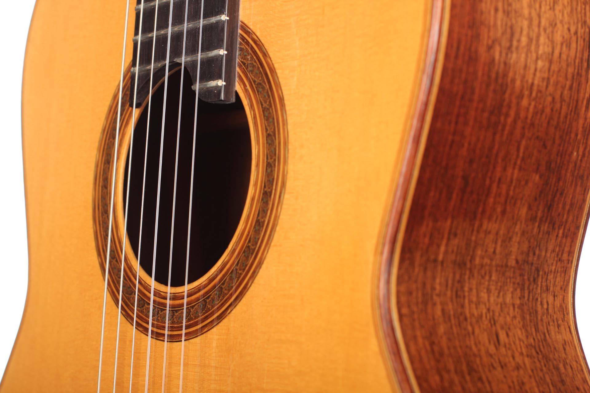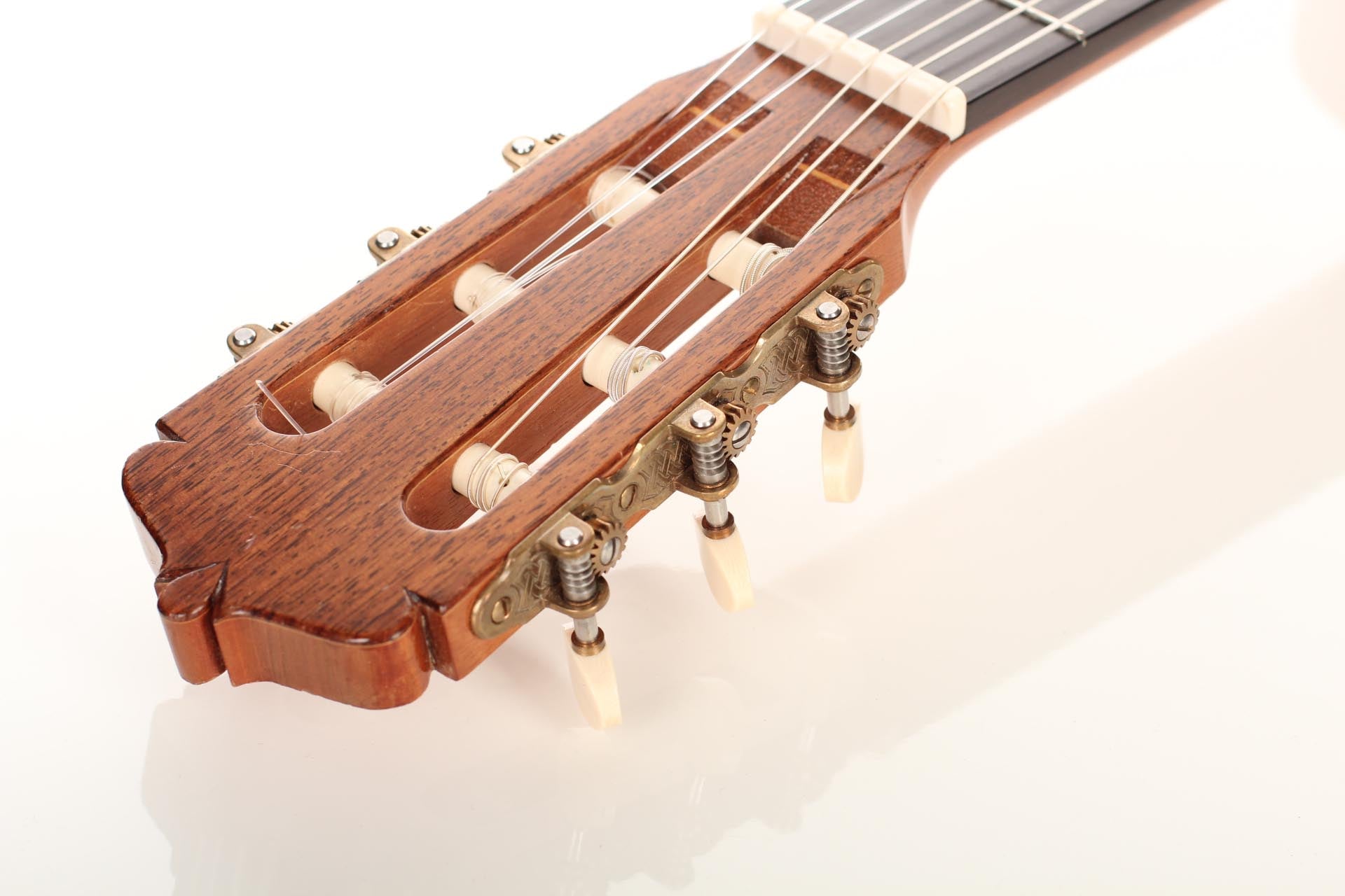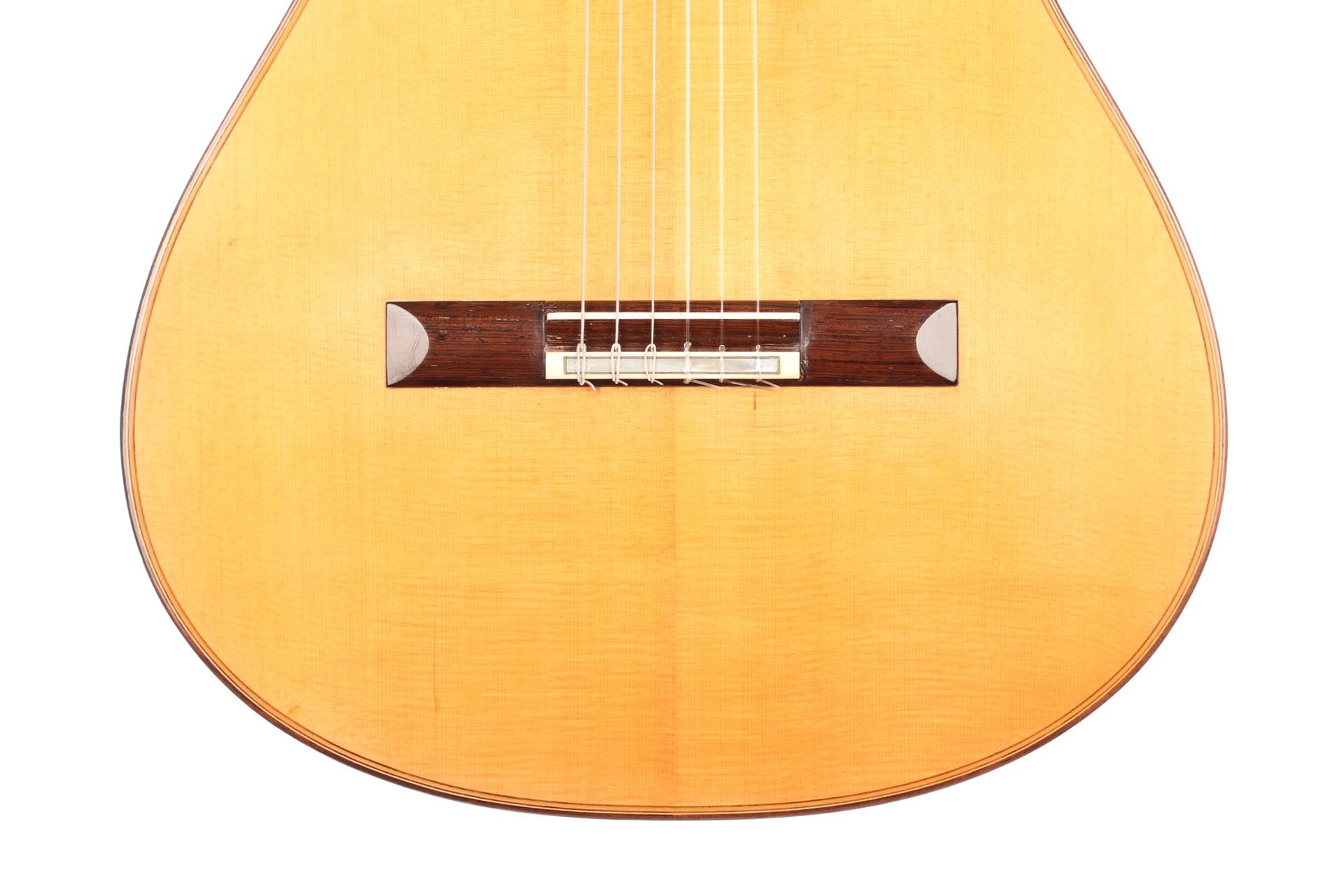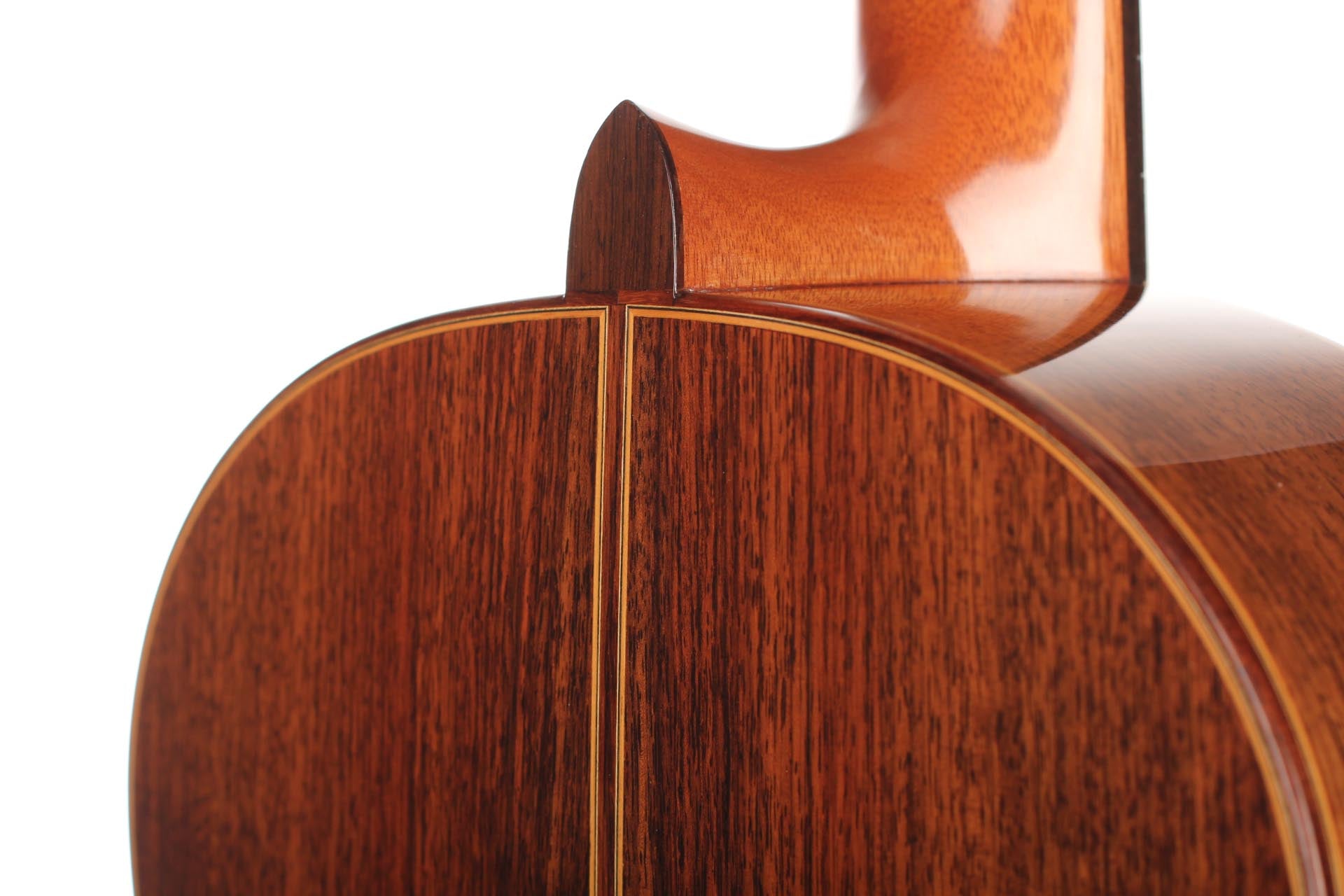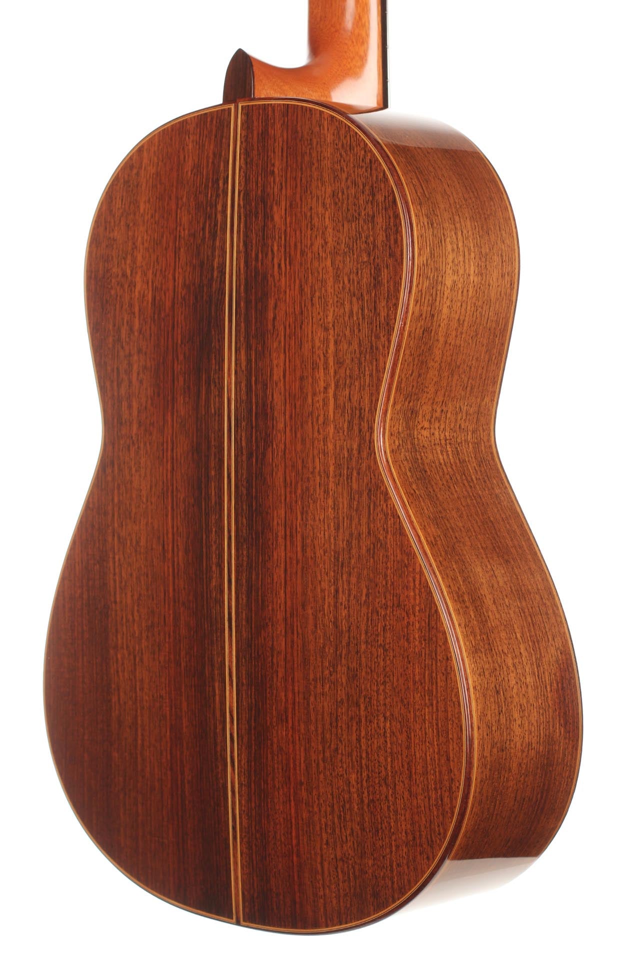 This guitar was built in 2003 and is wearing the number 313. It has a beautifully aged and coloured spruce top, and bright Indian rosewood back and sides. It is a comfortable 64 cm scale length guitar, perfectly set up and ready to be played. It is in very good condition with only one five centimeter fully repaired crack on the top and a little ding below the bridge. Sound wise, it is a beauty. It has brilliant pearl-like trebles supported by direct and instinctive basses. A perfect second hand 64 cm scale concert instrument for a passionate player. The tuners are made by Sloane. A hard-shell case is included.