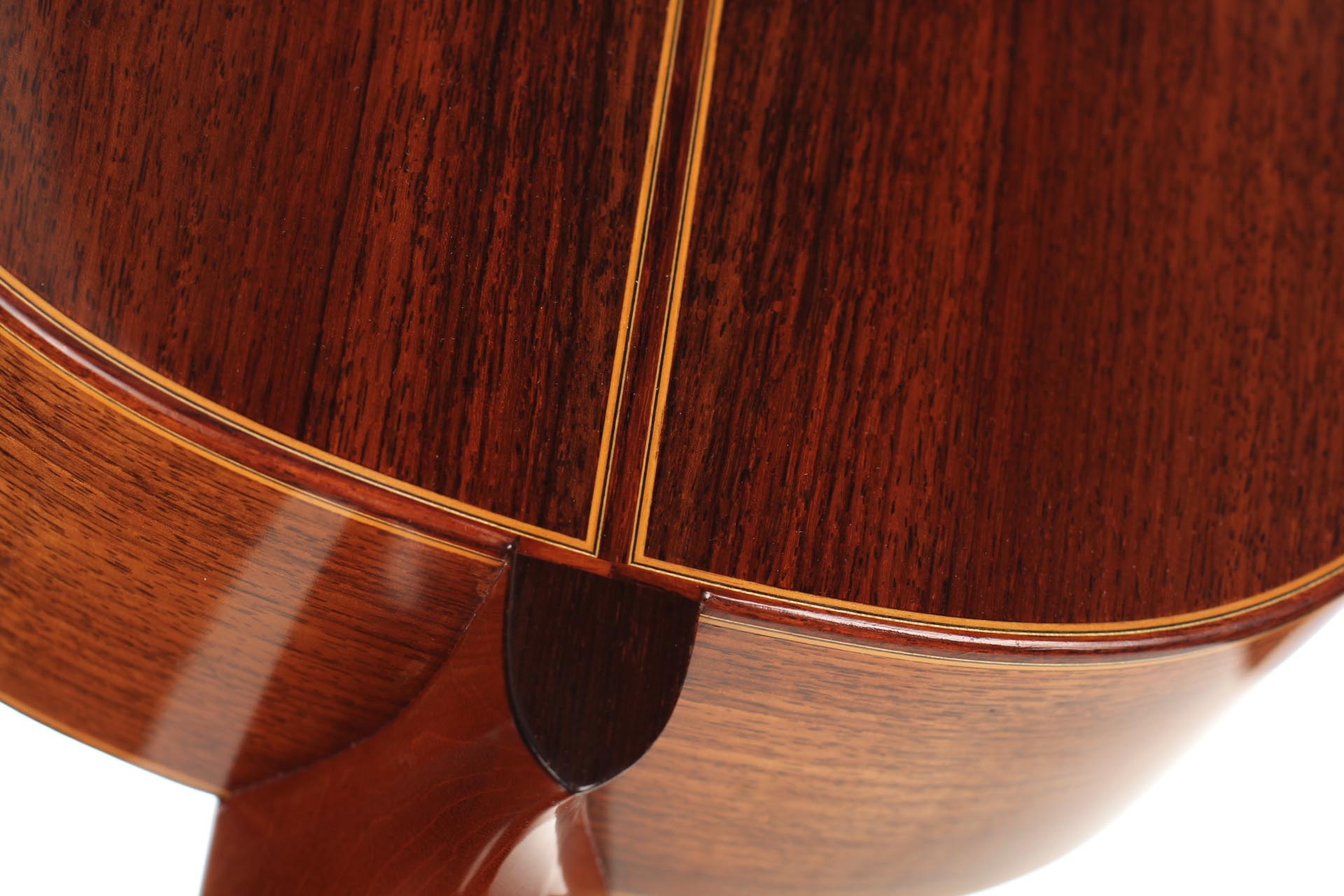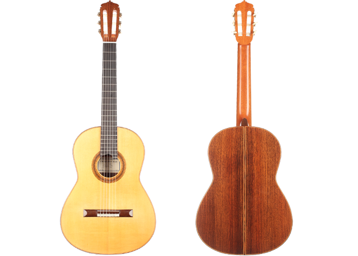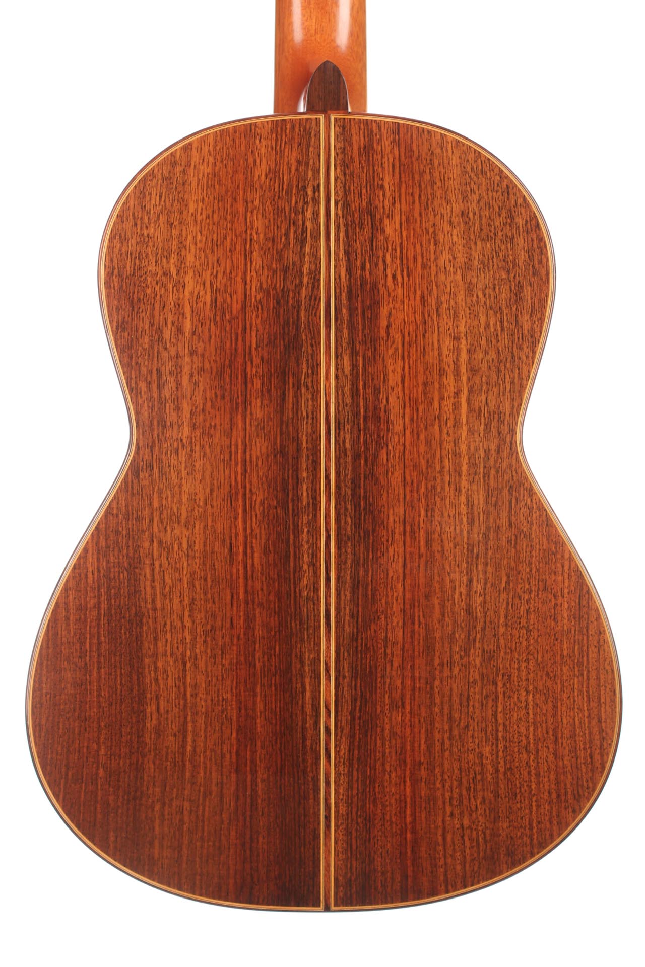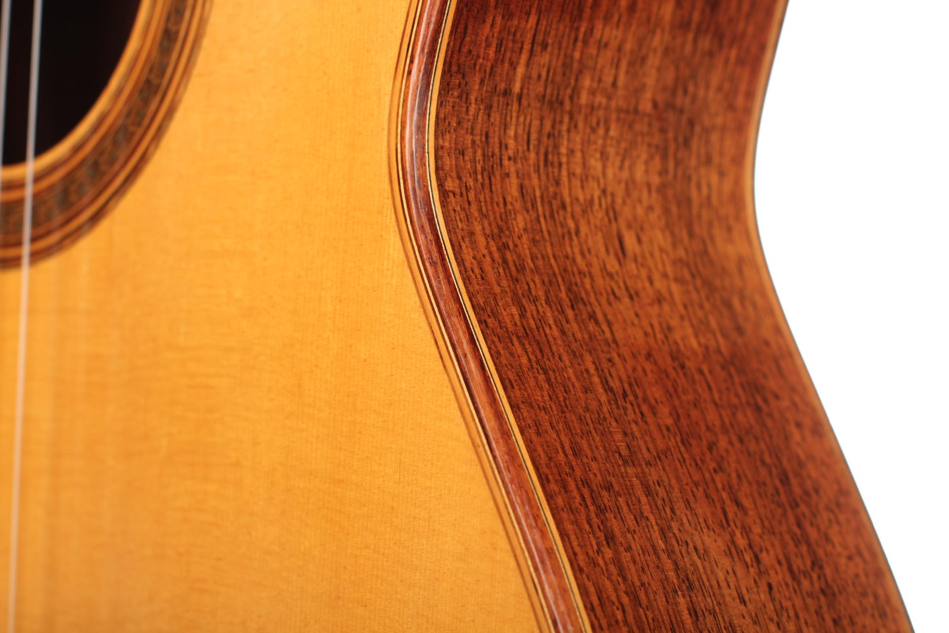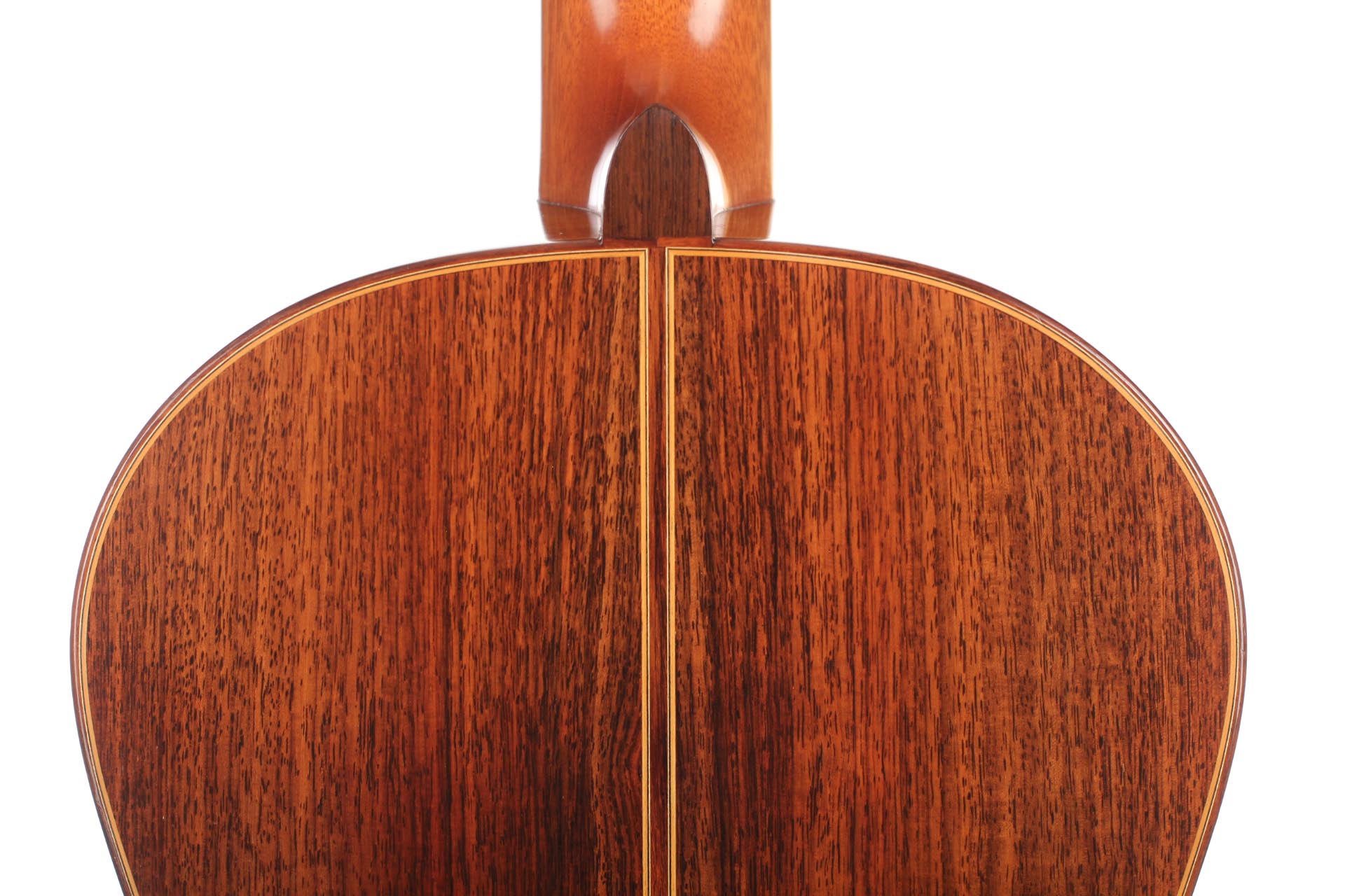 This guitar was built in 2003 and is wearing the number 313. It has a beautifully aged and coloured spruce top, and bright Indian rosewood back and sides. It is a comfortable 64 cm scale length guitar, perfectly set up and ready to be played. It is in very good condition with only one five centimeter fully repaired crack on the top and a little ding below the bridge. Sound wise, it is a beauty. It has brilliant pearl-like trebles supported by direct and instinctive basses. A perfect second hand 64 cm scale concert instrument for a passionate player. The tuners are made by Sloane. A hard-shell case is included.