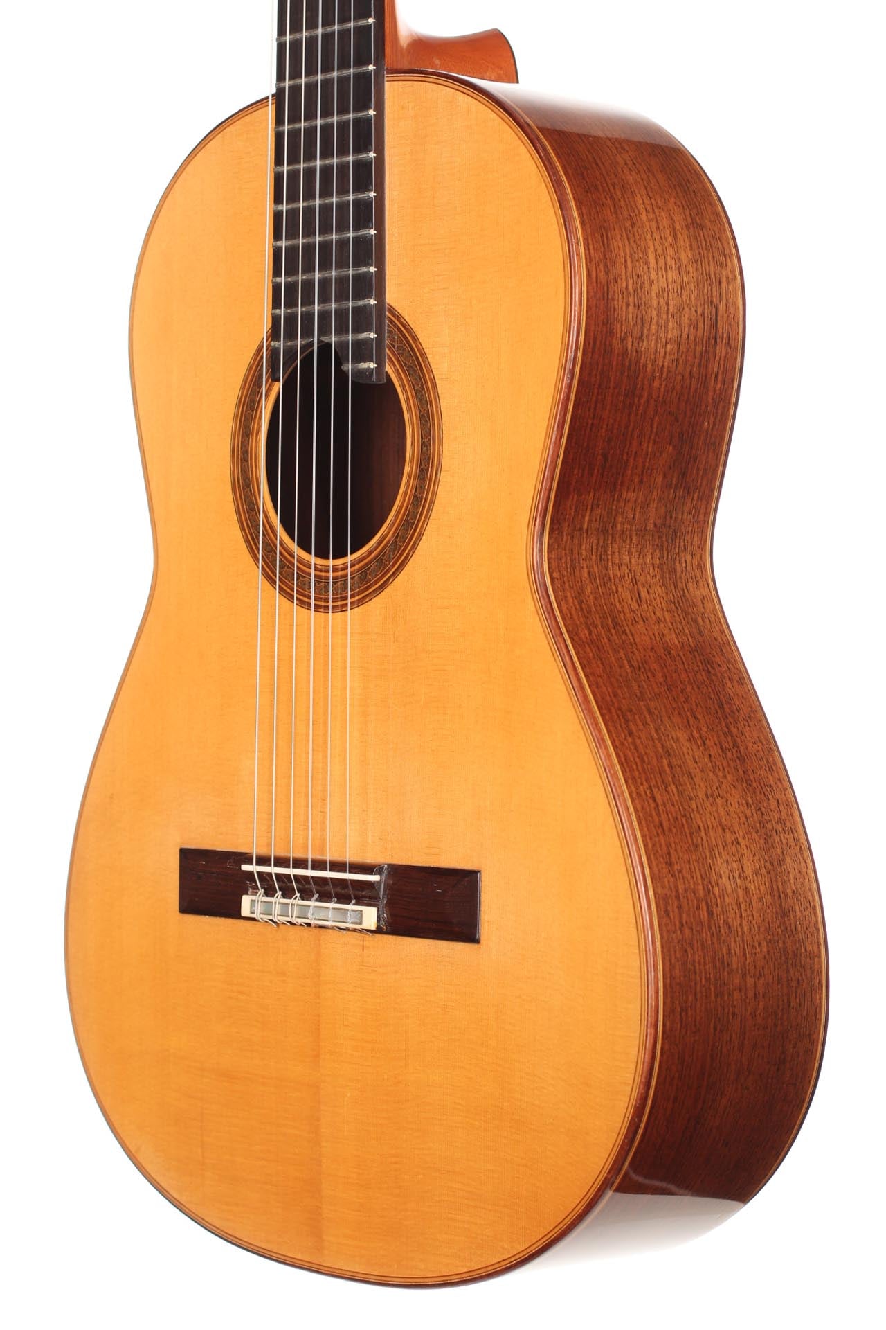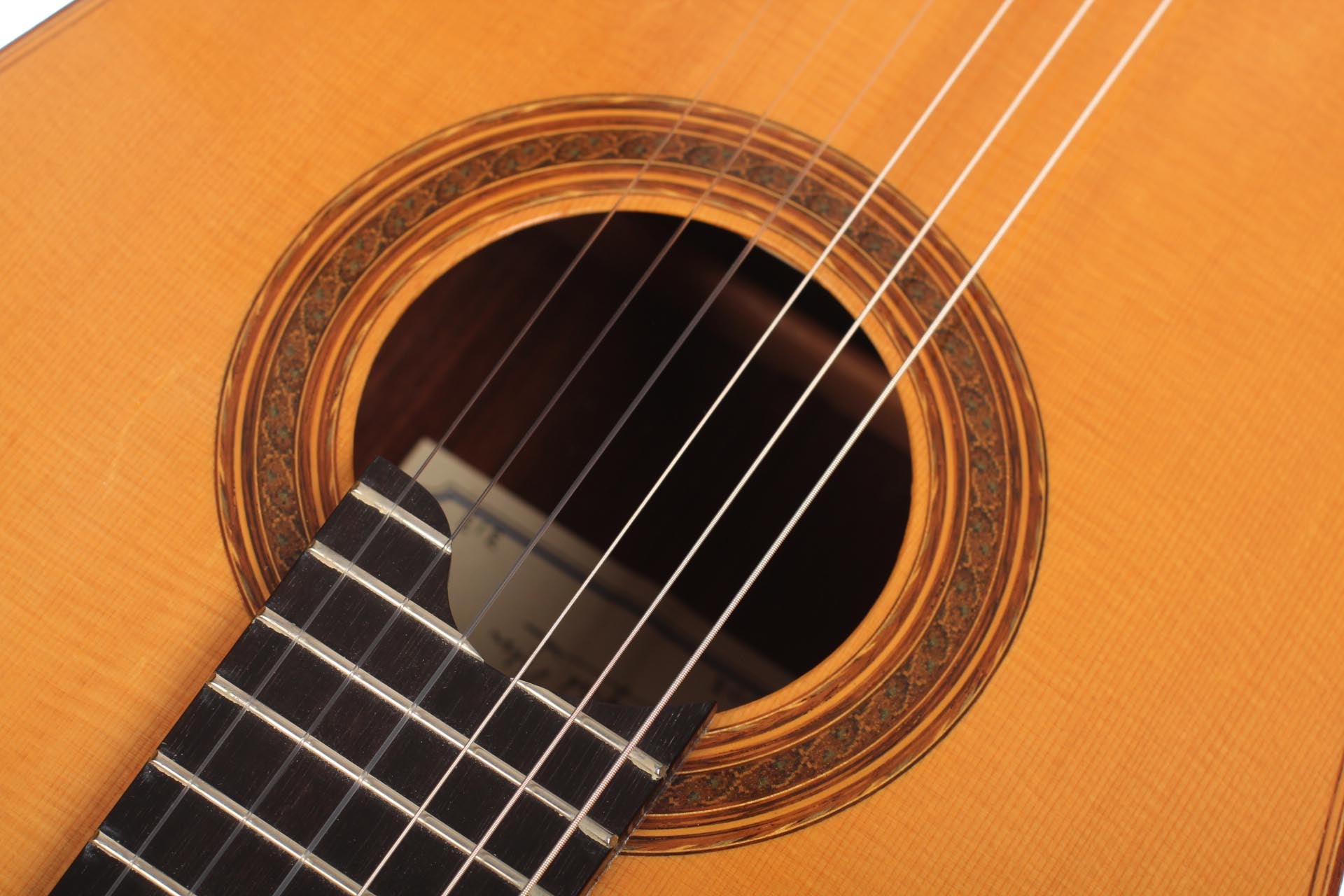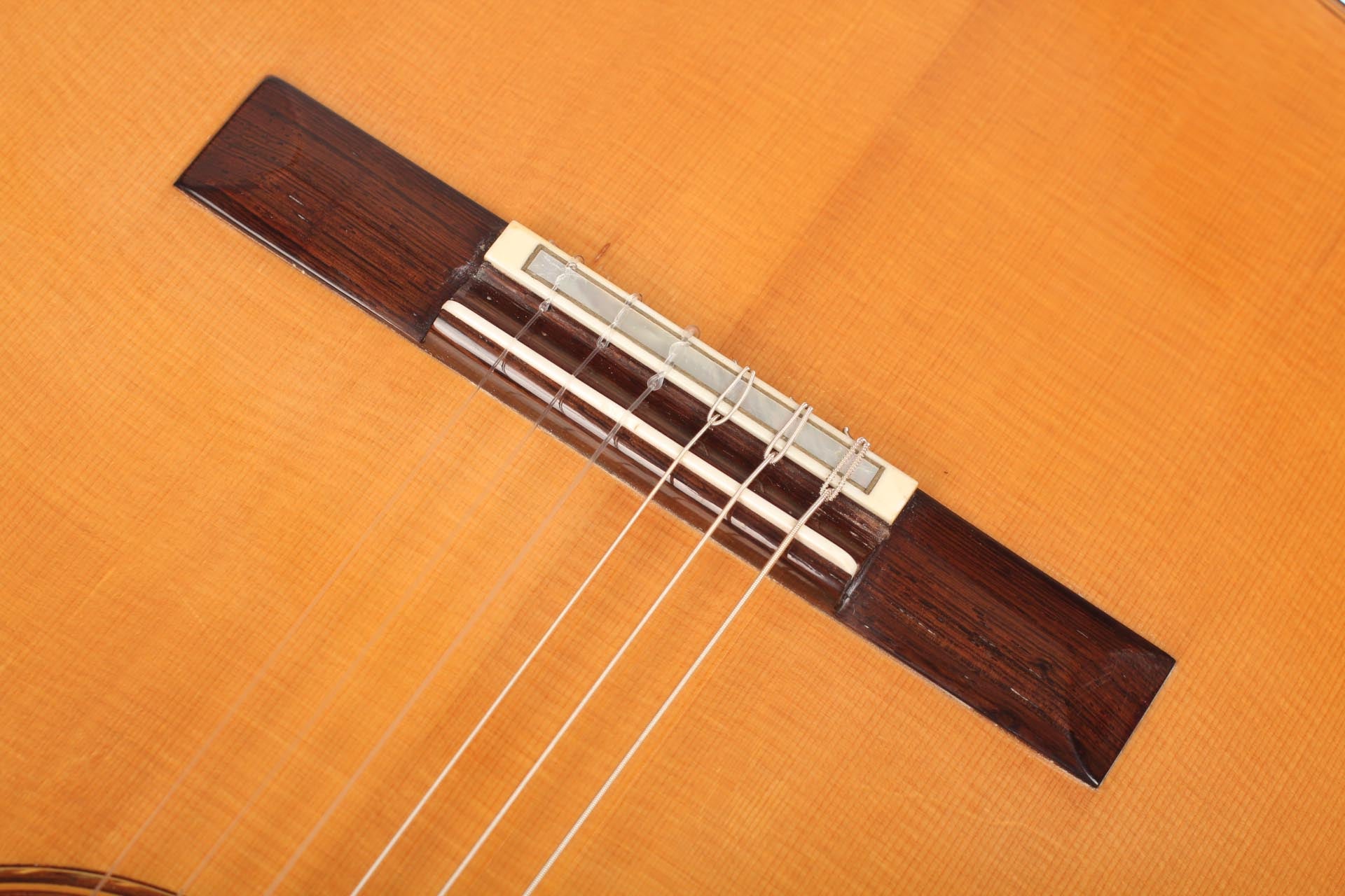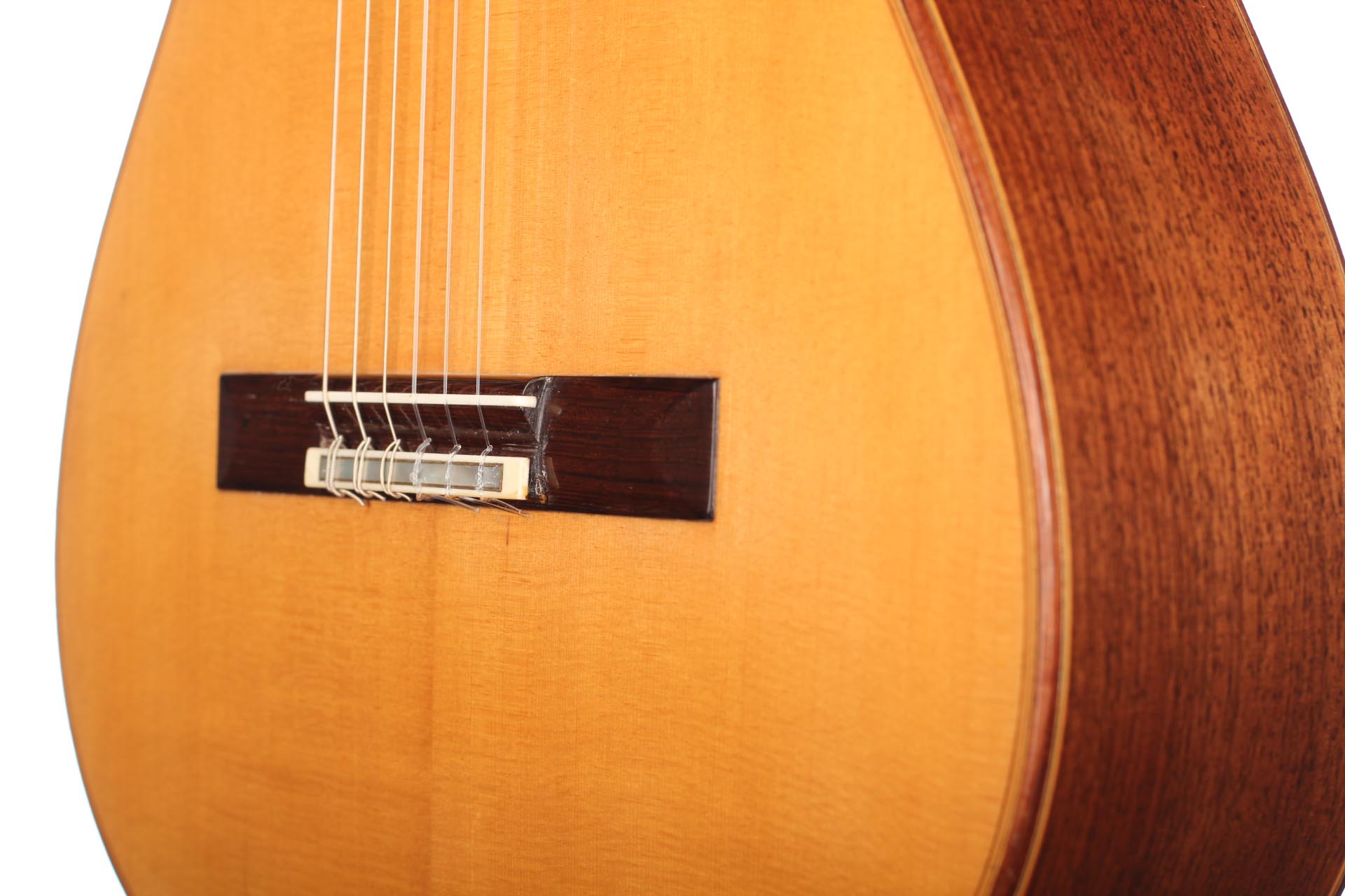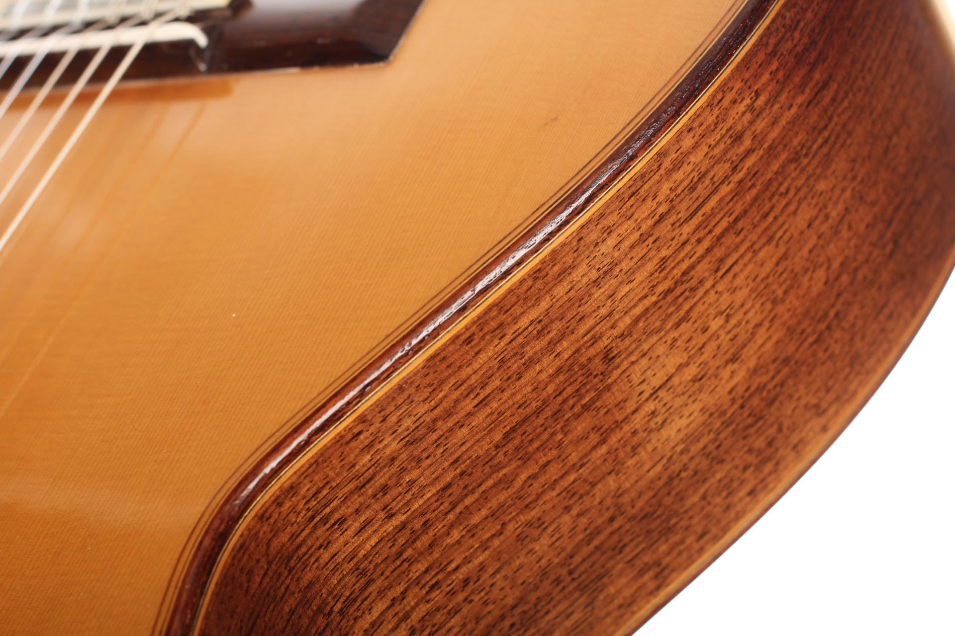 This guitar was built in 2003 and is wearing the number 313. It has a beautifully aged and coloured spruce top, and bright Indian rosewood back and sides. It is a comfortable 64 cm scale length guitar, perfectly set up and ready to be played. It is in very good condition with only one five centimeter fully repaired crack on the top and a little ding below the bridge. Sound wise, it is a beauty. It has brilliant pearl-like trebles supported by direct and instinctive basses. A perfect second hand 64 cm scale concert instrument for a passionate player. The tuners are made by Sloane. A hard-shell case is included.