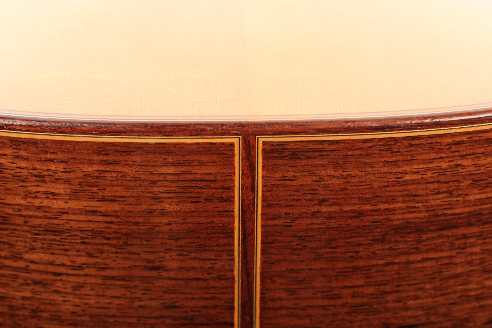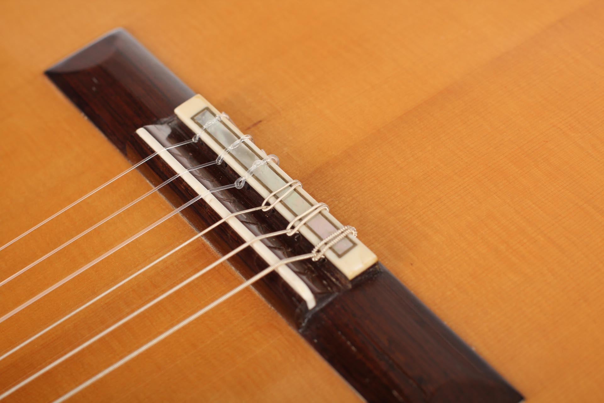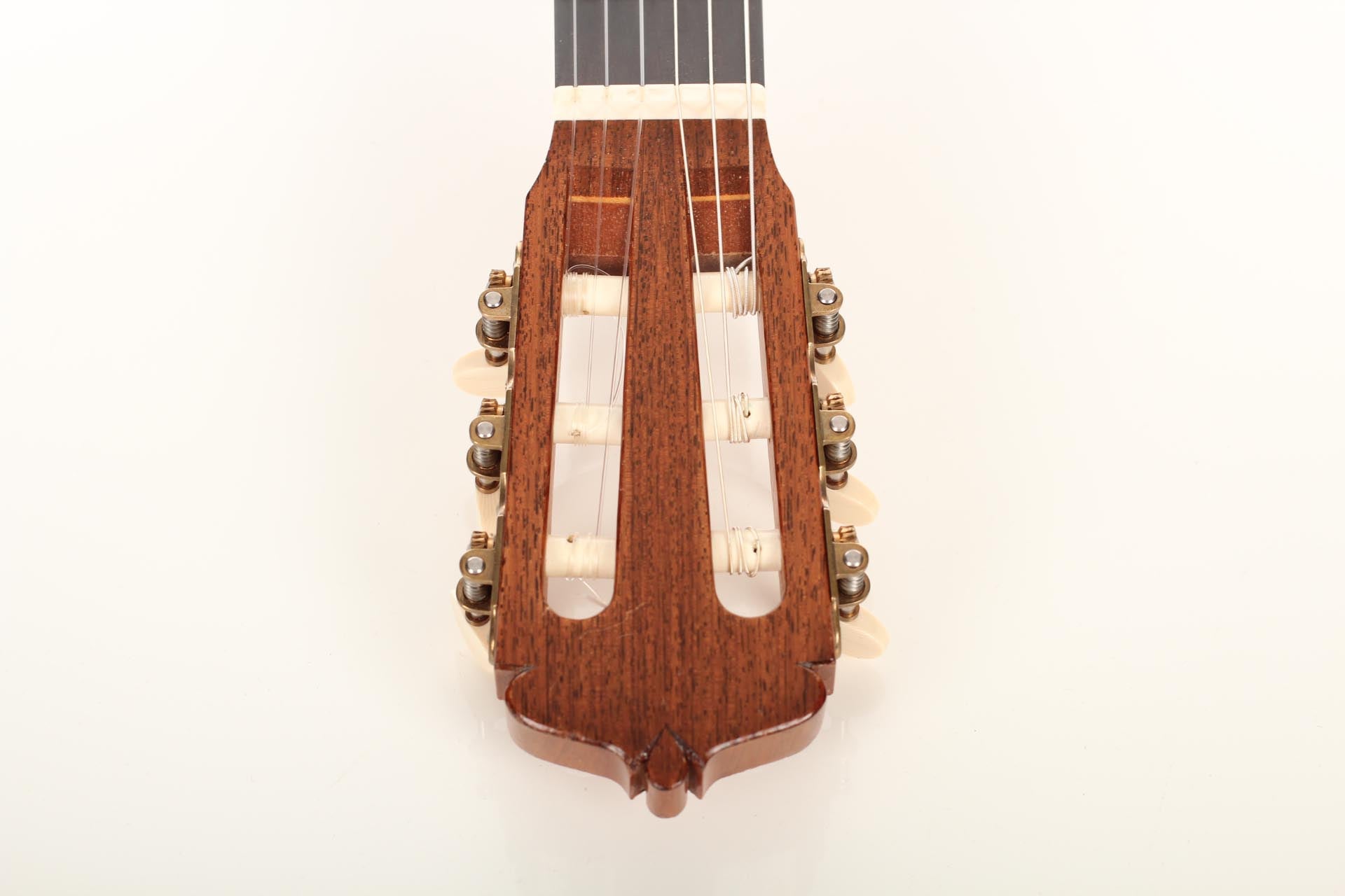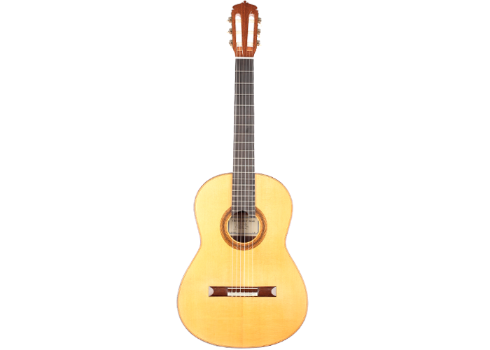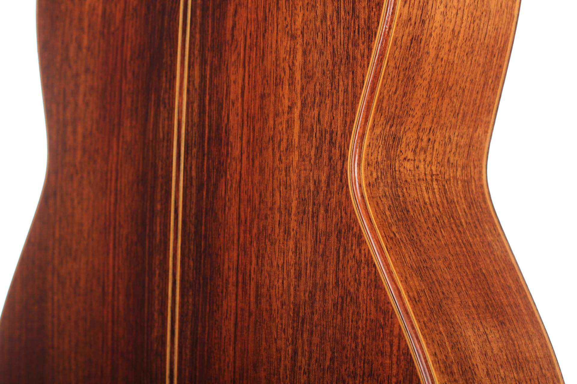 This guitar was built in 2003 and is wearing the number 313. It has a beautifully aged and coloured spruce top, and bright Indian rosewood back and sides. It is a comfortable 64 cm scale length guitar, perfectly set up and ready to be played. It is in very good condition with only one five centimeter fully repaired crack on the top and a little ding below the bridge. Sound wise, it is a beauty. It has brilliant pearl-like trebles supported by direct and instinctive basses. A perfect second hand 64 cm scale concert instrument for a passionate player. The tuners are made by Sloane. A hard-shell case is included.