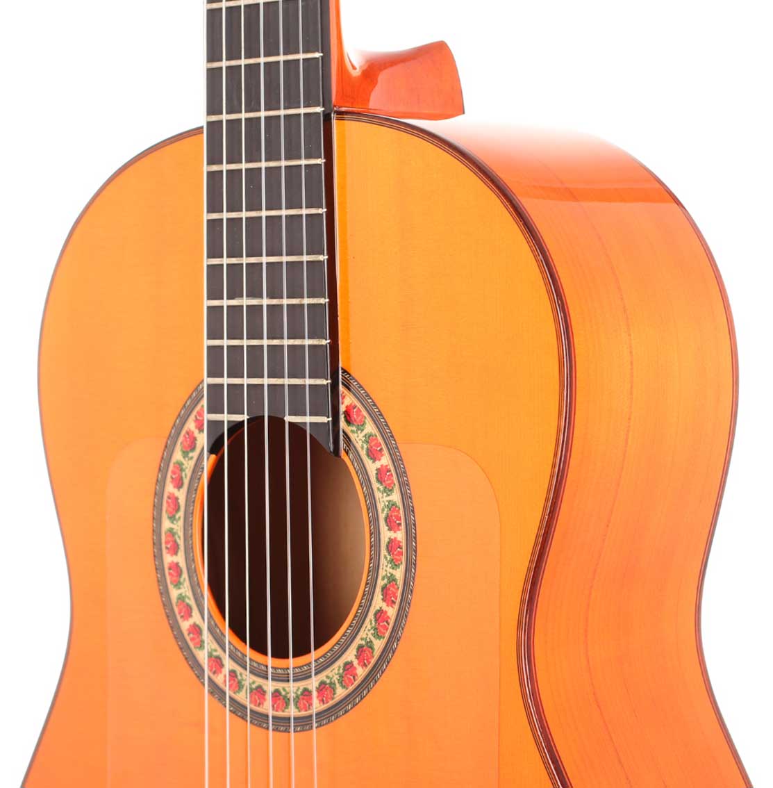 This flamenco guitar was built in 1999 and has a very fine spruce top. This guitar has a “Media Luna” headstock and one of the exclusive traditional rosette designs. The guitar is made from highest quality tone-woods that have matured for several decades. The tuning machines are made by Fustero. A hardshell case is included.