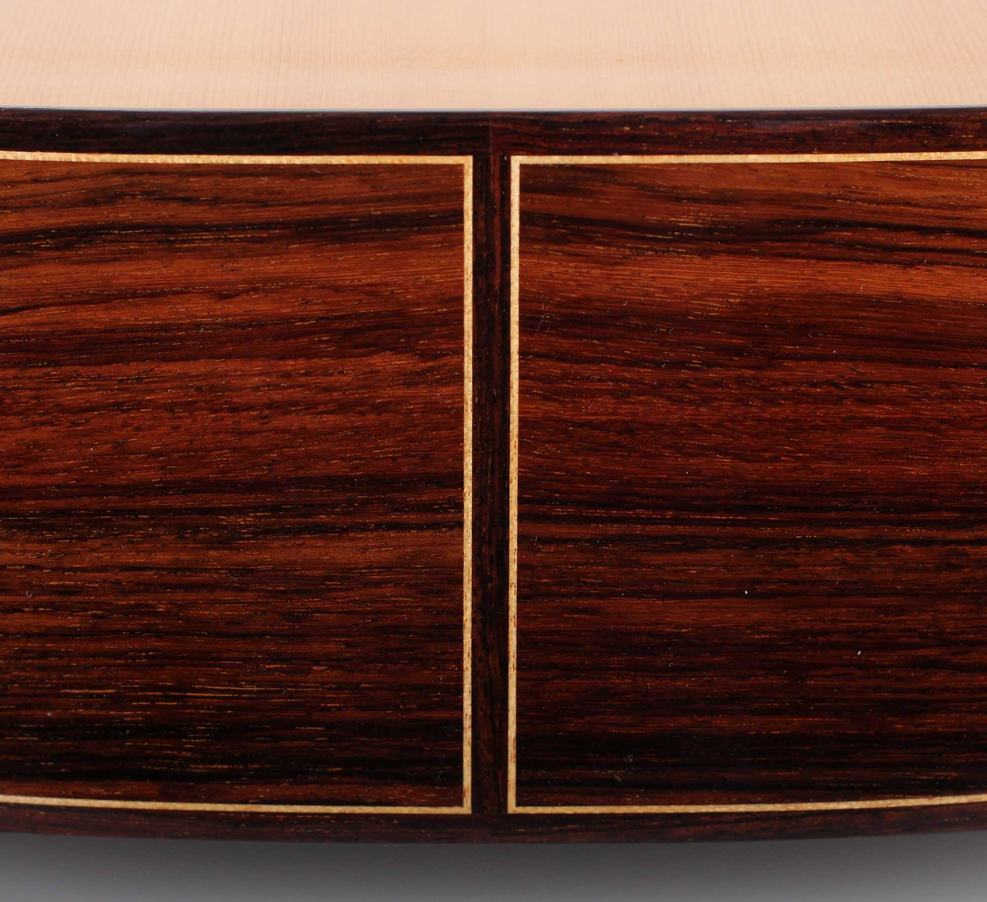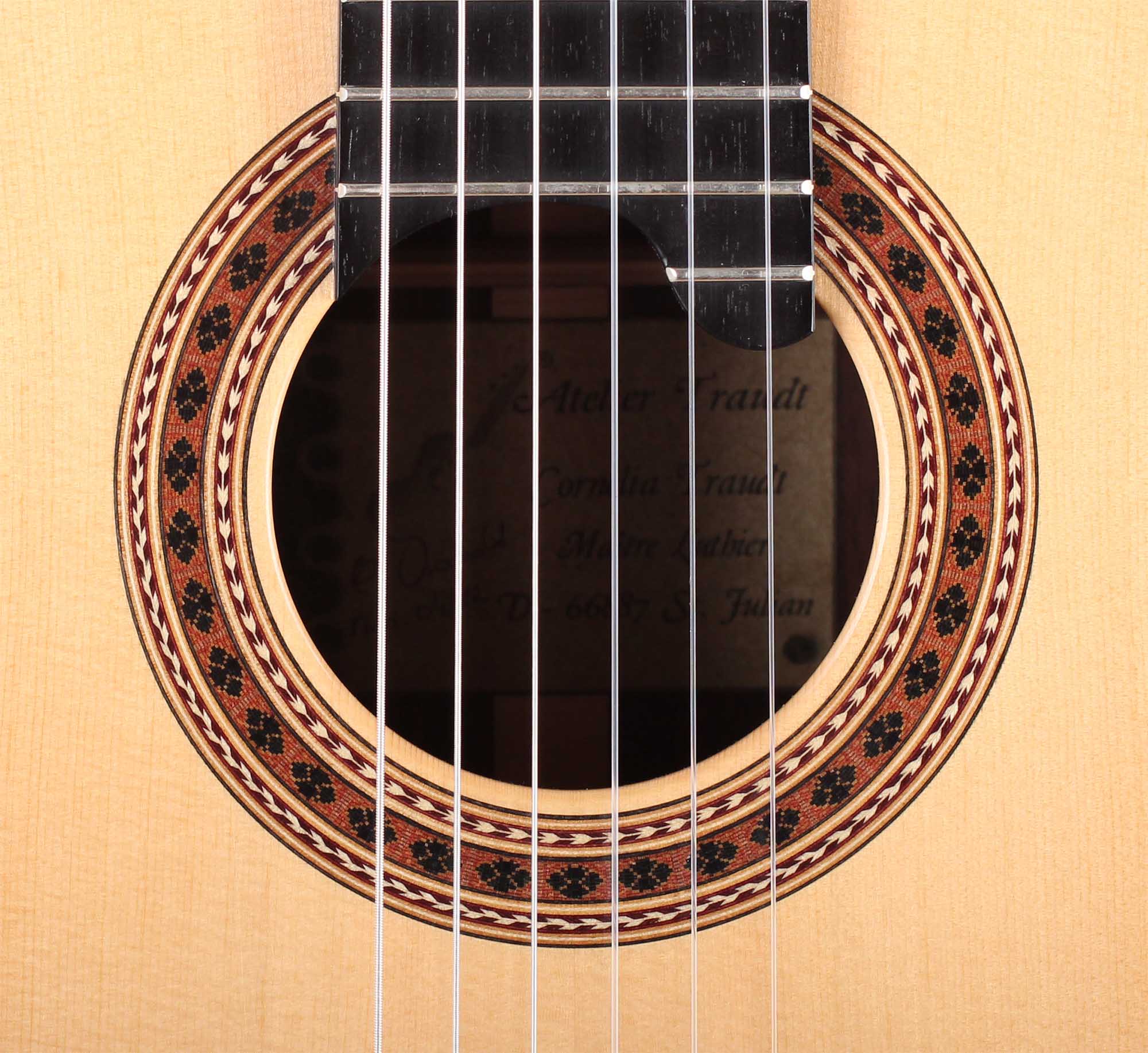Cornelia Traudt baut seit 1985 Gitarren und lernte in der Werkstatt von Dieter Hopf aber auch in anderen Werkstätten wie z.B. bei Schack und Sandberg. Sie studierte an der Staatlichen Musikinstrumentenbau Schule Mittenwald und schloss das Studium im Jahr 1993 mit dem Diplom ab. Für ihre Gitarren verwendet Cornelia nur die besten Hölzer, die auf natürliche Weise jahrelang getrocknet wurden. Die Decke dieses Artis Gentle Touch Models wurde aus Alpenfichte gefertigt und hat entlang Deckenrands eine Hohlkehle. Boden und Zargen sind aus regelmäßig gewachsenem indischen Palisander. Veredelt wurde die Gitarre mit einer aufwändigen Schellack Handpolitur. Die Mechaniken sind Alessi, die mit Ebenholzwirbeln ausgestattet sind. Zugehörig ist auch ein hochwertiger Luxus Hiscox Koffer.