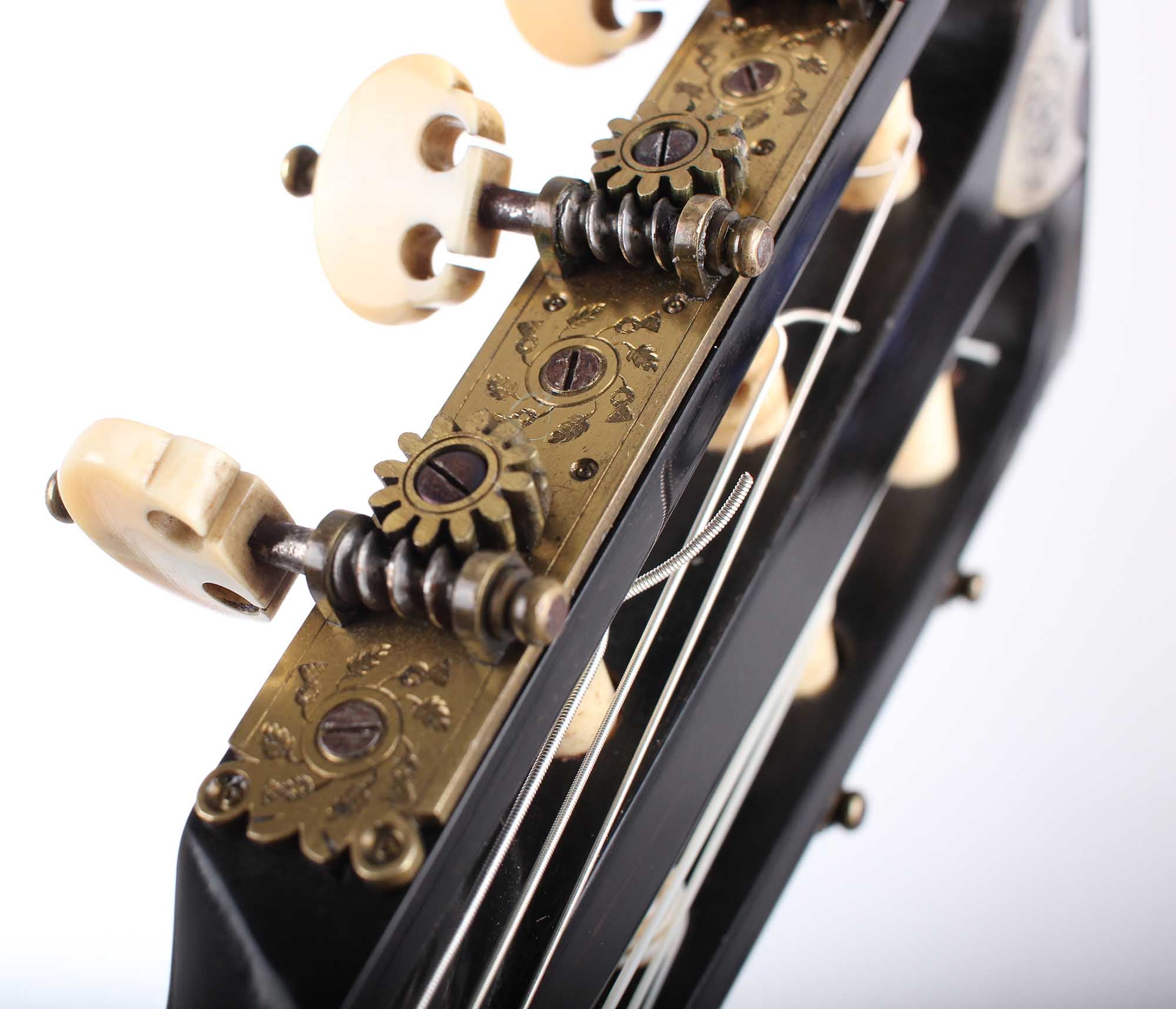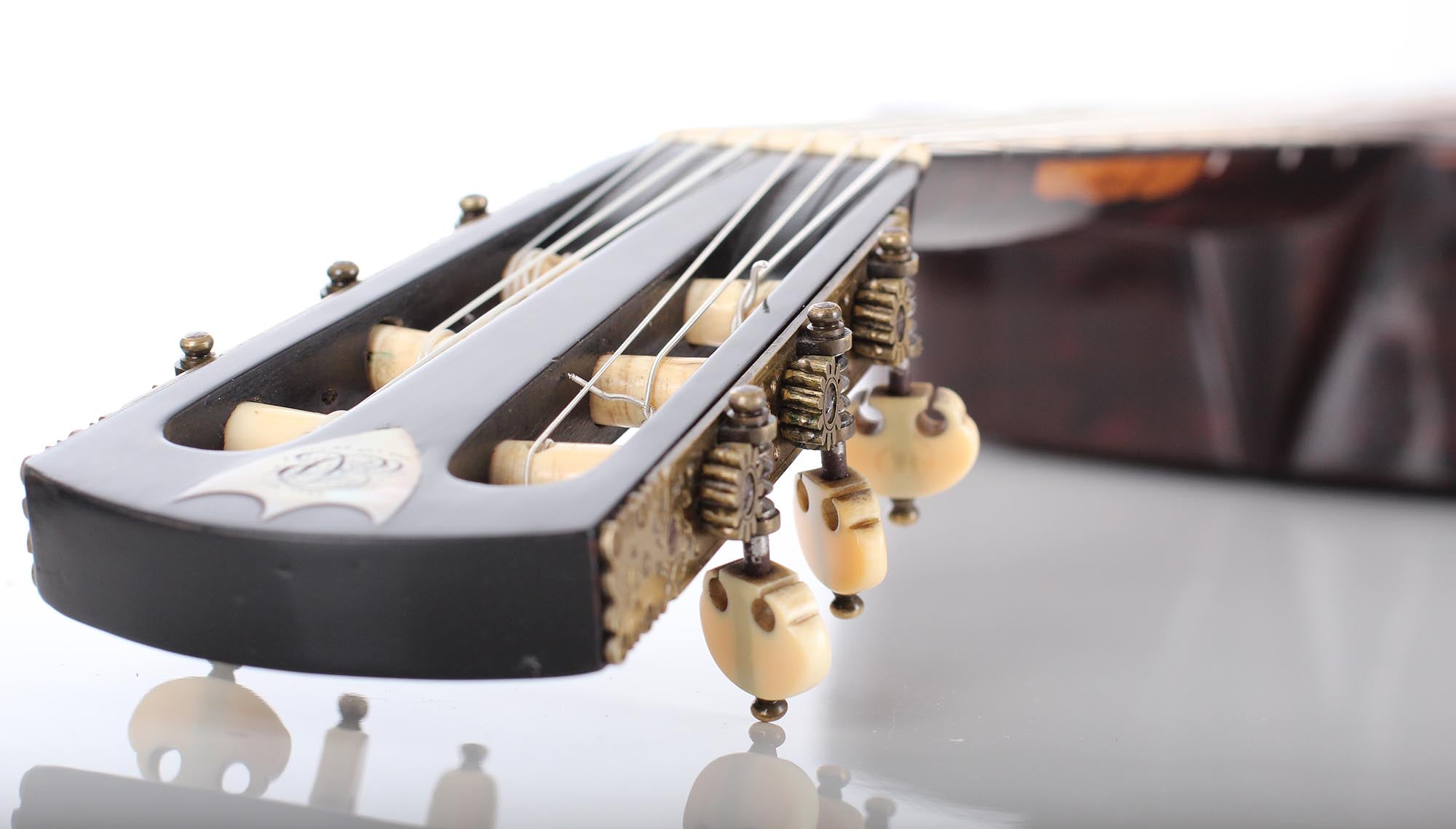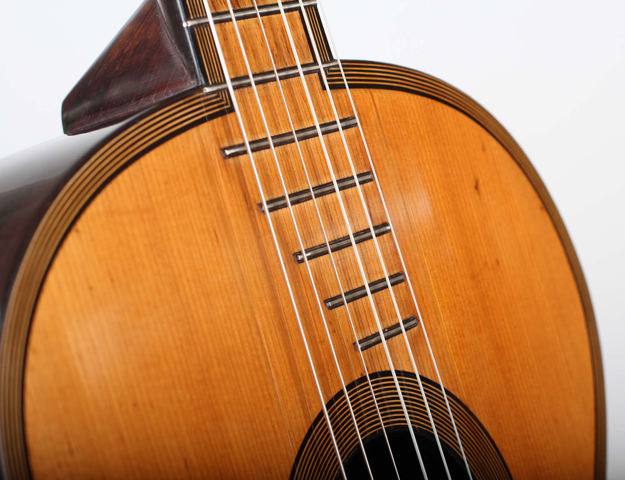 When looking at the high-quality materials that were used for this guitar, and when taking a closer look how elaborated this guitar is from in- and outside, we can only estimate what great skills these two artisans had. The top of this guitar is in remarkable condition and has only one repaired crack on each side of the frets. Back and sides are made of impressive looking rosewood that only shows some little perfectly repaired cracks that are hard to see. The high quality tuning machines are original and decorated with floral motifs.
