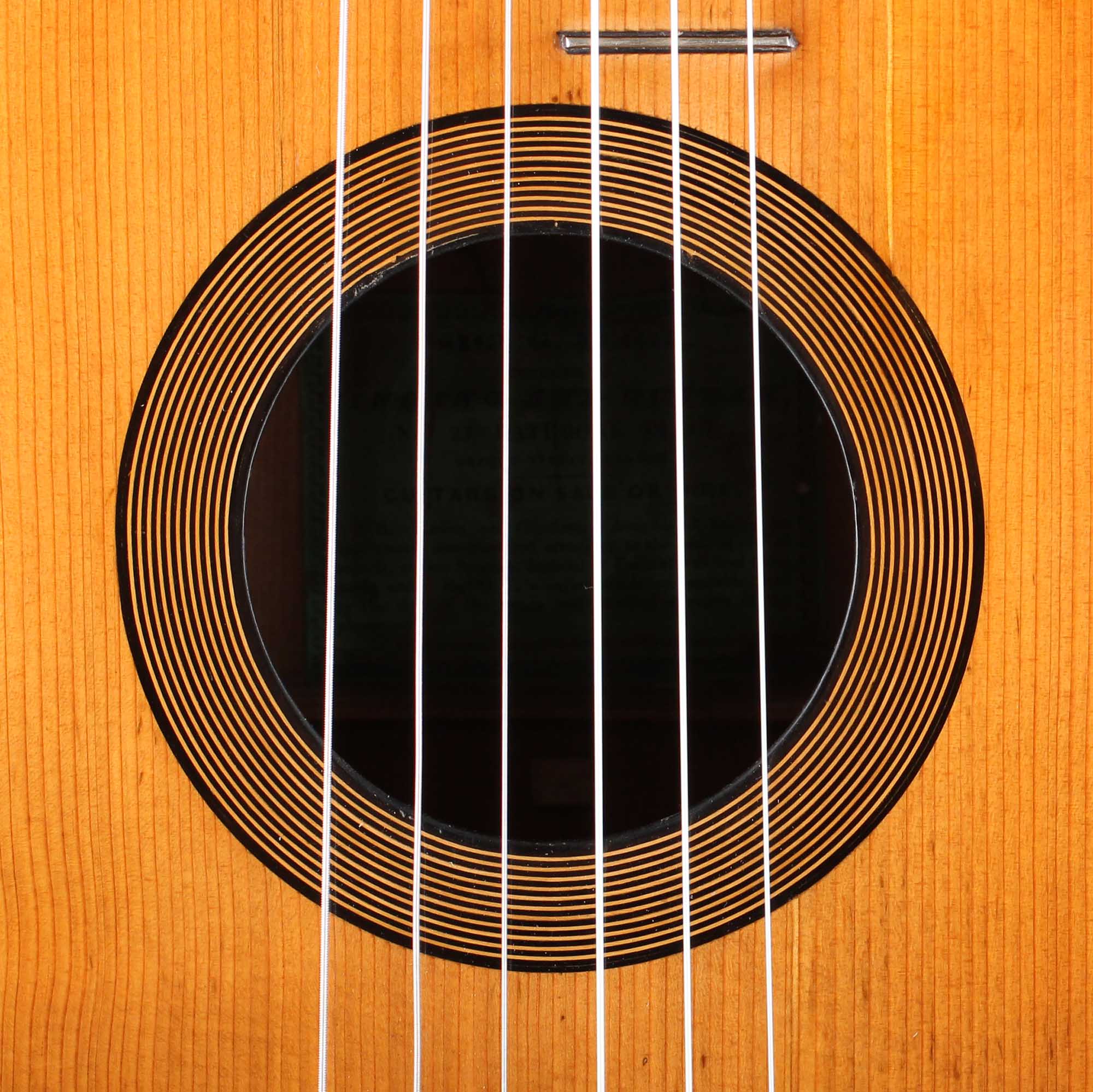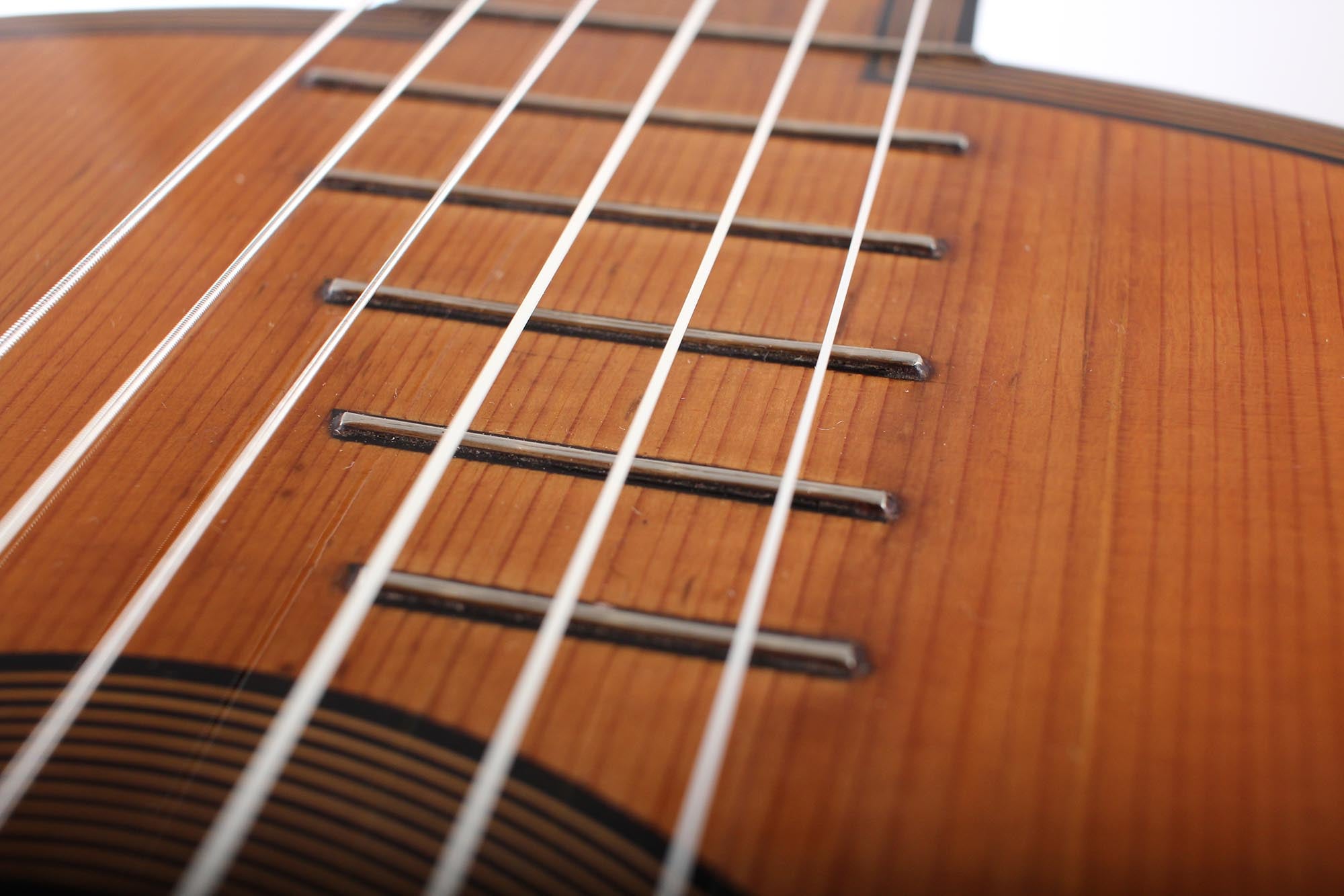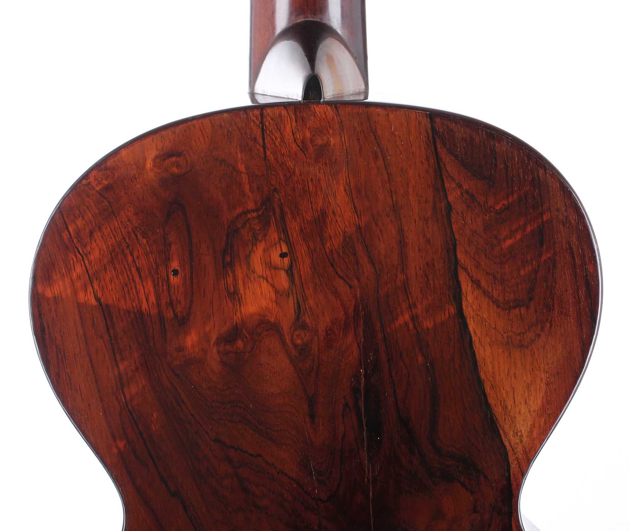 When looking at the high-quality materials that were used for this guitar, and when taking a closer look how elaborated this guitar is from in- and outside, we can only estimate what great skills these two artisans had. The top of this guitar is in remarkable condition and has only one repaired crack on each side of the frets. Back and sides are made of impressive looking rosewood that only shows some little perfectly repaired cracks that are hard to see. The high quality tuning machines are original and decorated with floral motifs.