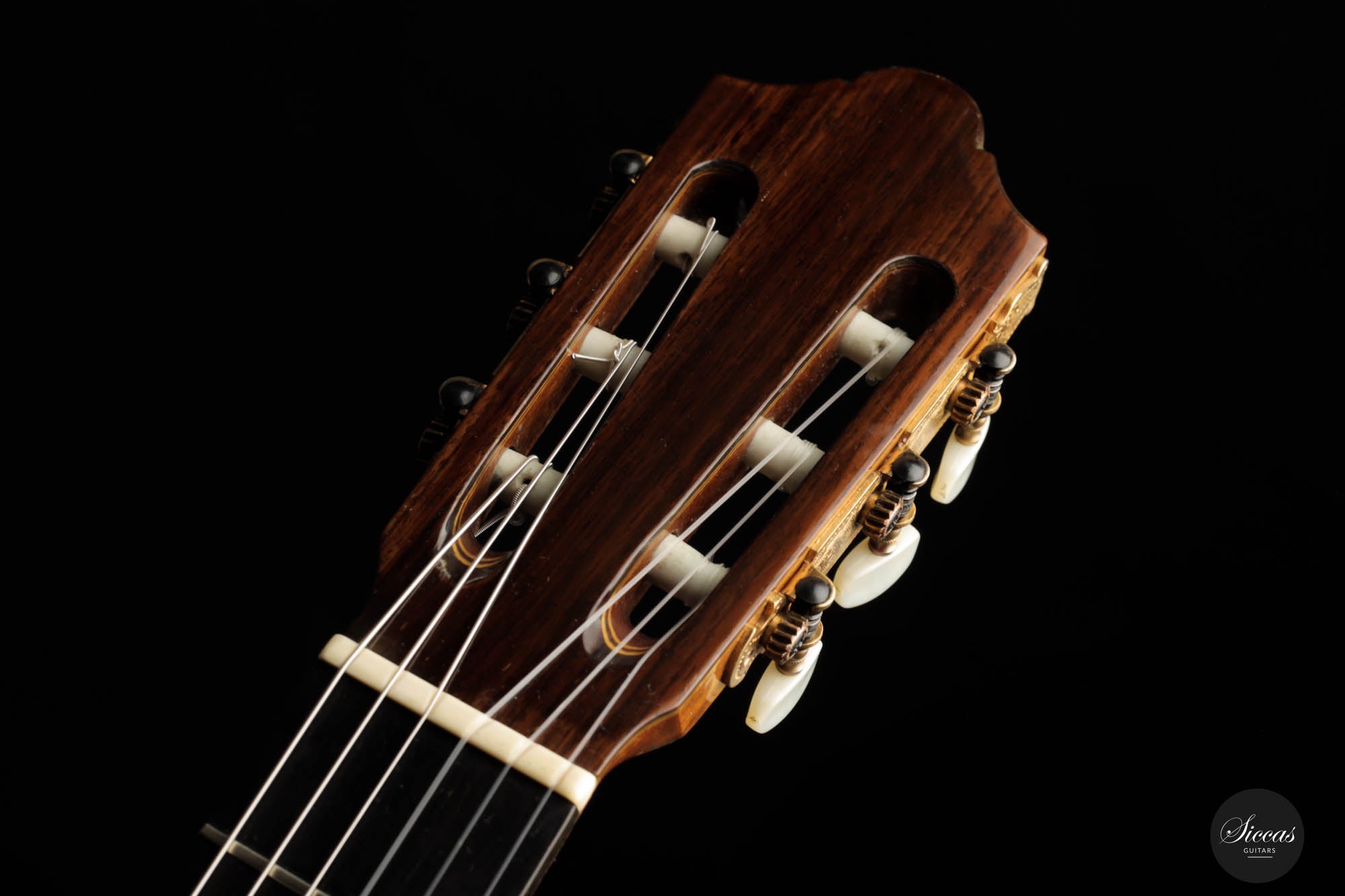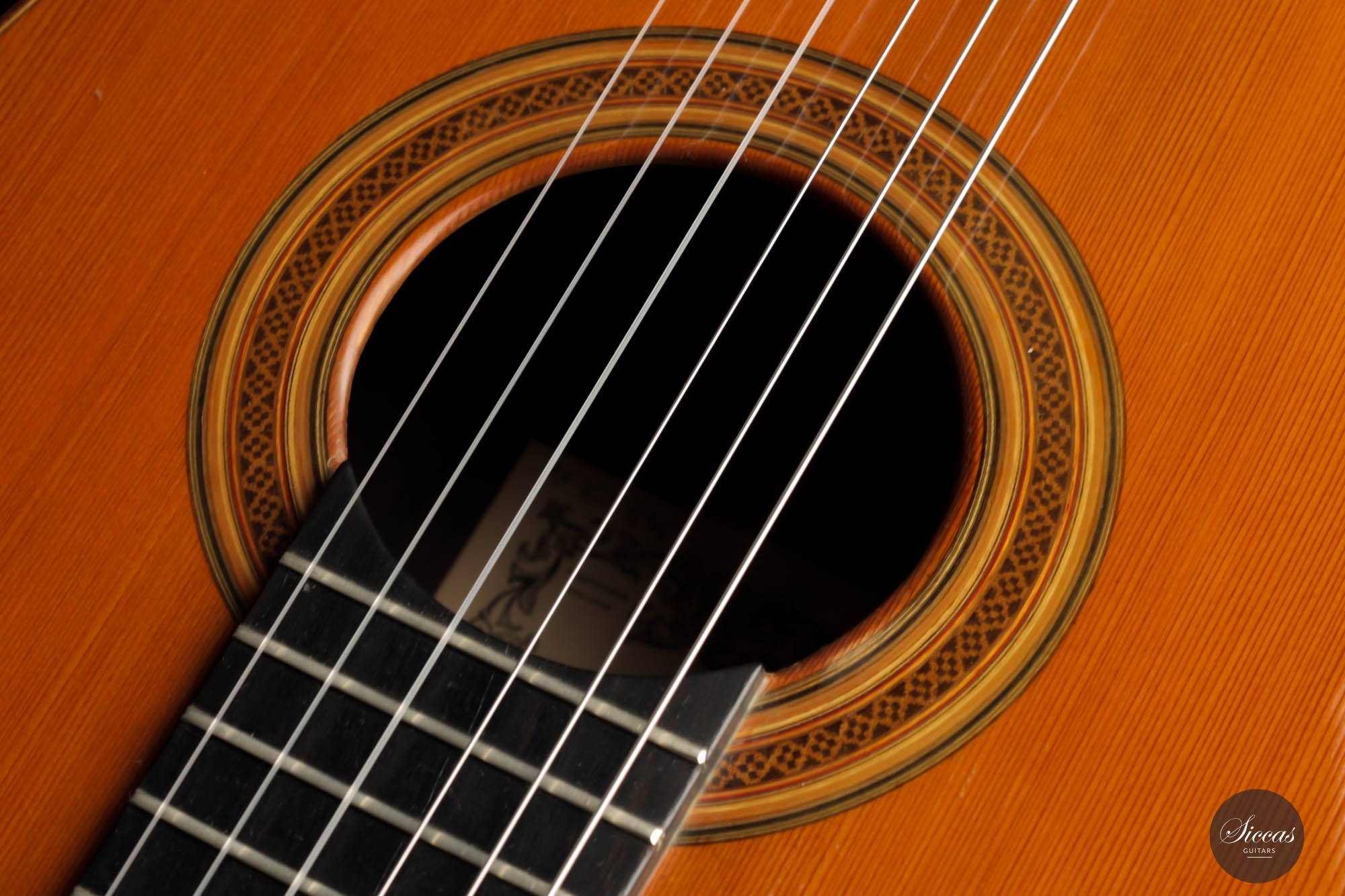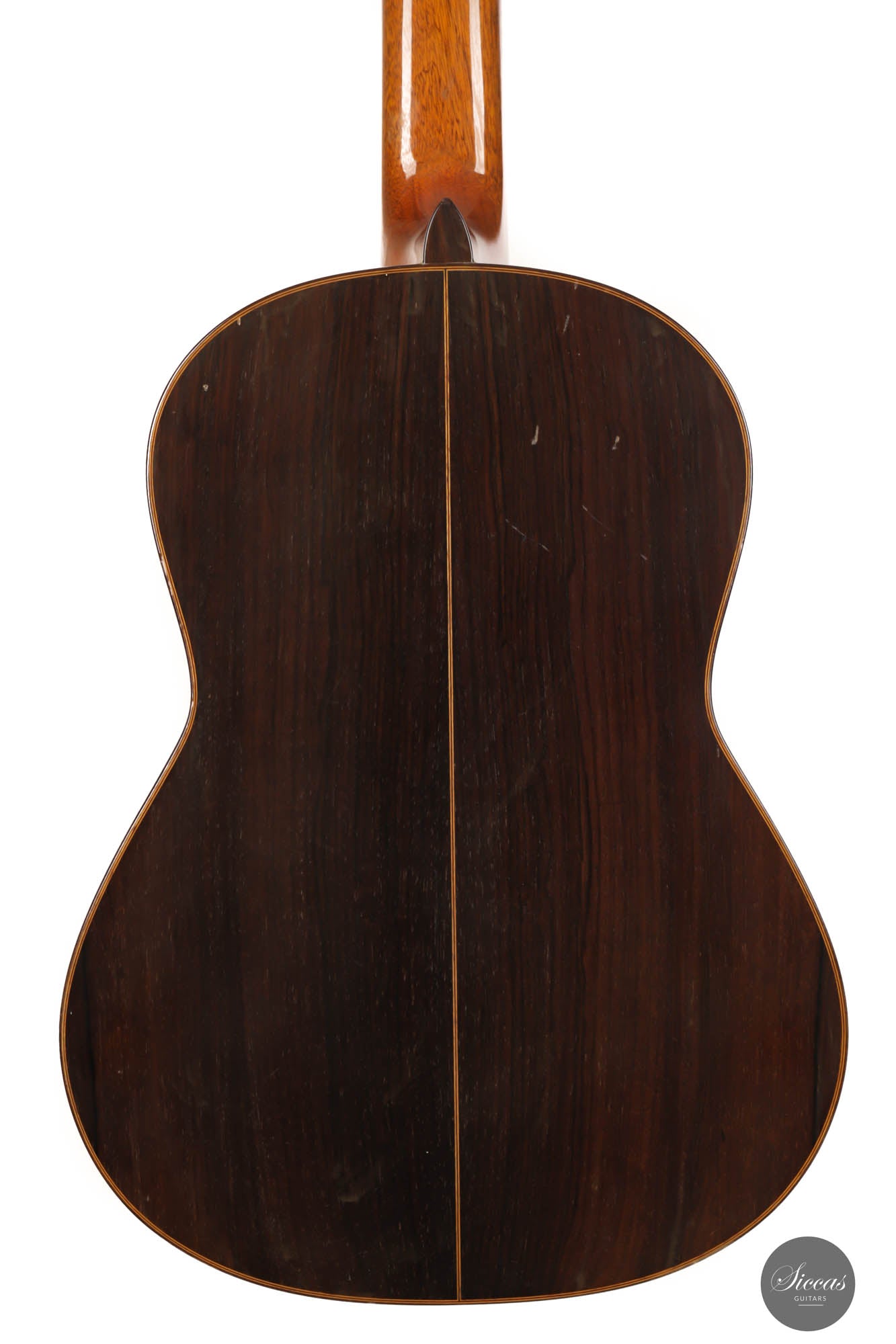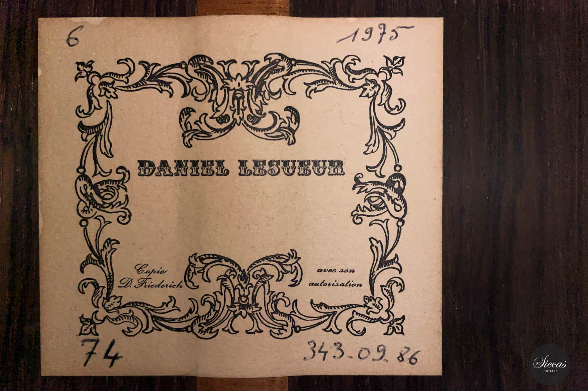 This magnificent guitar from 1975 is a perfect example of Daniel Lesueur's guitar at its finest. One can easily notice the similarities with Daniel Friederich's guitar. It is written on the label that this instrument is a copy of Daniel Friederich's guitar and authorized by Daniel Friederich himself ("Copie D. Friederich avec son autorisation"). Daniel Friederich started using cedar as a soundboard in 1973/1974. As this instrument from 1975 was also built using a cedar soundboard, it shows how close Daniel Friederich and Daniel Lesueur were. The guitar also comes with CITES-certified Brazilian rosewood back and sides, which is a true bargain for this price point. Acoustically, this instrument number 74 is a reminiscence of Daniel Friederich's guitar. It has a very similar timbre and sound character. The power and warmth of the tones are astonishing, and the color possibilities are inspiring. The complex-sounding trebles are to die for. This instrument is the chance for collectors and Friederich's guitars fan to own a very rare instrument at a very attractive price point.