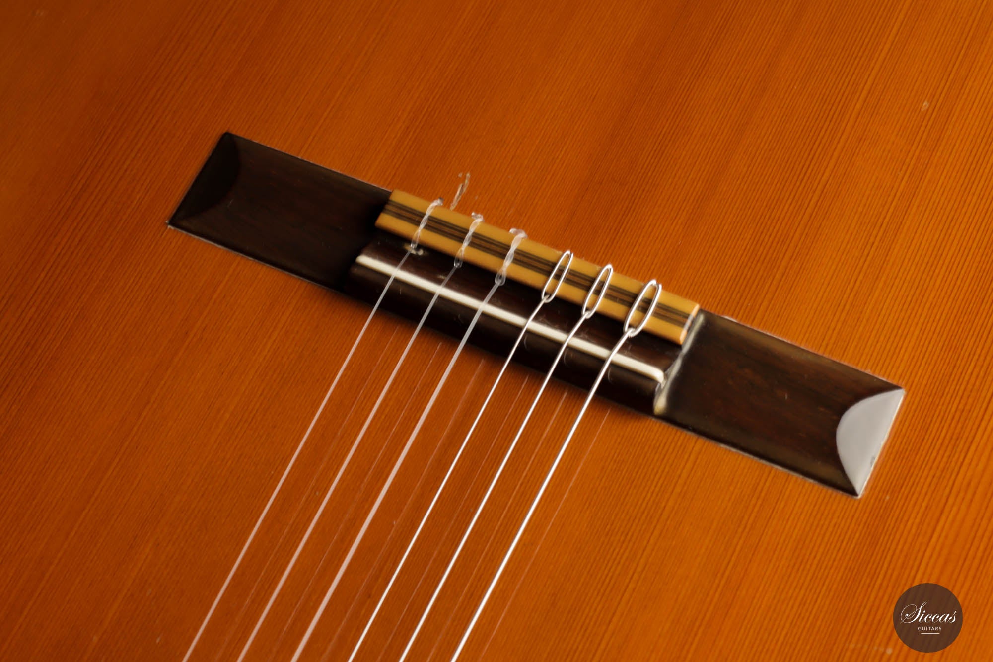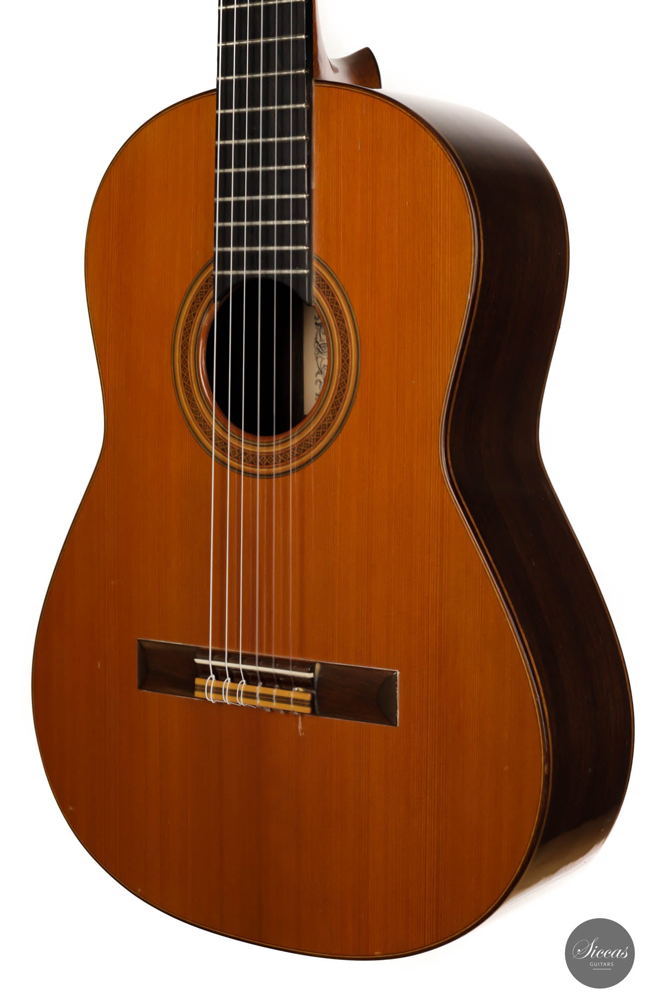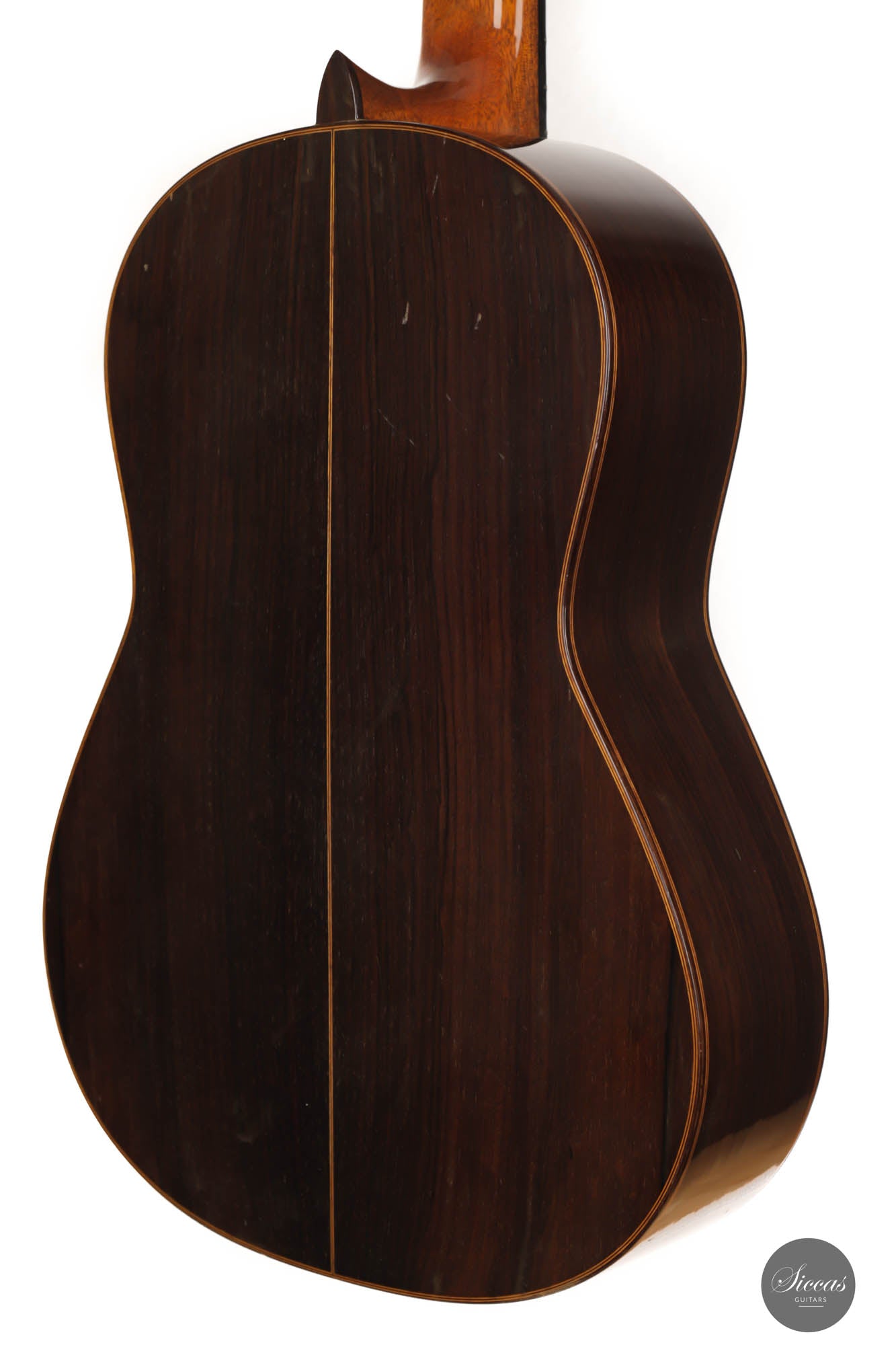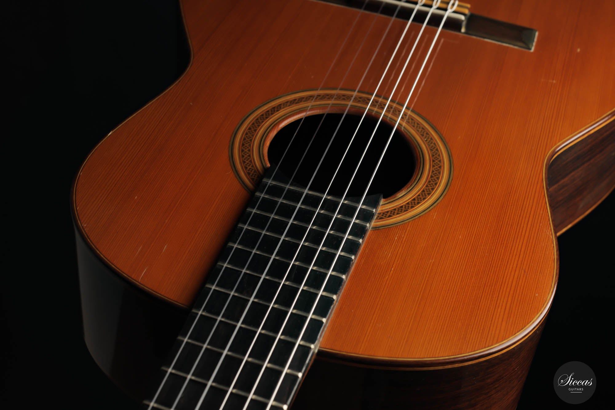This magnificent guitar from 1975 is a perfect example of Daniel Lesueur's guitar at its finest. One can easily notice the similarities with Daniel Friederich's guitar. It is written on the label that this instrument is a copy of Daniel Friederich's guitar and authorized by Daniel Friederich himself ("Copie D. Friederich avec son autorisation"). Daniel Friederich started using cedar as a soundboard in 1973/1974. As this instrument from 1975 was also built using a cedar soundboard, it shows how close Daniel Friederich and Daniel Lesueur were. The guitar also comes with CITES-certified Brazilian rosewood back and sides, which is a true bargain for this price point. Acoustically, this instrument number 74 is a reminiscence of Daniel Friederich's guitar. It has a very similar timbre and sound character. The power and warmth of the tones are astonishing, and the color possibilities are inspiring. The complex-sounding trebles are to die for. This instrument is the chance for collectors and Friederich's guitars fan to own a very rare instrument at a very attractive price point.