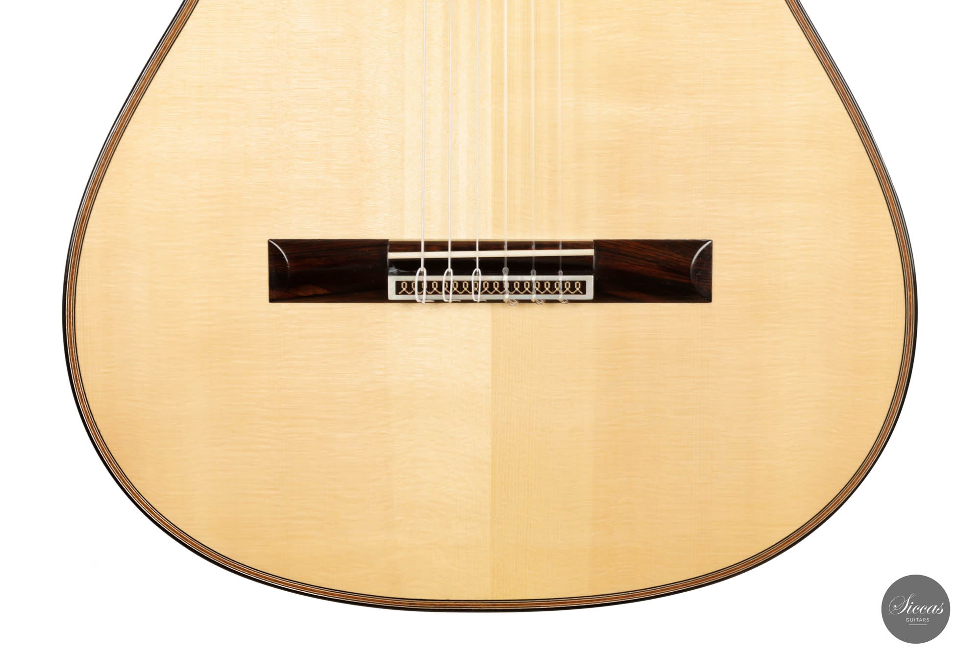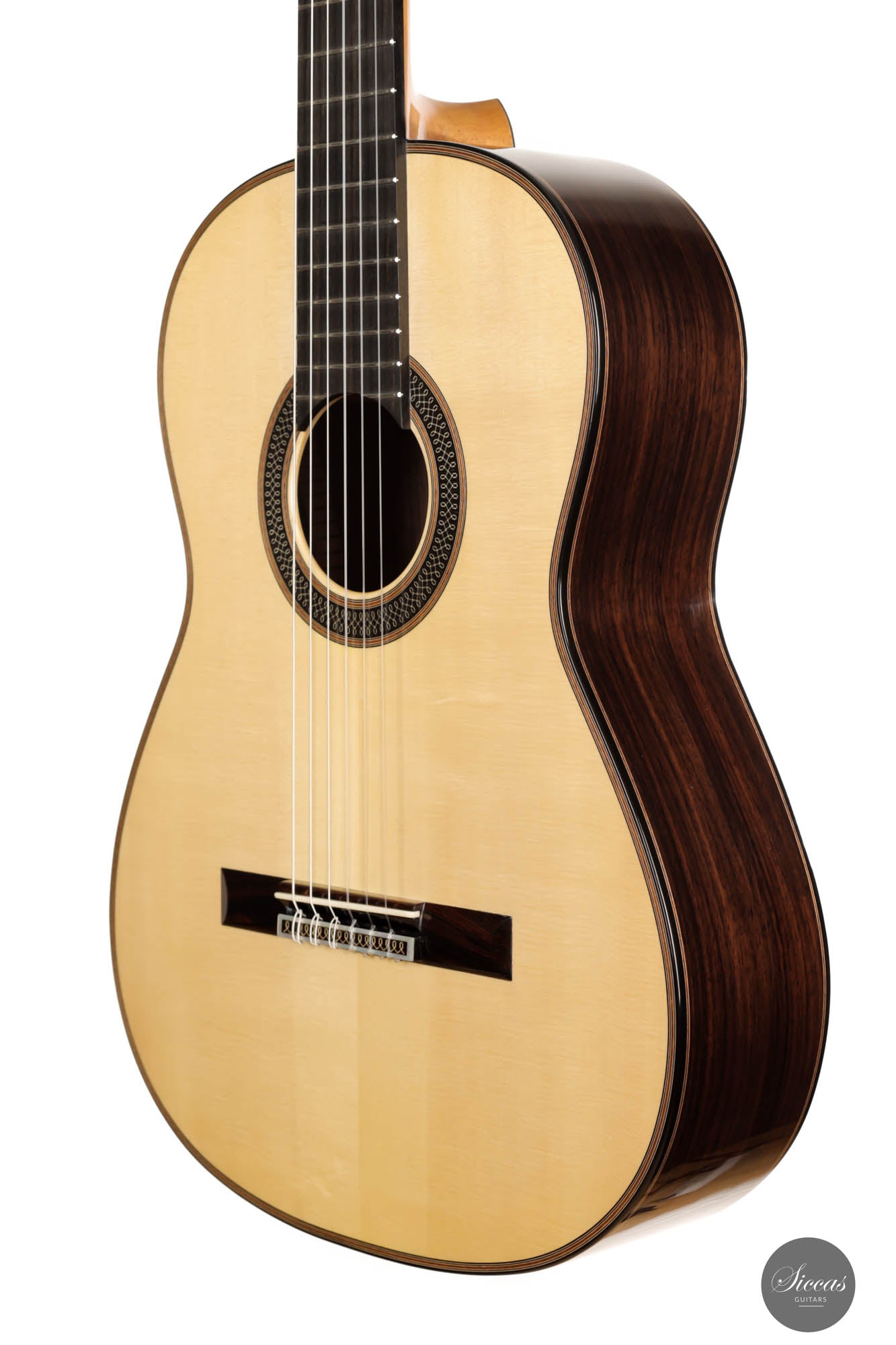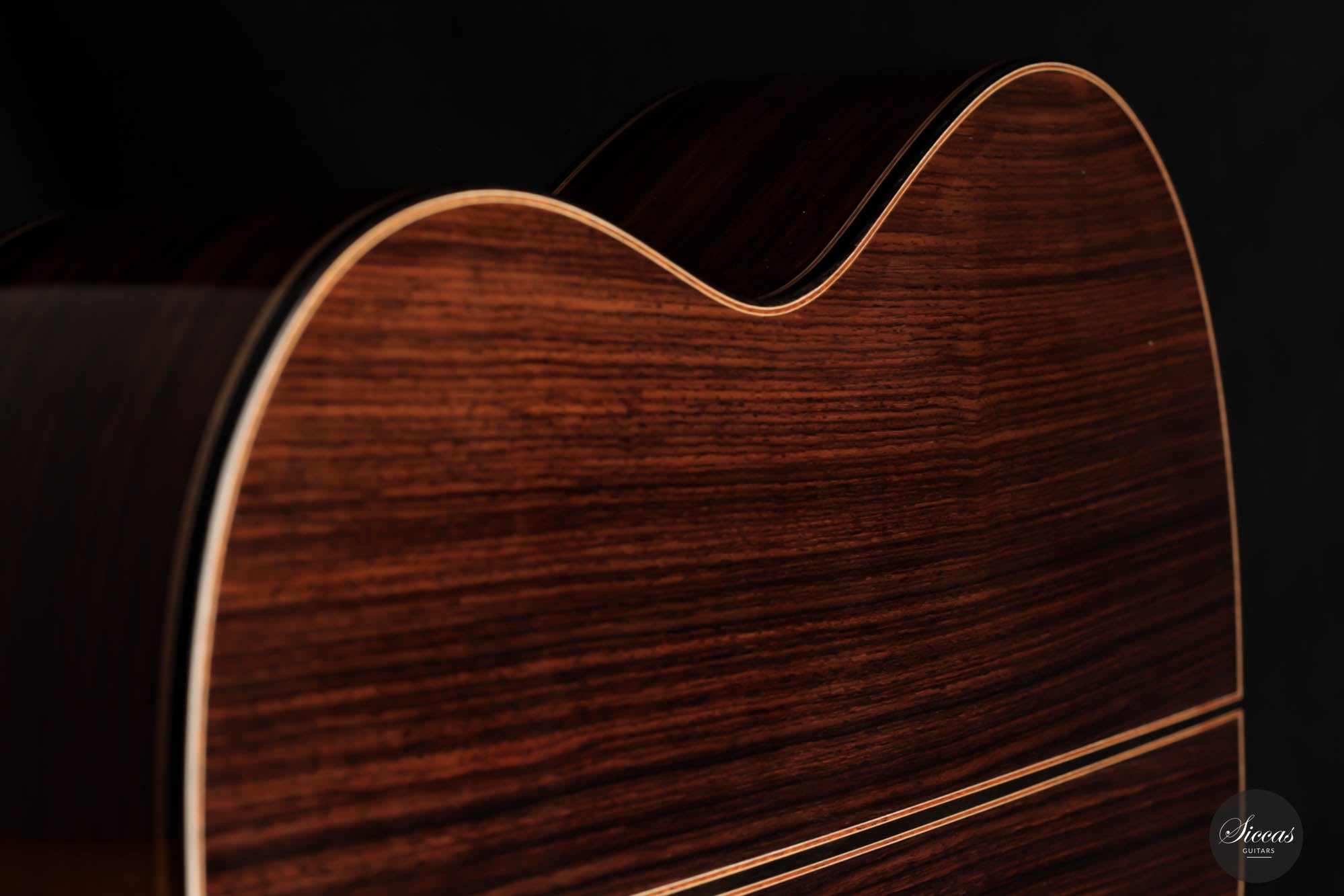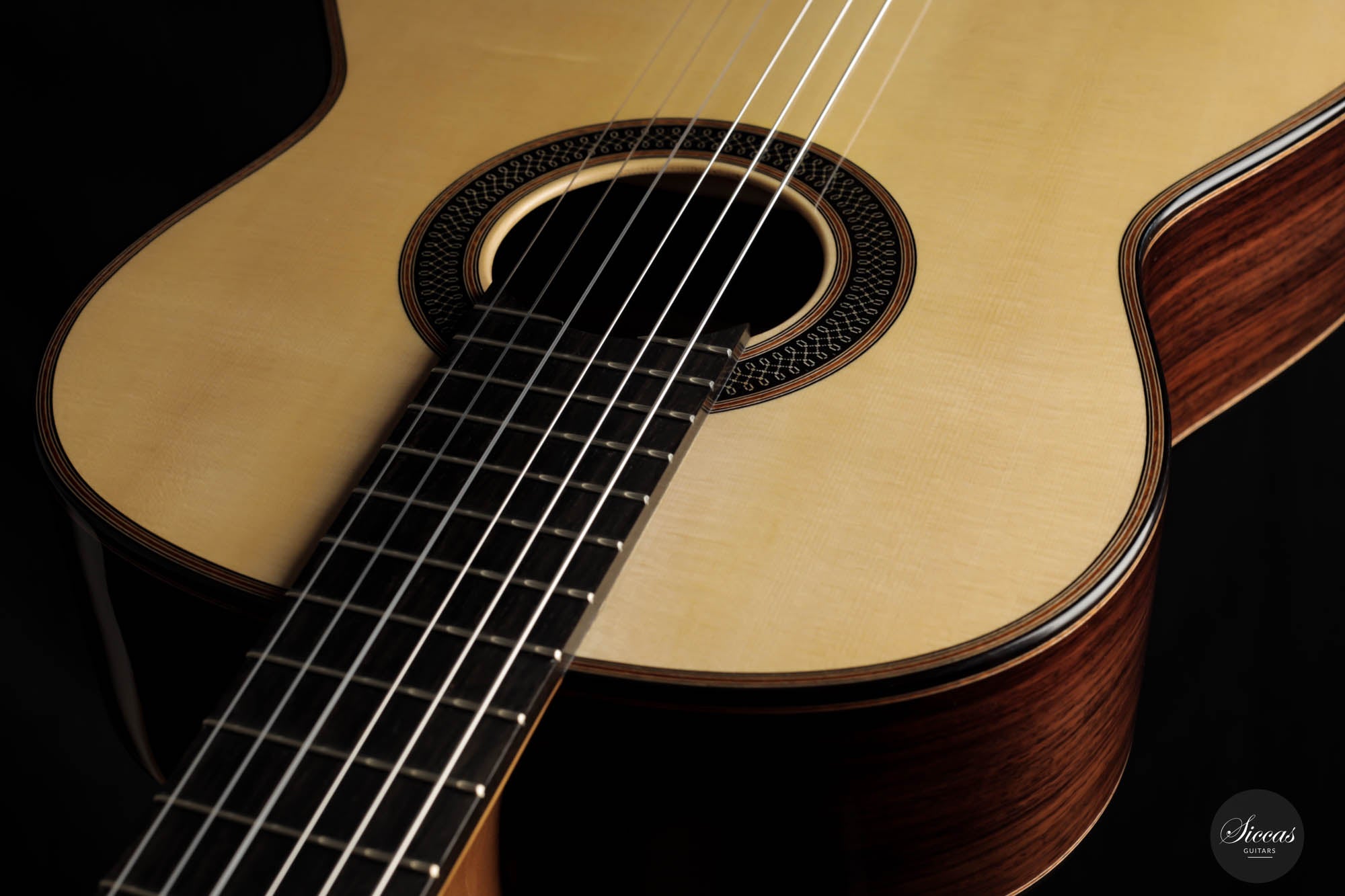 Diese Gitarre von Daniele Marrabello ist eine besonders reizvolle und edel gestaltete Gitarre mit einer absolut herausragenden Auswahl an Hölzern. Die Ästhetik dieses Instruments ist beeindruckend, und Daniele hat seine handwerkliche Kunstfertigkeit bei diesem Instrument vollständig ausgeschöpft. Die Kombination aus dreiteiligem indischem Palisander, einer federleichten, von Hand gespaltenen Decke aus Schweizer Fichte erster Klasse und einem intensiv geflammten Cedrela-Odorata-Hals mit einer Fülle von feinen und eleganten Verzierungen machen sie zu einem beeindruckenden Gesamtkunstwerk.