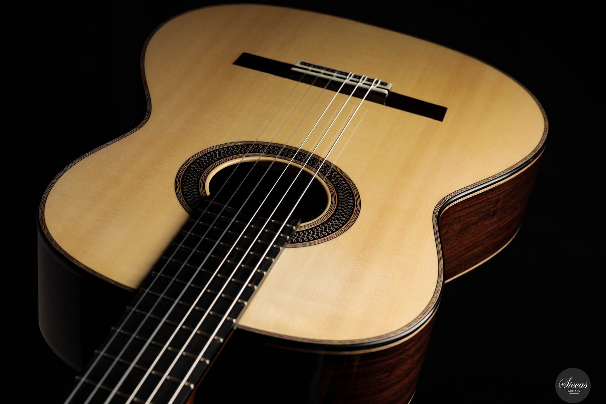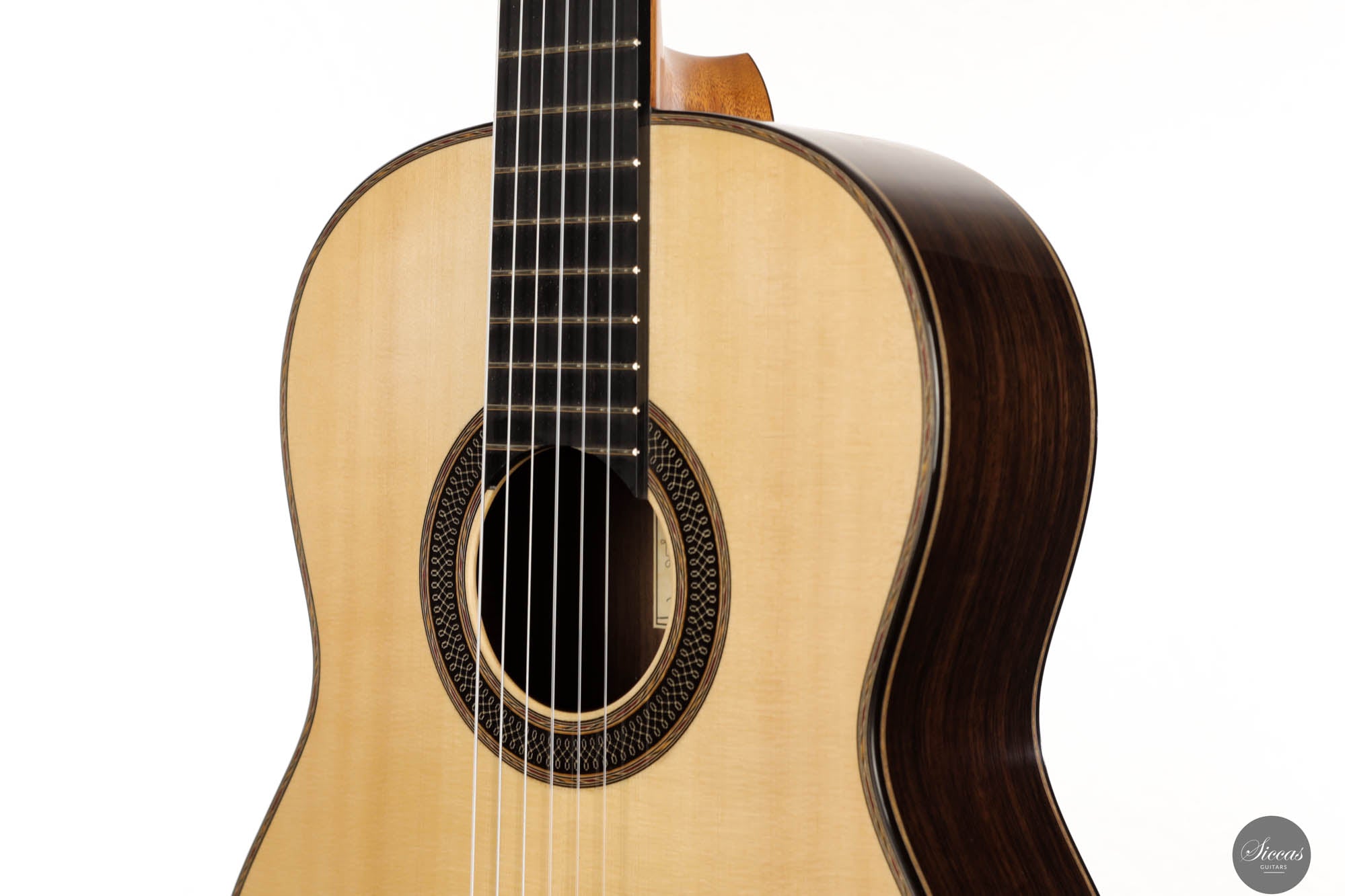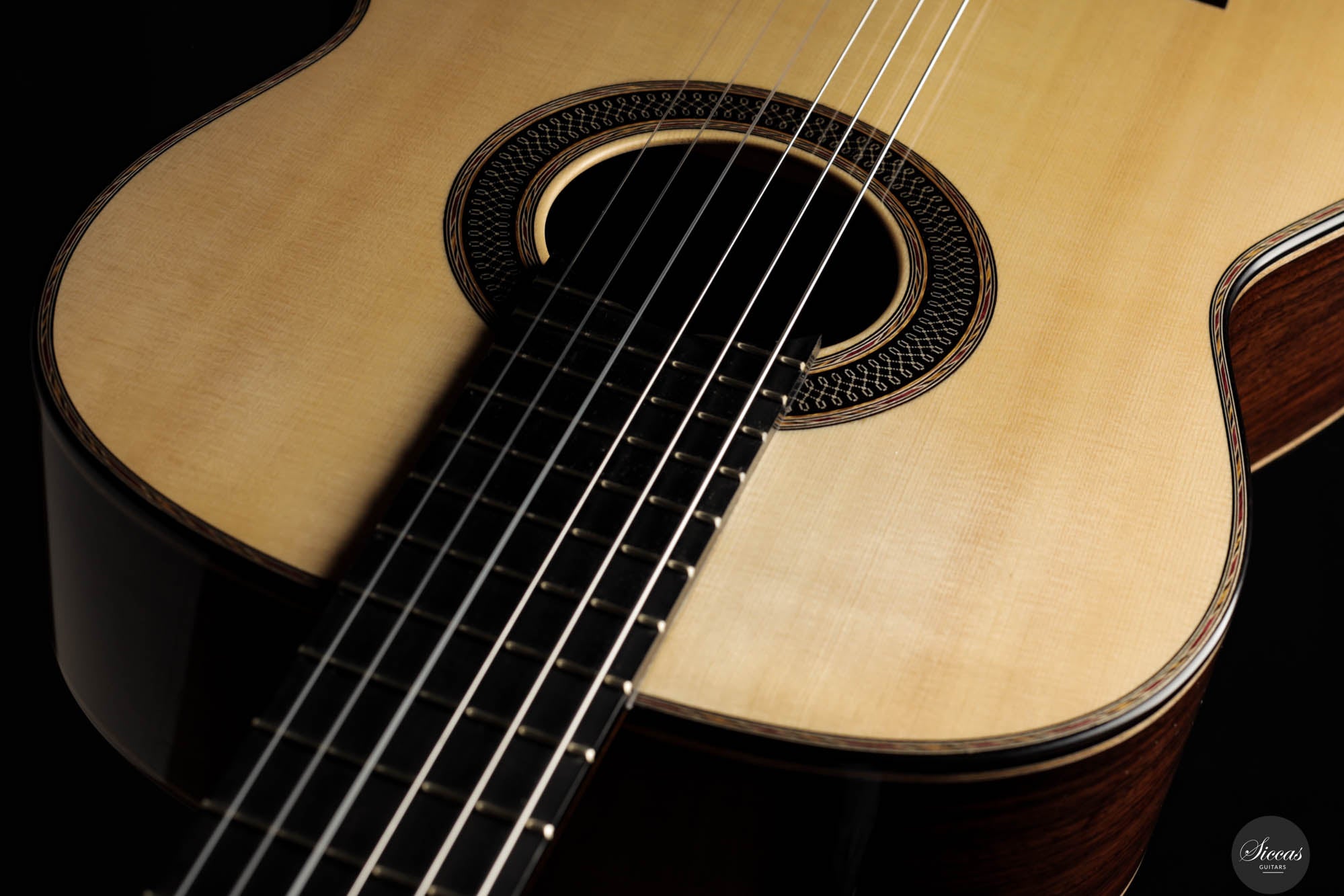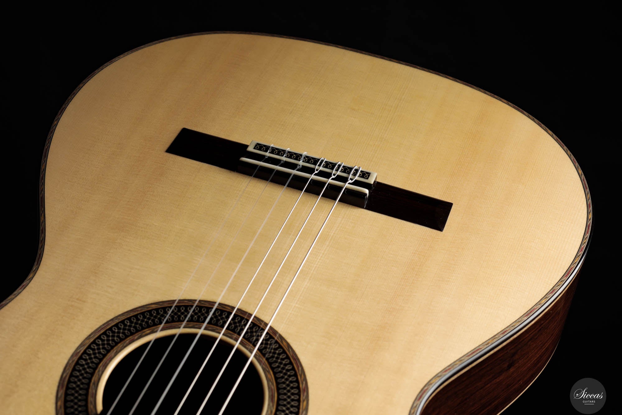 Danieles Auswahl an Hölzern für diese Gitarre ist beispielhaft und zeigt sein tiefes Verständnis und seinen Respekt für hochwertige Materialien. Rücken und Seiten, aus feinstem indischen Palisander gefertigt, tragen nicht nur zur visuellen Eleganz der Gitarre bei, sondern leisten auch einen wesentlichen Beitrag zu ihrer tonalen Tiefe und Reichhaltigkeit. Die Wahl einer federleichten, handgespaltenen Master-Grade Schweizer Fichte für die Schalldecke ist ebenso bemerkenswert.