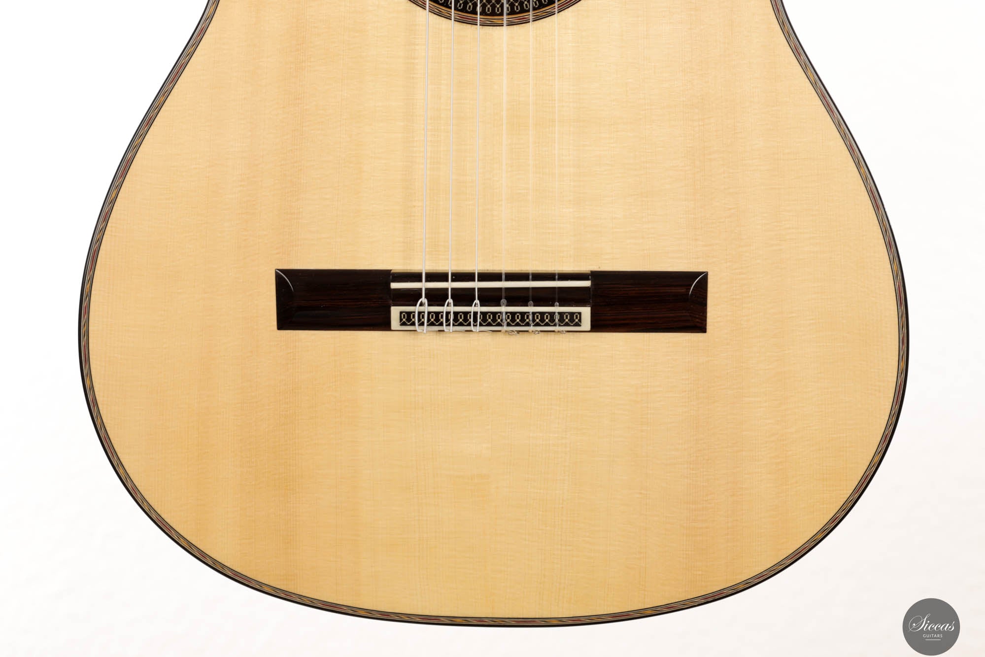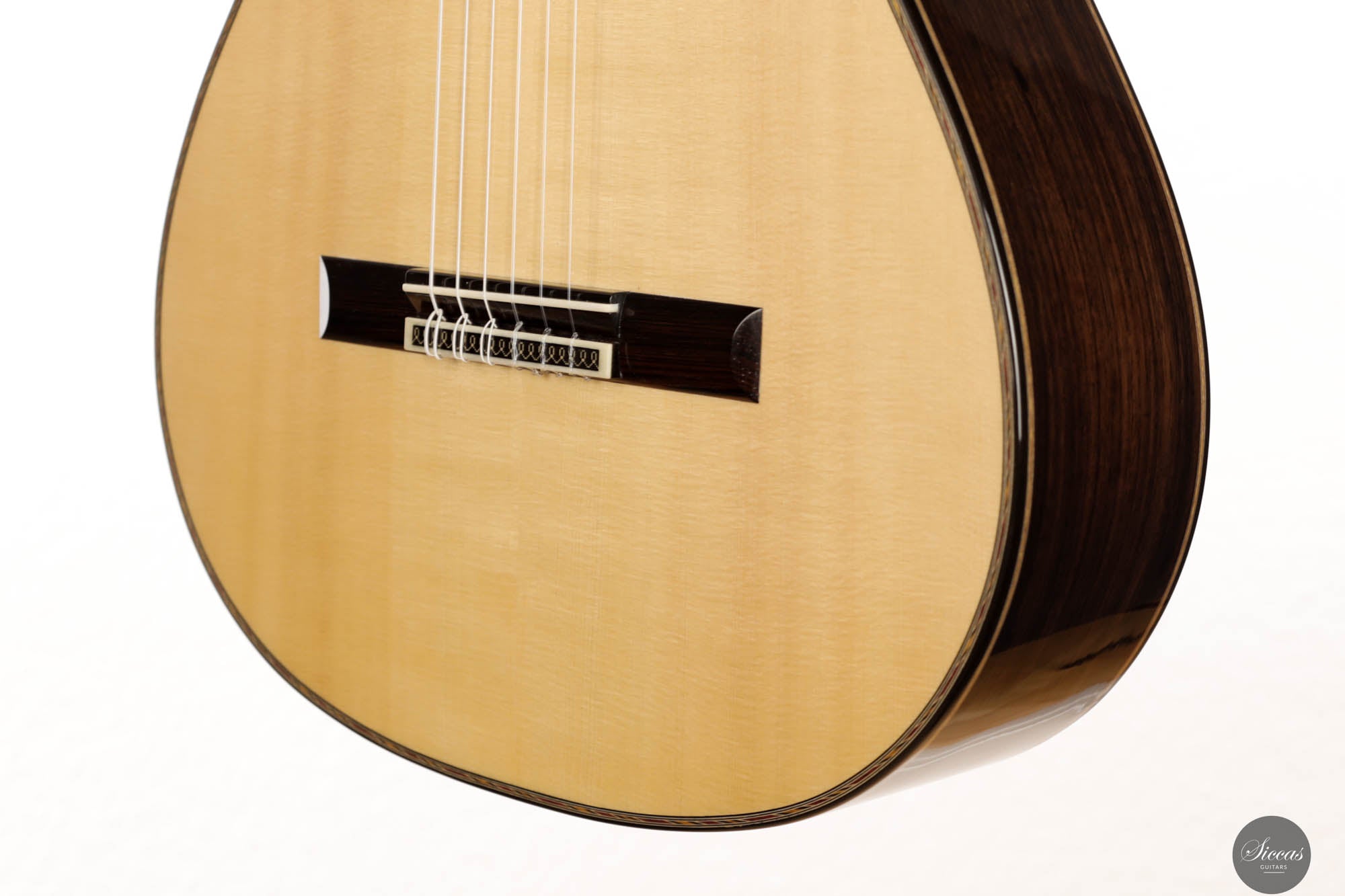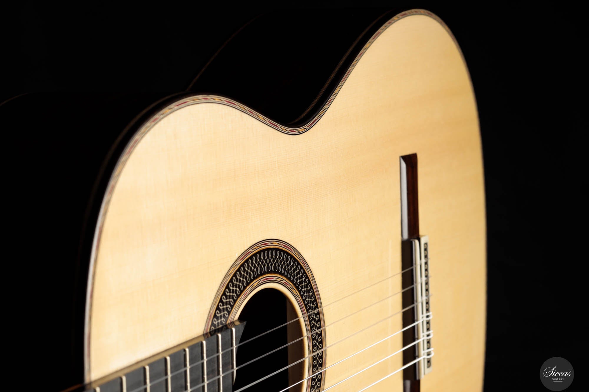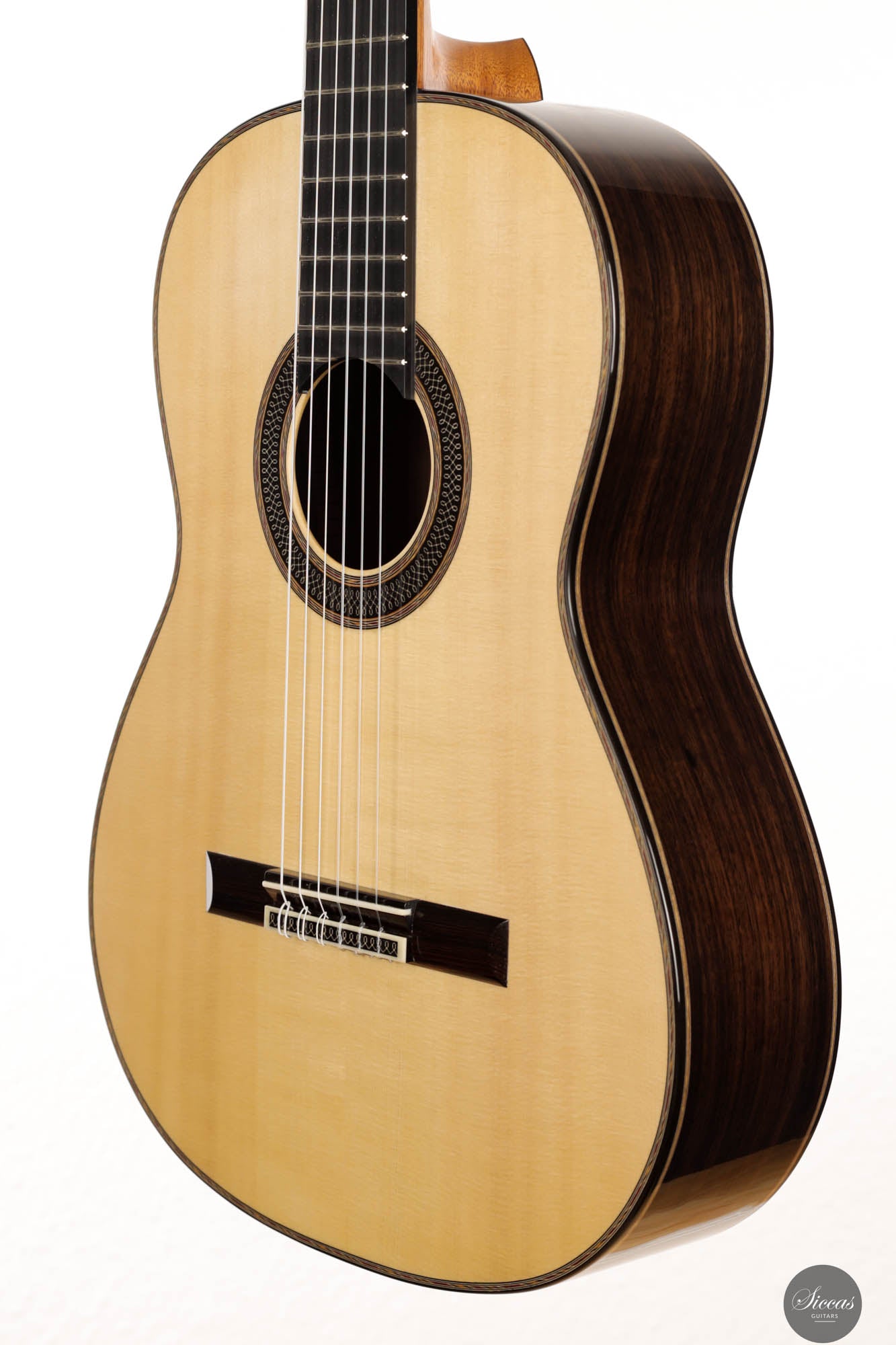 Danieles Auswahl an Hölzern für diese Gitarre ist beispielhaft und zeigt sein tiefes Verständnis und seinen Respekt für hochwertige Materialien. Rücken und Seiten, aus feinstem indischen Palisander gefertigt, tragen nicht nur zur visuellen Eleganz der Gitarre bei, sondern leisten auch einen wesentlichen Beitrag zu ihrer tonalen Tiefe und Reichhaltigkeit. Die Wahl einer federleichten, handgespaltenen Master-Grade Schweizer Fichte für die Schalldecke ist ebenso bemerkenswert.
