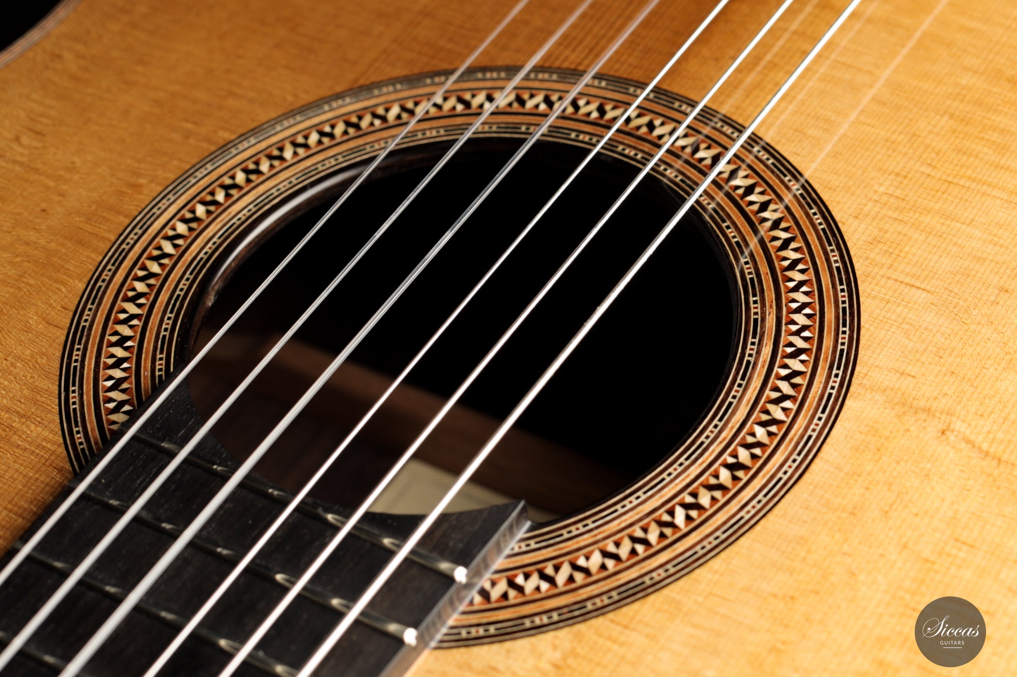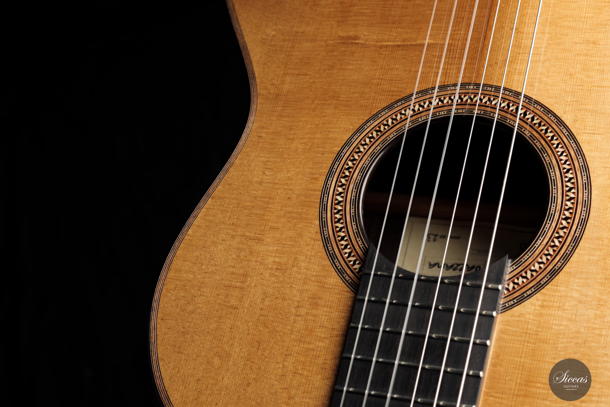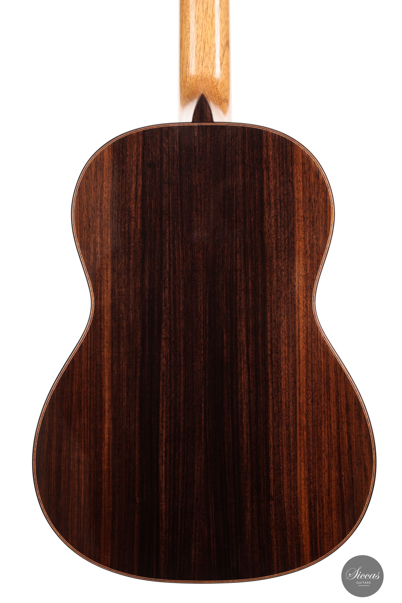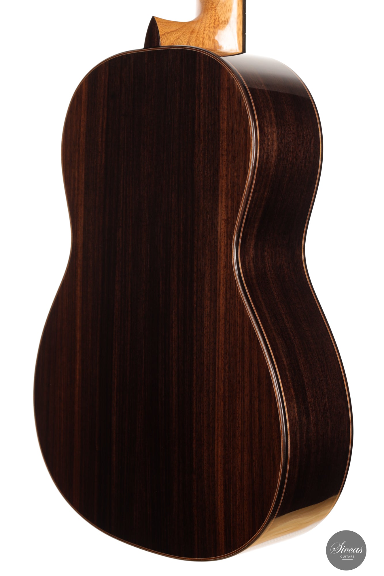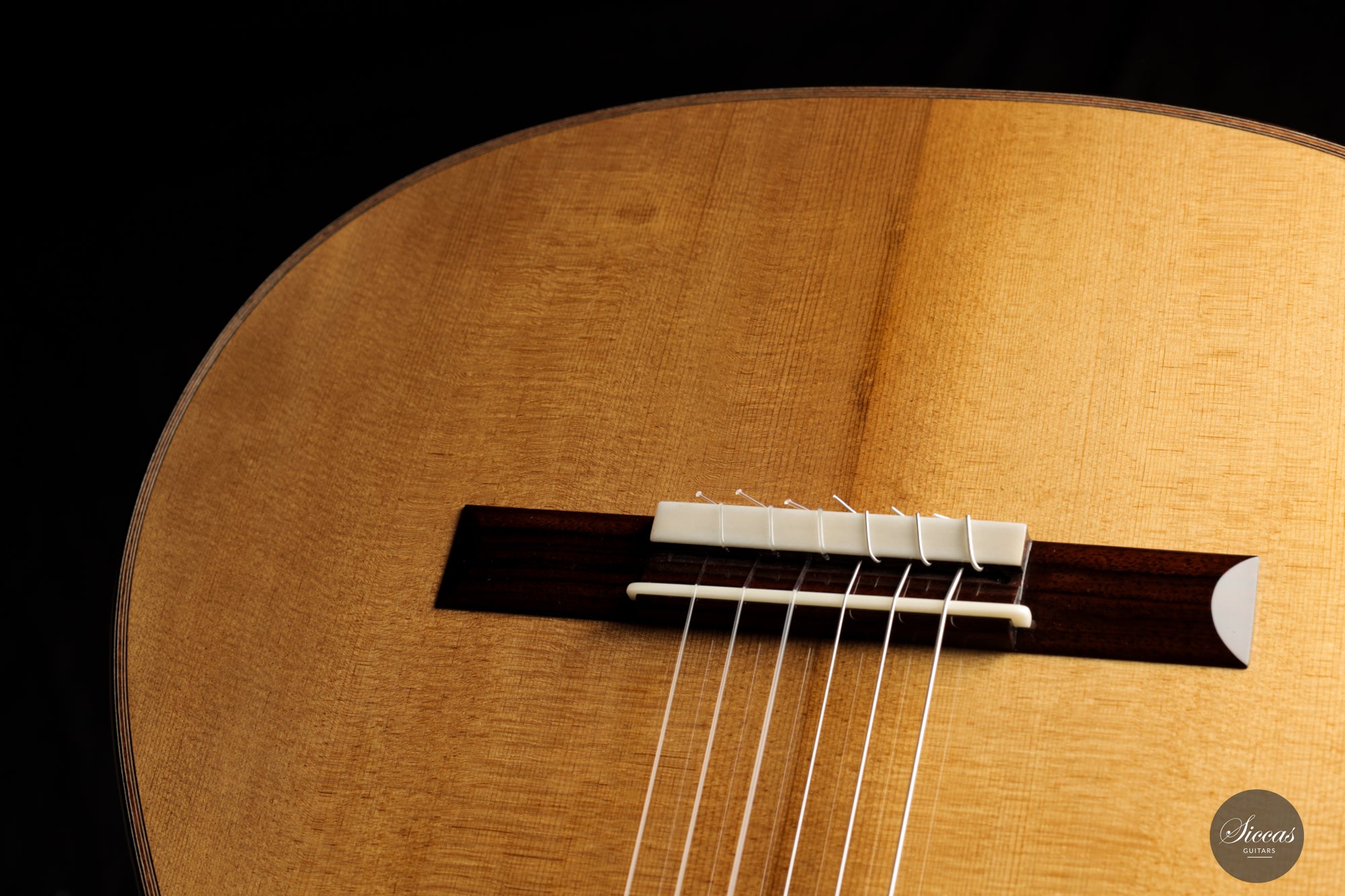 In Reflexion seiner unerschütterlichen Verpflichtung zur Qualität verkörpert dieses spezielle Stück Bazzanas charakteristische Handwerkskunst. Mit einer Fichtendecke, die eloquent mit klassischem indischem Rosenholz für den Boden und die Zargen gepaart ist, sind seine Ästhetik genauso überzeugend wie sein Klang. Seine Abstammung ist unverkennbar von der verehrten französischen Schule des Gitarrenbaus beeinflusst und hallt die Meisterschaft wider, die in den Kreationen von Größen wie Robert Bouchet und Daniel Friederich zu finden ist.